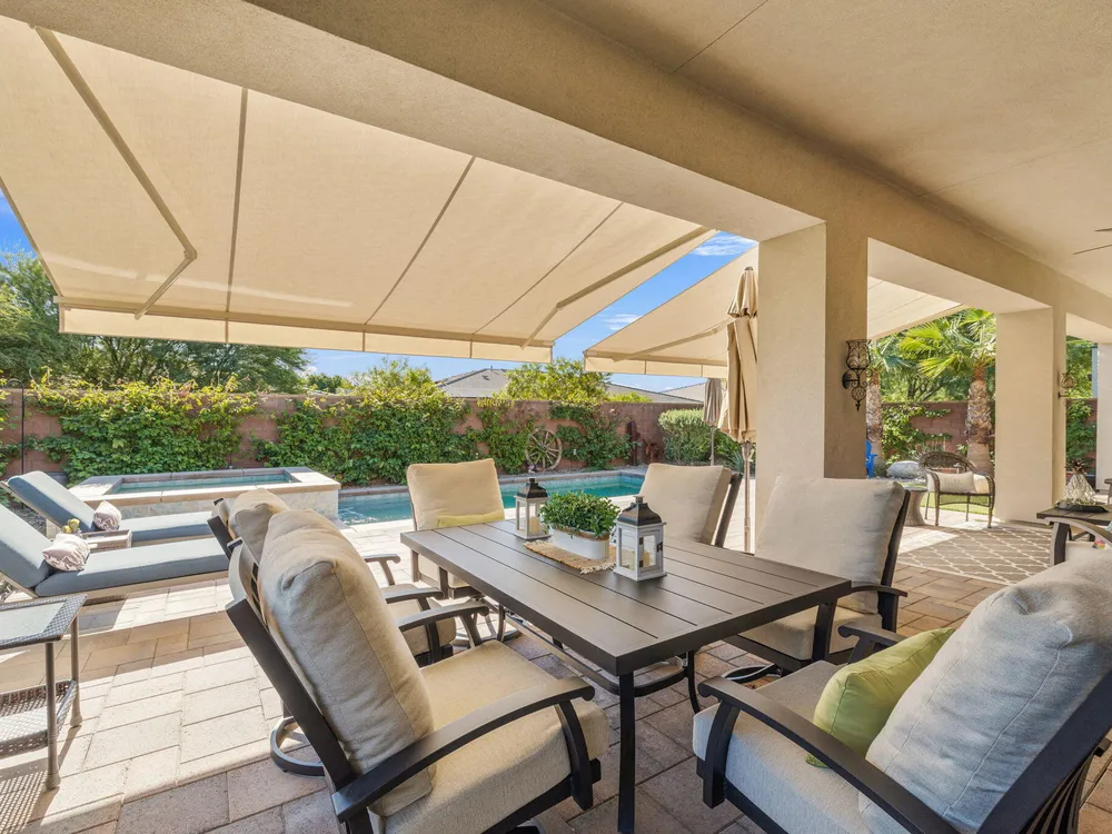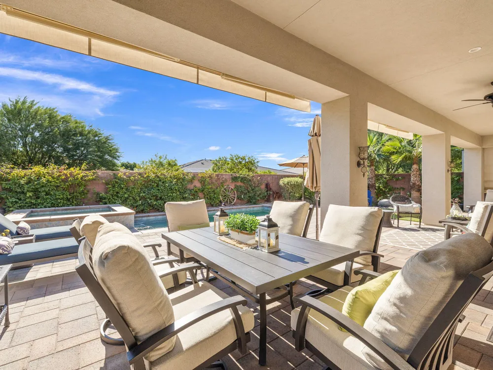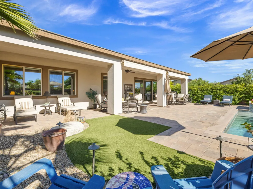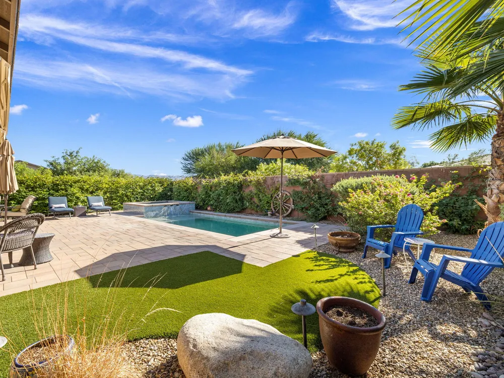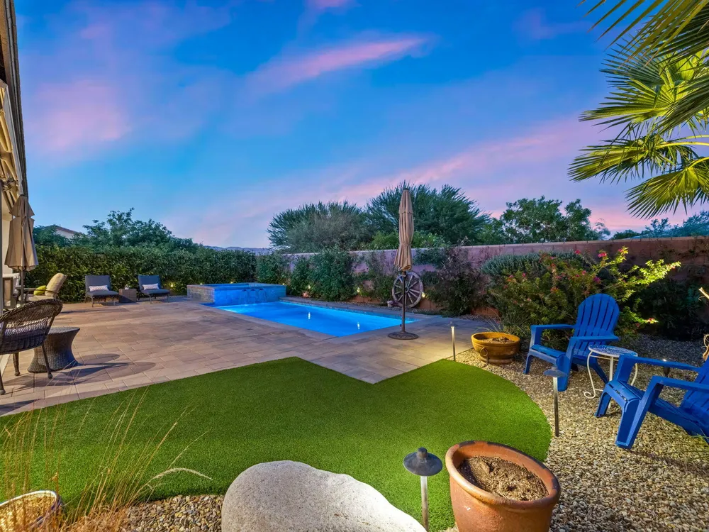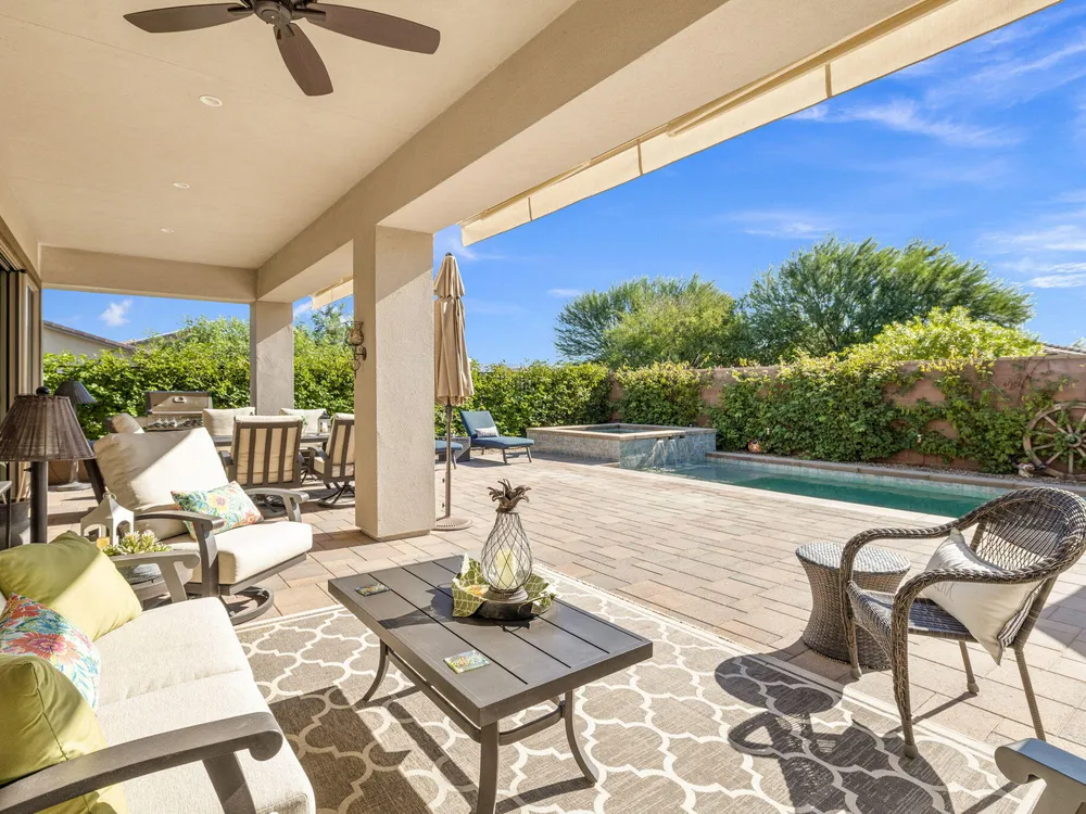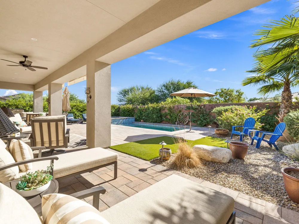 TRILOGY POLO CLUB: OVER $150K IN UPGRADES!!! --> WOW!!! <--One of the most highly upgraded homes in Trilogy Polo - you're getting $150k in upgrades for only $965k. What a deal! No neighbors directly behind or beside the yard — complete privacy and open space on all sides. This 2,367 sq. ft. single-level home offers 3 bedrooms, 3 baths, PLUS a den/office (or 4th bedroom), all just steps from the clubhouse. The open-concept great room is bright and spacious, featuring stunning wood-look tile floors, custom window treatments, and pocket sliding doors for seamless indoor-outdoor living. The chef's kitchen is fully loaded with quartz counters, a custom herringbone backsplash, a large prep island with pendant lighting, a 6-burner cooktop with designer hood, double ovens, and walk-in pantry. The primary suite is a private retreat with upgraded Berber carpet, dual vanities, a glass-enclosed tiled shower, and a spacious walk-in closet. Out back, you'll find a resort-style yard built for entertaining — complete with a beautiful Teserra Pool with Pebble Tec spa featuring triple waterfalls, a tanning shelf, an expansive paver patio, and a covered area for shade and dining. No need to renovate or upgrade a single thing — this home is truly turnkey, with FAR MORE UPGRADES THAN COMPETING LISTINGS. Topped off with solar, electric window coverings, huge awnings, air-conditioned garage with extra golf cart space, and a premium location near the clubhouse — this is the by far best deal in Trilogy! Sellers have transferrable membership (much cheaper to join!) DON'T LOOK AT OTHERS TILL YOU SEE THIS!!
