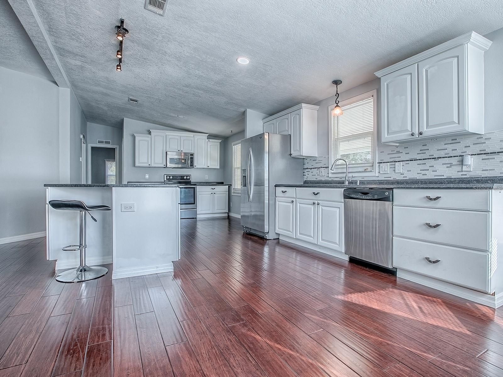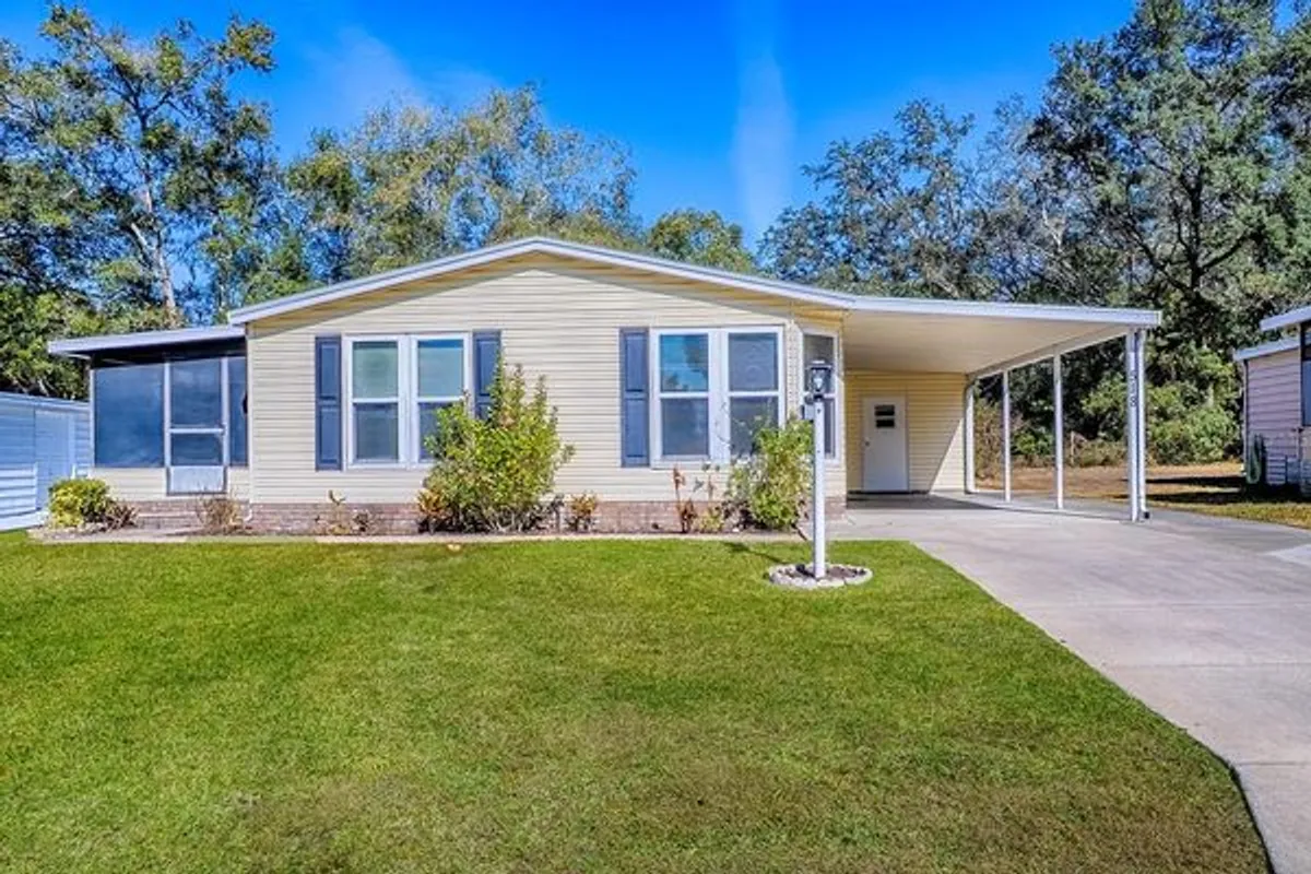 Completely remodeled manufactured home located in the desirable The Village of Orange Blossom Gardens. Step into a beautifully renovated living space featuring vaulted ceilings and an open-concept design that creates a bright, airy feel. The stunning kitchen showcases stainless steel appliances, cabinetry with convenient pull-out shelves, granite countertops, and a large center island—perfect for entertaining or everyday living. Luxury vinyl flooring flows throughout the home, adding both style and durability. Both bathrooms have been fully updated and feature step-in, glass-enclosed showers for a modern spa-like touch. The primary bath also includes an indoor laundry area for added convenience. Enjoy easy, low-maintenance living while taking advantage of everything The Villages has: golf, recreation, shopping, dining, and endless activities.