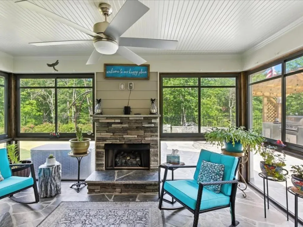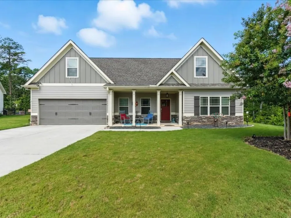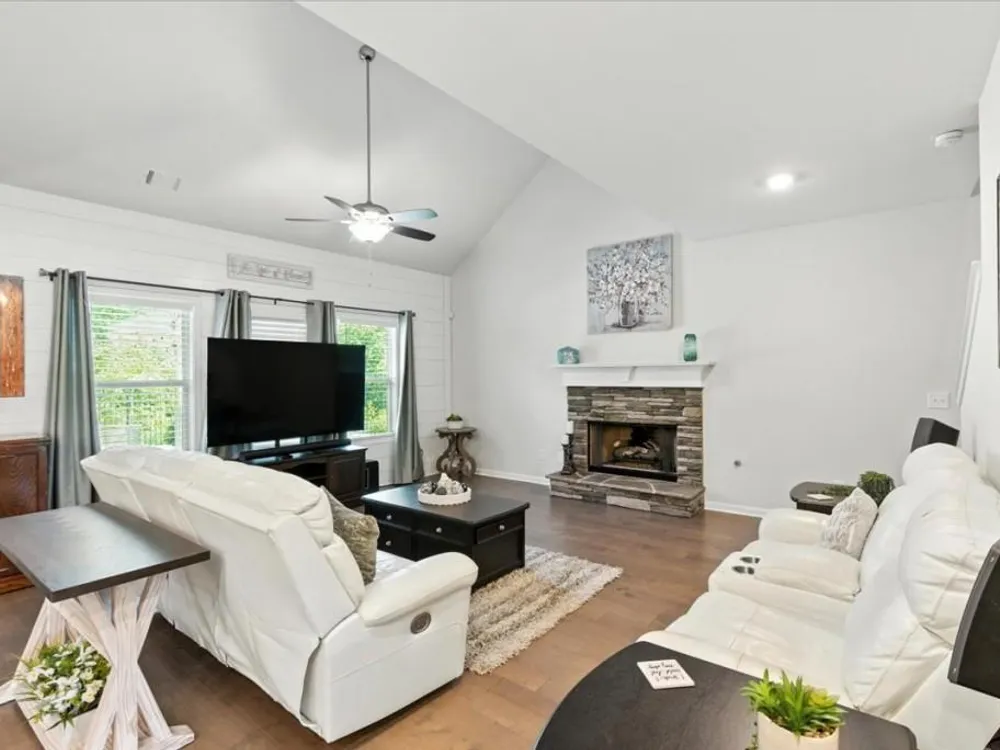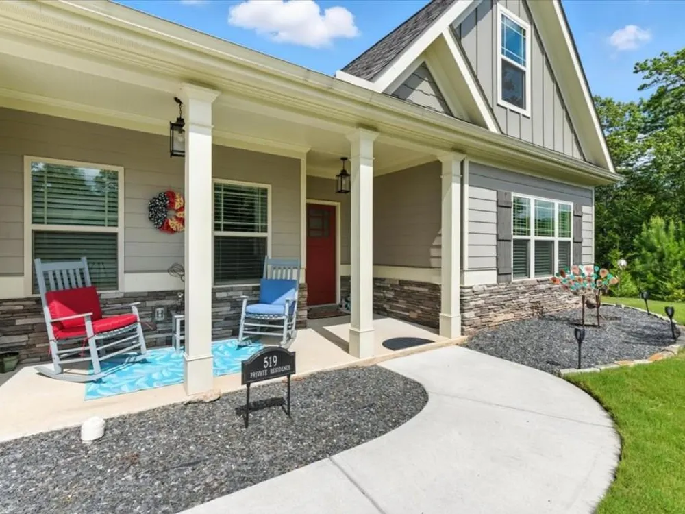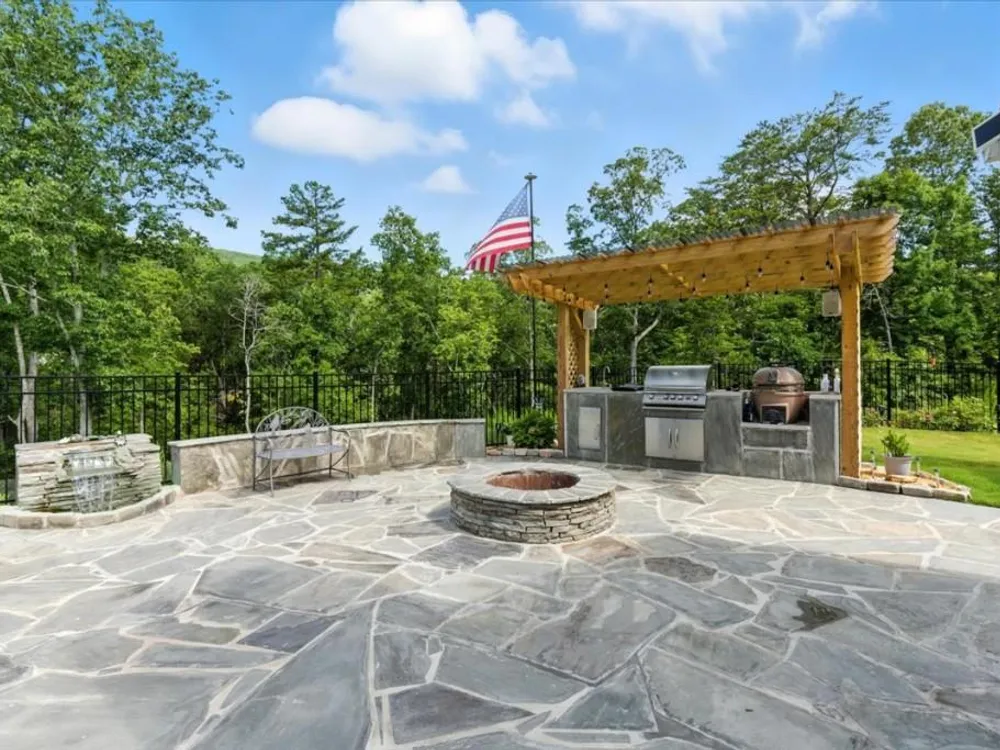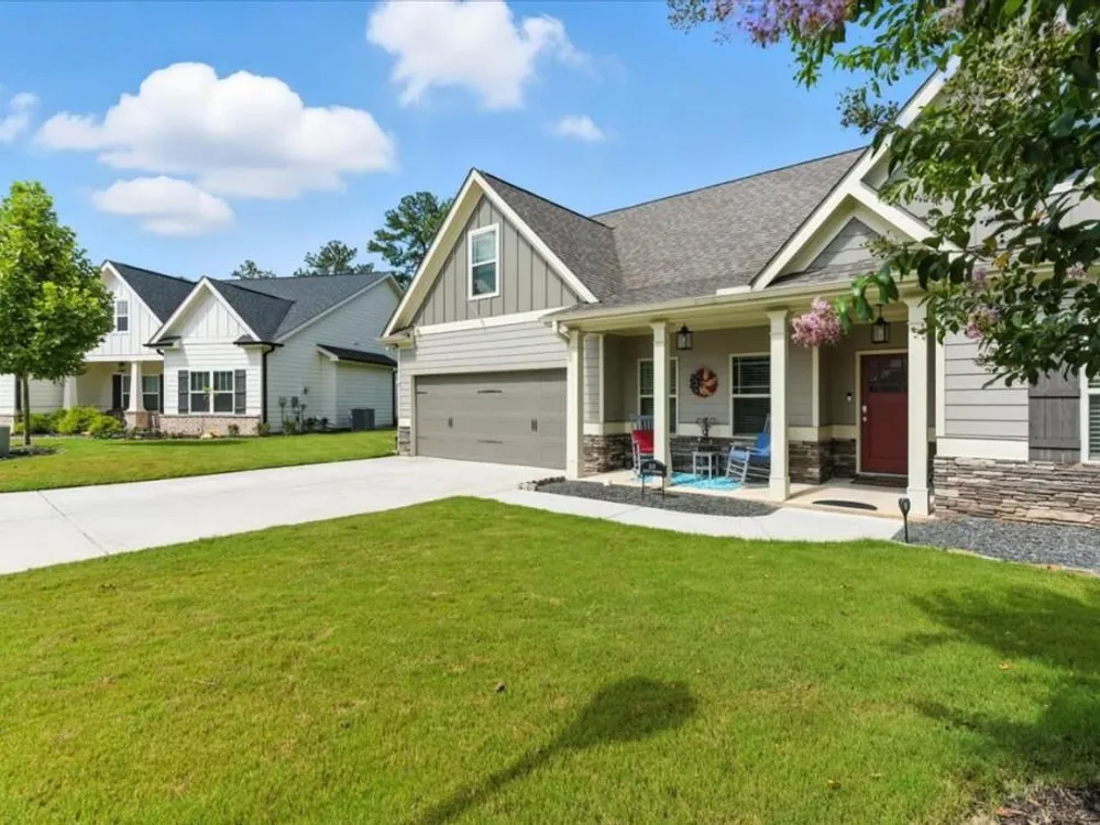 BeauWelcome to this beautifully designed 5-bedroom, 4½-bath home in the gated Lake Arrowhead community, offering lake access, golf, and resort-style amenities. Built in 2021, this 3,007-sq-ft residence sits on a 0.41-acre cul-de-sac lot and combines open living spaces, upgraded systems, and an impressive outdoor retreat. The main level features luxury vinyl plank flooring throughout all living areas, a vaulted great room with shiplap gas fireplace, and an open kitchen appointed with white cabinetry, granite countertops, stone backsplash, stainless appliances, and a gas range. The Owner’s Suite on main includes a tray ceiling, dual vanities, walk-in shower, and large closet. Two additional guest bedrooms with full baths on the main level provide flexible options for family or guests. Upstairs, a spacious loft connects two bedrooms, a full bath, and walk-out storage areas. Everyday comfort is enhanced by dual-zone HVAC, irrigation, faux-wood blinds, a keyless entry alarm, and integrated security cameras. A 500-gallon propane generator provides whole-house backup power. The backyard has been completely upgraded for entertaining, with a custom stone patio, built-in outdoor kitchen with grill and sink, wood-burning firepit, and a natural rock waterfall. The fenced yard backs to wooded privacy, and the patio’s sliding acrylic windows with screens allow year-round enjoyment. Residents of Lake Arrowhead enjoy a private 540-acre lake with marina and boat access, two swimming pools, tennis and pickleball courts, walking trails, parks, and the Highlands Golf Course with optional membership. The clubhouse offers dining, events, and social gatherings in a secure, 24-hour gated environment. Convenient to Canton, Waleska, and northwest Cherokee County attractions, this move-in-ready property delivers a rare combination of modern efficiency, resort amenities, and low-maintenance living in one of North Georgia’s premier lake and golf communities.
