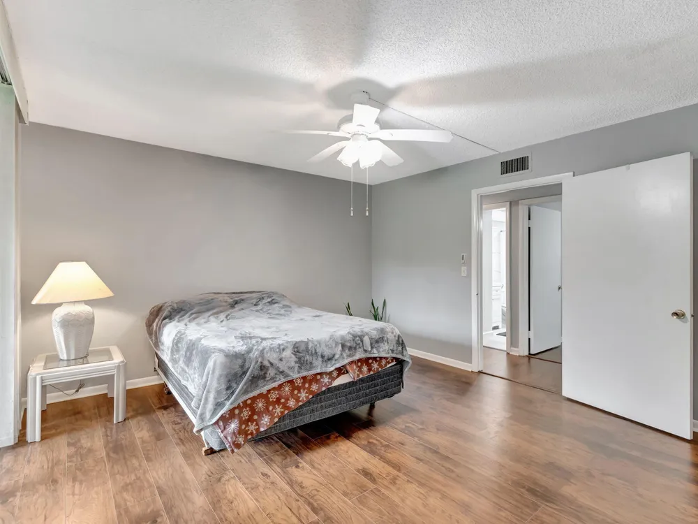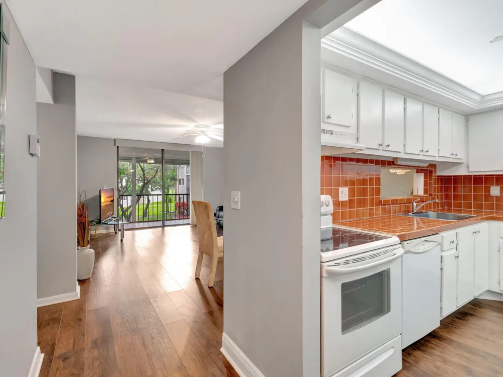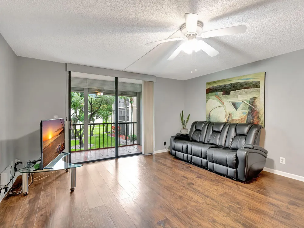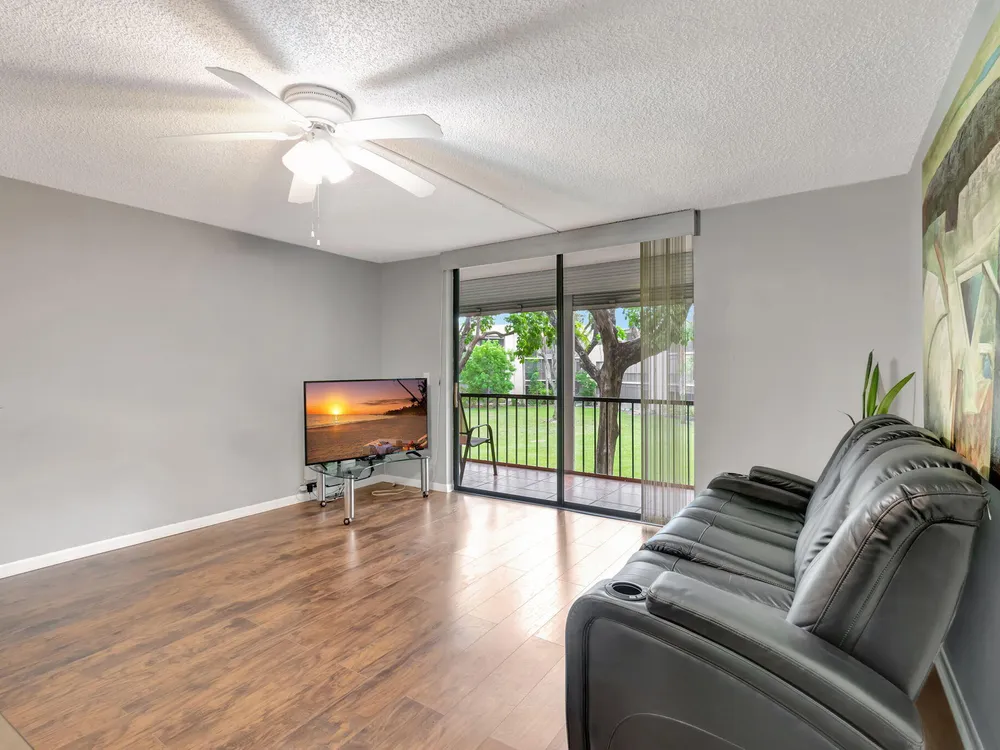 Welcome to this move-in ready 2-bedroom, 2-bath condo nestled in the highly desirable, manned gated community of Las Verdes. This well-maintained home features a fully renovated guest bathroom with a sleek, modern design and laminate flooring throughout for easy living. A spacious walk-in closet provides ample storage, and the screened-in balcony offers serene garden views. Residents enjoy access to resort-style amenities, including a fitness center, clubhouse, three swimming pools, tennis courts, and a picturesque lake-side walking trail. Conveniently located minutes from hospitals, shopping centers, restaurants, and beaches, this property combines comfort with accessibility. Rentals are allowed after two years, and the unit may be left partially furnished. Laundry available on floor.