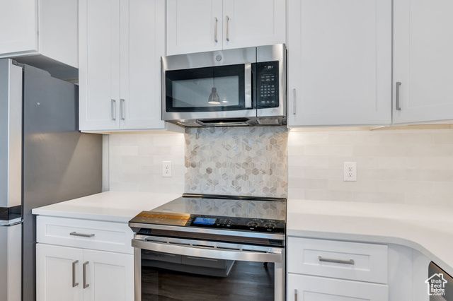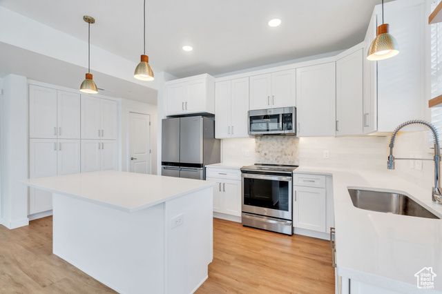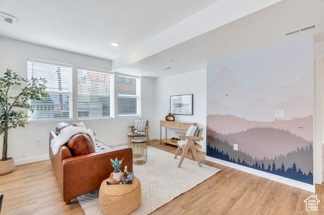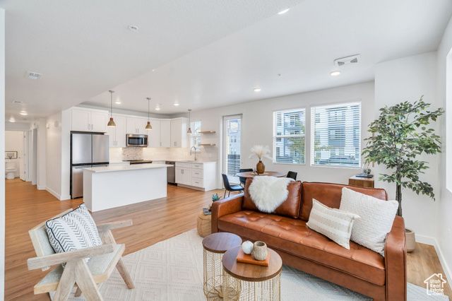 Experience the perfect blend of style, convenience, and low-maintenance living in this thoughtfully updated single-level Daybreak condo. Step inside to discover luxury vinyl plank flooring, room-darkening shades, and chic ceiling fans throughout. The modern kitchen is a showstopper, featuring floating shelves, crisp white quartz countertops, under-counter lighting, pendant lighting, an induction range stove and convection oven! Additional upgrades include stackable washer/dryer included, TV wall outlets, EcoBee thermostat, 2 Ring cameras, room darkening shades and drapes, and a keypad front lock for modern convenience and peace of mind. This condo combines style, function, and location, offering a comfortable, contemporary home in one of Daybreak's most vibrant communities. It's a short walk to TRAX, Oquirrh Lake, the new Bees Stadium, Daybreak Library, and U of U Health Care Center, this home offers both lifestyle and location, schedule your showing today!