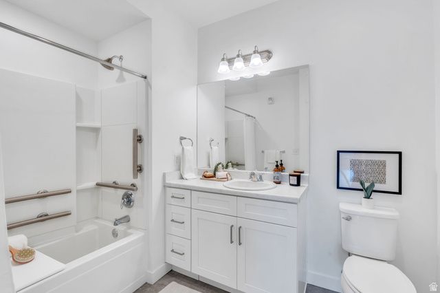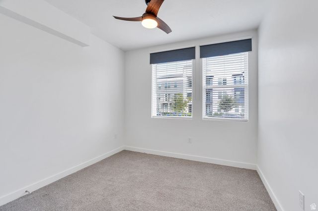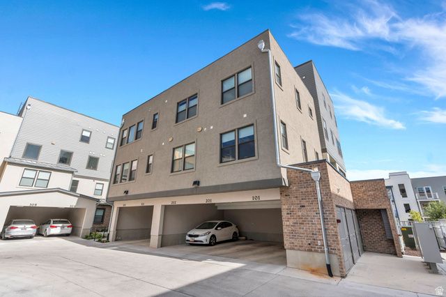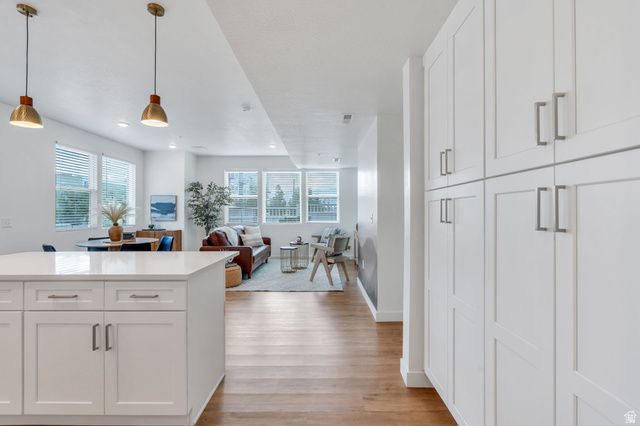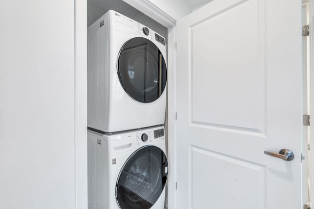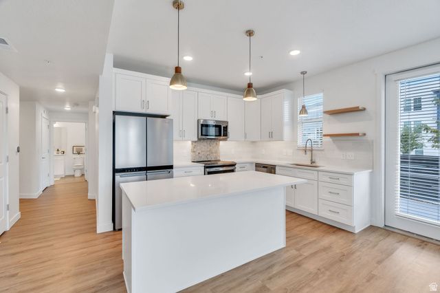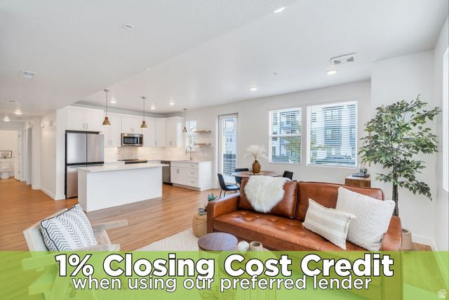 Experience this homes impeccable location in Daybreak's vibrant community! It's a short walk to TRAX, Oquirrh Lake, the new Bees Stadium, Daybreak Library, and U of U Health Care Center! Luxury vinyl plank flooring and abundant natural light greet you, the open-concept Great Room offers a perfect space for unwinding and entertaining. The pristine Kitchen is bright and clean featuring crisp quartz counters, an induction range and convection oven, floating shelving, ambient lighting, and chic pendant light accents! The Primary Suite is spacious and includes a Euro shower, double vanity sinks, crisp cabinetry and a generous walk-in closet! There are two Additional additional Bedrooms and a Full Bathroom, offering space for a home-office, exercise room, study space, library and more! The stackable washer/dryer are included and recent improvements include an Eco Bee thermostat, 2 Ring cameras, room darkening shades and drapes, and a keypad front lock for convenience! Come tour this beautiful home today