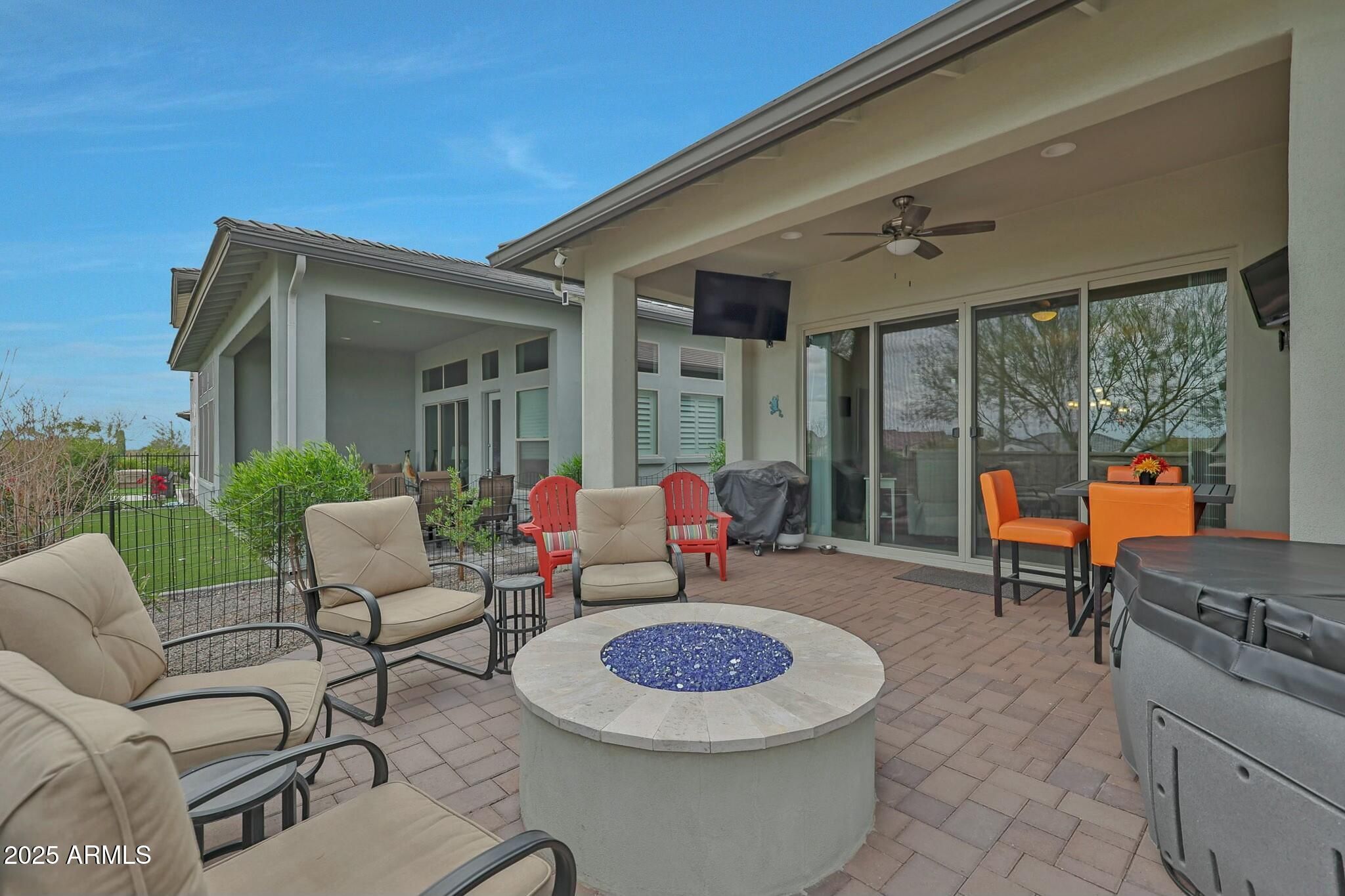 Welcome to Mountainside, the only gated community in Victory. This move-in ready single story home features two bedrooms PLUS den/office with French doors.RARE THREE CAR tandem garage and this seller has TONS of built-in cabinets for your storage. Neutral tones thruout, beautiful open kitchen w/under cab lighting & large quartz island, RO, open to dining & great room. Sliding doors to covered & sun patios; extended paver patio, outdoor TVs, paver walkways, turf & fire pit. Original owner upgraded w/wifi controls for hear/air/irrigation, tinted windows, ceiling fans in & out, sculpted carpet, quartz counters, gas range stub out, up/down shades, master dual head shower. Tankless water heater, GE water softener & garage utility sink. City light views from this perimeter David Weekley build!