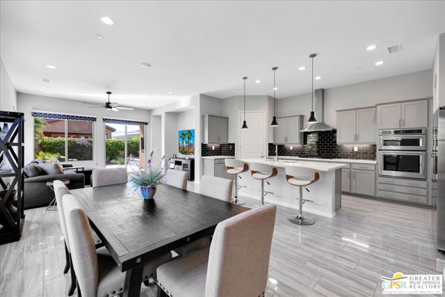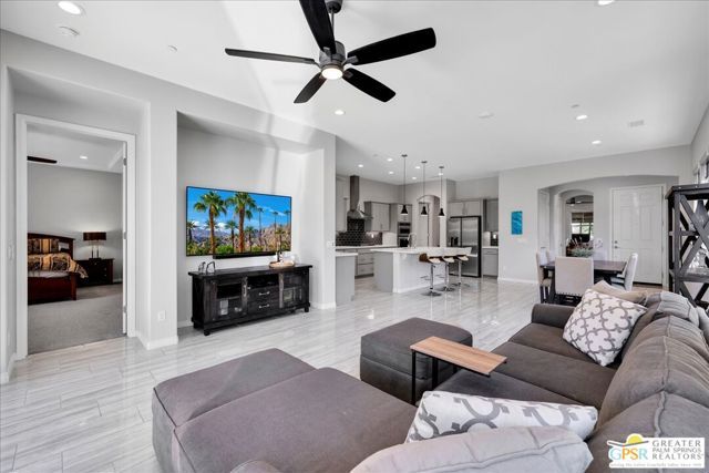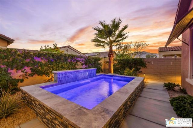 Refined Desert Living in Del Webb Rancho Mirage. Discover resort-inspired luxury in this beautifully appointed Phase 5, Plan 3 Expedition with Tuscan facade, ideally situated within the prestigious 55+ community of Del Webb Rancho Mirage. Thoughtfully designed with both comfort and sophistication in mind, this residence showcases a host of high-end upgrades and timeless finishes throughout. Step inside to find elegant tile flooring, upgraded carpet, custom window treatments, and designer Minka ceiling fans enhancing each room. The gourmet kitchen is a true centerpiece featuring upgraded cabinetry with modern brushed nickel hardware, a full tile backsplash, quartz countertops, stainless appliances, pantry, and a large island with ample seating - perfect for entertaining. Hand-selected pendant lighting and a reverse osmosis filtration system add refined touches to the space. The primary suite is a private retreat offering serene views of your backyard and raised spool. Details include a tray ceiling, upgraded LED lighting, and a luxurious ensuite with dual vanities, sconce lighting, a walk-in shower with bench, linen storage, and a walk-in closet with custom built-ins. The backyard is designed for effortless relaxation and entertaining, complete with a covered patio featuring a ceiling fan, zipper shades, and ambient lighting. A bubbling water fountain and raised spool with a waterfall feature create a tranquil ambiance, while peek-a-boo mountain views add a perfect desert backdrop. The guest suite, located on the opposite end of the home for added privacy, offers a spacious walk-in closet and access to a full bath. Additional highlights include a climate-controlled, insulated garage, upgraded architectural arch package, and Cat6 network wiring with Wi-Fi booster for seamless connectivity. Located just moments from the spectacular Del Webb clubhouse, residents enjoy access to world-class amenities including a resort-style pool and spa, fitness center, tennis and pickleball courts, bar, and an active social calendar - all within a secure, guard-gated setting. This home offers a perfect blend of luxury, privacy, and refined desert living in one of the Coachella Valley's most desirable 55+ communities.