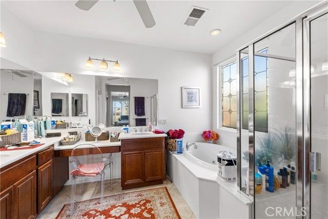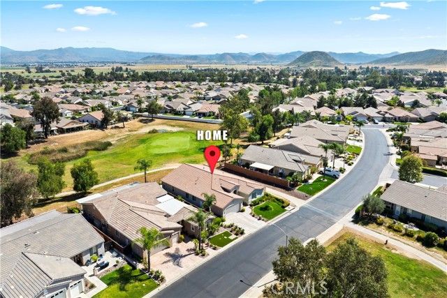 Stunning home on arguably the most coveted private lot in this extraordinary 55+ gated community with 24/7 security beautiful views surrounded by Hemet Golf course and hills. The front of the house overlooks a tee-box and lush fairway and the views from the back include a view of mountains a panoramic view. Enter into magnificent custom tile floors that go throughout the house expect carpeted bedrooms and wood type floor in office/den . This is the largest model with over 2700 sq ft 3 bedroom 3 baths and a den/office. The formal living room features a gorgeous double sided fireplace , French door type sliders lead to the spacious patio large family room connected to gourmet kitchen that has custom cabinets, granite, water purifier, Large master bedroom with lovely views has 2 large walk in closets other two bedrooms are separated by a full bath. This home is lovely make it a must see. The community is top notch offering many activities and a full Bistro for dining plus movie theater and much more. Professional photos coming