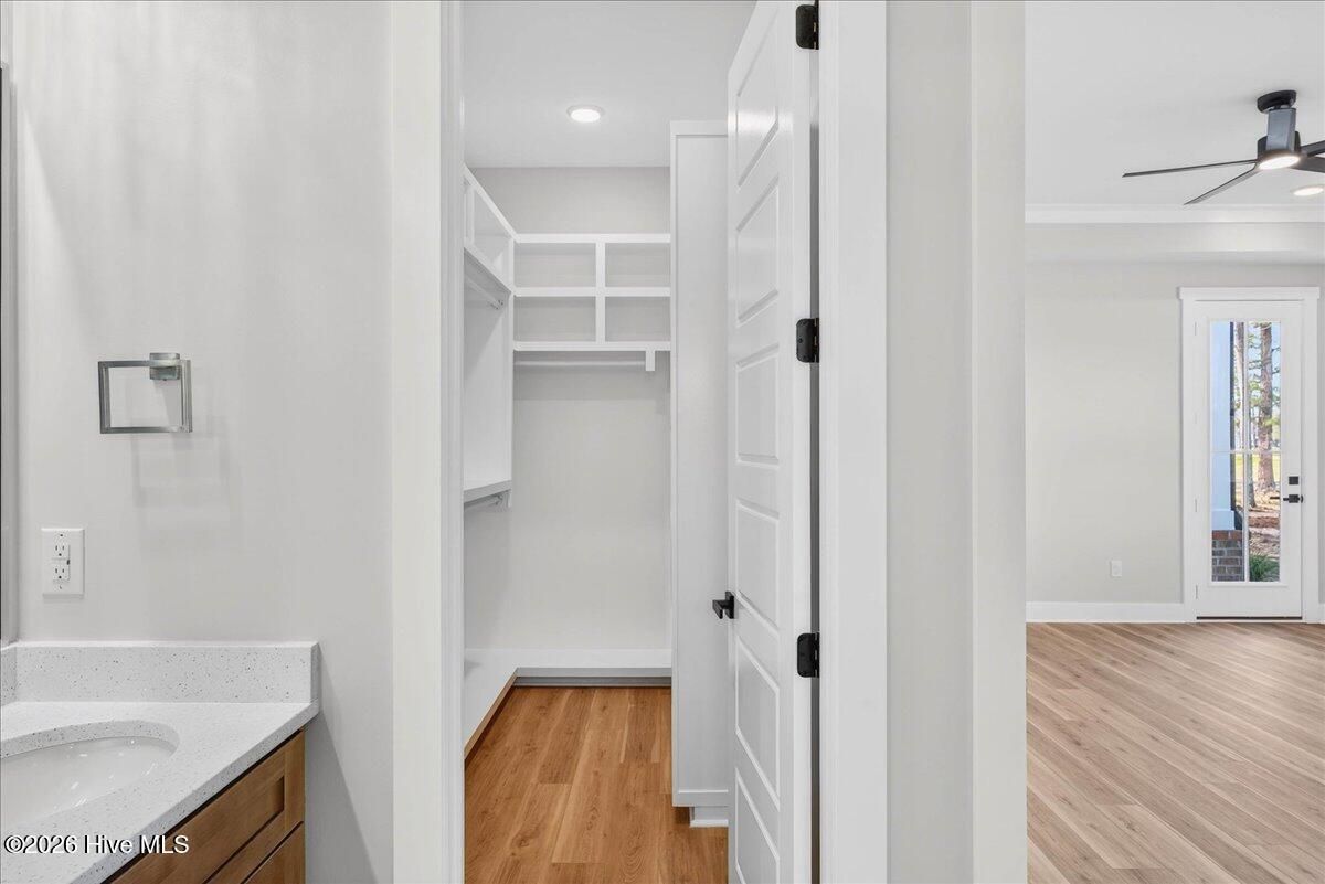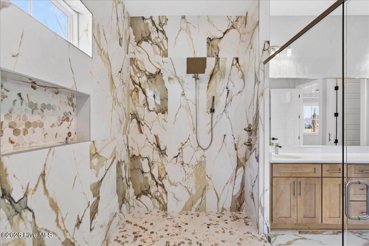 - Master Downstairs, Walk-In Closet(s), Vaulted Ceiling(s), Tray Ceiling(s), High Ceilings, Entrance Foyer, Kitchen Island, Ceiling Fan(s), Pantry, Walk-In Shower, Built-in Features