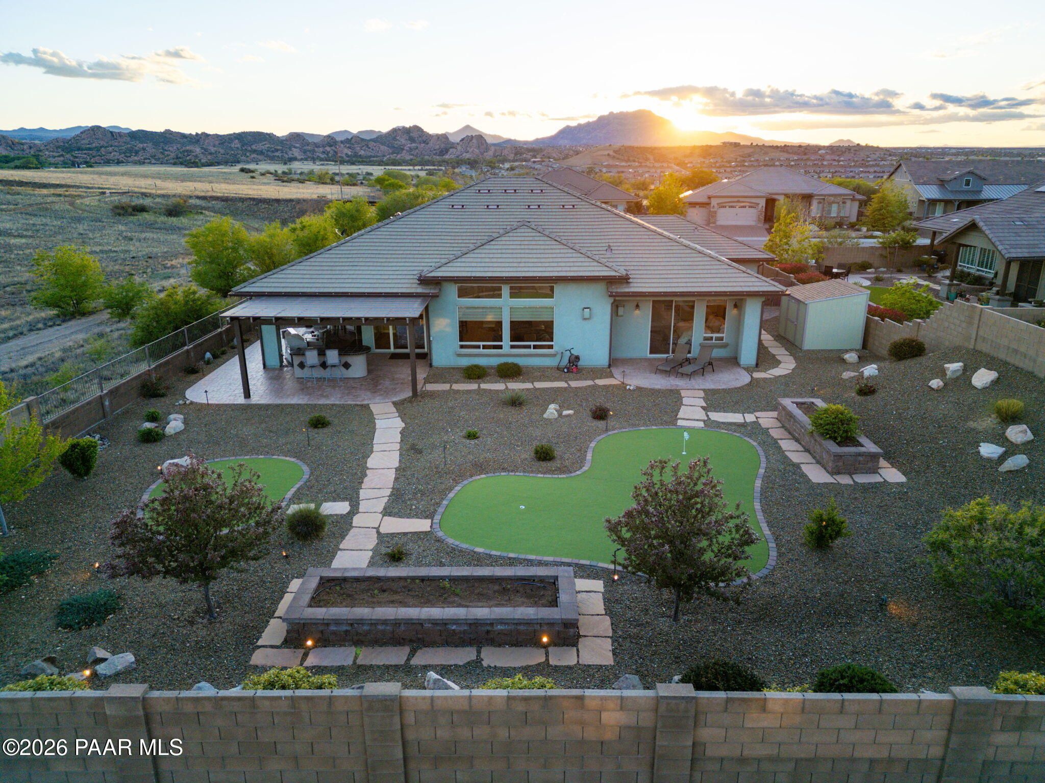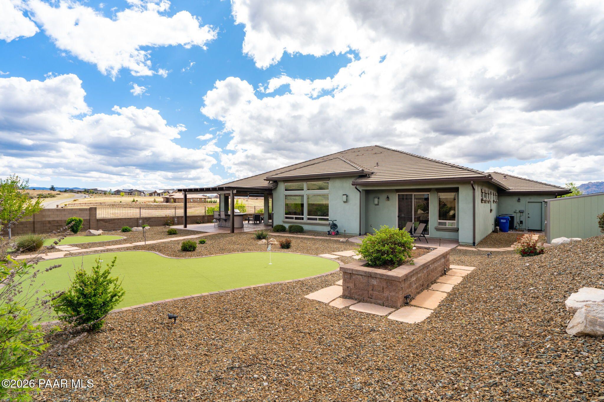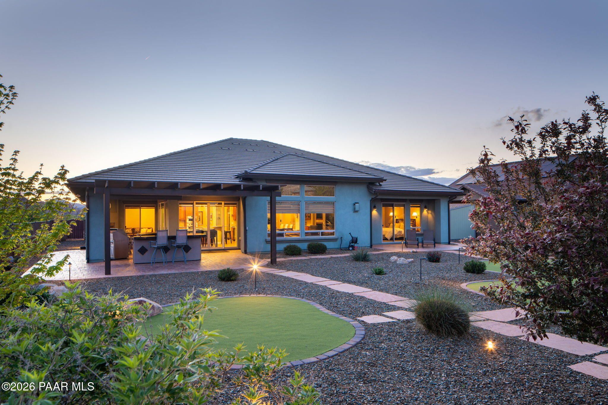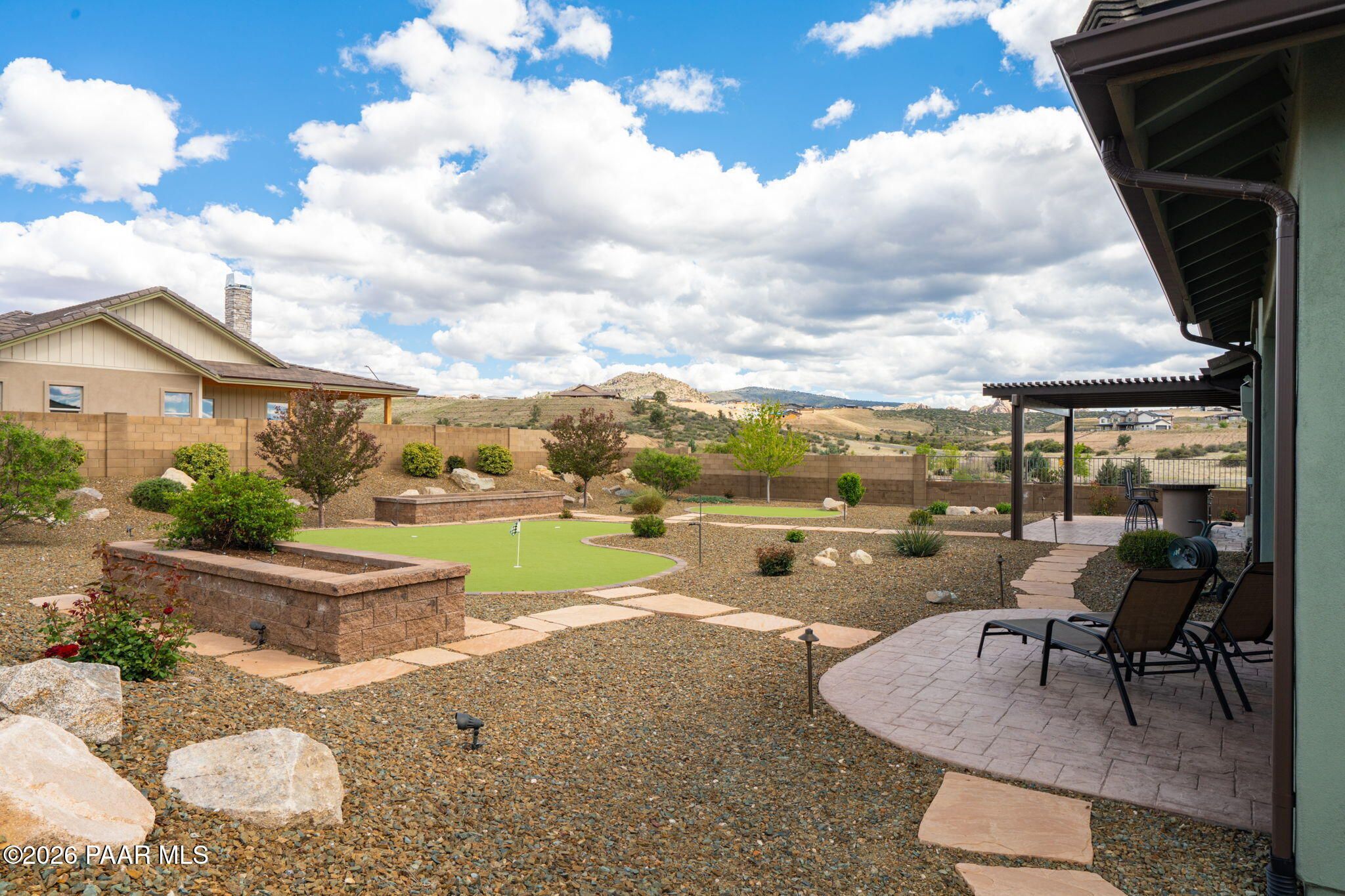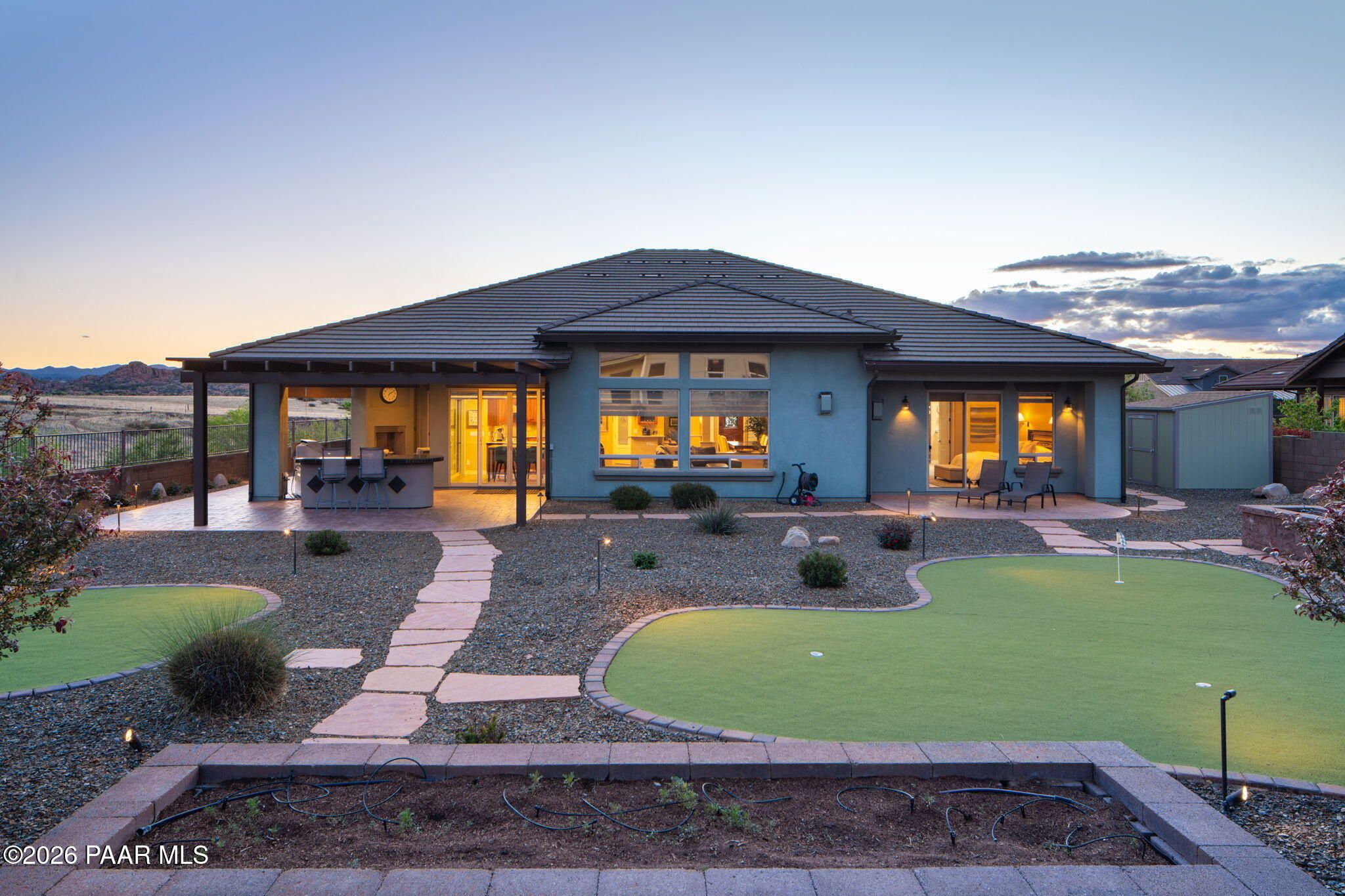 Refined single-level luxury living in the highly desirable Granite Dells Estates, set on a premium 0.49-acre cul-de-sac view lot with neighborhood access to the Peavine Recreation Trail. This highly upgraded Carrington semi-custom home offers 3,132 square feet of thoughtfully designed living space with 4 bedrooms, 3 bathrooms and an extended 3-car garage. A desirable split floor plan provides both privacy and functionality, while expansive hideaway sliding doors create seamless indoor-outdoor flow. Move-in ready with no construction delays or cost uncertainty, this residence is ideal for full-time living, a second home or a lock-and-leave lifestyle in the heart of Prescott. Outdoor living is elevated with approximately 360 square feet of covered patio space designed for year-round enjoyment. The backyard is an entertainer's dream, featuring a spacious outdoor kitchen prep island, large stainless steel natural gas grill, stamped concrete patio with a 14x20 wood-grain aluminum pergola, gas outdoor fireplace, retractable privacy sun screens and a private putting green. Professionally designed landscaping includes raised flower beds, low-voltage lighting, and a timed drip irrigation system, all enclosed by a privacy block wall.Inside, the gourmet kitchen is designed to impress with a professional-grade appliance suite including Wolf, Sub-Zero, and Cove, complemented by quartz countertops, a full backsplash and a large island with prep sink and bistro seating. Custom European Beechwood cabinetry with soft-close features, dual Blanco sinks, a walk-in pantry with motion lighting, and designer accents elevate both form and function. The adjacent formal dining room with built-in buffet and china cabinetry, along with a sunlit breakfast nook, offers versatile spaces for both casual and formal entertaining.The primary suite serves as a private retreat with a gas fireplace, spa-inspired bath featuring a walk-in shower with bench seating, in-wall heater, dual vanities and an oversized custom walk-in closet with built-ins. A private patio entrance enhances the suite's tranquil feel. An additional ensuite bedroom provides comfort for guests or multigenerational living, while another bedroom and a dedicated office or fourth bedroom includes custom built-ins and private patio access, offering flexibility for today's lifestyle. Extensive interior upgrades include wood-look ceramic tile flooring, pre-wired surround sound, raised counters, gas fireplaces, whole-house water softener, Hunter Douglas automated blinds with shutters, tinted upper windows and retractable patio screens. The extended 3-car garage is just as impressive, featuring epoxy flooring, built-in cabinetry, heavy-duty shelving and a remote drop-down storage lift all while easily accommodating a full-size pickup truck. Additional features include a tankless water heater with recirculation pump, whole-house sprinkler system and a 240V outlet for EV charging. Residents enjoy access to exceptional community amenities including a clubhouse, pool, spa, fitness center and pickleball courts set against the iconic Granite Dells backdrop. Conveniently located near shopping, dining, medical services and historic downtown Prescott, with easy highway access to Phoenix and Flagstaff. This home combines Carrington build quality, premium upgrades, exceptional outdoor living, views and a prime cul-de-sac location delivering the best of the Prescott lifestyle.