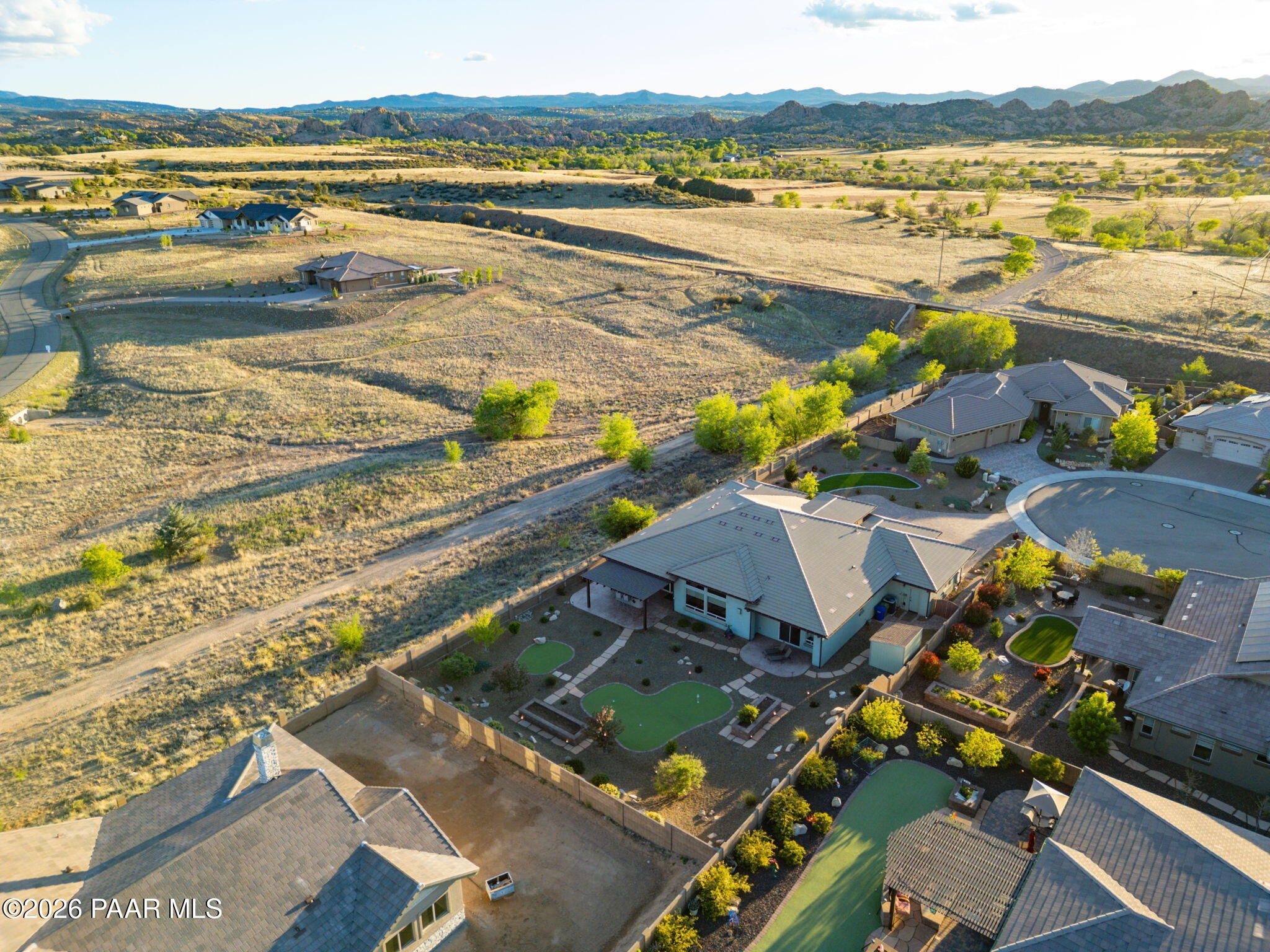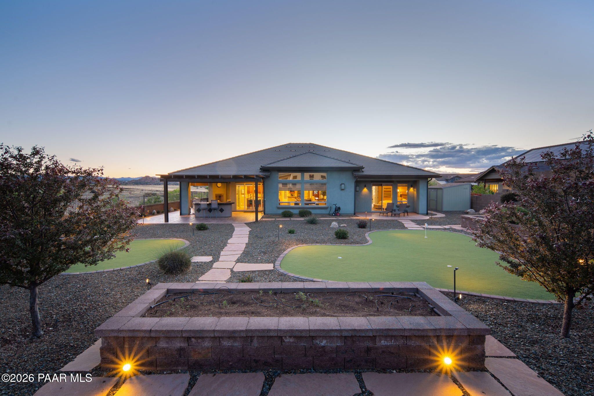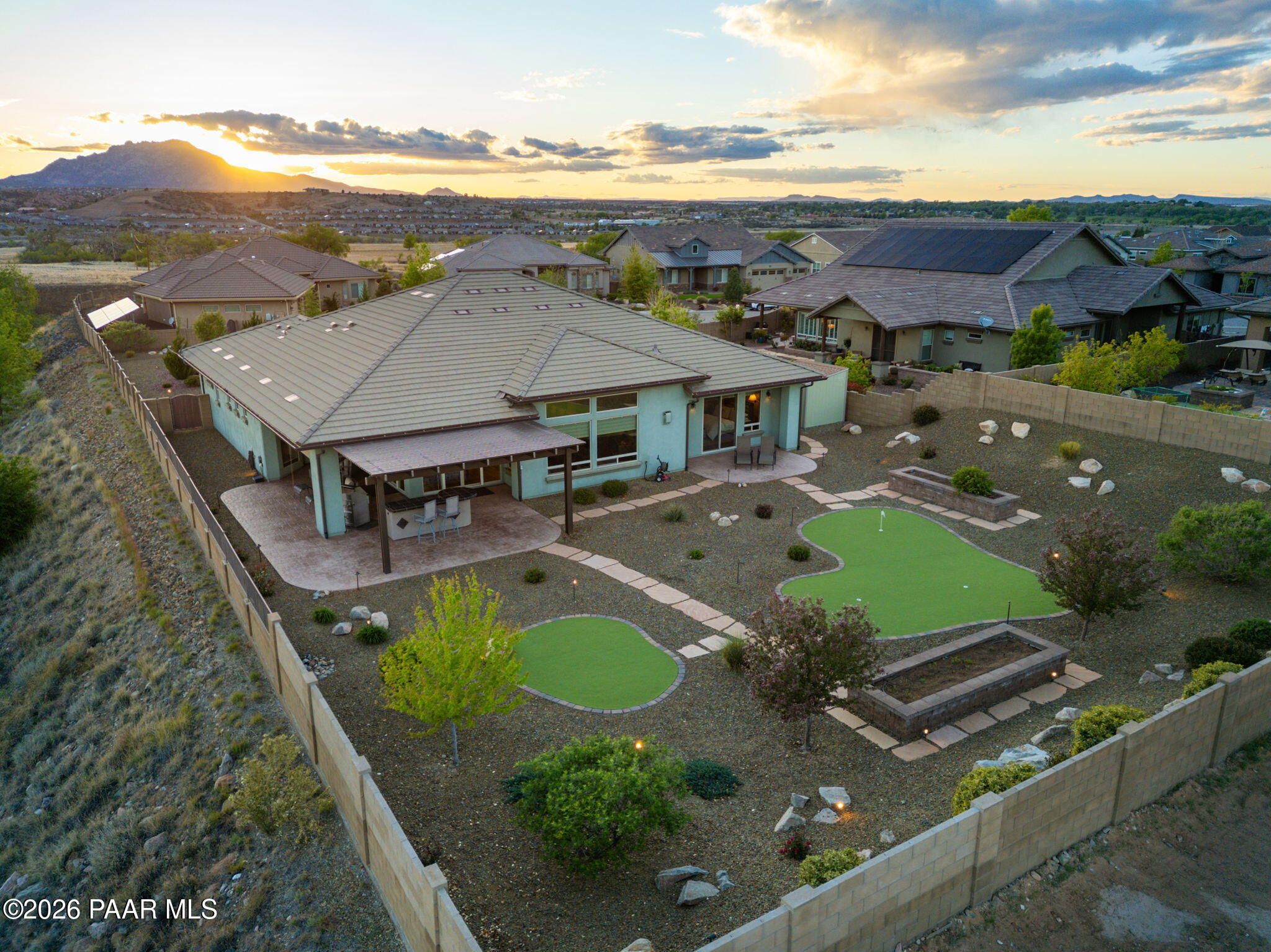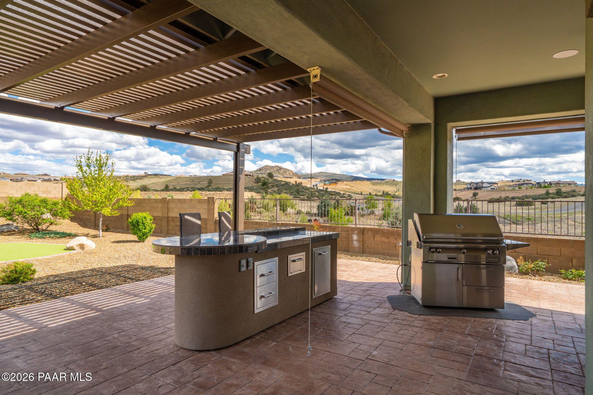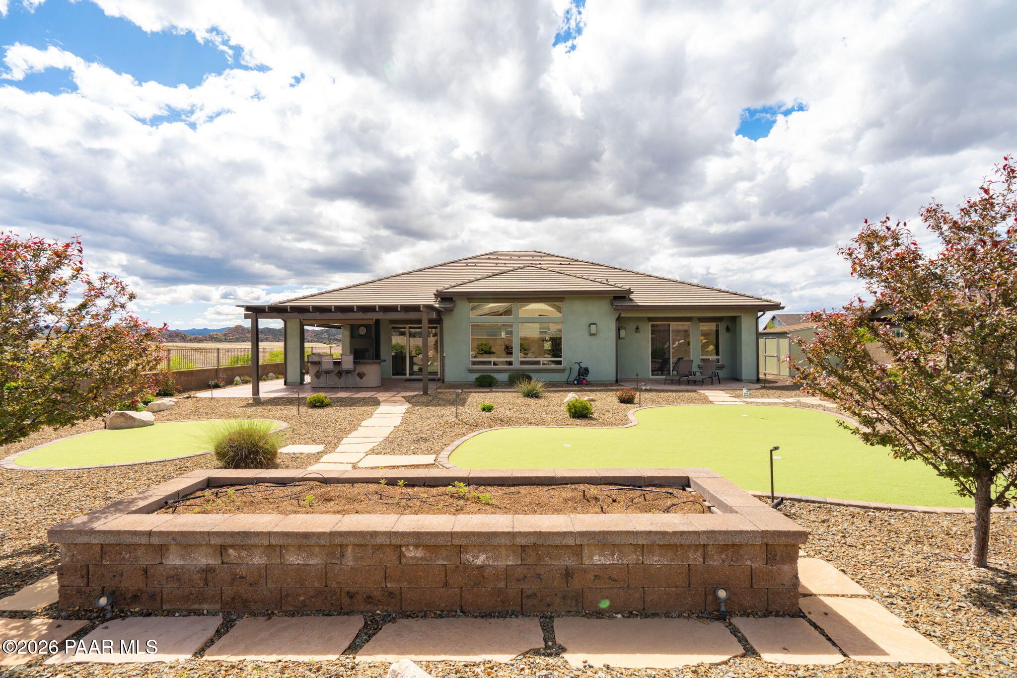 Refined single-level luxury living in the highly desirable Granite Dells Estates, set on a premium 0.49-acre cul-de-sac view lot with neighborhood access to the Peavine Recreation Trail. This highly upgraded Carrington semi-custom home offers 3,132 square feet of thoughtfully designed living space with 4 bedrooms, 3 bathrooms and an extended 3-car garage. A desirable split floor plan provides both privacy and functionality, while expansive hideaway sliding doors create seamless indoor-outdoor flow. Move-in ready with no construction delays or cost uncertainty, this residence is ideal for full-time living, a second home or a lock-and-leave lifestyle in the heart of Prescott. Outdoor living is elevated with approximately 360 square feet of covered patio space designed for year-round enjoyment. The backyard is an entertainer's dream, featuring a spacious outdoor kitchen prep island, large stainless steel natural gas grill, stamped concrete patio with a 14x20 wood-grain aluminum pergola, gas outdoor fireplace, retractable privacy sun screens and a private putting green. Professionally designed landscaping includes raised flower beds, low-voltage lighting, and a timed drip irrigation system, all enclosed by a privacy block wall.Inside, the gourmet kitchen is designed to impress with a professional-grade appliance suite including Wolf, Sub-Zero, and Cove, complemented by quartz countertops, a full backsplash and a large island with prep sink and bistro seating. Custom European Beechwood cabinetry with soft-close features, dual Blanco sinks, a walk-in pantry with motion lighting, and designer accents elevate both form and function. The adjacent formal dining room with built-in buffet and china cabinetry, along with a sunlit breakfast nook, offers versatile spaces for both casual and formal entertaining.The primary suite serves as a private retreat with a gas fireplace, spa-inspired bath featuring a walk-in shower with bench seating, in-wall heater, dual vanities and an oversized custom walk-in closet with built-ins. A private patio entrance enhances the suite's tranquil feel. An additional ensuite bedroom provides comfort for guests or multigenerational living, while another bedroom and a dedicated office or fourth bedroom includes custom built-ins and private patio access, offering flexibility for today's lifestyle. Extensive interior upgrades include wood-look ceramic tile flooring, pre-wired surround sound, raised counters, gas fireplaces, whole-house water softener, Hunter Douglas automated blinds with shutters, tinted upper windows and retractable patio screens. The extended 3-car garage is just as impressive, featuring epoxy flooring, built-in cabinetry, heavy-duty shelving and a remote drop-down storage lift all while easily accommodating a full-size pickup truck. Additional features include a tankless water heater with recirculation pump, whole-house sprinkler system and a 240V outlet for EV charging. Residents enjoy access to exceptional community amenities including a clubhouse, pool, spa, fitness center and pickleball courts set against the iconic Granite Dells backdrop. Conveniently located near shopping, dining, medical services and historic downtown Prescott, with easy highway access to Phoenix and Flagstaff. This home combines Carrington build quality, premium upgrades, exceptional outdoor living, views and a prime cul-de-sac location delivering the best of the Prescott lifestyle.