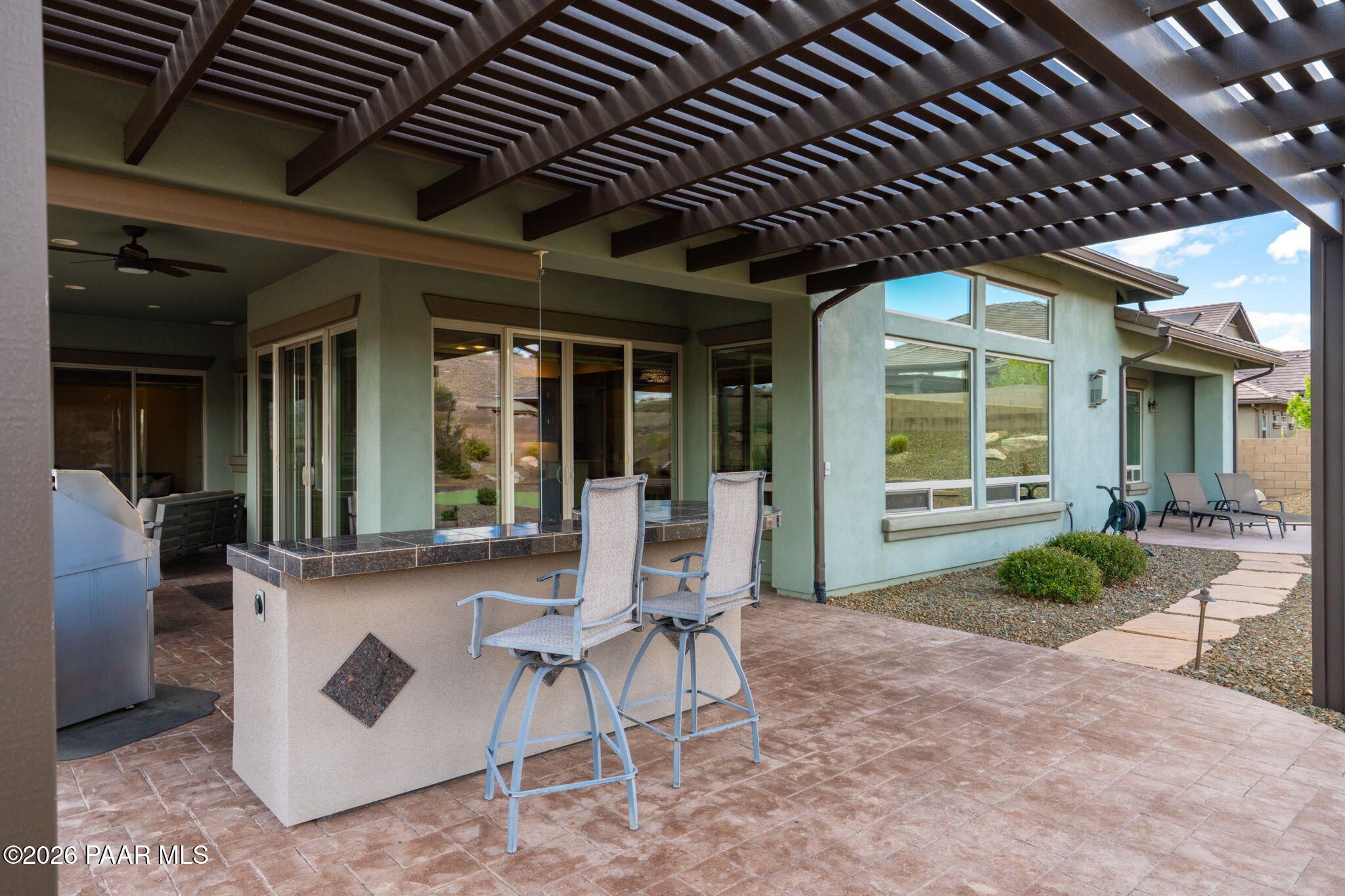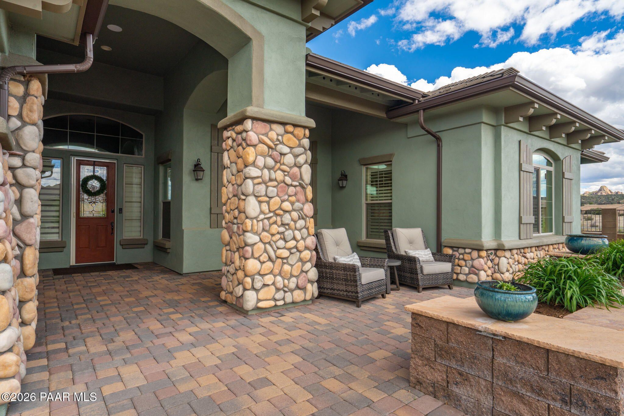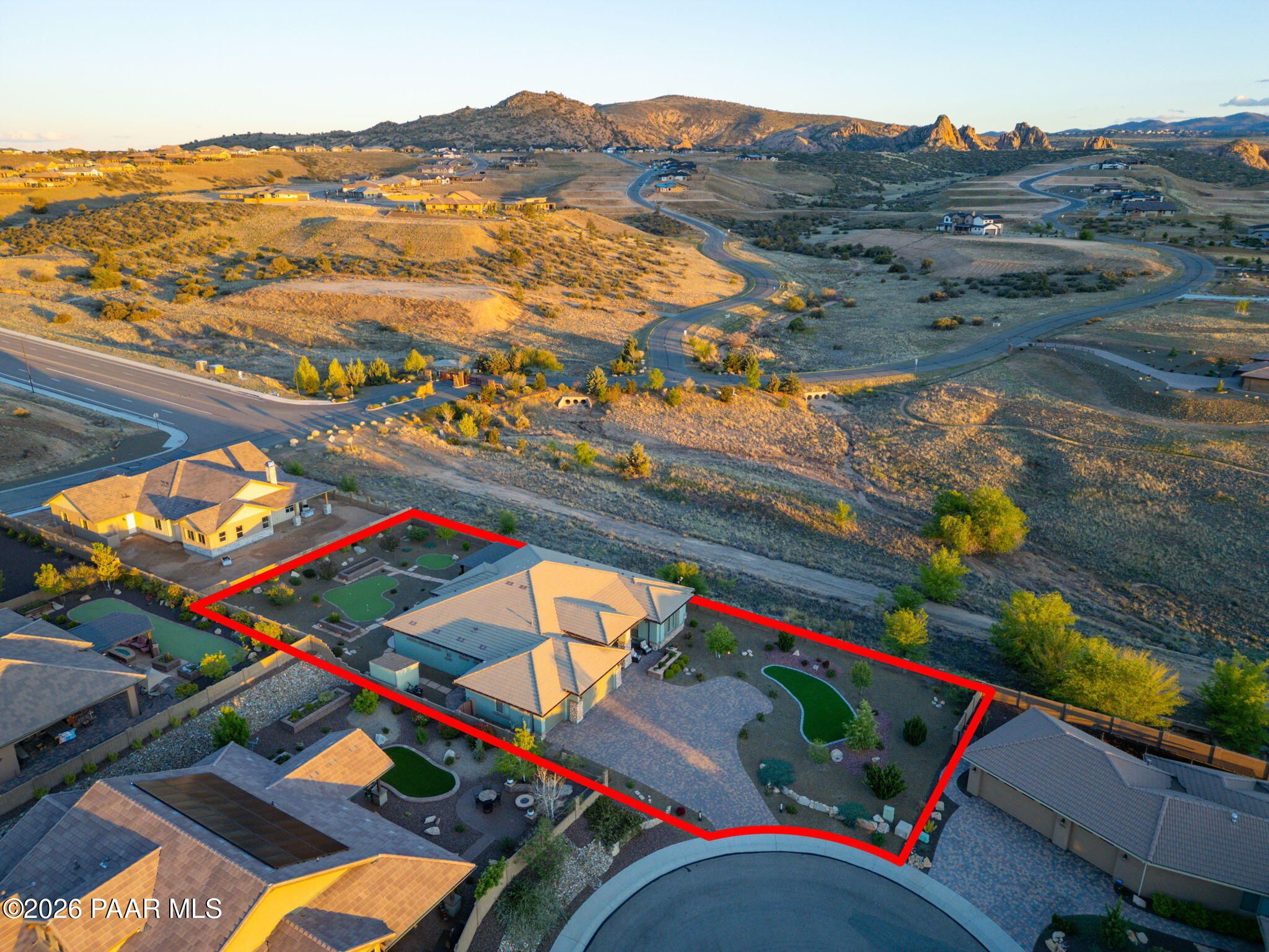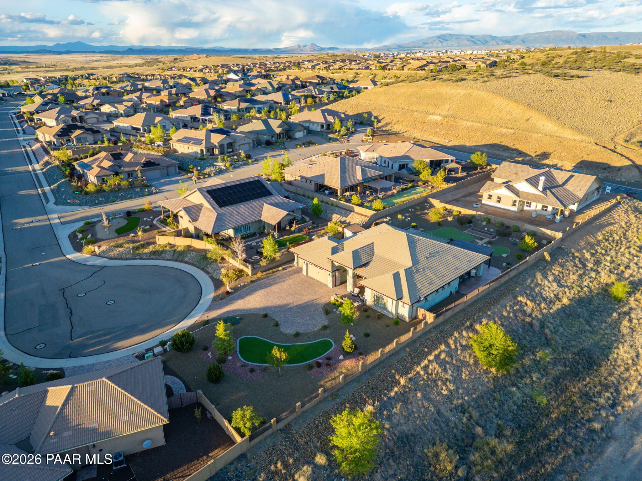 Refined single-level luxury living in the highly desirable Granite Dells Estates, set on a premium 0.49-acre cul-de-sac view lot with neighborhood access to the Peavine Recreation Trail. This highly upgraded Carrington semi-custom home offers 3,132 square feet of thoughtfully designed living space with 4 bedrooms, 3 bathrooms and an extended 3-car garage. A desirable split floor plan provides both privacy and functionality, while expansive hideaway sliding doors create seamless indoor-outdoor flow. Move-in ready with no construction delays or cost uncertainty, this residence is ideal for full-time living, a second home or a lock-and-leave lifestyle in the heart of Prescott. Outdoor living is elevated with approximately 360 square feet of covered patio space designed for year-round enjoyment. The backyard is an entertainer's dream, featuring a spacious outdoor kitchen prep island, large stainless steel natural gas grill, stamped concrete patio with a 14x20 wood-grain aluminum pergola, gas outdoor fireplace, retractable privacy sun screens and a private putting green. Professionally designed landscaping includes raised flower beds, low-voltage lighting, and a timed drip irrigation system, all enclosed by a privacy block wall.Inside, the gourmet kitchen is designed to impress with a professional-grade appliance suite including Wolf, Sub-Zero, and Cove, complemented by quartz countertops, a full backsplash and a large island with prep sink and bistro seating. Custom European Beechwood cabinetry with soft-close features, dual Blanco sinks, a walk-in pantry with motion lighting, and designer accents elevate both form and function. The adjacent formal dining room with built-in buffet and china cabinetry, along with a sunlit breakfast nook, offers versatile spaces for both casual and formal entertaining.The primary suite serves as a private retreat with a gas fireplace, spa-inspired bath featuring a walk-in shower with bench seating, in-wall heater, dual vanities and an oversized custom walk-in closet with built-ins. A private patio entrance enhances the suite's tranquil feel. An additional ensuite bedroom provides comfort for guests or multigenerational living, while another bedroom and a dedicated office or fourth bedroom includes custom built-ins and private patio access, offering flexibility for today's lifestyle. Extensive interior upgrades include wood-look ceramic tile flooring, pre-wired surround sound, raised counters, gas fireplaces, whole-house water softener, Hunter Douglas automated blinds with shutters, tinted upper windows and retractable patio screens. The extended 3-car garage is just as impressive, featuring epoxy flooring, built-in cabinetry, heavy-duty shelving and a remote drop-down storage lift all while easily accommodating a full-size pickup truck. Additional features include a tankless water heater with recirculation pump, whole-house sprinkler system and a 240V outlet for EV charging. Residents enjoy access to exceptional community amenities including a clubhouse, pool, spa, fitness center and pickleball courts set against the iconic Granite Dells backdrop. Conveniently located near shopping, dining, medical services and historic downtown Prescott, with easy highway access to Phoenix and Flagstaff. This home combines Carrington build quality, premium upgrades, exceptional outdoor living, views and a prime cul-de-sac location delivering the best of the Prescott lifestyle.