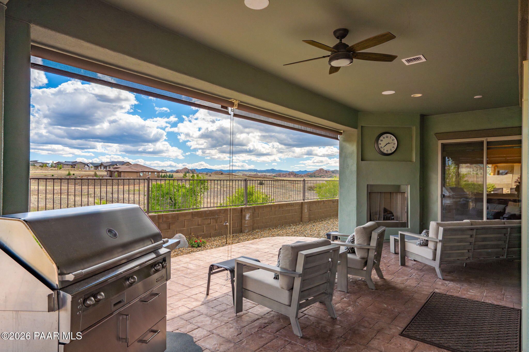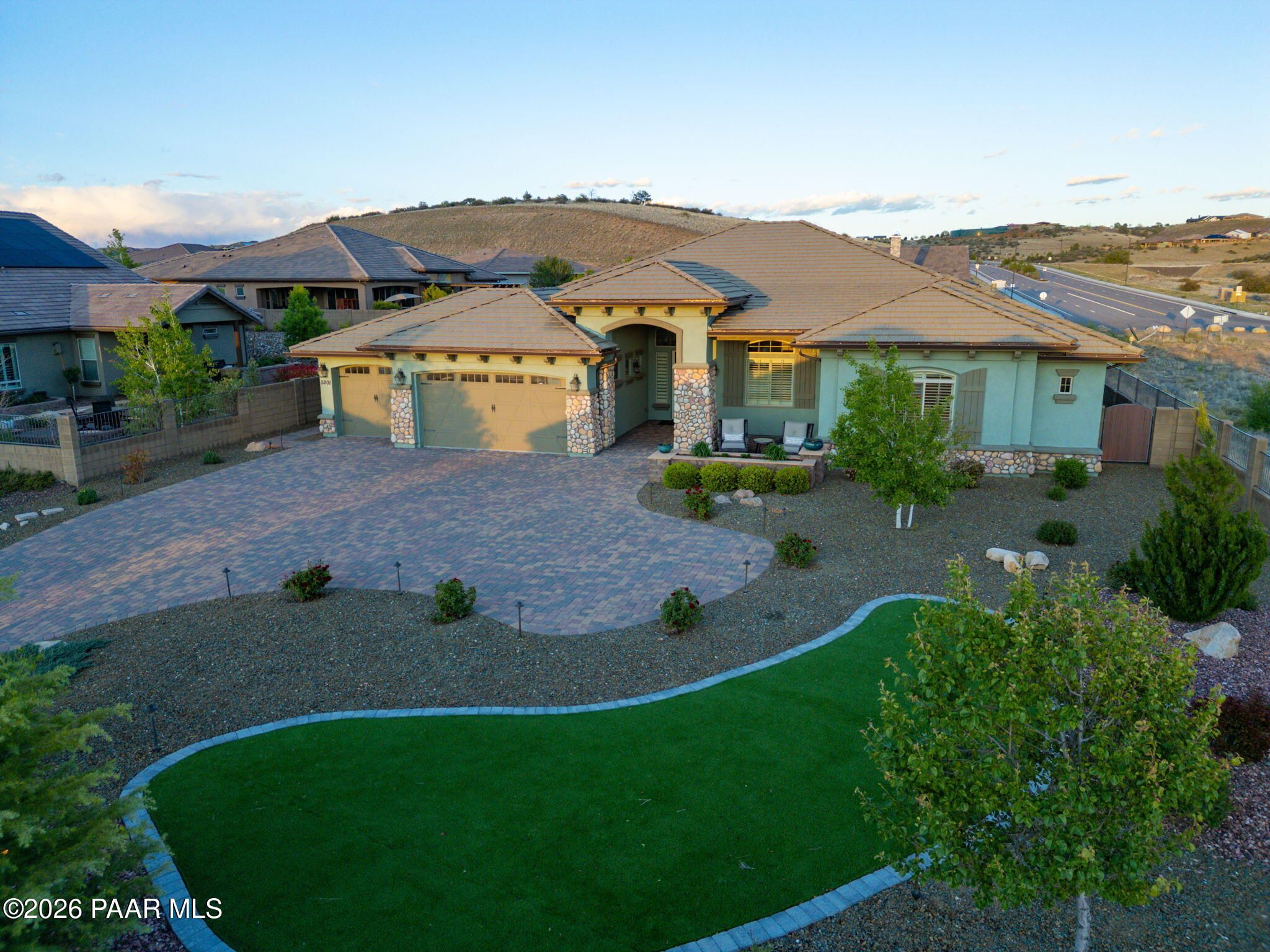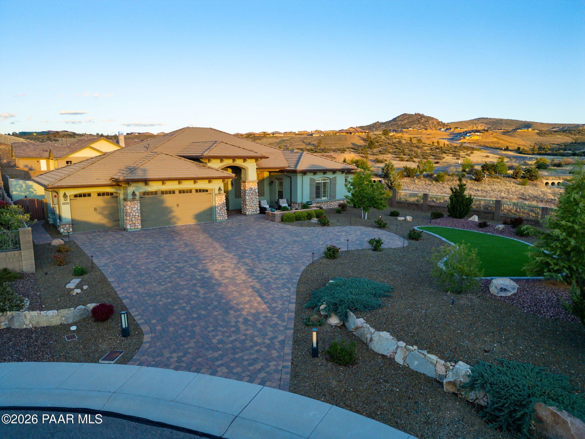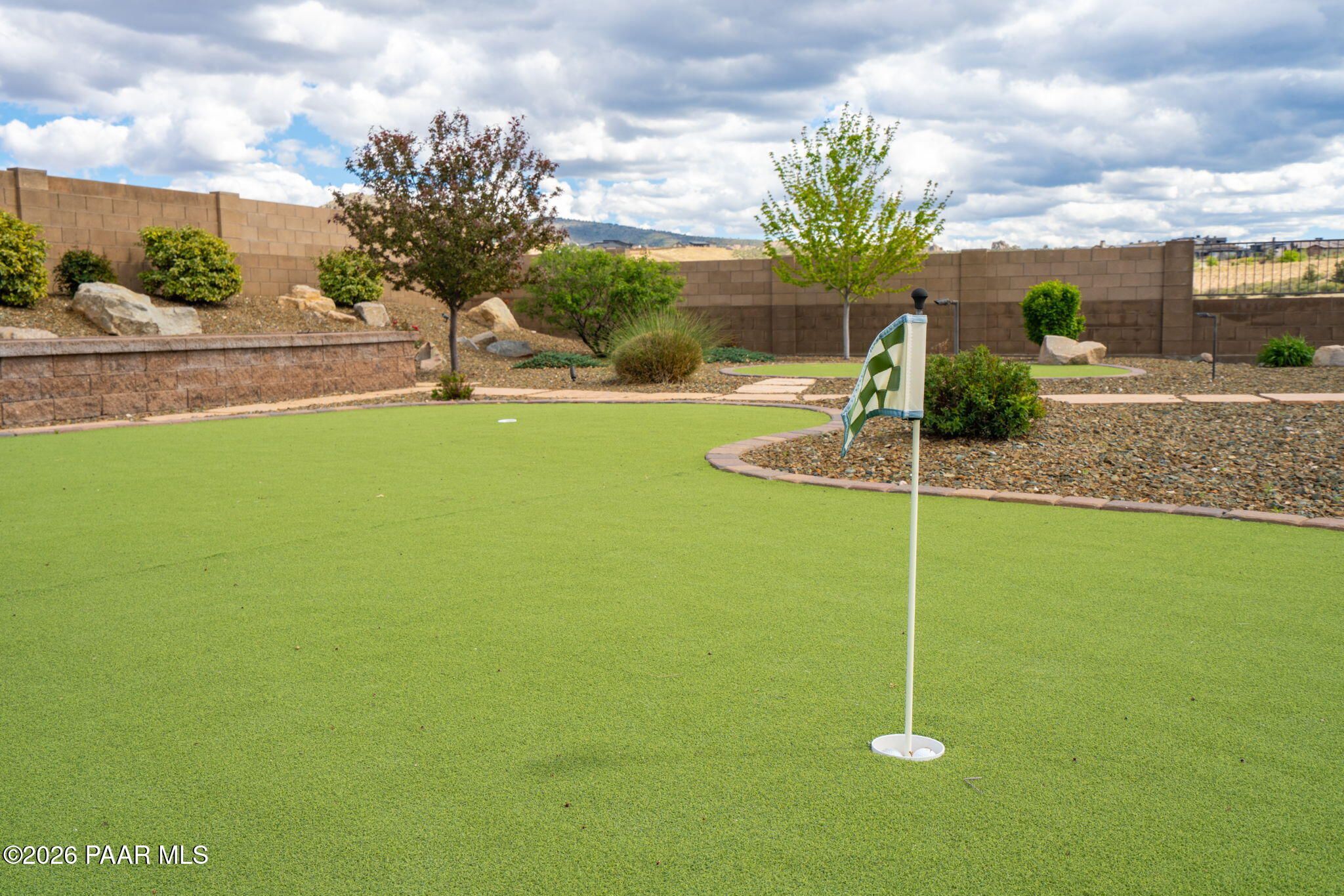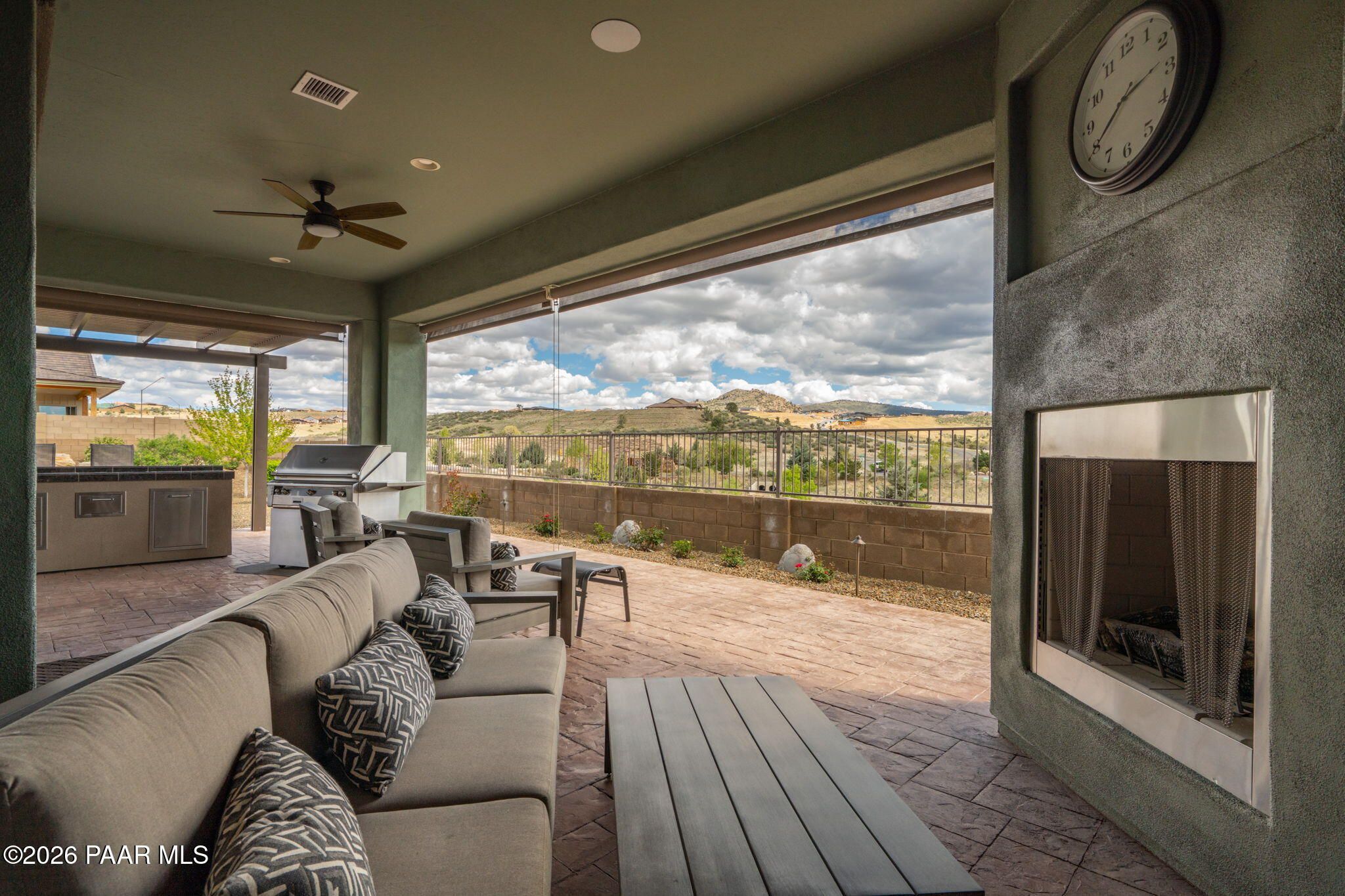 Refined single-level luxury living in the highly desirable Granite Dells Estates, set on a premium 0.49-acre cul-de-sac view lot with neighborhood access to the Peavine Recreation Trail. This highly upgraded Carrington semi-custom home offers 3,132 square feet of thoughtfully designed living space with 4 bedrooms, 3 bathrooms and an extended 3-car garage. A desirable split floor plan provides both privacy and functionality, while expansive hideaway sliding doors create seamless indoor-outdoor flow. Move-in ready with no construction delays or cost uncertainty, this residence is ideal for full-time living, a second home or a lock-and-leave lifestyle in the heart of Prescott. Outdoor living is elevated with approximately 360 square feet of covered patio space designed for year-round enjoyment. The backyard is an entertainer's dream, featuring a spacious outdoor kitchen prep island, large stainless steel natural gas grill, stamped concrete patio with a 14x20 wood-grain aluminum pergola, gas outdoor fireplace, retractable privacy sun screens and a private putting green. Professionally designed landscaping includes raised flower beds, low-voltage lighting, and a timed drip irrigation system, all enclosed by a privacy block wall.Inside, the gourmet kitchen is designed to impress with a professional-grade appliance suite including Wolf, Sub-Zero, and Cove, complemented by quartz countertops, a full backsplash and a large island with prep sink and bistro seating. Custom European Beechwood cabinetry with soft-close features, dual Blanco sinks, a walk-in pantry with motion lighting, and designer accents elevate both form and function. The adjacent formal dining room with built-in buffet and china cabinetry, along with a sunlit breakfast nook, offers versatile spaces for both casual and formal entertaining.The primary suite serves as a private retreat with a gas fireplace, spa-inspired bath featuring a walk-in shower with bench seating, in-wall heater, dual vanities and an oversized custom walk-in closet with built-ins. A private patio entrance enhances the suite's tranquil feel. An additional ensuite bedroom provides comfort for guests or multigenerational living, while another bedroom and a dedicated office or fourth bedroom includes custom built-ins and private patio access, offering flexibility for today's lifestyle. Extensive interior upgrades include wood-look ceramic tile flooring, pre-wired surround sound, raised counters, gas fireplaces, whole-house water softener, Hunter Douglas automated blinds with shutters, tinted upper windows and retractable patio screens. The extended 3-car garage is just as impressive, featuring epoxy flooring, built-in cabinetry, heavy-duty shelving and a remote drop-down storage lift all while easily accommodating a full-size pickup truck. Additional features include a tankless water heater with recirculation pump, whole-house sprinkler system and a 240V outlet for EV charging. Residents enjoy access to exceptional community amenities including a clubhouse, pool, spa, fitness center and pickleball courts set against the iconic Granite Dells backdrop. Conveniently located near shopping, dining, medical services and historic downtown Prescott, with easy highway access to Phoenix and Flagstaff. This home combines Carrington build quality, premium upgrades, exceptional outdoor living, views and a prime cul-de-sac location delivering the best of the Prescott lifestyle.