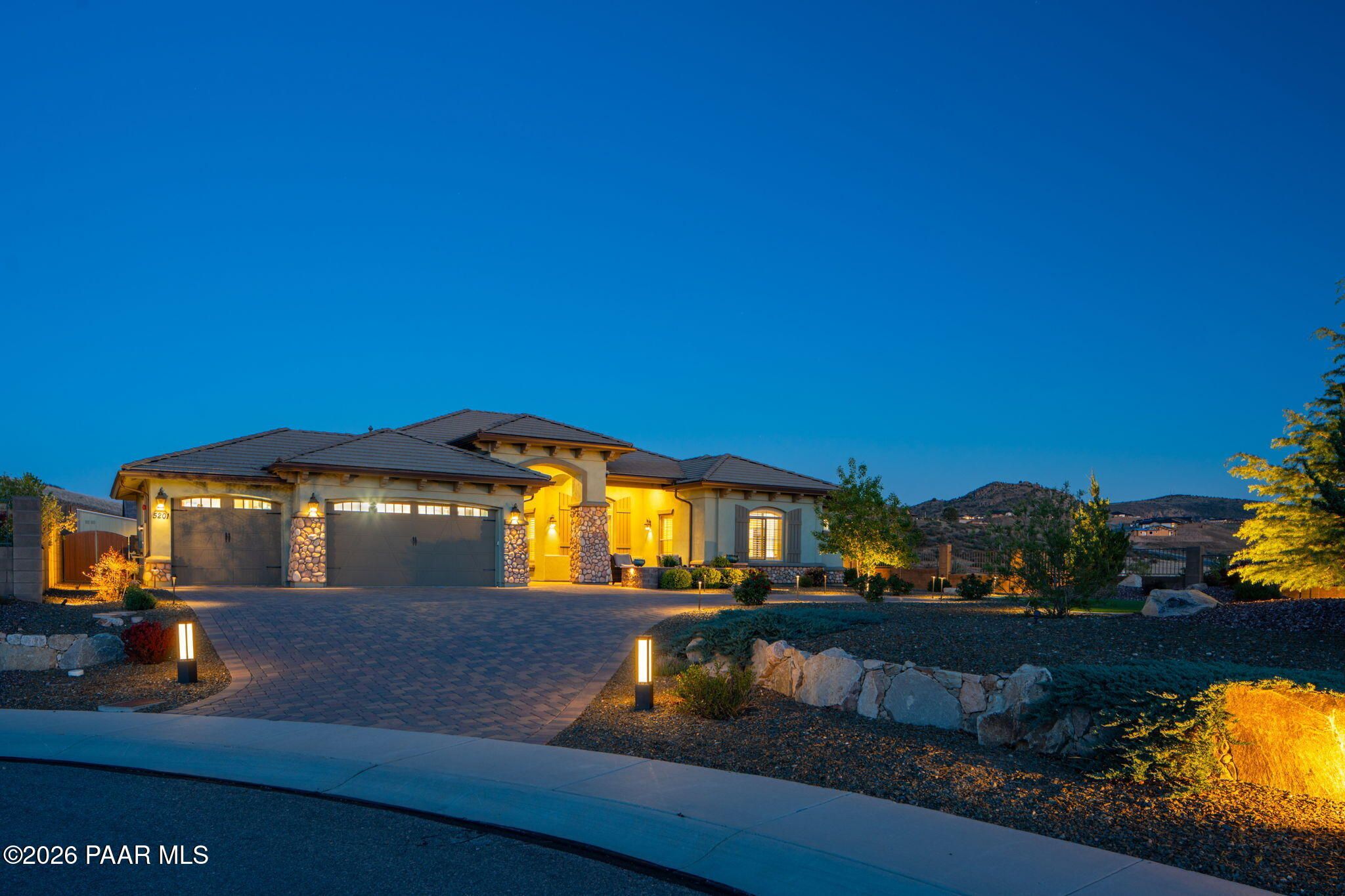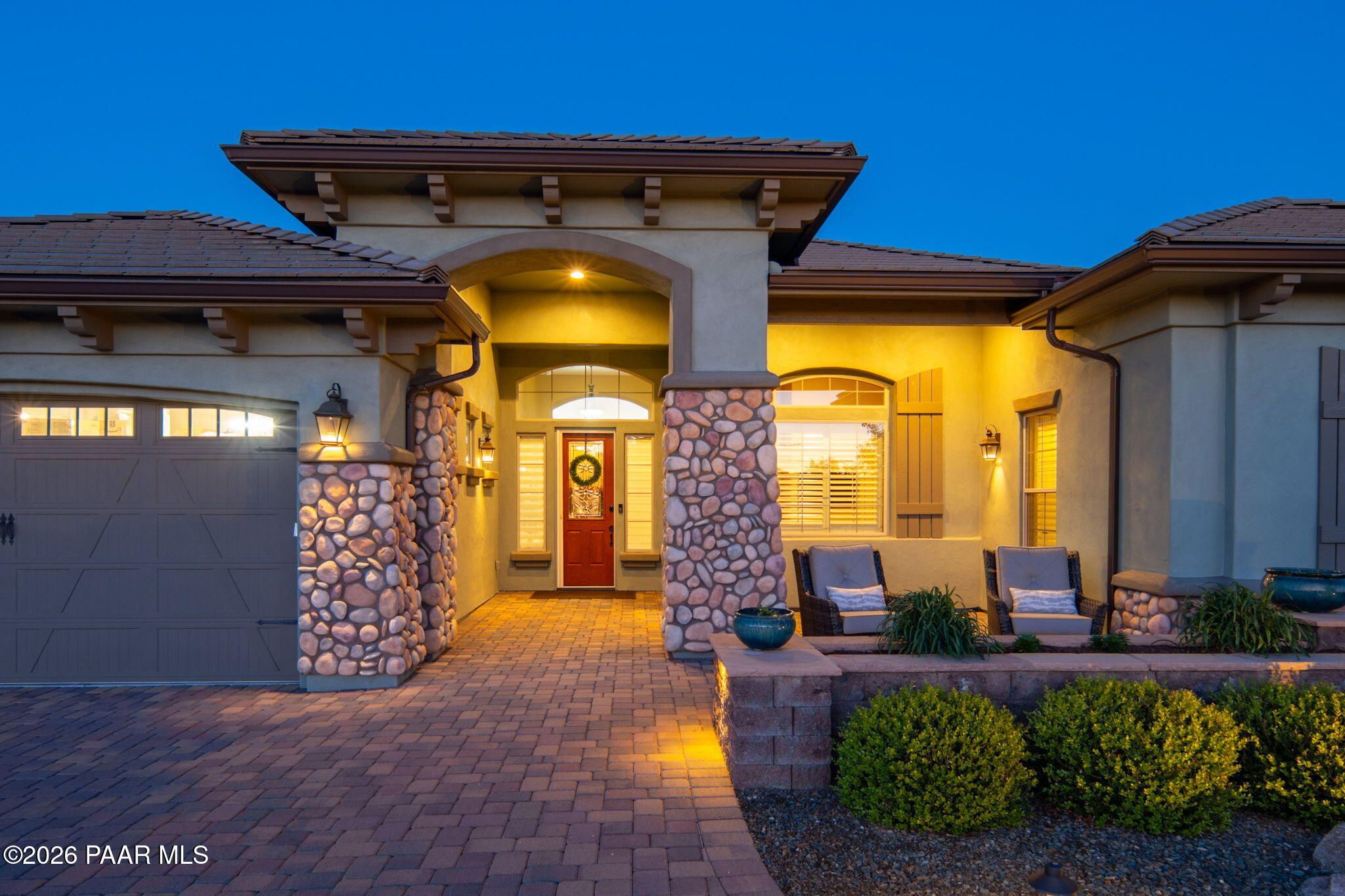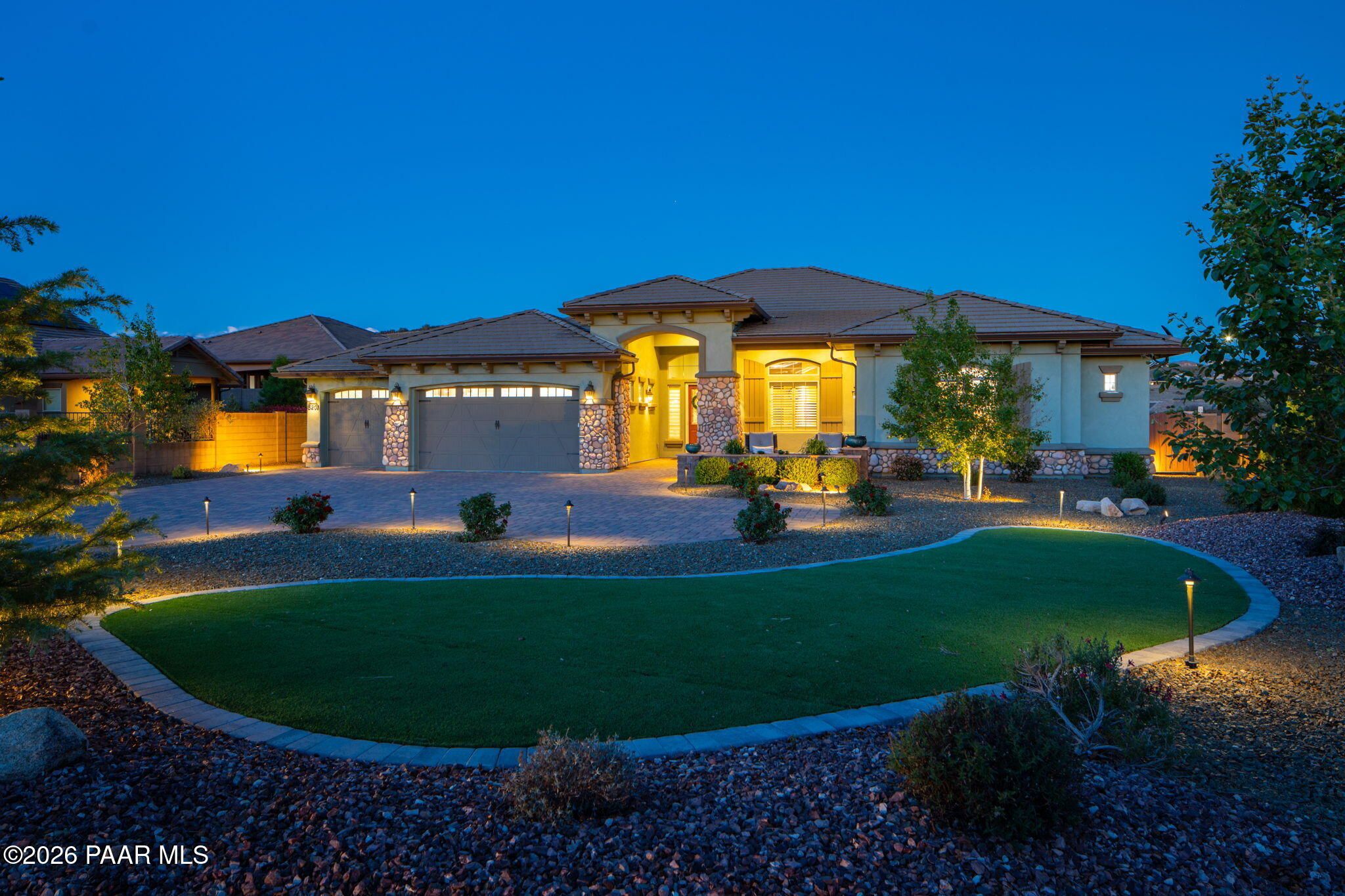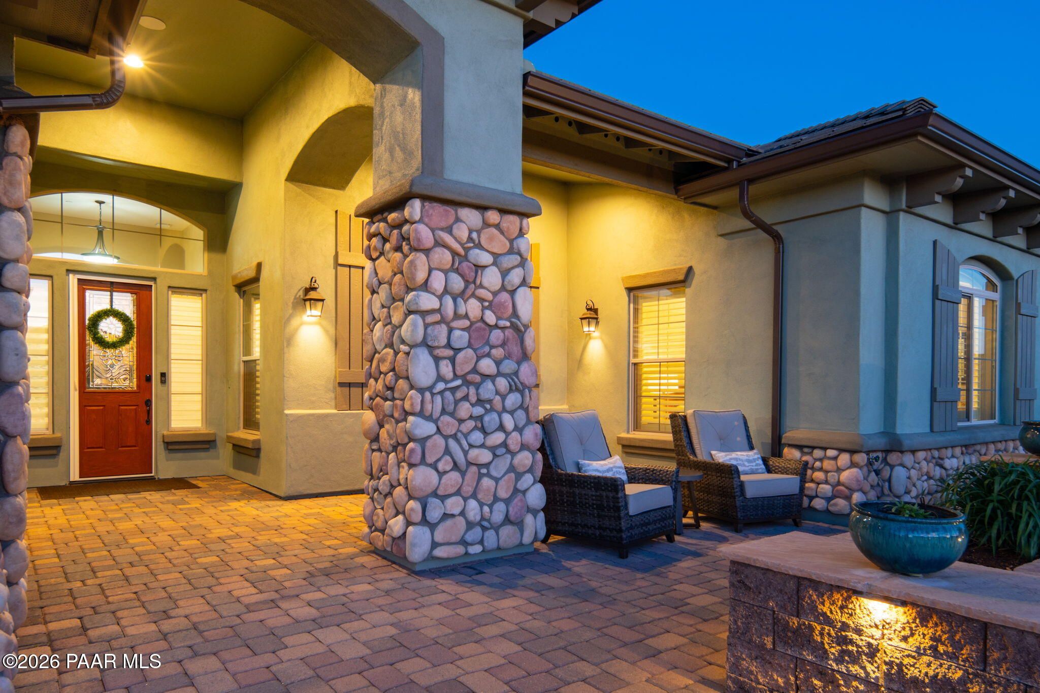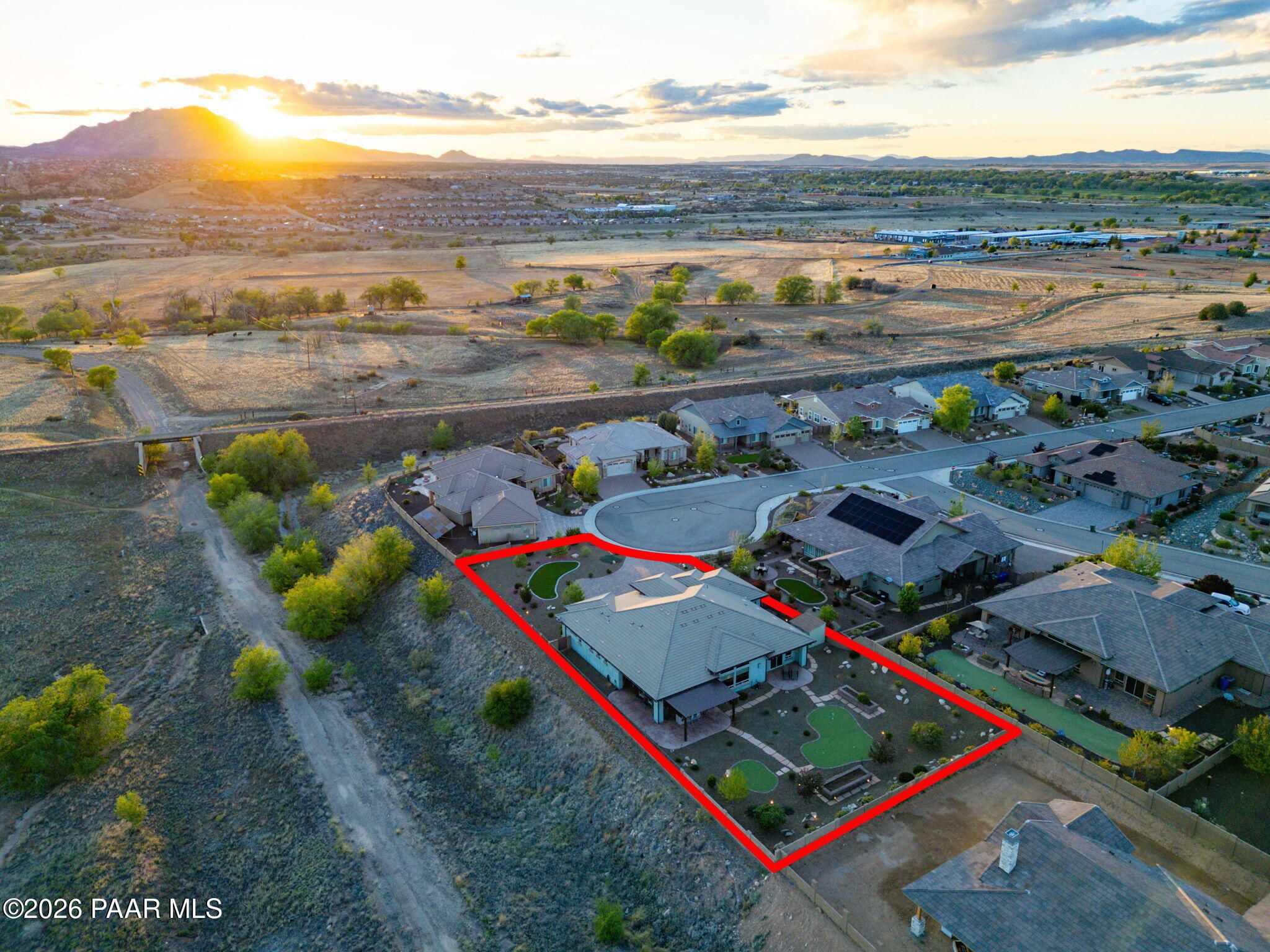 Refined single-level luxury living in the highly desirable Granite Dells Estates, set on a premium 0.49-acre cul-de-sac view lot with neighborhood access to the Peavine Recreation Trail. This highly upgraded Carrington semi-custom home offers 3,132 square feet of thoughtfully designed living space with 4 bedrooms, 3 bathrooms and an extended 3-car garage. A desirable split floor plan provides both privacy and functionality, while expansive hideaway sliding doors create seamless indoor-outdoor flow. Move-in ready with no construction delays or cost uncertainty, this residence is ideal for full-time living, a second home or a lock-and-leave lifestyle in the heart of Prescott. Outdoor living is elevated with approximately 360 square feet of covered patio space designed for year-round enjoyment. The backyard is an entertainer's dream, featuring a spacious outdoor kitchen prep island, large stainless steel natural gas grill, stamped concrete patio with a 14x20 wood-grain aluminum pergola, gas outdoor fireplace, retractable privacy sun screens and a private putting green. Professionally designed landscaping includes raised flower beds, low-voltage lighting, and a timed drip irrigation system, all enclosed by a privacy block wall.Inside, the gourmet kitchen is designed to impress with a professional-grade appliance suite including Wolf, Sub-Zero, and Cove, complemented by quartz countertops, a full backsplash and a large island with prep sink and bistro seating. Custom European Beechwood cabinetry with soft-close features, dual Blanco sinks, a walk-in pantry with motion lighting, and designer accents elevate both form and function. The adjacent formal dining room with built-in buffet and china cabinetry, along with a sunlit breakfast nook, offers versatile spaces for both casual and formal entertaining.The primary suite serves as a private retreat with a gas fireplace, spa-inspired bath featuring a walk-in shower with bench seating, in-wall heater, dual vanities and an oversized custom walk-in closet with built-ins. A private patio entrance enhances the suite's tranquil feel. An additional ensuite bedroom provides comfort for guests or multigenerational living, while another bedroom and a dedicated office or fourth bedroom includes custom built-ins and private patio access, offering flexibility for today's lifestyle. Extensive interior upgrades include wood-look ceramic tile flooring, pre-wired surround sound, raised counters, gas fireplaces, whole-house water softener, Hunter Douglas automated blinds with shutters, tinted upper windows and retractable patio screens. The extended 3-car garage is just as impressive, featuring epoxy flooring, built-in cabinetry, heavy-duty shelving and a remote drop-down storage lift all while easily accommodating a full-size pickup truck. Additional features include a tankless water heater with recirculation pump, whole-house sprinkler system and a 240V outlet for EV charging. Residents enjoy access to exceptional community amenities including a clubhouse, pool, spa, fitness center and pickleball courts set against the iconic Granite Dells backdrop. Conveniently located near shopping, dining, medical services and historic downtown Prescott, with easy highway access to Phoenix and Flagstaff. This home combines Carrington build quality, premium upgrades, exceptional outdoor living, views and a prime cul-de-sac location delivering the best of the Prescott lifestyle.