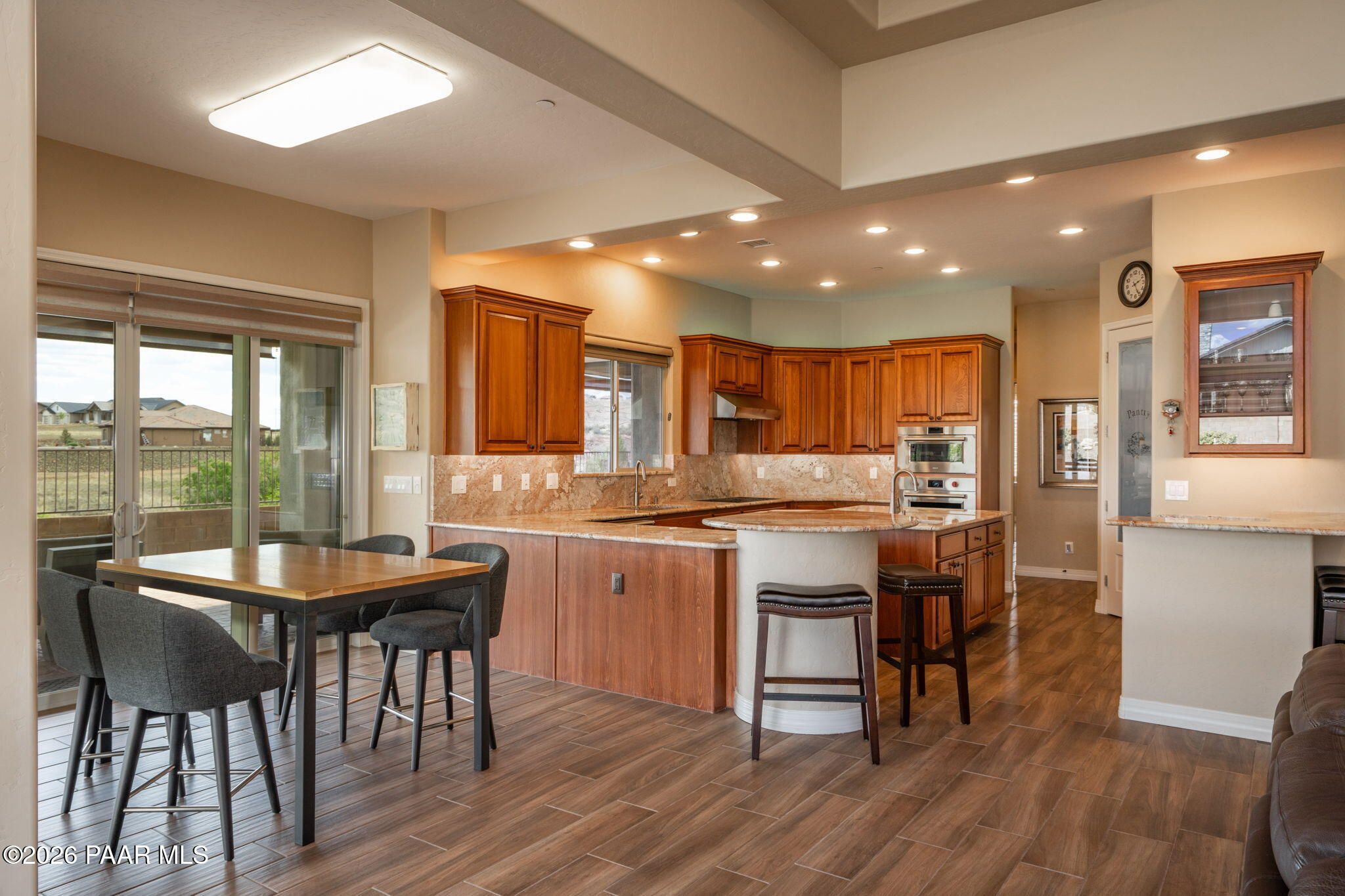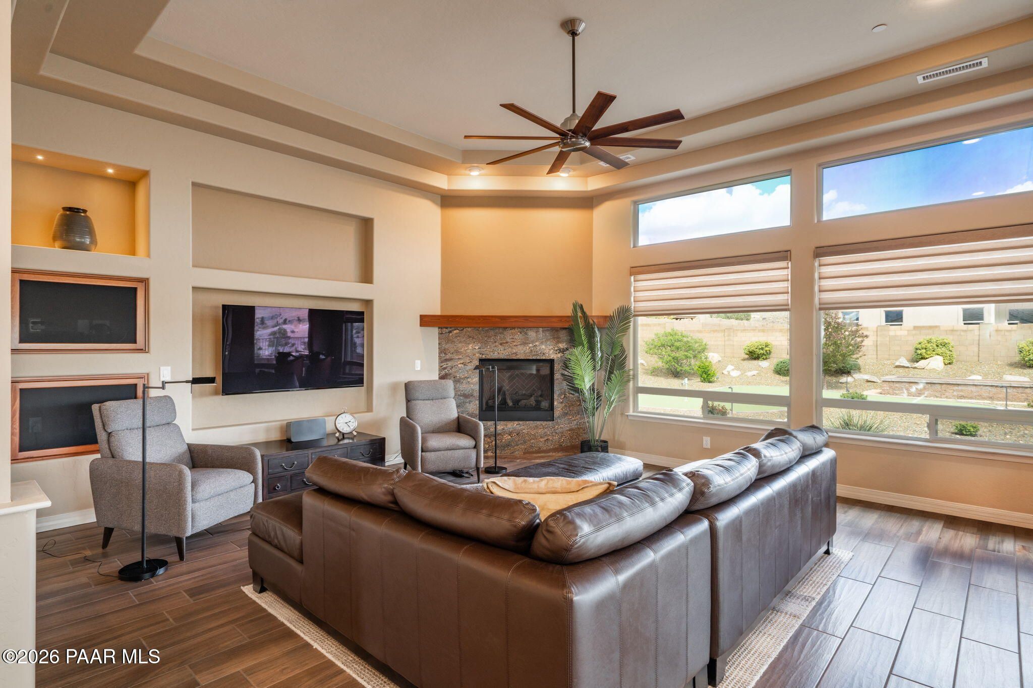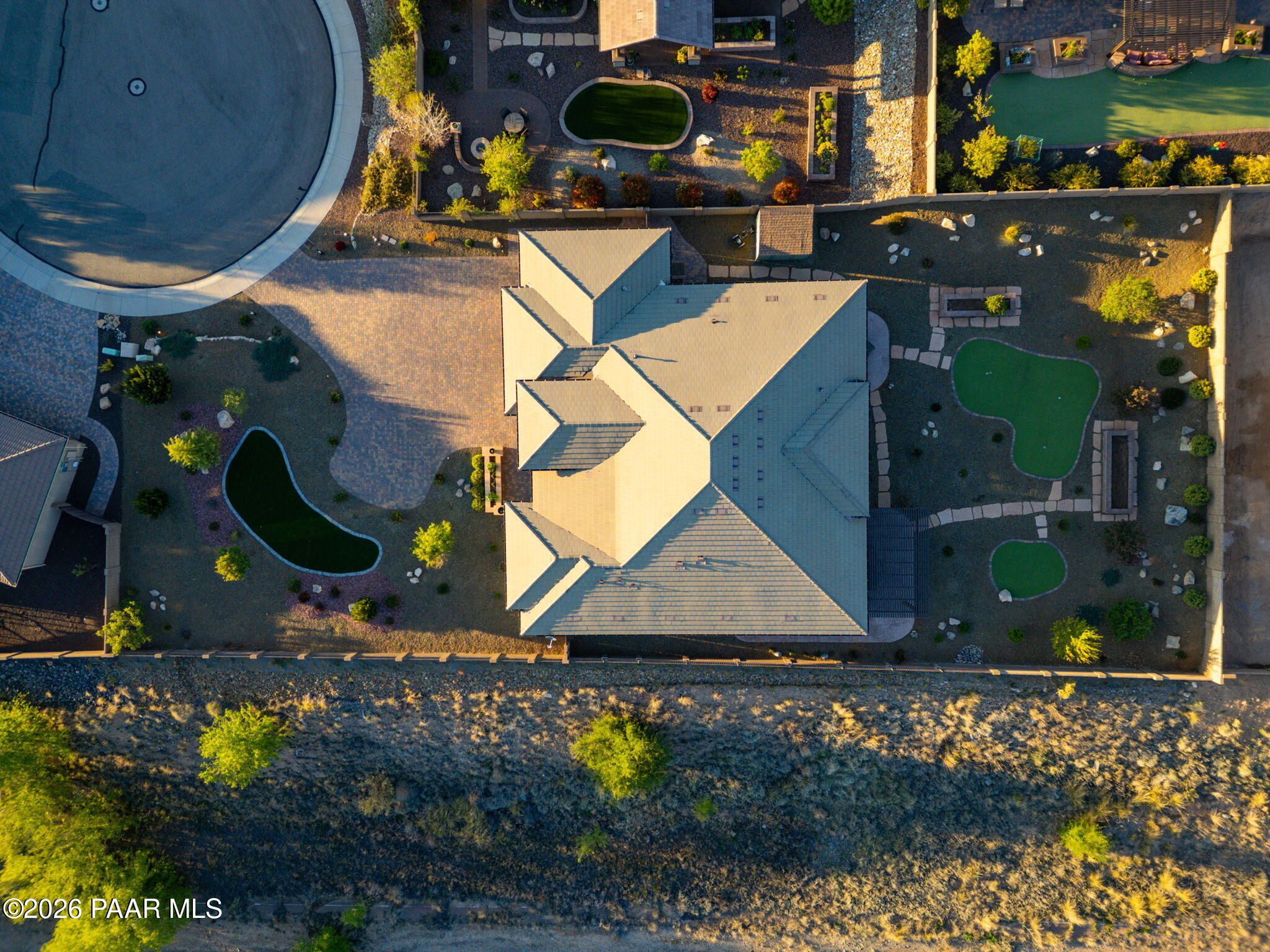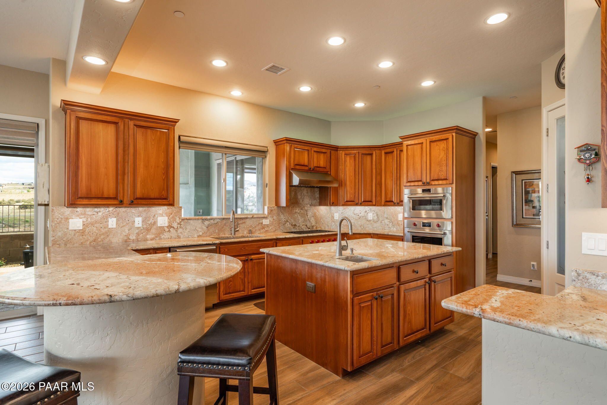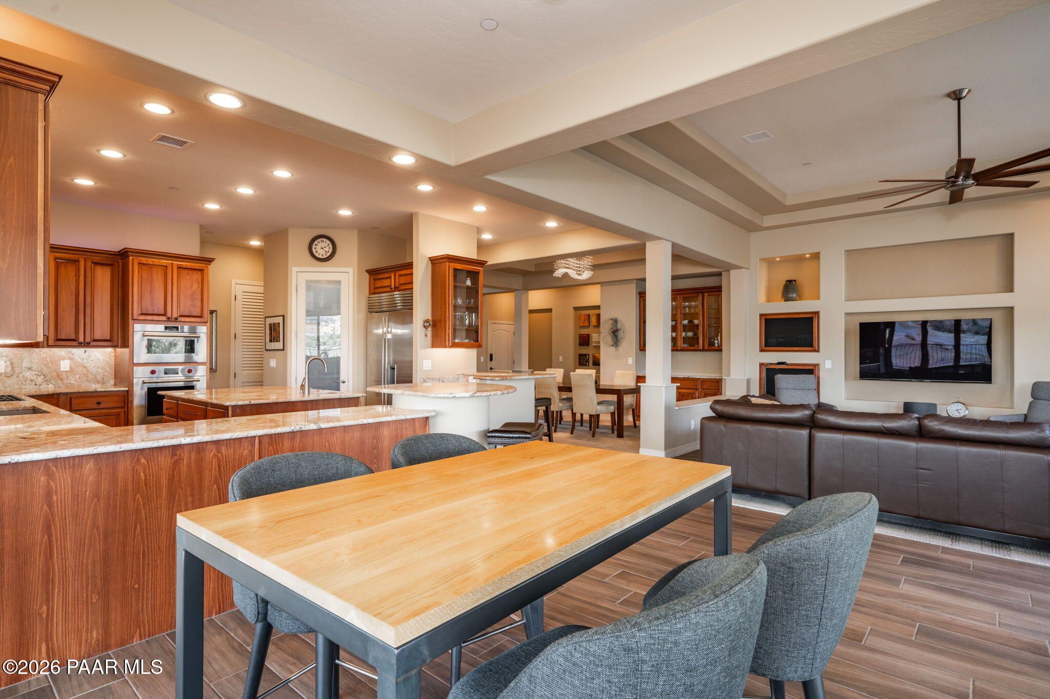 Refined single-level luxury living in the highly desirable Granite Dells Estates, set on a premium 0.49-acre cul-de-sac view lot with neighborhood access to the Peavine Recreation Trail. This highly upgraded Carrington semi-custom home offers 3,132 square feet of thoughtfully designed living space with 4 bedrooms, 3 bathrooms and an extended 3-car garage. A desirable split floor plan provides both privacy and functionality, while expansive hideaway sliding doors create seamless indoor-outdoor flow. Move-in ready with no construction delays or cost uncertainty, this residence is ideal for full-time living, a second home or a lock-and-leave lifestyle in the heart of Prescott. Outdoor living is elevated with approximately 360 square feet of covered patio space designed for year-round enjoyment. The backyard is an entertainer's dream, featuring a spacious outdoor kitchen prep island, large stainless steel natural gas grill, stamped concrete patio with a 14x20 wood-grain aluminum pergola, gas outdoor fireplace, retractable privacy sun screens and a private putting green. Professionally designed landscaping includes raised flower beds, low-voltage lighting, and a timed drip irrigation system, all enclosed by a privacy block wall.Inside, the gourmet kitchen is designed to impress with a professional-grade appliance suite including Wolf, Sub-Zero, and Cove, complemented by quartz countertops, a full backsplash and a large island with prep sink and bistro seating. Custom European Beechwood cabinetry with soft-close features, dual Blanco sinks, a walk-in pantry with motion lighting, and designer accents elevate both form and function. The adjacent formal dining room with built-in buffet and china cabinetry, along with a sunlit breakfast nook, offers versatile spaces for both casual and formal entertaining.The primary suite serves as a private retreat with a gas fireplace, spa-inspired bath featuring a walk-in shower with bench seating, in-wall heater, dual vanities and an oversized custom walk-in closet with built-ins. A private patio entrance enhances the suite's tranquil feel. An additional ensuite bedroom provides comfort for guests or multigenerational living, while another bedroom and a dedicated office or fourth bedroom includes custom built-ins and private patio access, offering flexibility for today's lifestyle. Extensive interior upgrades include wood-look ceramic tile flooring, pre-wired surround sound, raised counters, gas fireplaces, whole-house water softener, Hunter Douglas automated blinds with shutters, tinted upper windows and retractable patio screens. The extended 3-car garage is just as impressive, featuring epoxy flooring, built-in cabinetry, heavy-duty shelving and a remote drop-down storage lift all while easily accommodating a full-size pickup truck. Additional features include a tankless water heater with recirculation pump, whole-house sprinkler system and a 240V outlet for EV charging. Residents enjoy access to exceptional community amenities including a clubhouse, pool, spa, fitness center and pickleball courts set against the iconic Granite Dells backdrop. Conveniently located near shopping, dining, medical services and historic downtown Prescott, with easy highway access to Phoenix and Flagstaff. This home combines Carrington build quality, premium upgrades, exceptional outdoor living, views and a prime cul-de-sac location delivering the best of the Prescott lifestyle.