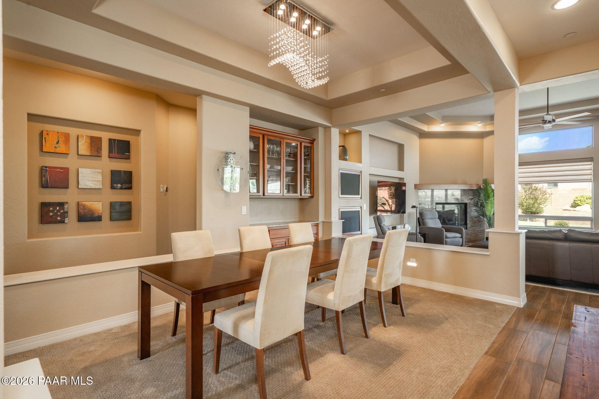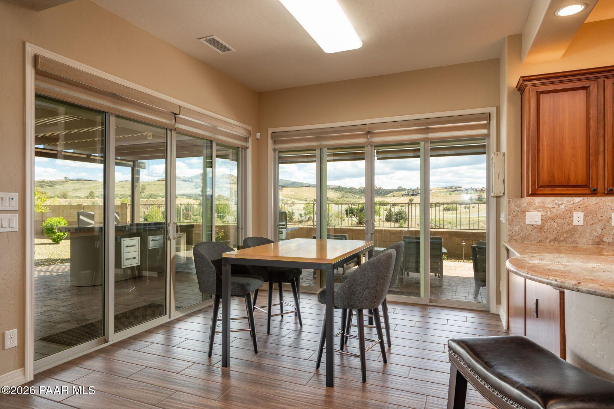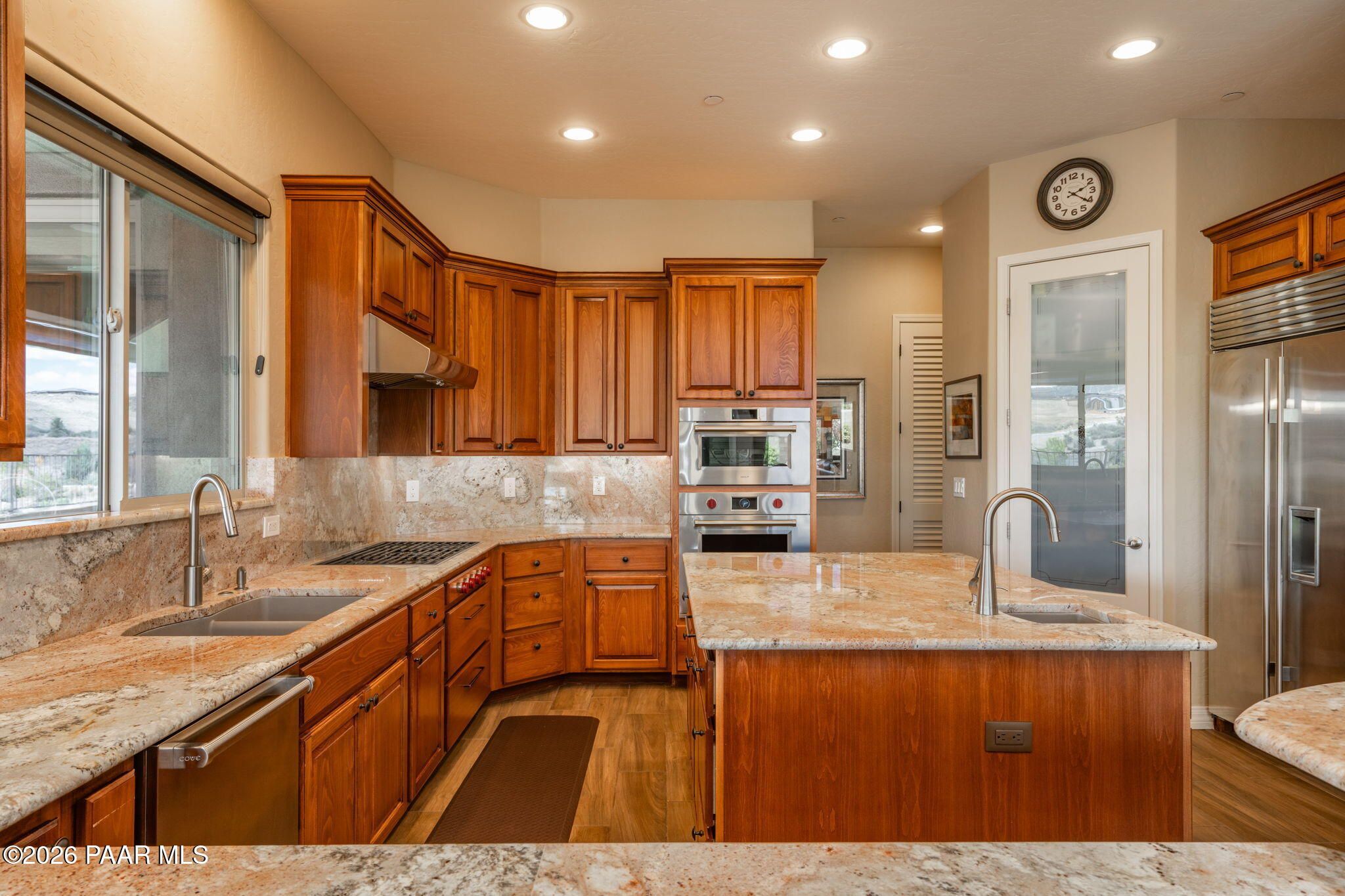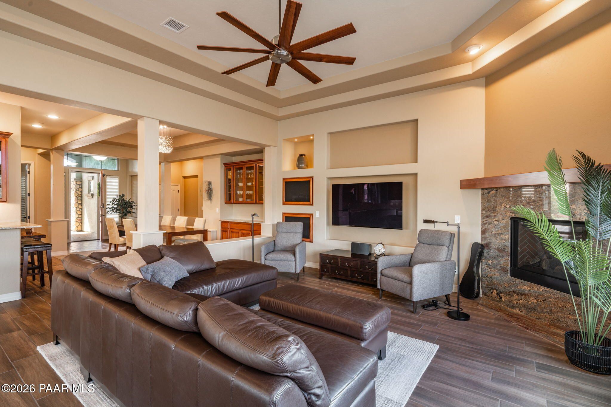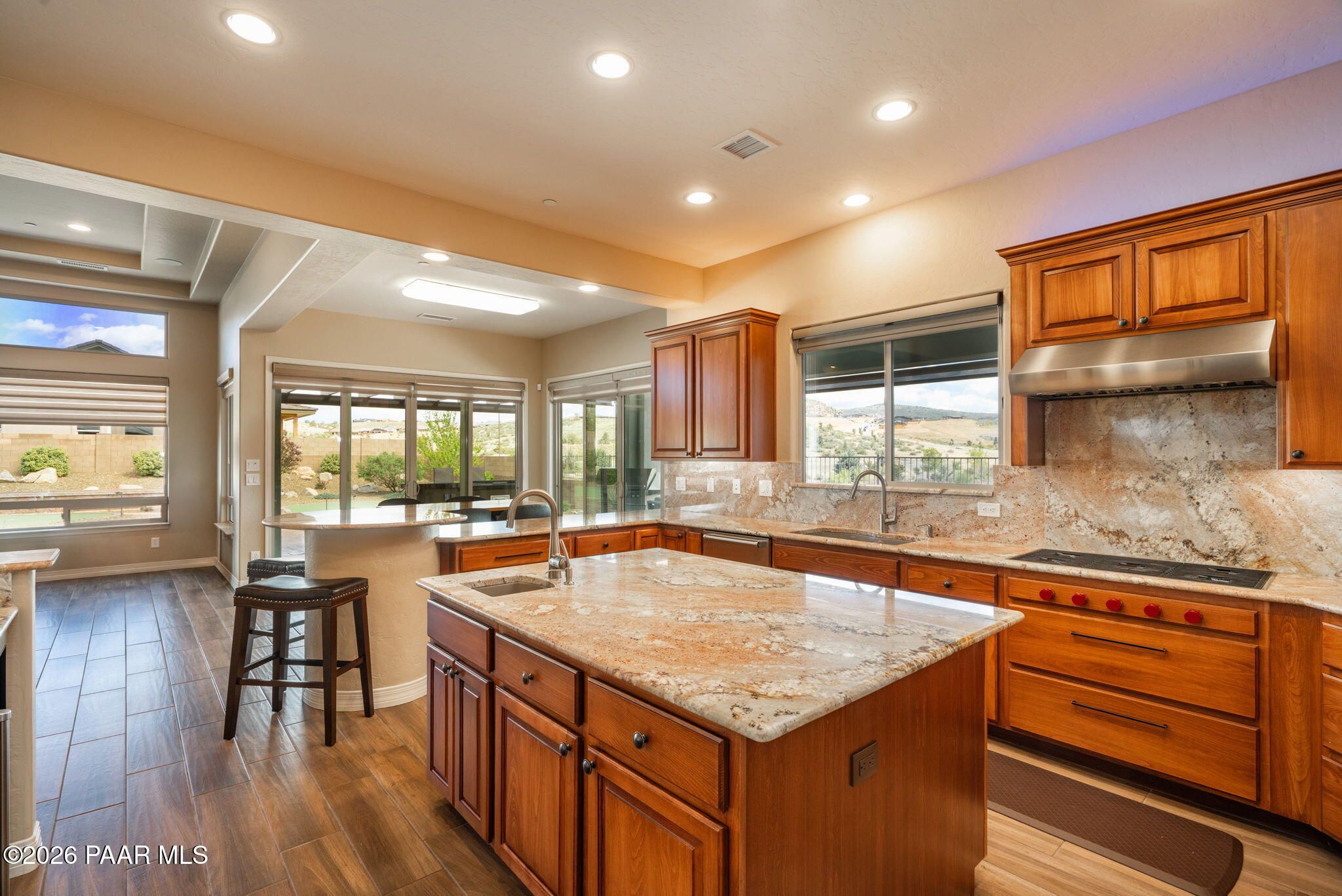 Refined single-level luxury living in the highly desirable Granite Dells Estates, set on a premium 0.49-acre cul-de-sac view lot with neighborhood access to the Peavine Recreation Trail. This highly upgraded Carrington semi-custom home offers 3,132 square feet of thoughtfully designed living space with 4 bedrooms, 3 bathrooms and an extended 3-car garage. A desirable split floor plan provides both privacy and functionality, while expansive hideaway sliding doors create seamless indoor-outdoor flow. Move-in ready with no construction delays or cost uncertainty, this residence is ideal for full-time living, a second home or a lock-and-leave lifestyle in the heart of Prescott. Outdoor living is elevated with approximately 360 square feet of covered patio space designed for year-round enjoyment. The backyard is an entertainer's dream, featuring a spacious outdoor kitchen prep island, large stainless steel natural gas grill, stamped concrete patio with a 14x20 wood-grain aluminum pergola, gas outdoor fireplace, retractable privacy sun screens and a private putting green. Professionally designed landscaping includes raised flower beds, low-voltage lighting, and a timed drip irrigation system, all enclosed by a privacy block wall.Inside, the gourmet kitchen is designed to impress with a professional-grade appliance suite including Wolf, Sub-Zero, and Cove, complemented by quartz countertops, a full backsplash and a large island with prep sink and bistro seating. Custom European Beechwood cabinetry with soft-close features, dual Blanco sinks, a walk-in pantry with motion lighting, and designer accents elevate both form and function. The adjacent formal dining room with built-in buffet and china cabinetry, along with a sunlit breakfast nook, offers versatile spaces for both casual and formal entertaining.The primary suite serves as a private retreat with a gas fireplace, spa-inspired bath featuring a walk-in shower with bench seating, in-wall heater, dual vanities and an oversized custom walk-in closet with built-ins. A private patio entrance enhances the suite's tranquil feel. An additional ensuite bedroom provides comfort for guests or multigenerational living, while another bedroom and a dedicated office or fourth bedroom includes custom built-ins and private patio access, offering flexibility for today's lifestyle. Extensive interior upgrades include wood-look ceramic tile flooring, pre-wired surround sound, raised counters, gas fireplaces, whole-house water softener, Hunter Douglas automated blinds with shutters, tinted upper windows and retractable patio screens. The extended 3-car garage is just as impressive, featuring epoxy flooring, built-in cabinetry, heavy-duty shelving and a remote drop-down storage lift all while easily accommodating a full-size pickup truck. Additional features include a tankless water heater with recirculation pump, whole-house sprinkler system and a 240V outlet for EV charging. Residents enjoy access to exceptional community amenities including a clubhouse, pool, spa, fitness center and pickleball courts set against the iconic Granite Dells backdrop. Conveniently located near shopping, dining, medical services and historic downtown Prescott, with easy highway access to Phoenix and Flagstaff. This home combines Carrington build quality, premium upgrades, exceptional outdoor living, views and a prime cul-de-sac location delivering the best of the Prescott lifestyle.