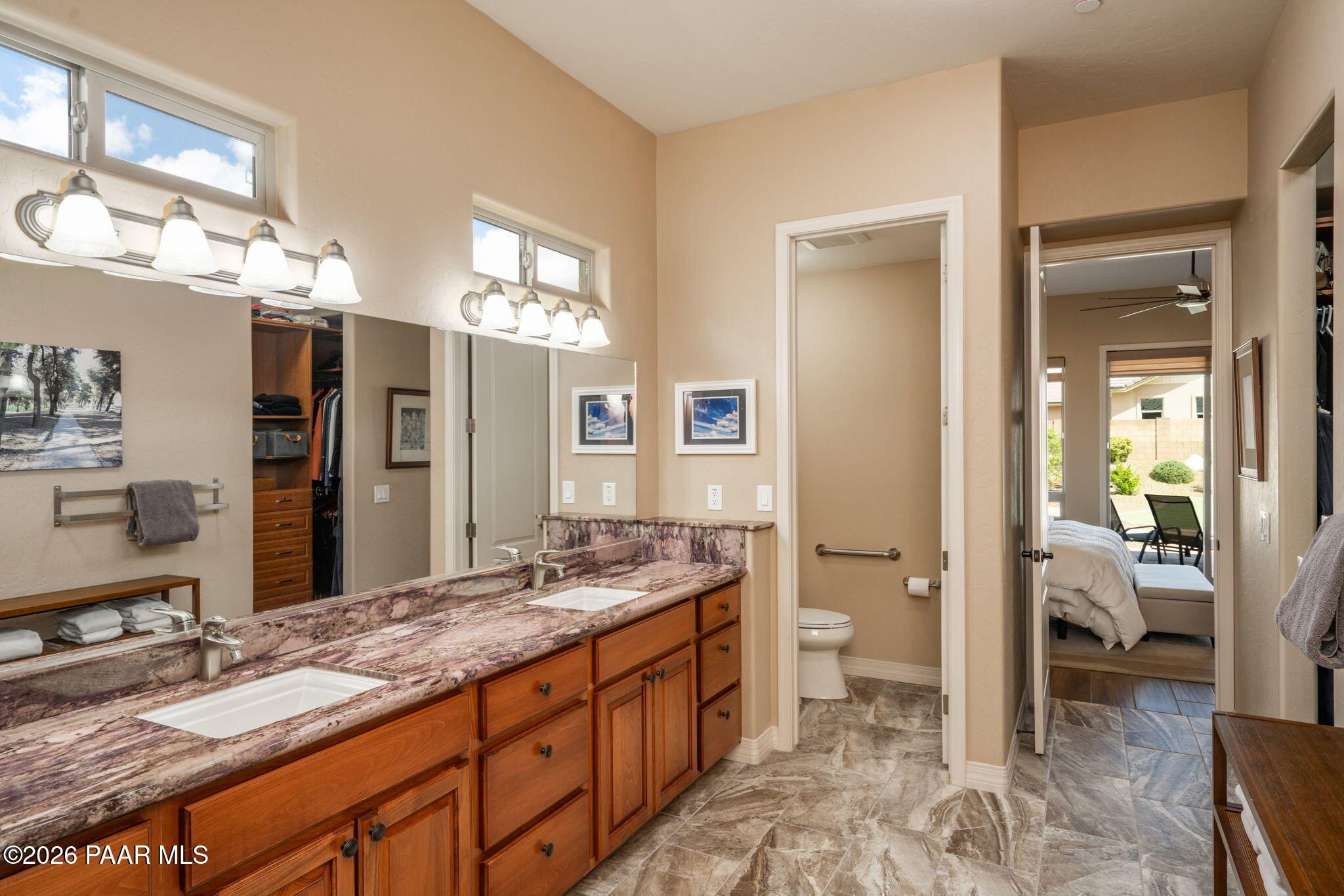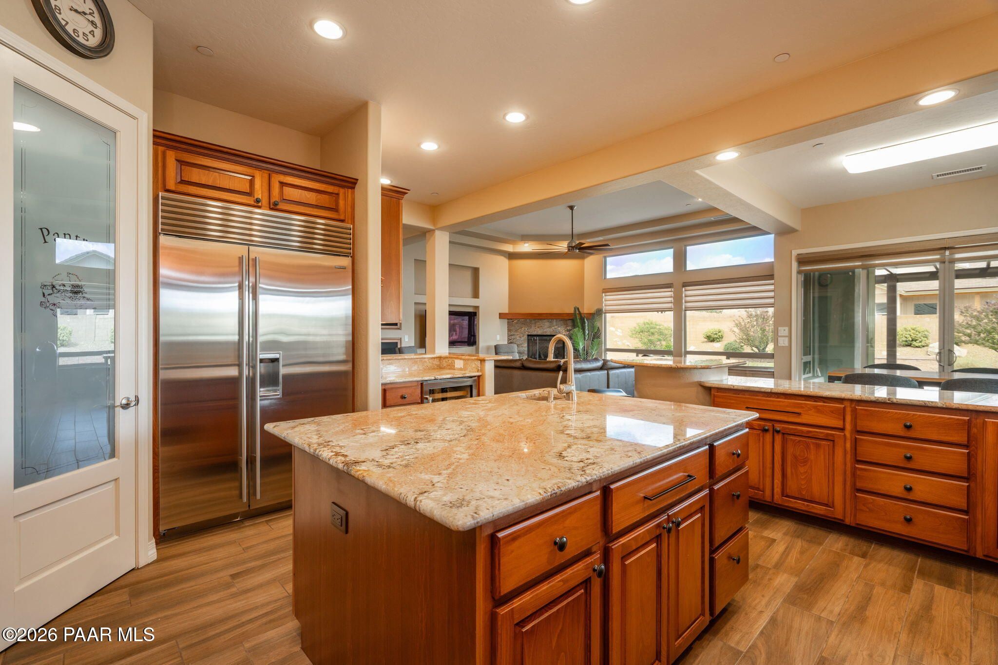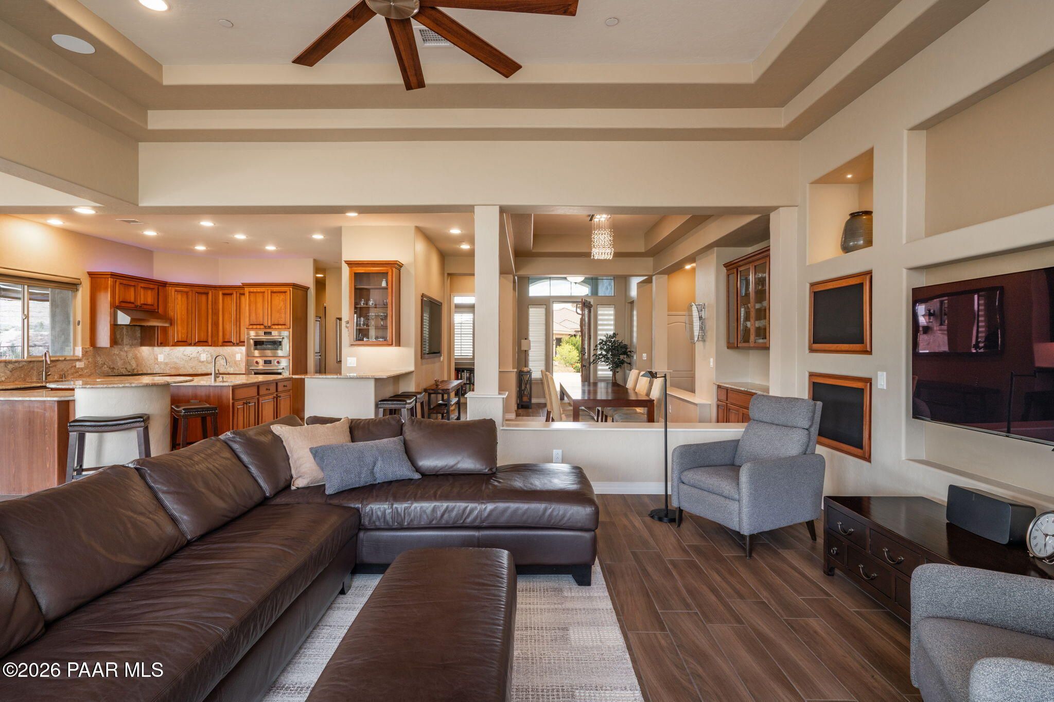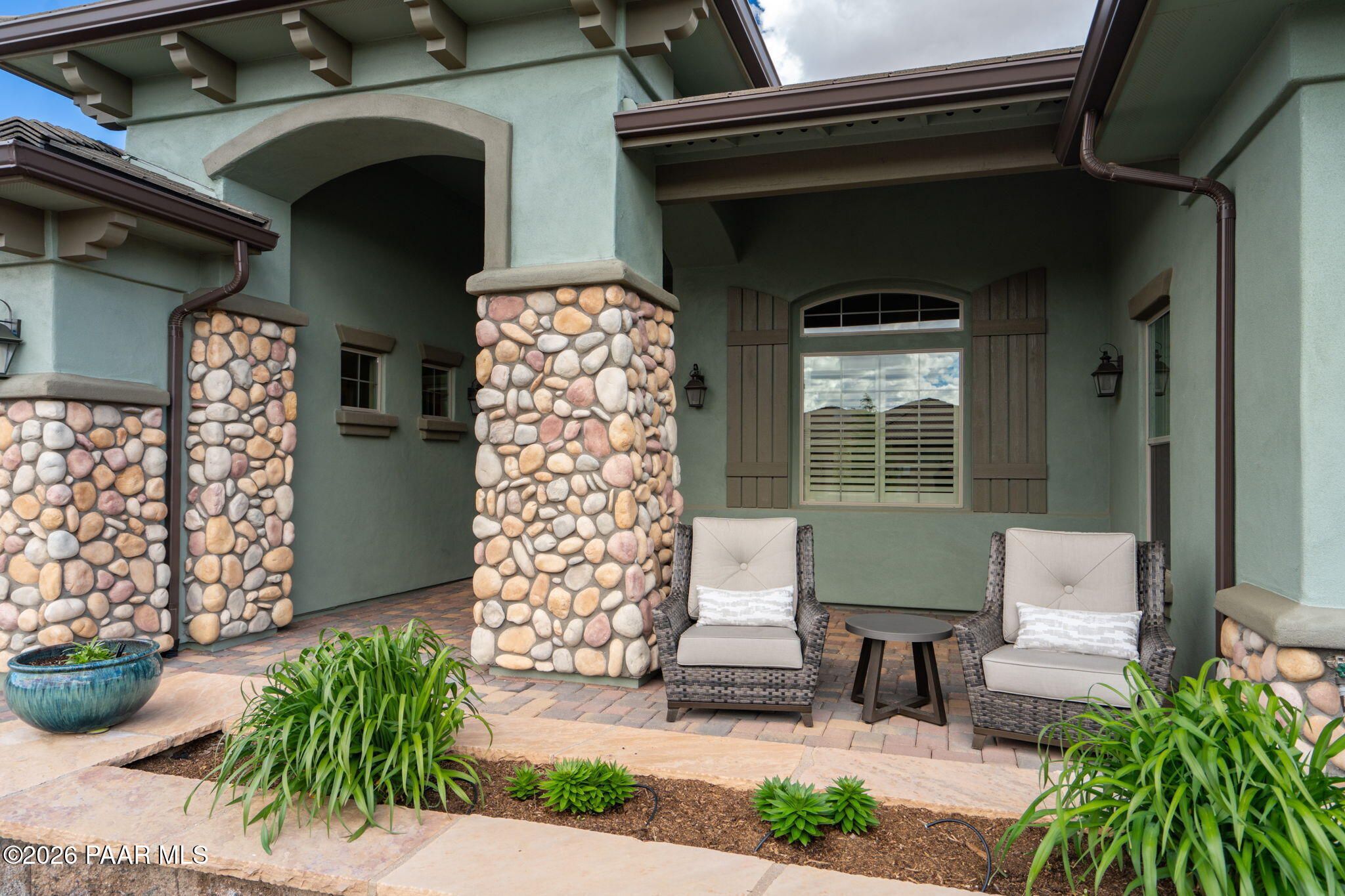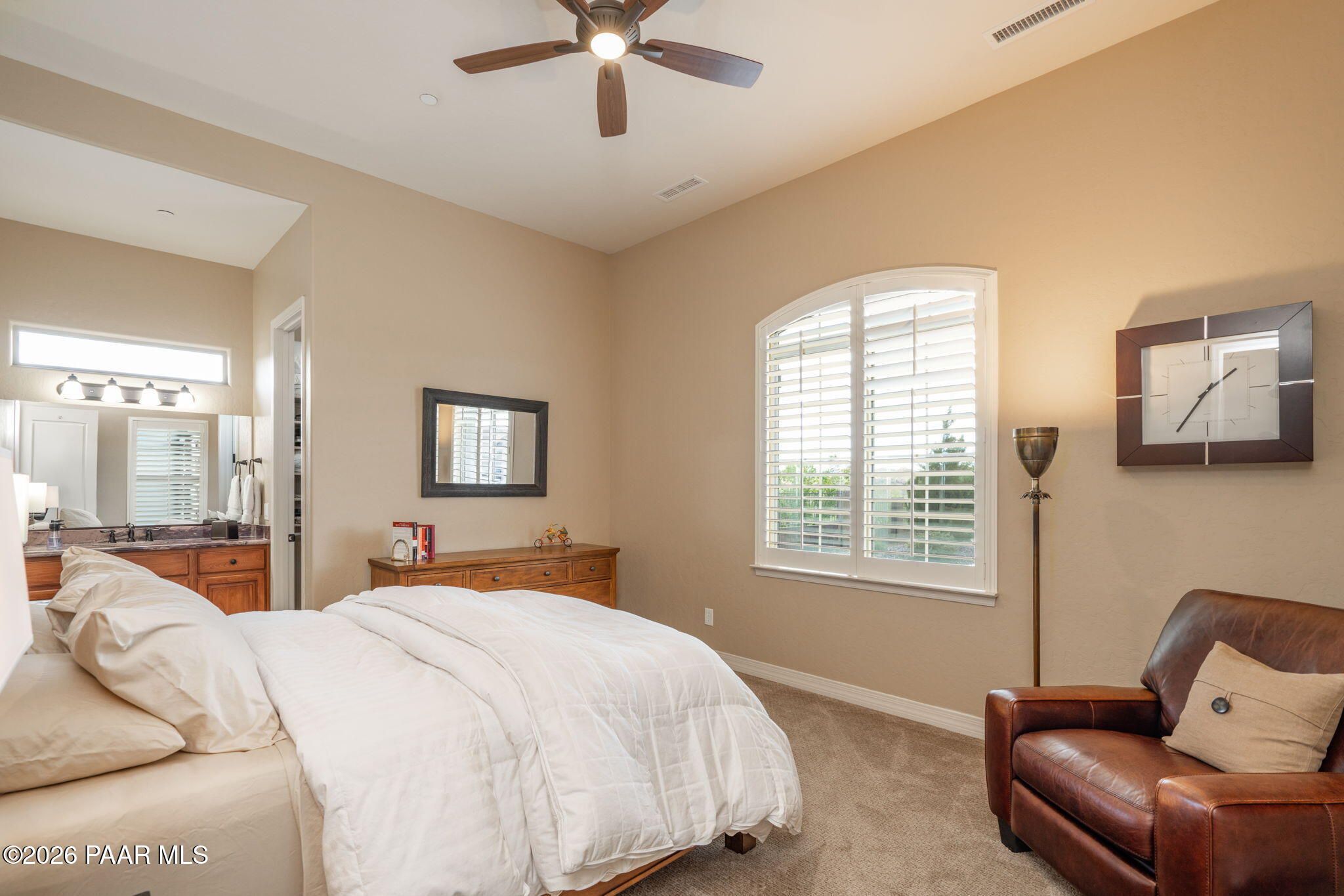 Refined single-level luxury living in the highly desirable Granite Dells Estates, set on a premium 0.49-acre cul-de-sac view lot with neighborhood access to the Peavine Recreation Trail. This highly upgraded Carrington semi-custom home offers 3,132 square feet of thoughtfully designed living space with 4 bedrooms, 3 bathrooms and an extended 3-car garage. A desirable split floor plan provides both privacy and functionality, while expansive hideaway sliding doors create seamless indoor-outdoor flow. Move-in ready with no construction delays or cost uncertainty, this residence is ideal for full-time living, a second home or a lock-and-leave lifestyle in the heart of Prescott. Outdoor living is elevated with approximately 360 square feet of covered patio space designed for year-round enjoyment. The backyard is an entertainer's dream, featuring a spacious outdoor kitchen prep island, large stainless steel natural gas grill, stamped concrete patio with a 14x20 wood-grain aluminum pergola, gas outdoor fireplace, retractable privacy sun screens and a private putting green. Professionally designed landscaping includes raised flower beds, low-voltage lighting, and a timed drip irrigation system, all enclosed by a privacy block wall.Inside, the gourmet kitchen is designed to impress with a professional-grade appliance suite including Wolf, Sub-Zero, and Cove, complemented by quartz countertops, a full backsplash and a large island with prep sink and bistro seating. Custom European Beechwood cabinetry with soft-close features, dual Blanco sinks, a walk-in pantry with motion lighting, and designer accents elevate both form and function. The adjacent formal dining room with built-in buffet and china cabinetry, along with a sunlit breakfast nook, offers versatile spaces for both casual and formal entertaining.The primary suite serves as a private retreat with a gas fireplace, spa-inspired bath featuring a walk-in shower with bench seating, in-wall heater, dual vanities and an oversized custom walk-in closet with built-ins. A private patio entrance enhances the suite's tranquil feel. An additional ensuite bedroom provides comfort for guests or multigenerational living, while another bedroom and a dedicated office or fourth bedroom includes custom built-ins and private patio access, offering flexibility for today's lifestyle. Extensive interior upgrades include wood-look ceramic tile flooring, pre-wired surround sound, raised counters, gas fireplaces, whole-house water softener, Hunter Douglas automated blinds with shutters, tinted upper windows and retractable patio screens. The extended 3-car garage is just as impressive, featuring epoxy flooring, built-in cabinetry, heavy-duty shelving and a remote drop-down storage lift all while easily accommodating a full-size pickup truck. Additional features include a tankless water heater with recirculation pump, whole-house sprinkler system and a 240V outlet for EV charging. Residents enjoy access to exceptional community amenities including a clubhouse, pool, spa, fitness center and pickleball courts set against the iconic Granite Dells backdrop. Conveniently located near shopping, dining, medical services and historic downtown Prescott, with easy highway access to Phoenix and Flagstaff. This home combines Carrington build quality, premium upgrades, exceptional outdoor living, views and a prime cul-de-sac location delivering the best of the Prescott lifestyle.