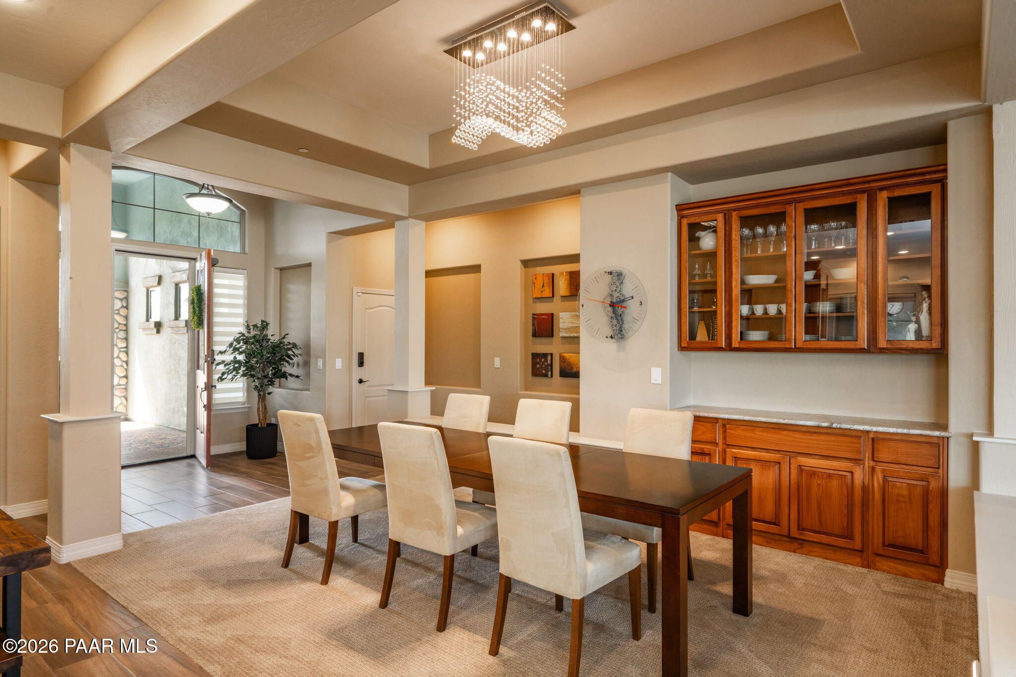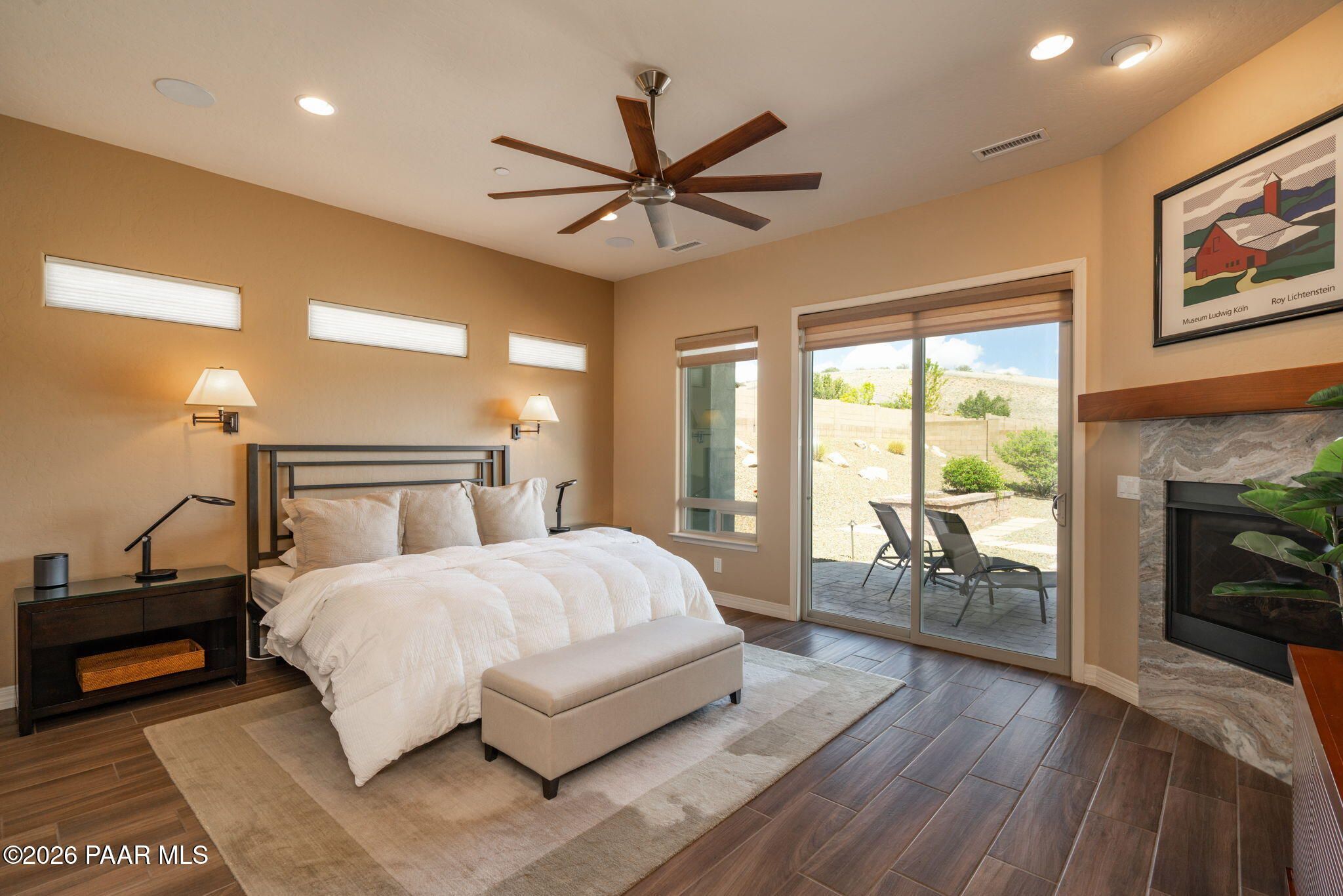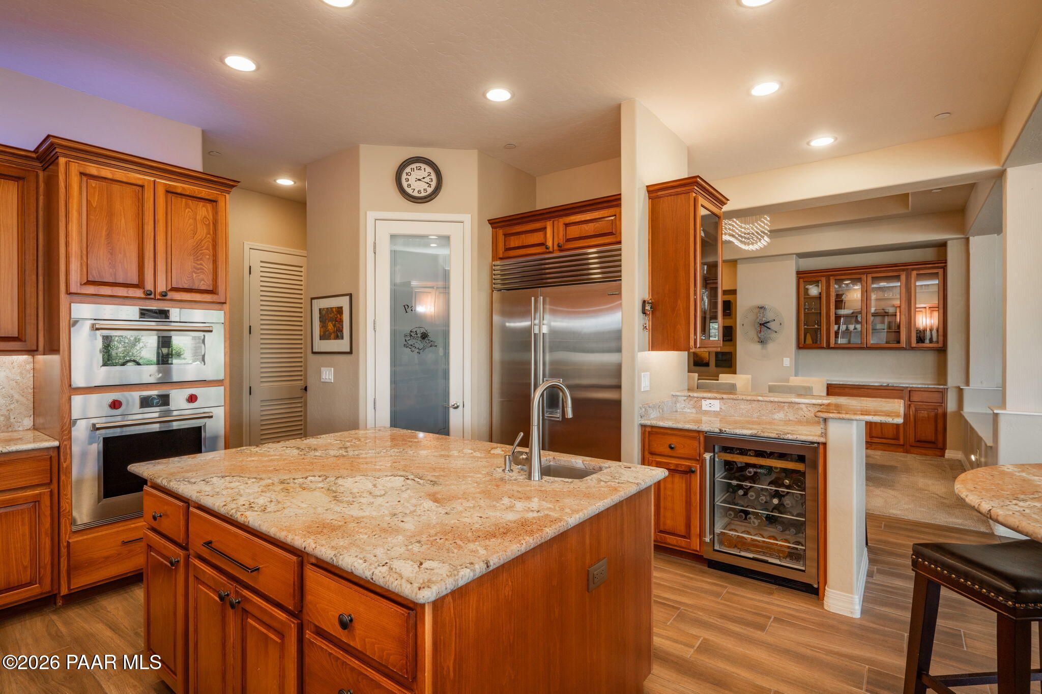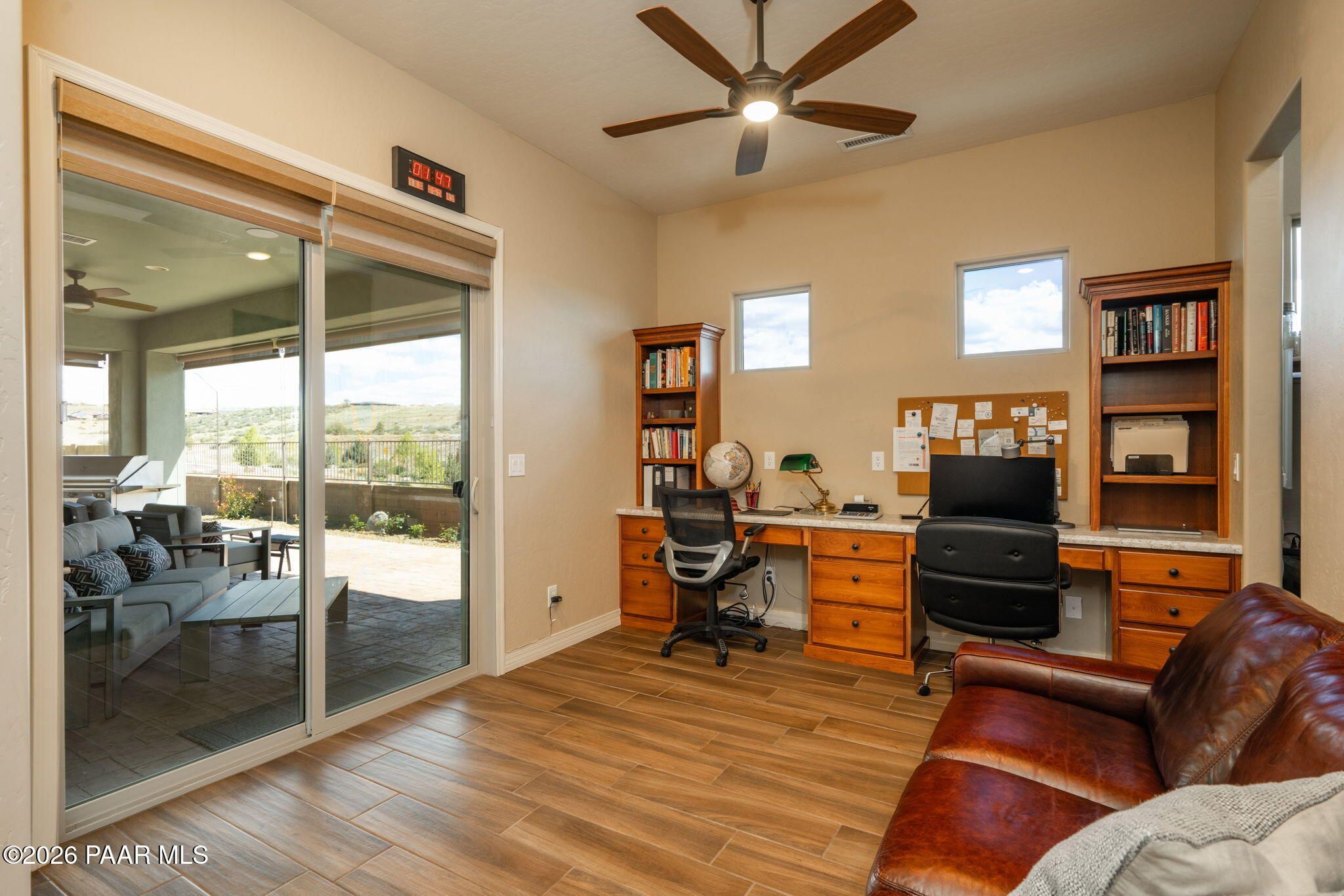 Refined single-level luxury living in the highly desirable Granite Dells Estates, set on a premium 0.49-acre cul-de-sac view lot with neighborhood access to the Peavine Recreation Trail. This highly upgraded Carrington semi-custom home offers 3,132 square feet of thoughtfully designed living space with 4 bedrooms, 3 bathrooms and an extended 3-car garage. A desirable split floor plan provides both privacy and functionality, while expansive hideaway sliding doors create seamless indoor-outdoor flow. Move-in ready with no construction delays or cost uncertainty, this residence is ideal for full-time living, a second home or a lock-and-leave lifestyle in the heart of Prescott. Outdoor living is elevated with approximately 360 square feet of covered patio space designed for year-round enjoyment. The backyard is an entertainer's dream, featuring a spacious outdoor kitchen prep island, large stainless steel natural gas grill, stamped concrete patio with a 14x20 wood-grain aluminum pergola, gas outdoor fireplace, retractable privacy sun screens and a private putting green. Professionally designed landscaping includes raised flower beds, low-voltage lighting, and a timed drip irrigation system, all enclosed by a privacy block wall.Inside, the gourmet kitchen is designed to impress with a professional-grade appliance suite including Wolf, Sub-Zero, and Cove, complemented by quartz countertops, a full backsplash and a large island with prep sink and bistro seating. Custom European Beechwood cabinetry with soft-close features, dual Blanco sinks, a walk-in pantry with motion lighting, and designer accents elevate both form and function. The adjacent formal dining room with built-in buffet and china cabinetry, along with a sunlit breakfast nook, offers versatile spaces for both casual and formal entertaining.The primary suite serves as a private retreat with a gas fireplace, spa-inspired bath featuring a walk-in shower with bench seating, in-wall heater, dual vanities and an oversized custom walk-in closet with built-ins. A private patio entrance enhances the suite's tranquil feel. An additional ensuite bedroom provides comfort for guests or multigenerational living, while another bedroom and a dedicated office or fourth bedroom includes custom built-ins and private patio access, offering flexibility for today's lifestyle. Extensive interior upgrades include wood-look ceramic tile flooring, pre-wired surround sound, raised counters, gas fireplaces, whole-house water softener, Hunter Douglas automated blinds with shutters, tinted upper windows and retractable patio screens. The extended 3-car garage is just as impressive, featuring epoxy flooring, built-in cabinetry, heavy-duty shelving and a remote drop-down storage lift all while easily accommodating a full-size pickup truck. Additional features include a tankless water heater with recirculation pump, whole-house sprinkler system and a 240V outlet for EV charging. Residents enjoy access to exceptional community amenities including a clubhouse, pool, spa, fitness center and pickleball courts set against the iconic Granite Dells backdrop. Conveniently located near shopping, dining, medical services and historic downtown Prescott, with easy highway access to Phoenix and Flagstaff. This home combines Carrington build quality, premium upgrades, exceptional outdoor living, views and a prime cul-de-sac location delivering the best of the Prescott lifestyle.