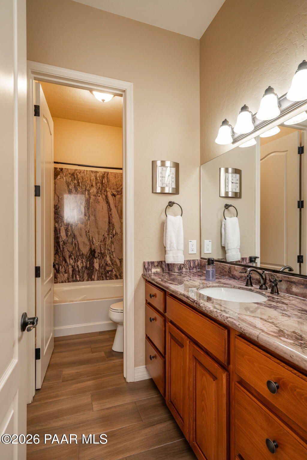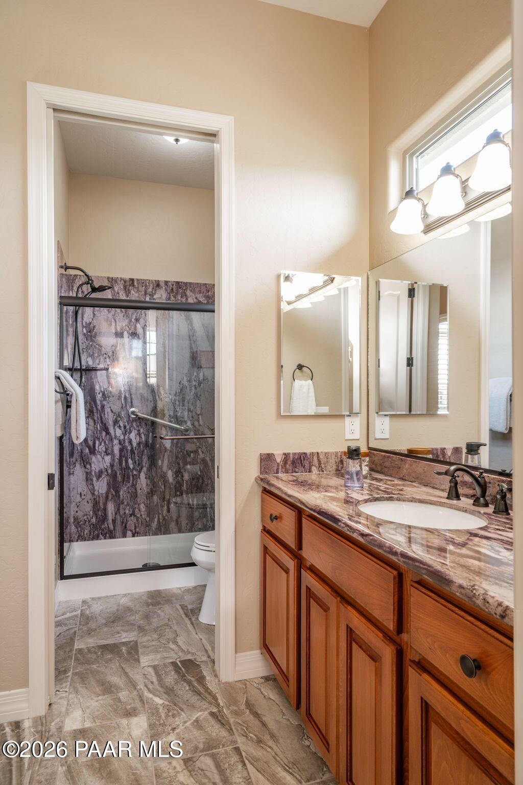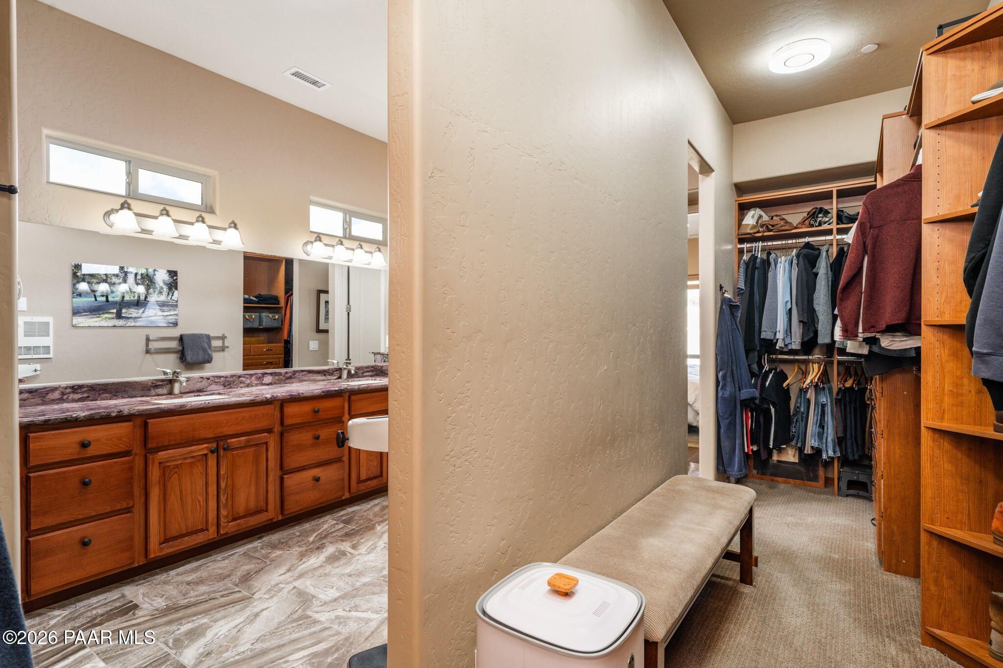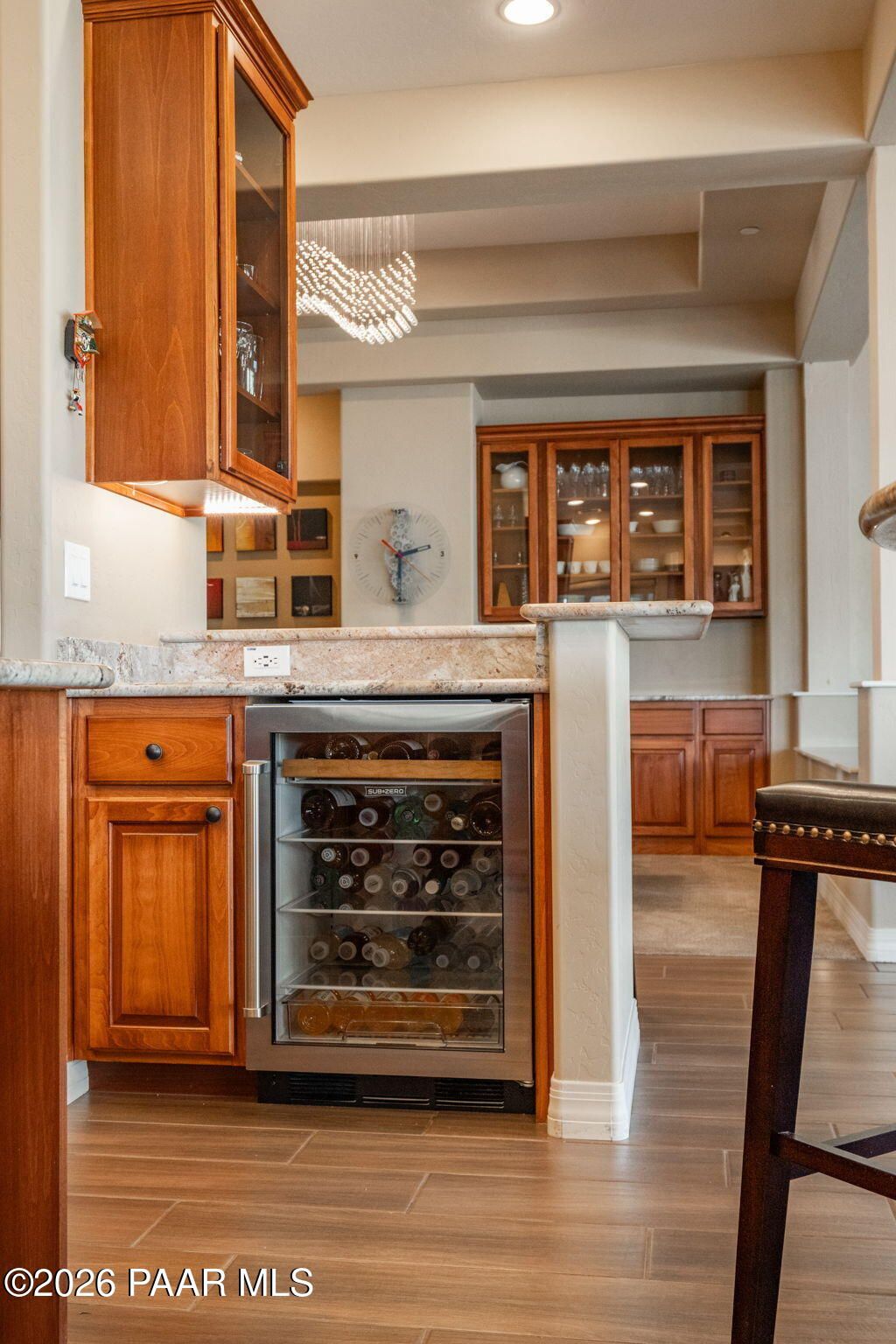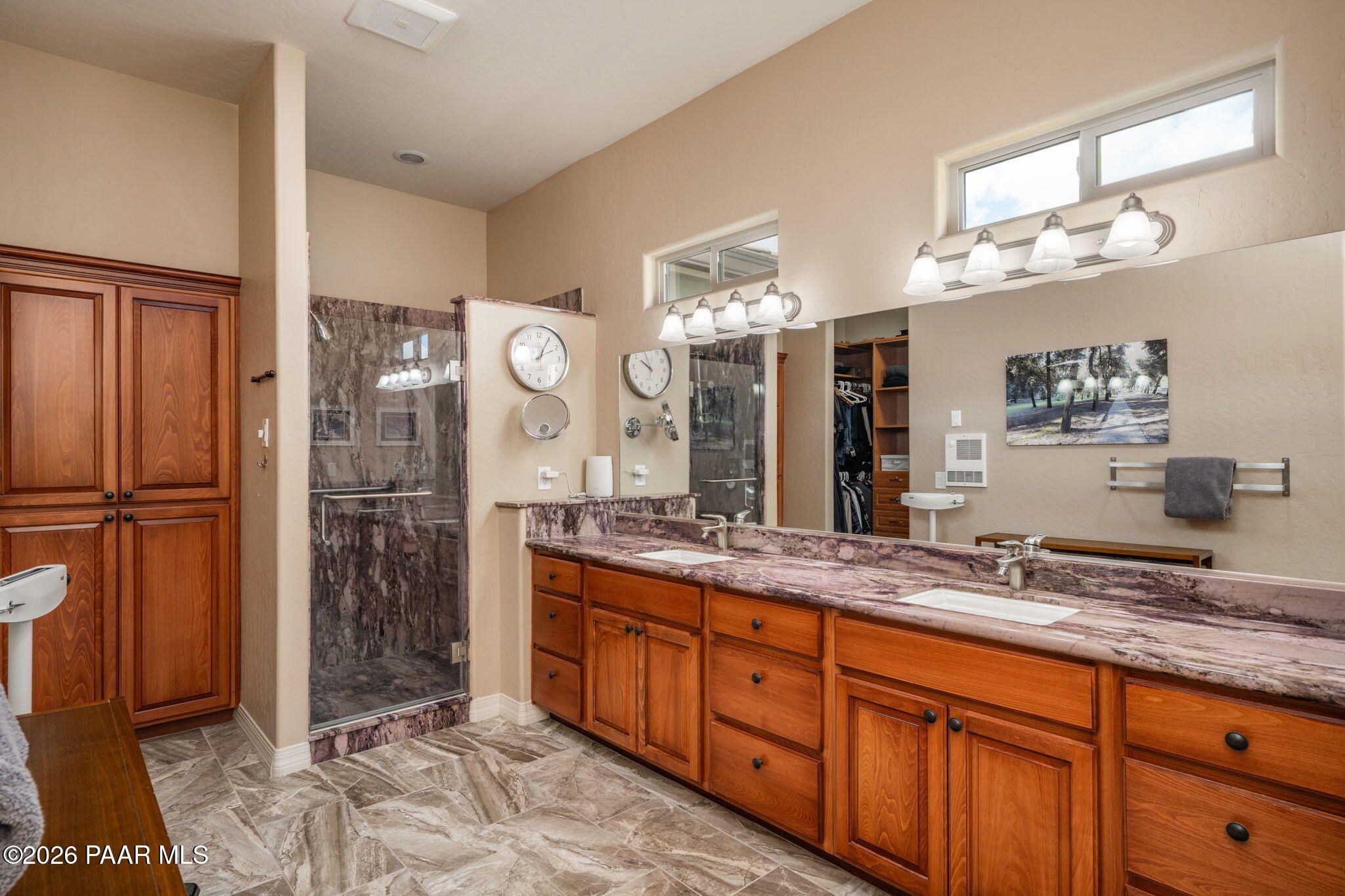 Refined single-level luxury living in the highly desirable Granite Dells Estates, set on a premium 0.49-acre cul-de-sac view lot with neighborhood access to the Peavine Recreation Trail. This highly upgraded Carrington semi-custom home offers 3,132 square feet of thoughtfully designed living space with 4 bedrooms, 3 bathrooms and an extended 3-car garage. A desirable split floor plan provides both privacy and functionality, while expansive hideaway sliding doors create seamless indoor-outdoor flow. Move-in ready with no construction delays or cost uncertainty, this residence is ideal for full-time living, a second home or a lock-and-leave lifestyle in the heart of Prescott. Outdoor living is elevated with approximately 360 square feet of covered patio space designed for year-round enjoyment. The backyard is an entertainer's dream, featuring a spacious outdoor kitchen prep island, large stainless steel natural gas grill, stamped concrete patio with a 14x20 wood-grain aluminum pergola, gas outdoor fireplace, retractable privacy sun screens and a private putting green. Professionally designed landscaping includes raised flower beds, low-voltage lighting, and a timed drip irrigation system, all enclosed by a privacy block wall.Inside, the gourmet kitchen is designed to impress with a professional-grade appliance suite including Wolf, Sub-Zero, and Cove, complemented by quartz countertops, a full backsplash and a large island with prep sink and bistro seating. Custom European Beechwood cabinetry with soft-close features, dual Blanco sinks, a walk-in pantry with motion lighting, and designer accents elevate both form and function. The adjacent formal dining room with built-in buffet and china cabinetry, along with a sunlit breakfast nook, offers versatile spaces for both casual and formal entertaining.The primary suite serves as a private retreat with a gas fireplace, spa-inspired bath featuring a walk-in shower with bench seating, in-wall heater, dual vanities and an oversized custom walk-in closet with built-ins. A private patio entrance enhances the suite's tranquil feel. An additional ensuite bedroom provides comfort for guests or multigenerational living, while another bedroom and a dedicated office or fourth bedroom includes custom built-ins and private patio access, offering flexibility for today's lifestyle. Extensive interior upgrades include wood-look ceramic tile flooring, pre-wired surround sound, raised counters, gas fireplaces, whole-house water softener, Hunter Douglas automated blinds with shutters, tinted upper windows and retractable patio screens. The extended 3-car garage is just as impressive, featuring epoxy flooring, built-in cabinetry, heavy-duty shelving and a remote drop-down storage lift all while easily accommodating a full-size pickup truck. Additional features include a tankless water heater with recirculation pump, whole-house sprinkler system and a 240V outlet for EV charging. Residents enjoy access to exceptional community amenities including a clubhouse, pool, spa, fitness center and pickleball courts set against the iconic Granite Dells backdrop. Conveniently located near shopping, dining, medical services and historic downtown Prescott, with easy highway access to Phoenix and Flagstaff. This home combines Carrington build quality, premium upgrades, exceptional outdoor living, views and a prime cul-de-sac location delivering the best of the Prescott lifestyle.