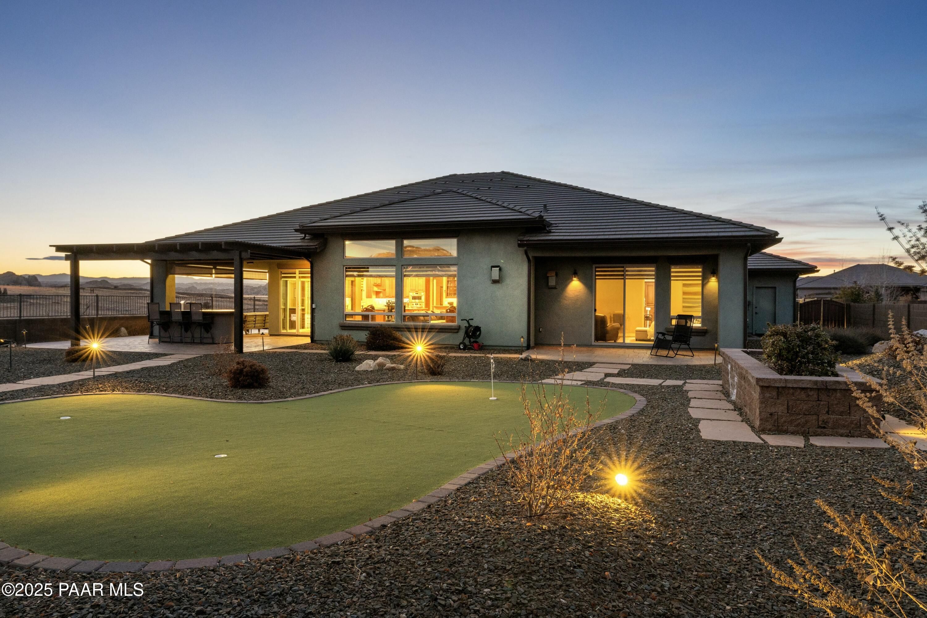 A TRUE MASTERPIECE: EXQUISITE CARRINGTON CUSTOM HOME WITH UNRIVALED LUXURY AND AMENITIES: Prepare to be captivated by this extensively upgraded, Carrington-built residence, a stunning example of luxury living that spans a spacious 3,132 square feet in a private cul-de-sac on full half acre.. This magnificent home is designed for the discerning homeowner, offering three generously sized bedrooms plus a dedicated, private office, providing both comfort and functionality. GOURMET KITCHEN AND ELEGANT DINING: The heart of the home is a true chef's paradise, featuring a state-of-the-art, gourmet kitchen. It is equipped with top-of-the-line, professional-grade appliances, including a Wolf range, Sub-Zero refrigerator, and a Cove dishwasher, even boasting a specialized steam oven for healthy, versatile cooking. The kitchen is an aesthetic marvel with stunning granite countertops that perfectly complement the gorgeous European Beechwood cabinetry, finished in a warm ''Canyon Sunset'' stain. These premium cabinets are designed for maximum convenience, featuring soft-close hinges and full pull-out drawers. A full granite backsplash adds a seamless, luxurious touch. Adjacent to the kitchen is a stylish bar area, perfect for entertaining, complete with a Sub-Zero wine refrigerator and upgraded, designer lighting fixtures. For formal occasions, the separate dining room provides an elegant atmosphere and includes a built-in buffet and china cabinet. For more casual daily meals, enjoy your morning coffee and the wonderful surrounding views from the sun-drenched breakfast nook. LUXURIOUS LIVING SPACES: The open and inviting living room is anchored by a sophisticated granite-surround fireplace, creating a cozy focal point. The room is pre-wired with surround sound for an immersive entertainment experience. High-end features enhance comfort and privacy, including tinted upper windows to manage sunlight and automatic blinds for effortless control. The thoughtfully designed floor plan ensures privacy and convenience, highlighted by a luxurious master suite that serves as a private retreat. This suite is complete with its own private fireplace and a spa-like ensuite bathroom. The home also includes an additional secondary bedroom and the dedicated, spacious office space.PREMIUM GARAGE AND OUTDOOR LIVING: The attached three-car garage is more than just a place to park; it is meticulously finished with durable epoxy flooring, custom built-in cabinetry for extensive storage, and features a charging station for electric vehicle enthusiasts. A tankless water heater ensures energy efficiency and endless hot water.Outdoor living is elevated with an impressive 360 square feet of meticulously designed covered patio space. This area is an entertainer's dream, featuring a built-in outdoor fireplace next to a mounted television for year-round enjoyment. The expanded covered stamped concrete patio seamlessly transitions to an elegant pergola, and privacy can be easily controlled with retractable screens. The large hideaway patio doors merge the indoor and outdoor spaces, creating an ideal flow for entertaining as well as a 8 x 10 custom shed.. IMPECCABLE GROUNDS AND FINISHES: The home's curb appeal is matched by its professionally landscaped front and backyard. The grounds are maintained to perfection, featuring sophisticated outdoor lighting, charming raised flower beds, and a private putting green for golf lovers. The backyard offers complete peace and privacy, enclosed by a full privacy block wall.This Carrington-built home truly offers an unparalleled level of quality, luxury, and attention to detail. It is a home that must be experienced to be fully appreciated!-----Note: The commercial LED ceiling light fixture in the garage is explicitly excluded from the sale of the premises and will not convey.