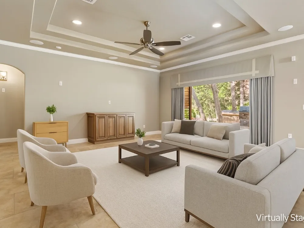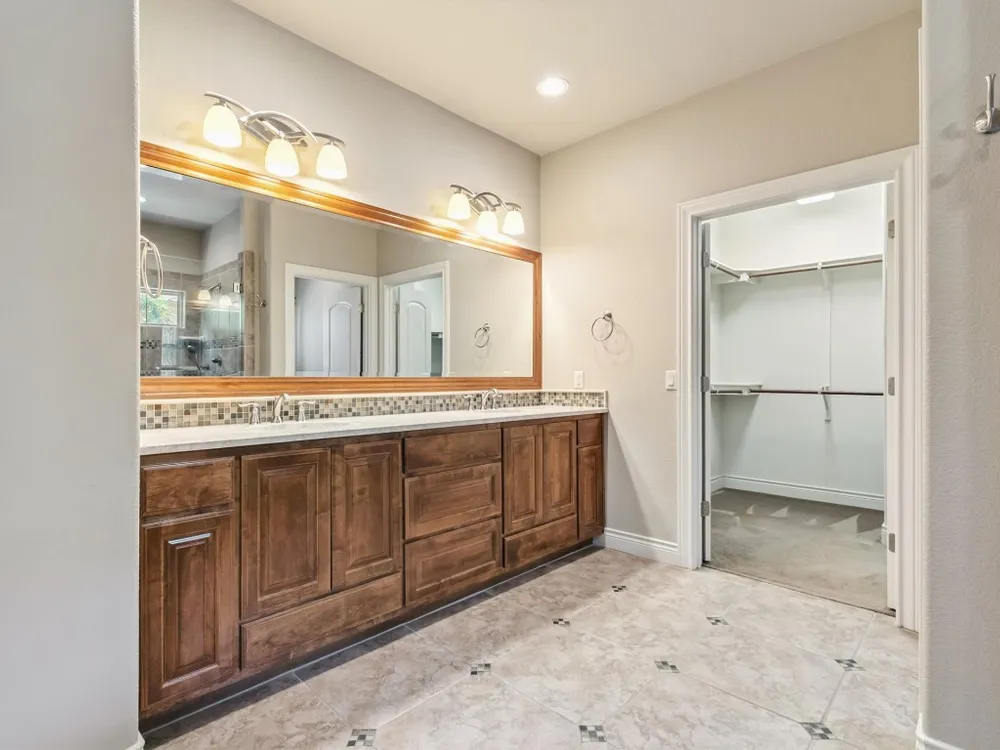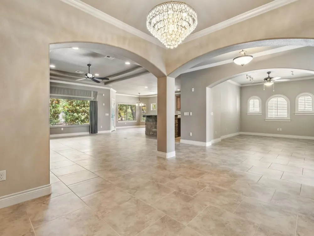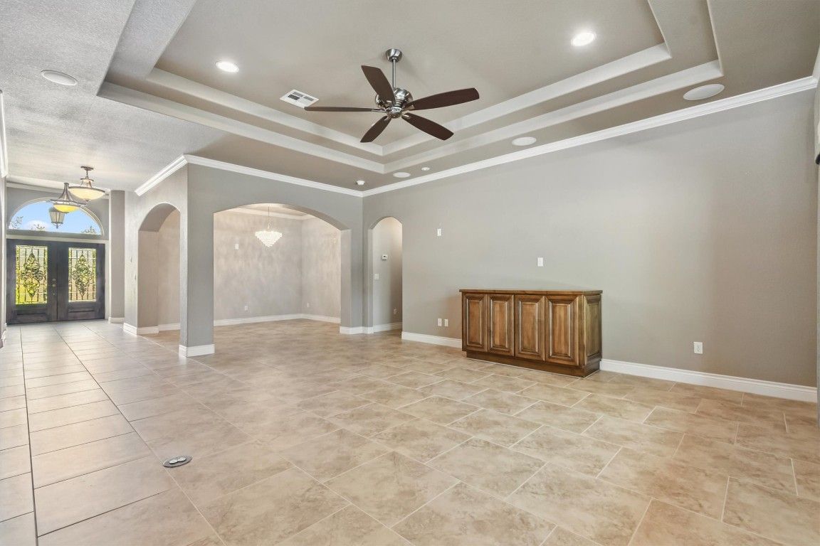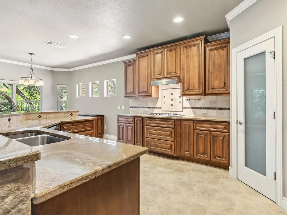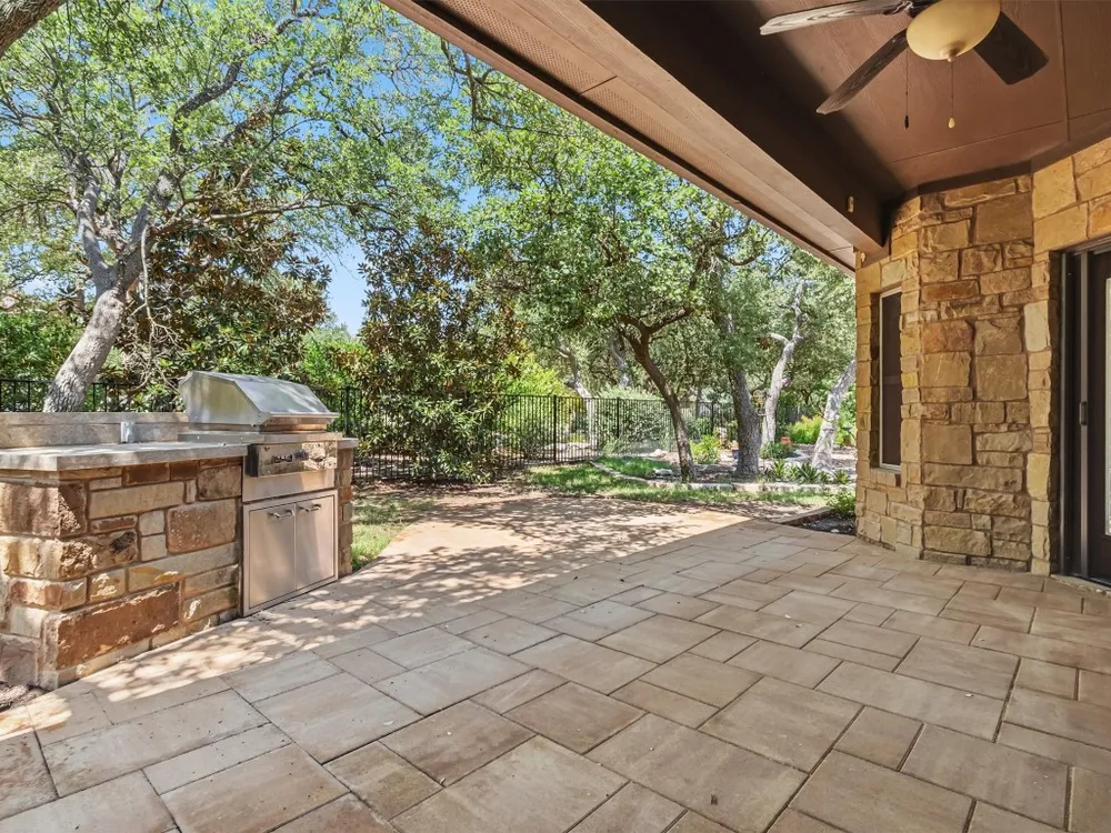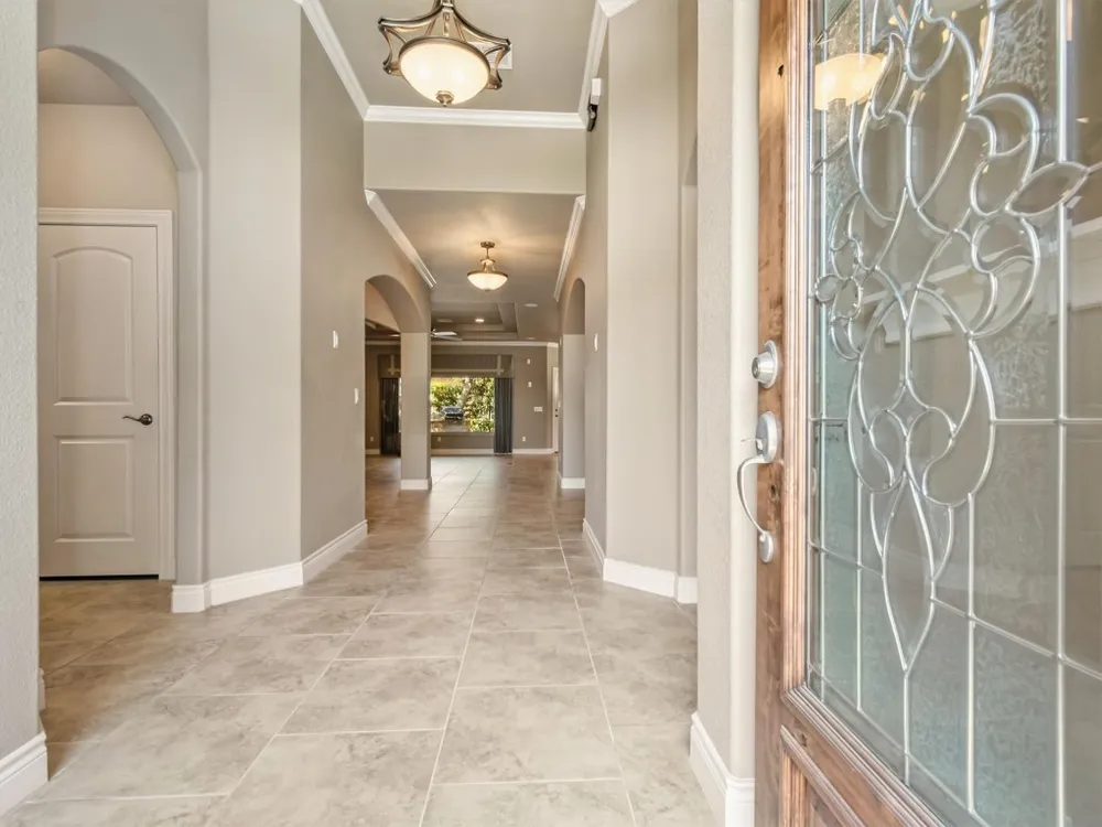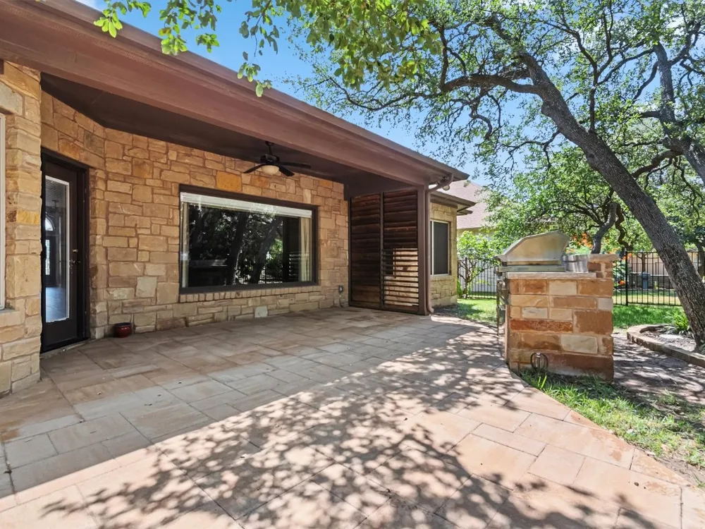Welcome to your serene oasis in the highly desirable Heritage Oaks community! This custom-built, single-story home captivates with exceptional curb appeal, a beautiful stone and stucco exterior, and a meticulously landscaped yard. Step inside through the stunning double wood entry doors, which feature remote shades, and be greeted by a large foyer that opens to a naturally lit, open floor plan. The home is adorned with beautiful tile flooring, elegant crown molding, and Hunter Douglas blinds throughout. A formal dining room and a flexible open-concept space with beautiful shutters offer versatile living options. The spacious living room features tray ceilings and a picturesque view of the backyard, creating a perfect spot for relaxation. The living area flows seamlessly into a stunning kitchen, complete with a large wrap-around breakfast bar, custom wood cabinetry, granite countertops, and a dedicated coffee bar. High-end stainless steel appliances such as GE Monogram stove and oven, and a large walk-in pantry with a frosted glass door make this kitchen a chef's dream. Adjacent is a lovely breakfast area featuring a beautiful custom-built credenza. The spacious primary suite is a true retreat, offering a luxurious en-suite bath with a frameless glass walk-in shower, dual sinks, and an oversized walk-in closet with a convenient laundry chute connected to the laundry room. The backyard is an entertainer's paradise. A large, covered flagstone patio with a built-in grill is perfect for outdoor dining and relaxing. Mature trees and a wrought iron fence create a private, tranquil setting. The attached two-car garage provides ample storage with extensive shelving. This home has been meticulously maintained with recent upgrades including a new roof (07/2025), new AC blower (08/2025), and a new garbage disposal (12/2024). Additional features include a water softener and garage brackets. Don't miss the chance to make this exceptional property your own!