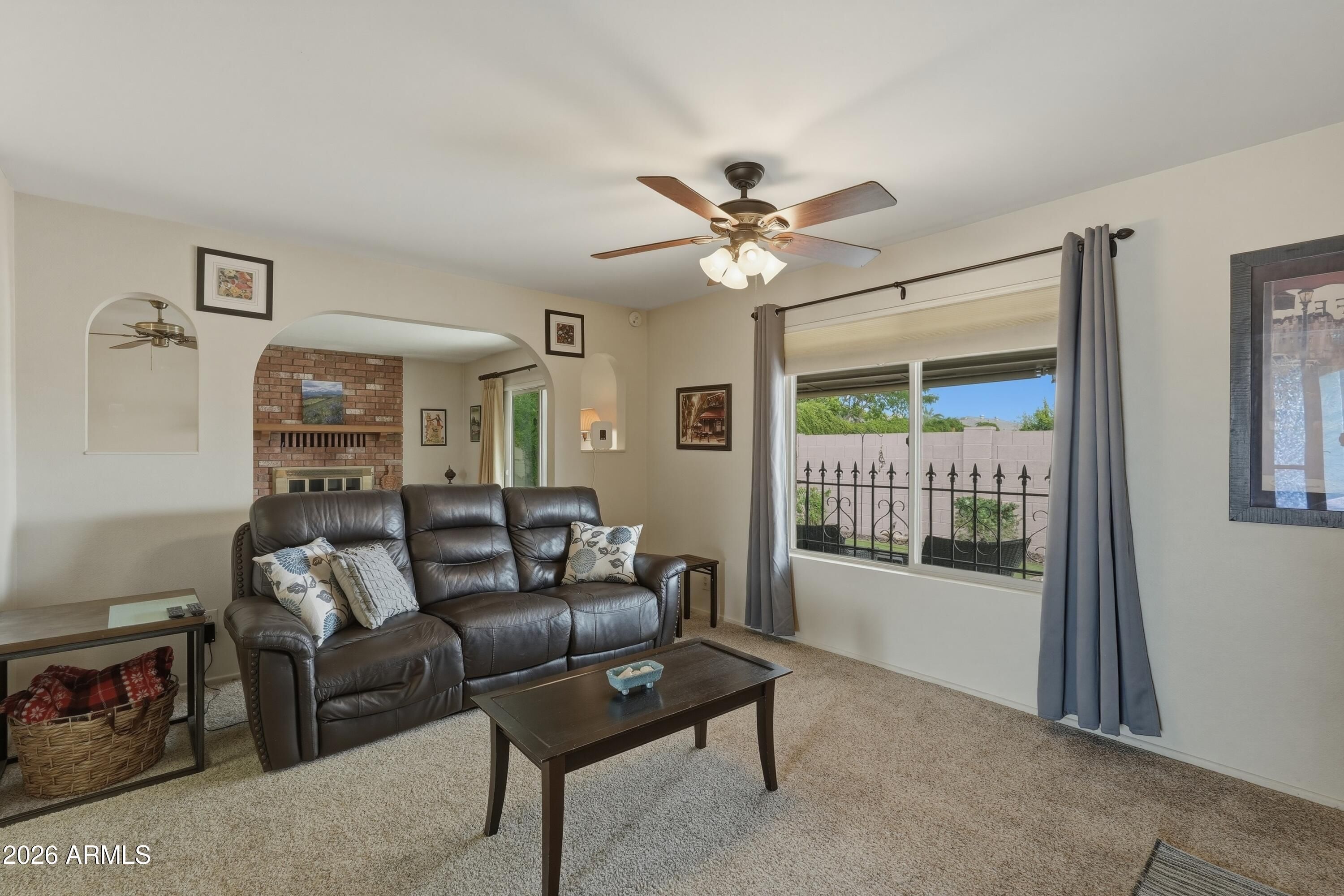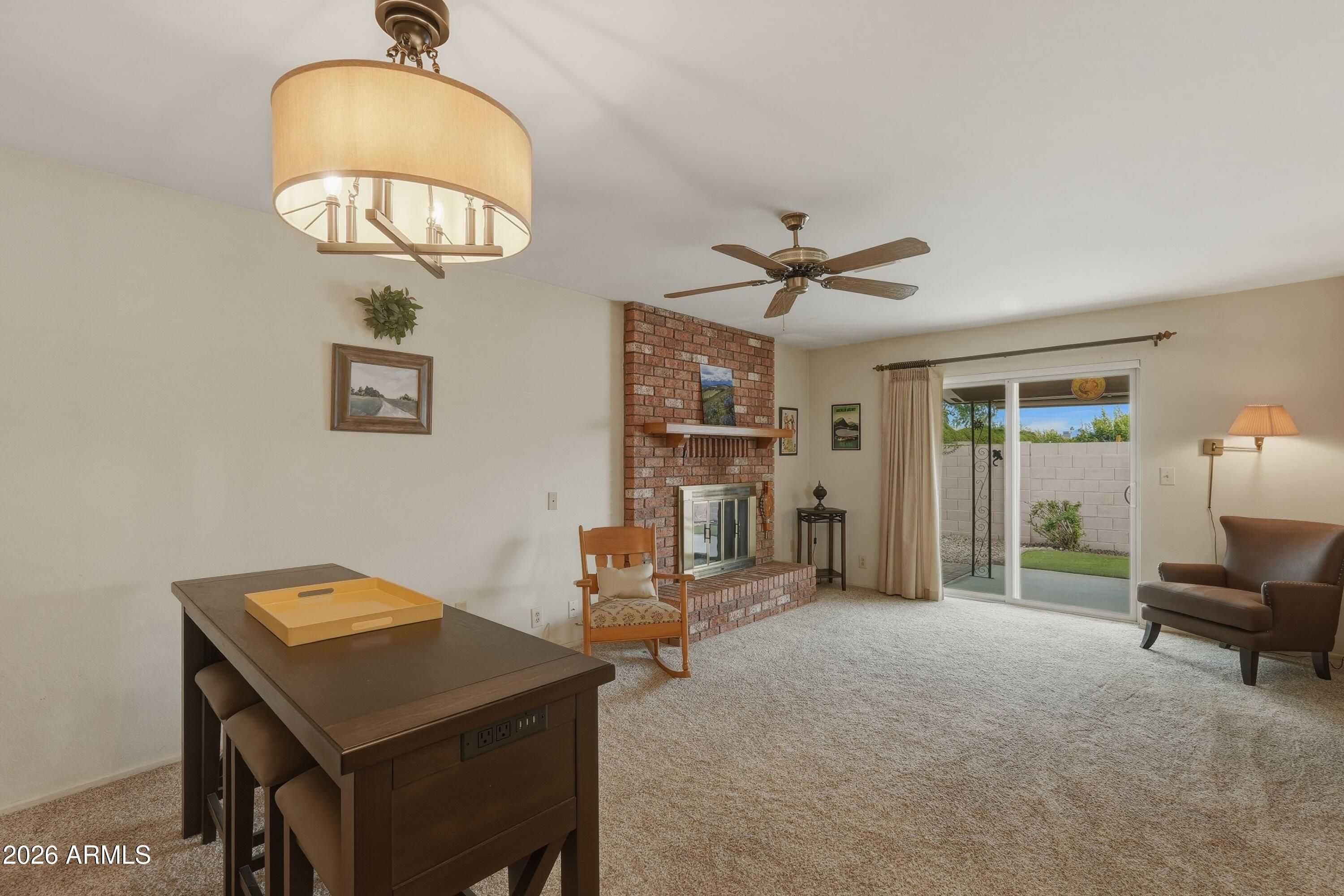 YOU'RE GONNA LOVE THIS ONE! Located in the heart of the highly desirable Sunland Village Active Adult Community, this lovingly maintained 2-BR, 2-BA (both upgraded) bungalow offers comfort, charm, and an unbeatable location. Stainless Steel appliances in the spacious kitchen. Perfectly positioned across from a beautiful park and close to popular community amenities-- including pickleball courts, golf, pools, and recreation centers--Inside, you'll find a warm and inviting floor plan featuring a spacious living area, double garage, and a separate workshop--perfect for hobbies, storage, or projects. One of the standout features is the rare cozy fireplace in the family room, an uncommon find in Arizona homes. Step outside to your private yard w/ covered patio.