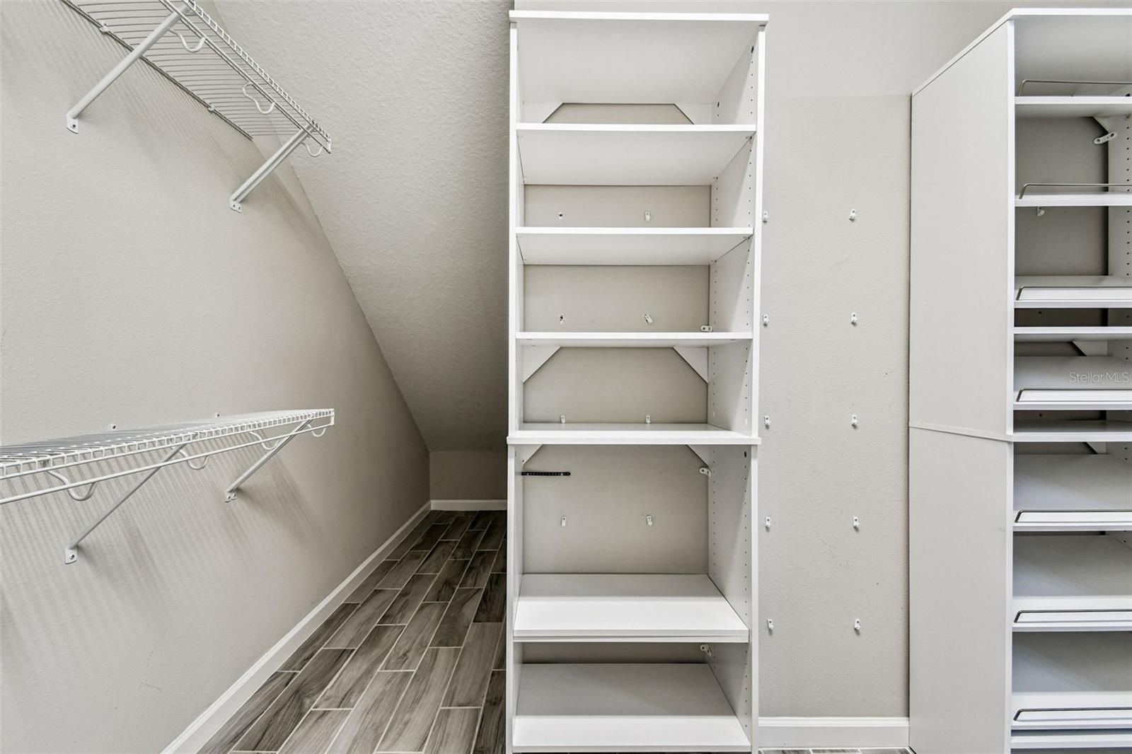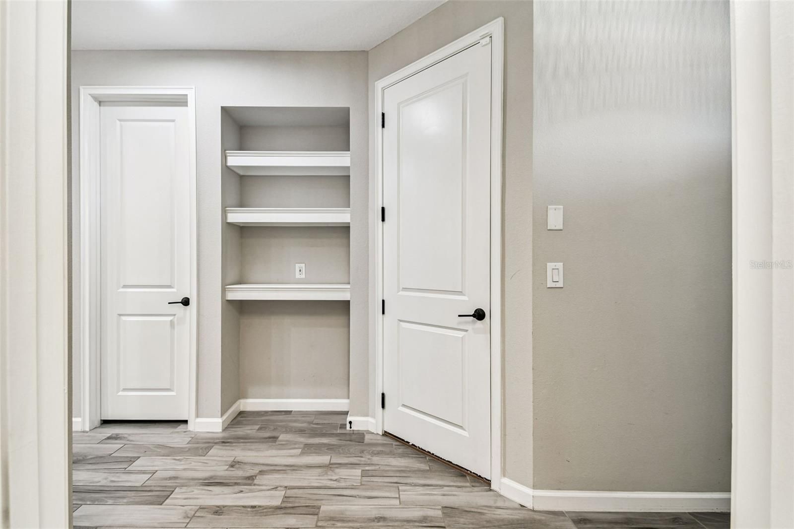 - Built-in Features, Ceiling Fan(s), Chair Rail, Crown Molding, High Ceilings, Kitchen/Family Room Combo, Open Floorplan, Main Level Primary, Solid Surface Counters, Solid-Wood Cabinets, Thermostat, Walk-In Closet(s), Window Treatments