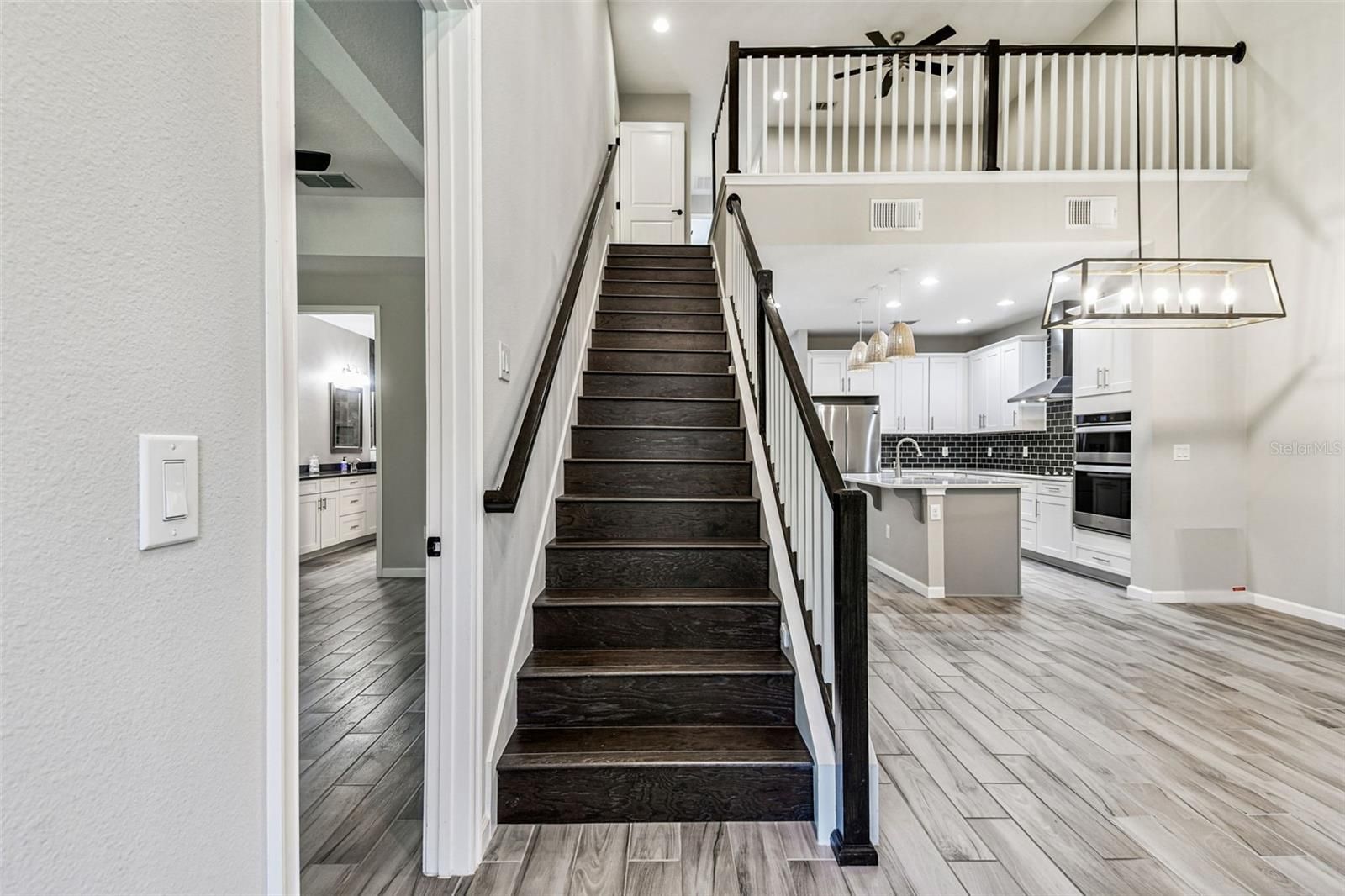 Luxurious and inviting, this Harmony at Lakewood Ranch residence blends contemporary design with effortless comfort. Featuring three elegant bedrooms, two and a half designer baths, and an expansive loft/bonus area with an enclosed storage room, this home was crafted for those who appreciate style and substance in every detail. Impeccable upgrades and refined finishes are found throughout. Soft grey tile flooring flows seamlessly through the open-concept main level, complemented by sleek quartz countertops, bright, custom cabinetry with soft-close drawers, and a timeless subway tile backsplash. The island kitchen is both functional and beautiful, offering the perfect space for casual dining or elegant entertaining. Striking two-story ceilings enhance the airy, light-filled living spaces, while modern fixtures and stainless-steel appliances add a touch of sophistication. The primary suite, conveniently located on the first floor, provides a private retreat with a spa-inspired bath, dual vanities, and a large walk-in shower with designer tilework. Upstairs, a spacious loft offers flexibility for a media lounge, home office, or fitness area, alongside two generously sized bedrooms and a full bath. Additional features include a hardwood staircase, epoxy-coated garage flooring, and a screened paver lanai—perfect for enjoying serene evenings outdoors. Set within the sought-after community of Harmony at Lakewood Ranch, residents enjoy resort-style amenities including a sparkling pool, fitness center, clubhouse, and playground. With beautifully maintained landscaping, affordable HOA dues, and proximity to premier dining, shopping, parks, and top-rated schools, this home captures the essence of modern luxury living in Lakewood Ranch.