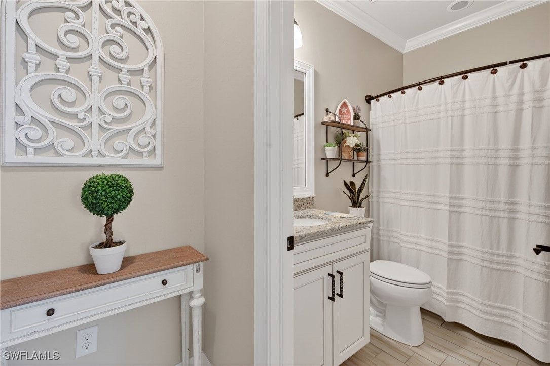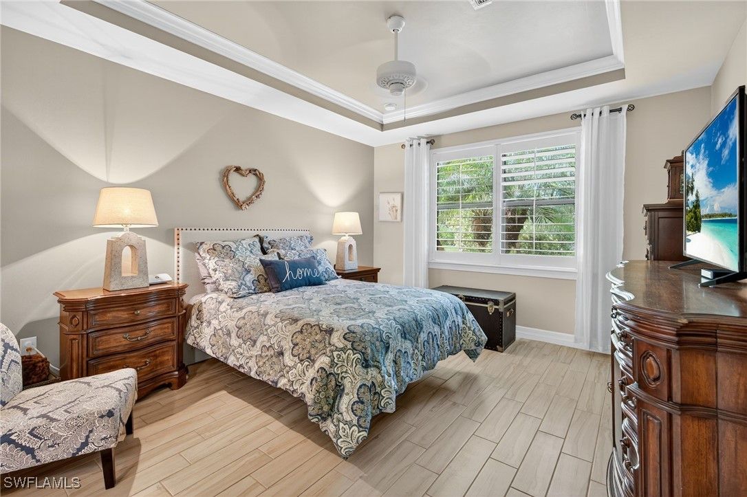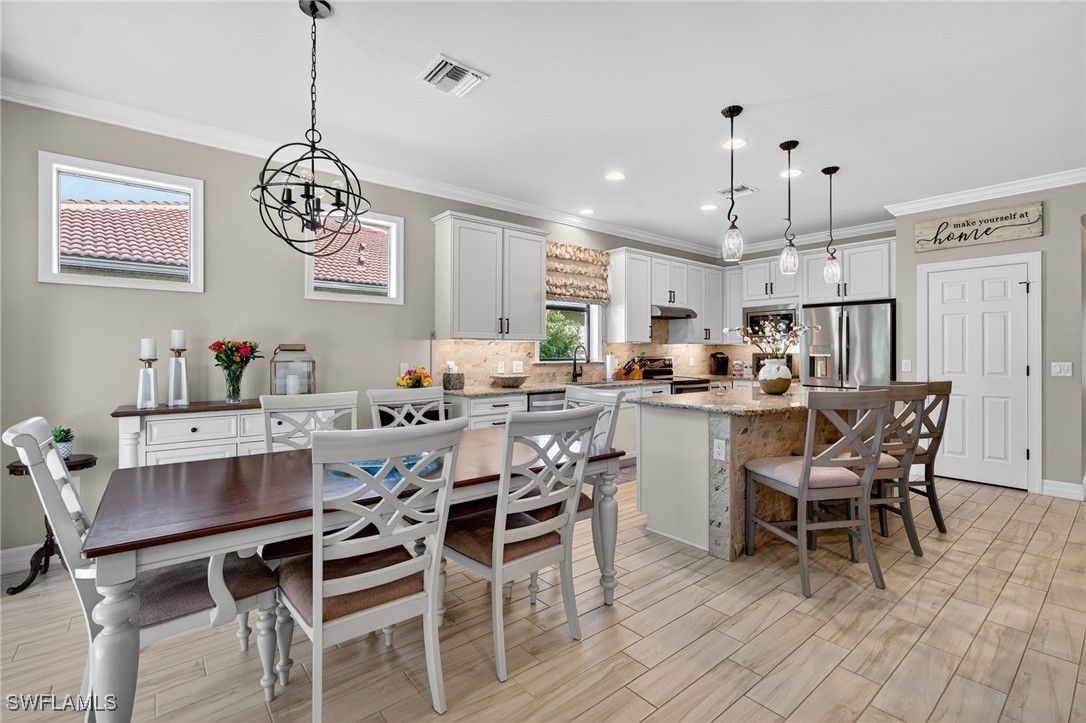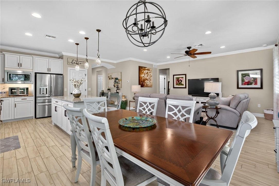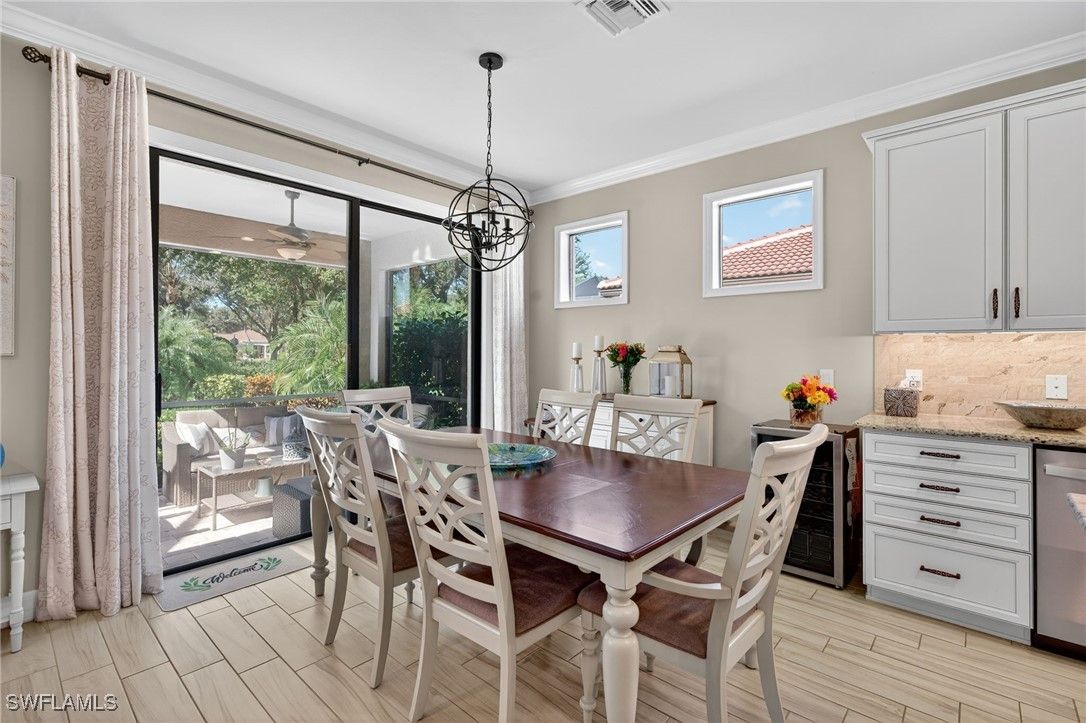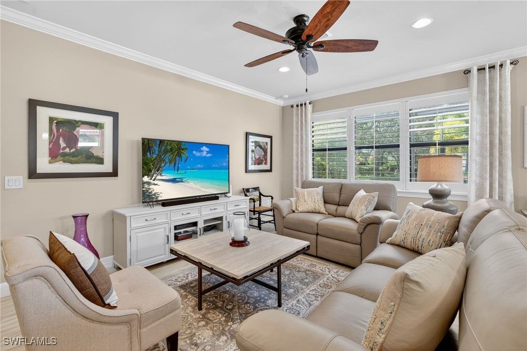 This impeccable home is located in Bellera at Del Webb, Naples! Golf membership and/or golfcart is not included in the sales price but is available for an additional cost, to be negotiated. Exceptional Abbeyville Model with over $60,000 in upgrades in highly sought after Del Webb 55+ Community with professional landscaping! The property emphasizes outdoor living with front porch screening and an extended lanai that creates a serene and inviting atmosphere. Designed for comfortable living, enter through a beautiful glass door onto porcelain wood grain tile throughout and drop zone for convenience. 2 BR plus Den with spacious Great Room, Dining Area and Kitchen with Top Level Cabinetry, stunning backsplash, modern pendant and under cabinet lighting, single bowl sink, expansive kitchen island, plantation shutters, custom shades, curtains, crown molding and much more! The Master Suite boasts a gorgeous view of the lush foliage outdoors. A paradise with well-designed custom mirrors/lighting, frameless shower door and custom closets. Two car garage includes a utility sink, overhead storage racks and epoxy floors. The Oasis Club, a Resort-Style Club, offers two pools, social areas, fitness center, steam room and sauna, tennis, pickleball courts, bocce ball, golf and more. Short Golfcart ride to Ave Maria Town and shops. This beauty is move-in ready!