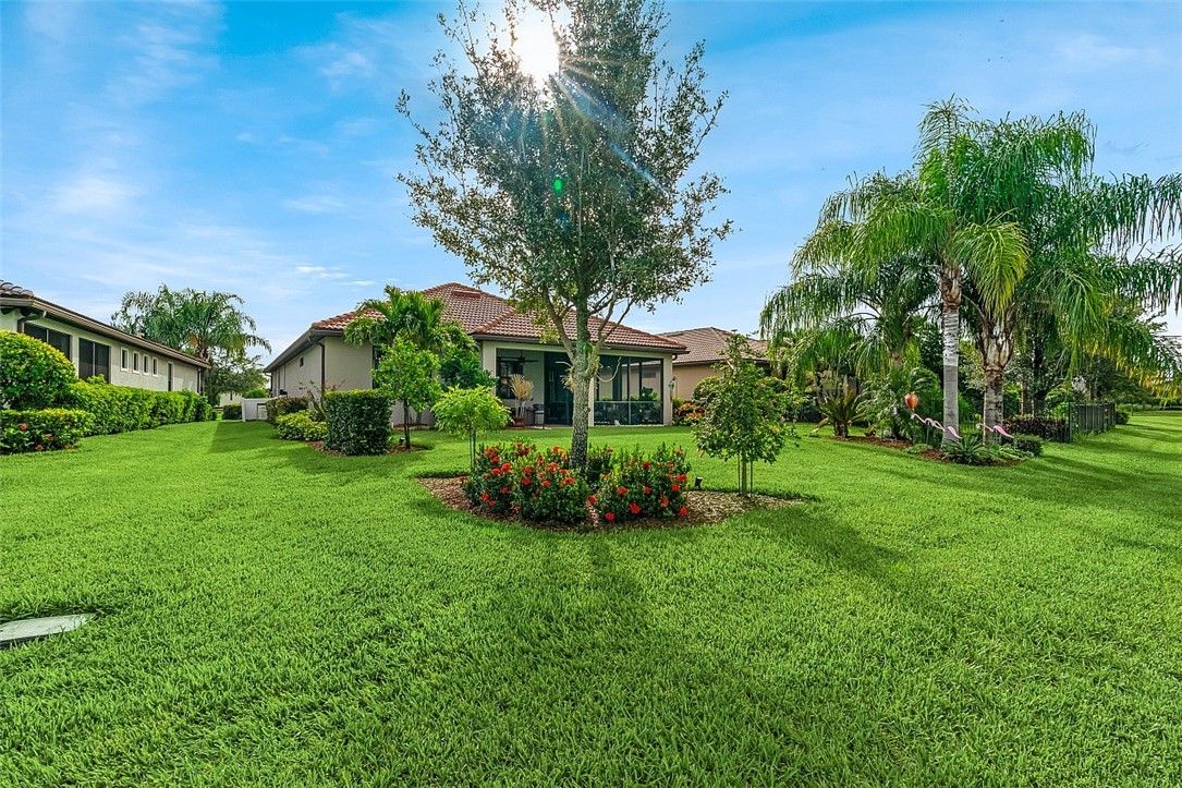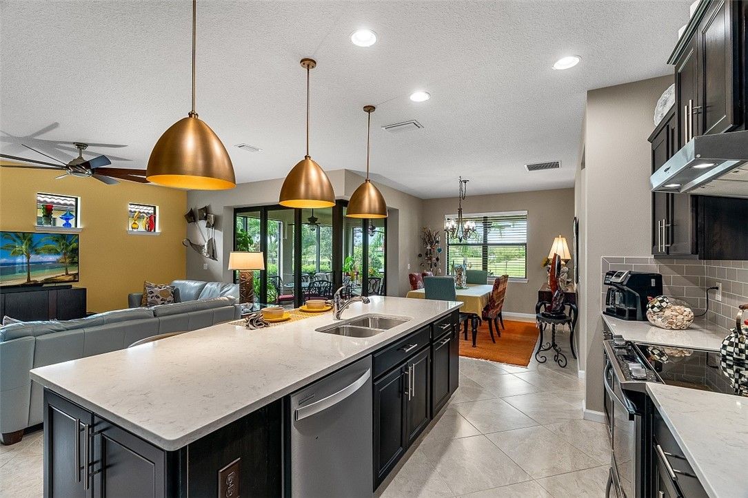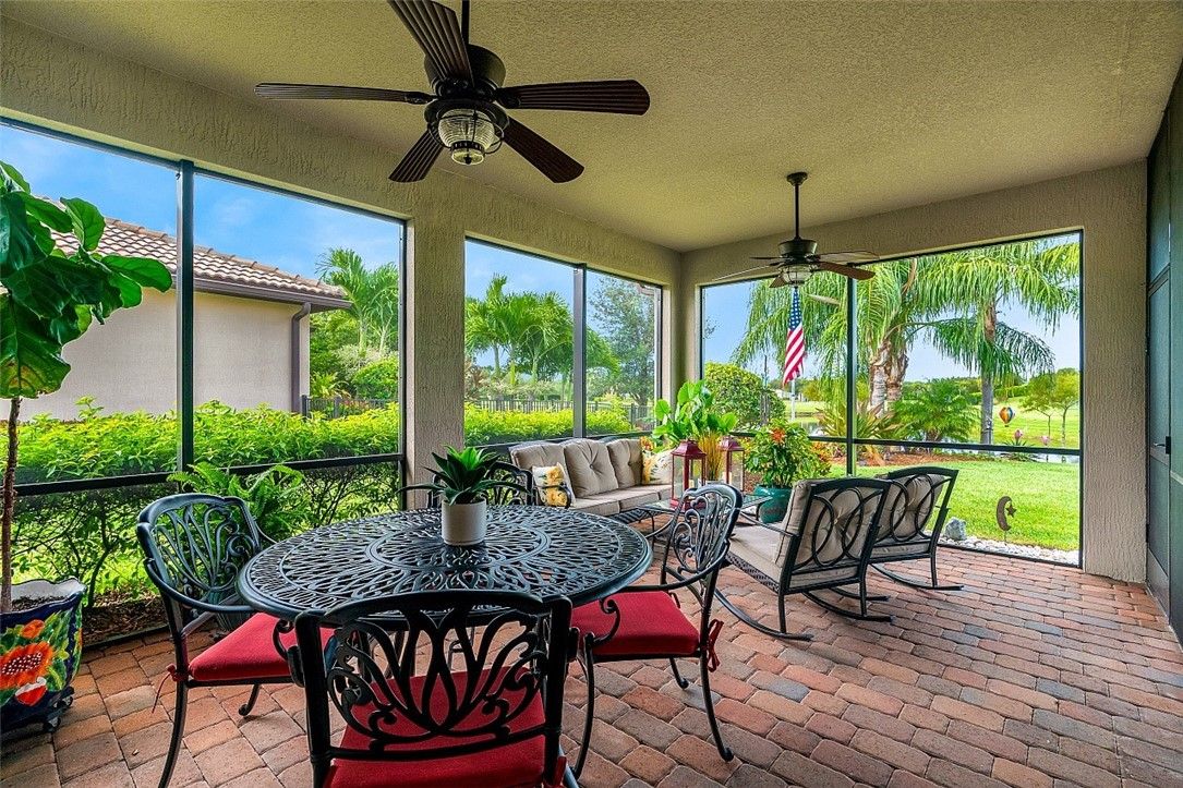 PRICE + LOCATION in one Beautiful Package. 2 BD/2 BA ~ Open floor plan w/den/office, upgraded lighting & fans, tile flooring in living areas w/upgraded carpet in BR. Espresso cabinets, quartz counters, SS appliances, walk-in pantry—plus an extended island. Spectacular lake views from your EXTENDED screened brick-paver patio w/zero-corner sliders. Primary suite offers tray ceiling, DBL vanity, walk-in shower & oversized walk-in closet. Impact windows, GENERAC generator w/buried tank, water softener, bump-out 2-car garage for golf cart. HOA FEES INCLUDE BASIC CABLE/INTERNET! RESORT STYLE LIVING!