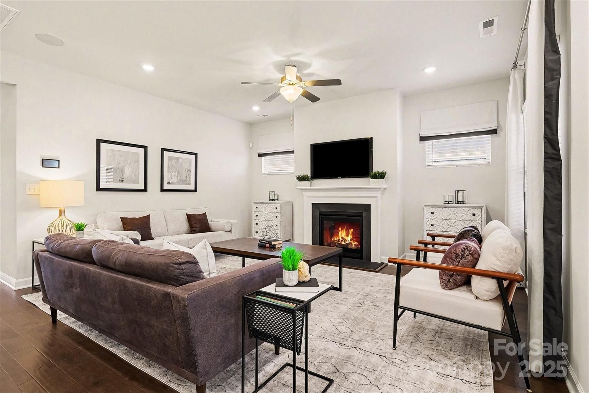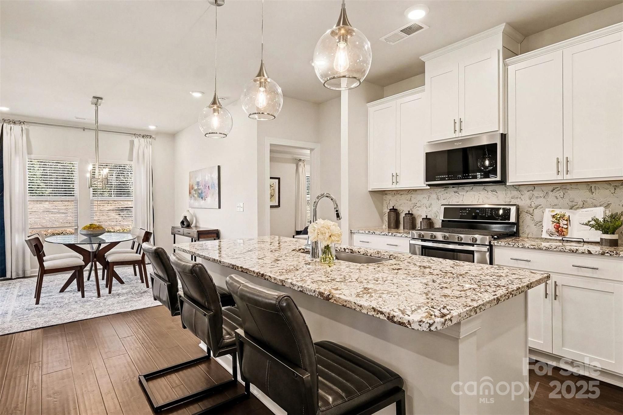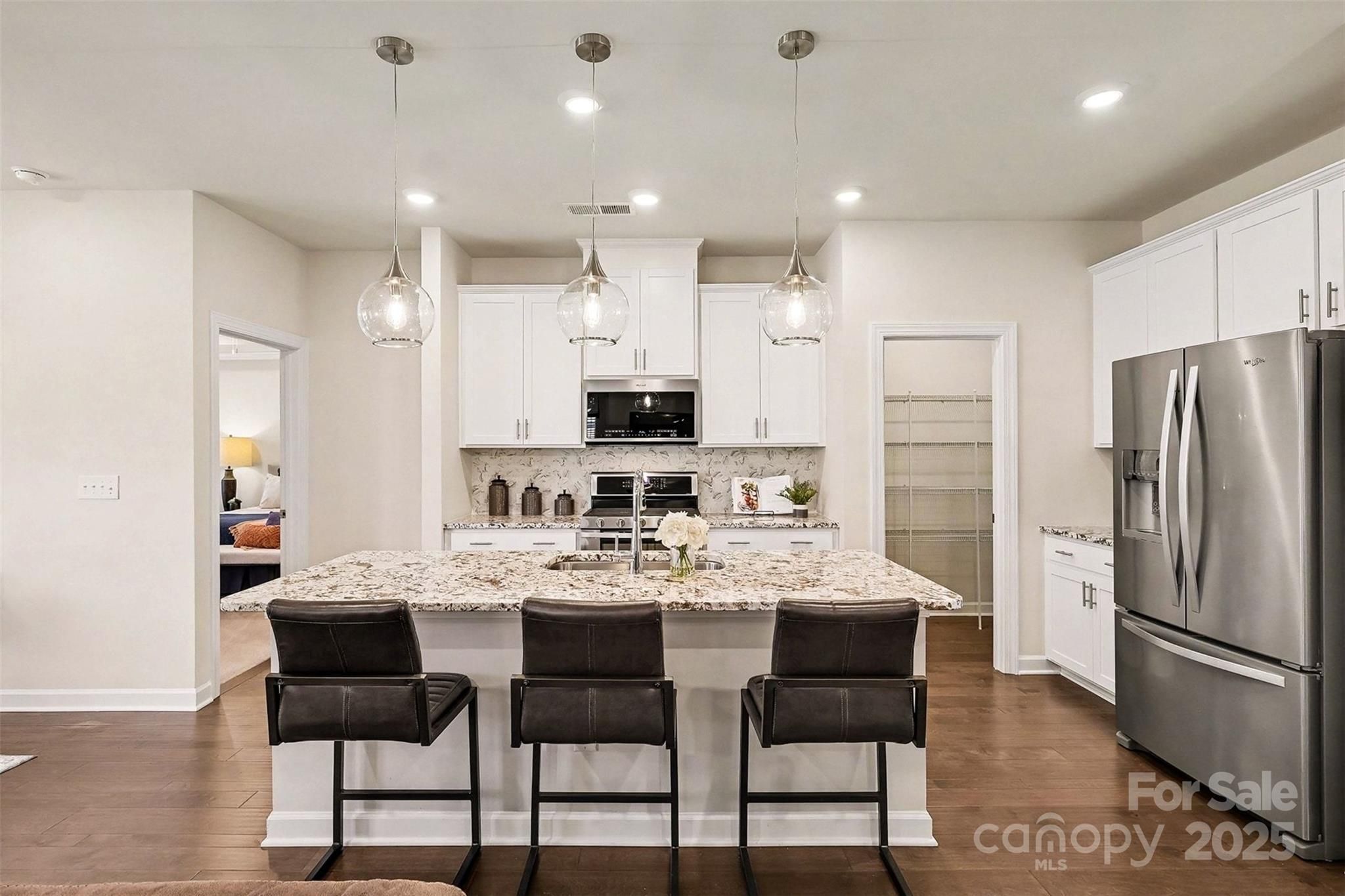 Designed to impress & built for ease, this former model home in Canopy Creek pairs modern comfort with refined style. Thoughtful upgrades include recessed lighting in every room, in-ceiling speakers, upgraded textured carpet, & custom curtains that enhance the polished, curated feel, all conveying with the home for designer style from day one. The open-concept layout is light-filled & inviting, anchored by a stunning kitchen with an oversized island, granite countertops, stainless appliances, & elegant pendant lighting. A covered porch extends your living space outdoors, perfect for morning coffee or an evening glass of wine. The well-planned split-bedroom layout enhances privacy, with secondary bedrooms at the front of the home & a tranquil primary suite secluded at the rear. Refrigerator, washer, & dryer are included, making your transition effortless. Built in 2018 with lawn maintenance included in the HOA, this home makes everyday living refreshingly simple. Enjoy resort-style community amenities including a pool & walking trails. Ideally located in Denver, a growing Charlotte suburb on the west side of Lake Norman, you’ll enjoy the quieter side of the lake with easy access to recreation, shopping, & dining.