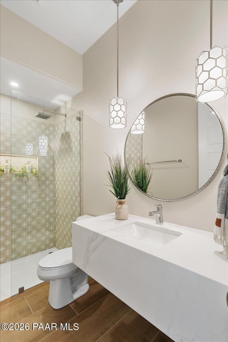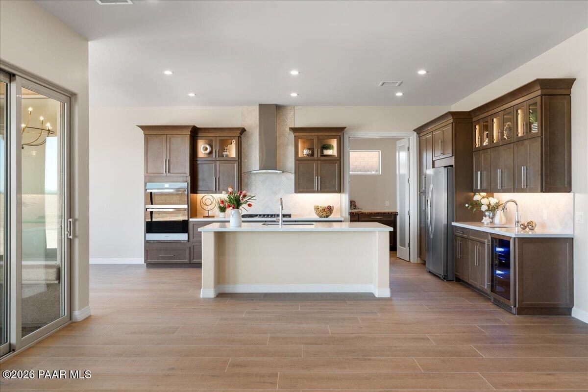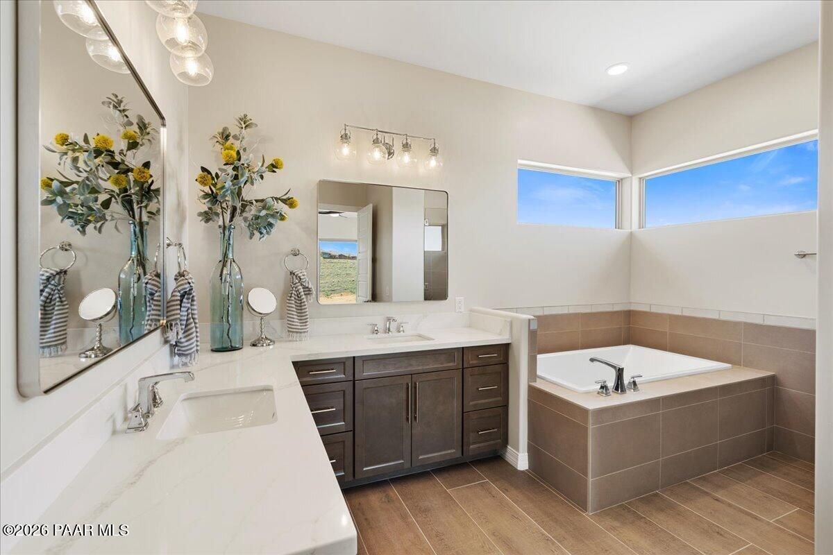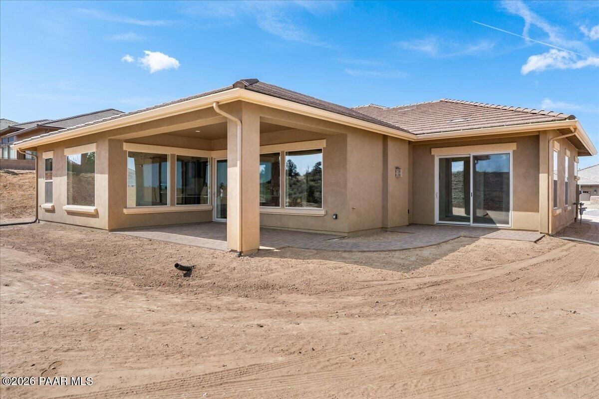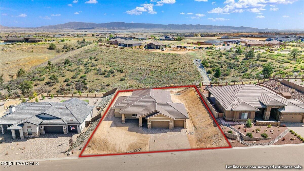 Brand-new custom home by Stoddard Lifestyle Homes in the gated community of Granite Dells Estates. This beautifully appointed single-level residence offers 3 bedrooms, 3 bathrooms, including a junior primary suite, and 2,400 square feet of thoughtfully designed luxury living.A grand entry welcomes you into the open-concept great room and chef's kitchen, with a spacious dining nook just off the kitchen. The stunning morning kitchen is filled with natural light and features abundant cabinetry, butcher block counters in a herringbone pattern, and exceptional character. Expansive picture windows line the back of the home, showcasing open space views and bringing the outdoors in. The main kitchen is a dream for entertaining, complete with stainless steel appliances, gorgeous quartz countertops, a large island, coffee bar with prep sink, wine refrigerator, deep storage drawers, and extensive cabinetry. The great room is anchored by a beautiful stone fireplace, while wood-look tile flooring runs throughout the home. The split floor plan offers privacy, with a spacious primary suite featuring its own private paver patio. The luxurious primary bath includes a garden tub, walk-in shower, and dual vanities. All three bathrooms showcase beautiful tile shower surrounds, and custom lighting throughout the home adds warmth and sophistication. Additional highlights include a spacious laundry room with sink and broom closet, tile roof, exterior stone accent columns, covered front porch, covered rear patio, and an impressive 4-car garage. Located near hiking trails and exceptional community amenities, including a recreation center, pool, event lawn, pickleball courts, and fitness center, Granite Dells Estates offers resort-style living with activities for every lifestyle.