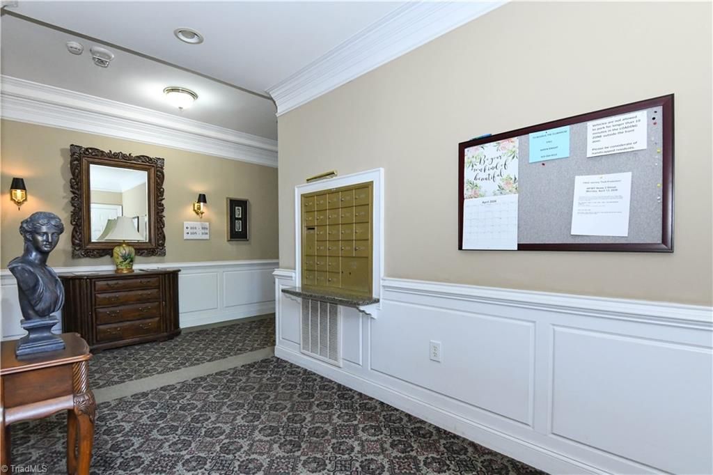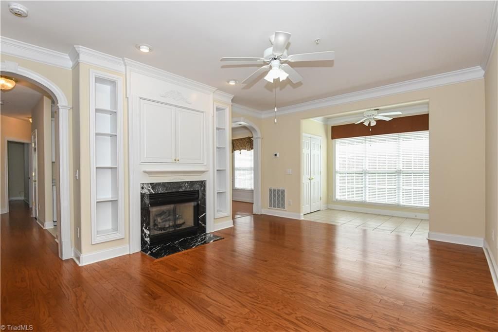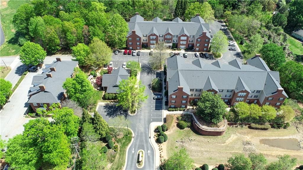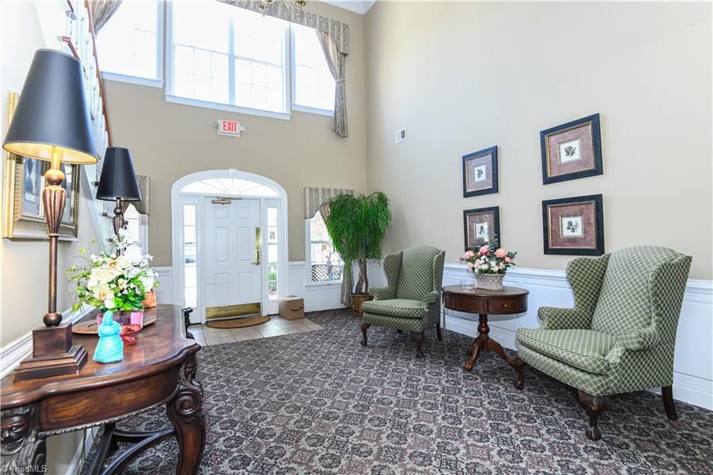 Welcome to the restricted 55+ community in Guilford College.It is only a short ride up on the elevator to the 2nd floor to #202-a corner unit. Upon entering, the foyer leads to a spacious living room with a gas log fireplace flanked by built-in cabinetry. The tiled floored sunroom, with large windows, is filled with natural light-a great space for an easy chair and /or plants. This space looks out over a "wooded area". The compact kitchen, with standard size appliances, flows easily into the dining area. The 7'x5' laundry room is equipped with upper and lower cabinets and shelving above the washer/dryer. The primary bedroom has ample space for placing furniture and has a large walk-in closet. The ensuite bath has a walk-in shower along with grab bars. The fully furnished clubhouse is for all residents to use. The building is secure and is accessed by a key fob. Assigned parking space as well as ample visitor spaces. This property provides comfort and convenience for active living.
