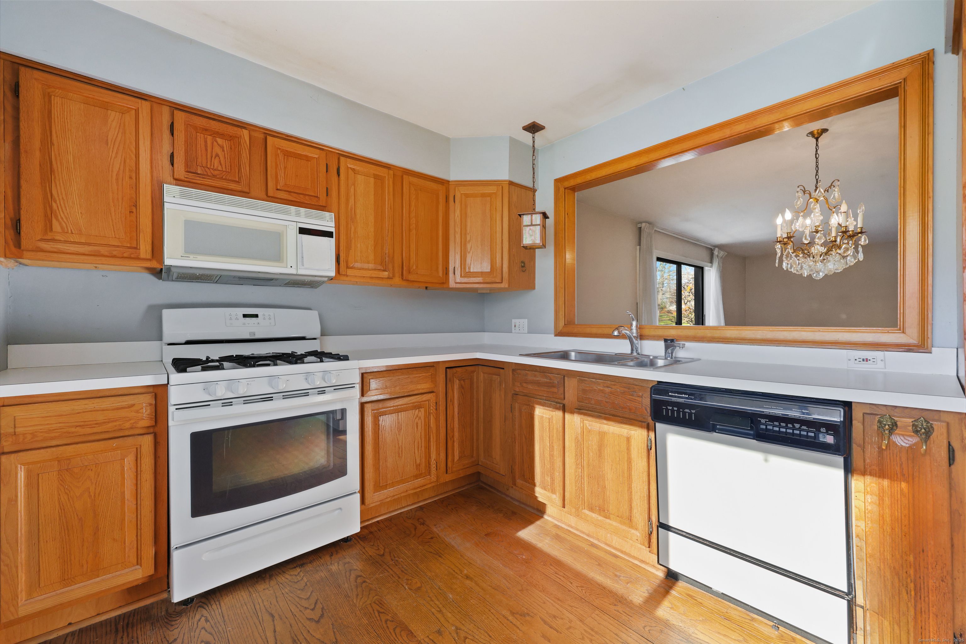 End of Cul-De-Sac Unit in Oronoque Village with Golf Course Views! Private Quiet Location! Great views from all windows. Three Bedrooms/Three Full Baths. Hardwood floors in Living Room, Dining Room and Kitchen! Beautiful Living Room with lots of natural light, fireplace, and sliders to oversized deck for outdoor dining or entertaining. Sunny Kitchen with hardwood floors and eat-in-space. Dining area open to Living Room. Large Primary Bedroom & Primary Bath, with two closets, one is a large walk-in. Second main level Bedroom with hall bath. Lower level has huge family room space, 3rd Bedroom/Office, Full Hall Bath, and Unfinished Basement space with Laundry, Mechanicals, and built-in wooden storage shelves. One car garage with extra storage space as well.