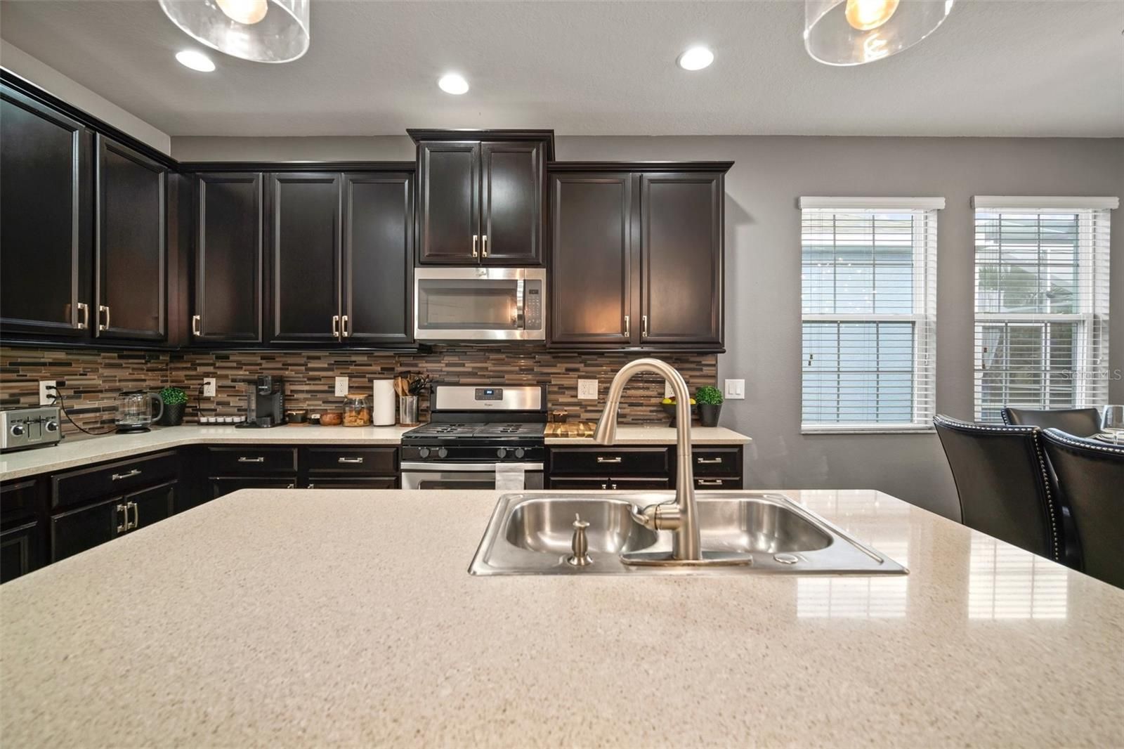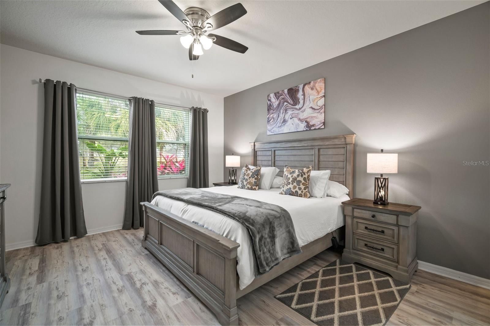 Welcome to this beautiful Florida-style home located in the gated Admiral Pointe division of the highly sought-after MiraBay community. This residence offers an open-concept layout featuring four bedrooms with luxury vinyl flooring, two full bathrooms, soaring ceilings, energy-efficient windows, tile flooring in main living areas, upgraded lighting and fixtures, a screened lanai, and a two-car garage. The gourmet kitchen is thoughtfully designed with 42-inch cabinetry, upgraded granite countertops, stainless steel appliances, a four-burner natural gas range with oven, and a center island with bar-top seating—perfect for entertaining. The spacious family room features a tray ceiling and dual sliding glass doors that open to the screened lanai and fenced, professionally landscaped backyard. An irrigation system is already in place, and the yard offers ample space for a future conversation pool. The expansive owner’s suite includes a walk-in closet and a spa-inspired en-suite bath with a large walk-in shower featuring a rain showerhead, water closet, and double-sink granite vanity. The laundry room, conveniently located near the garage, comes equipped with a washer and dryer. Additional highlights include a tankless gas water heater and a freshly painted interior. This move-in-ready home is ready for you to unpack and enjoy. Residents of Admiral Pointe enjoy their own private clubhouse and heated year-round pool, in addition to MiraBay’s resort-style amenities. The community features a grand clubhouse, heated Olympic-style pool, 136-foot waterslide, parks, three playgrounds, fitness center, gym, café with full liquor license, basketball and tennis courts, and a stunning 135-acre lagoon offering kayak rentals and endless recreation. Centrally located with easy access to Tampa, Orlando, Bradenton, Sarasota, and St. Petersburg, this home places you close to world-class beaches, shopping, dining, and entertainment. Experience the Florida lifestyle you’ve been dreaming of—schedule your private showing today. All furniture and cutlery availble at $10,000.