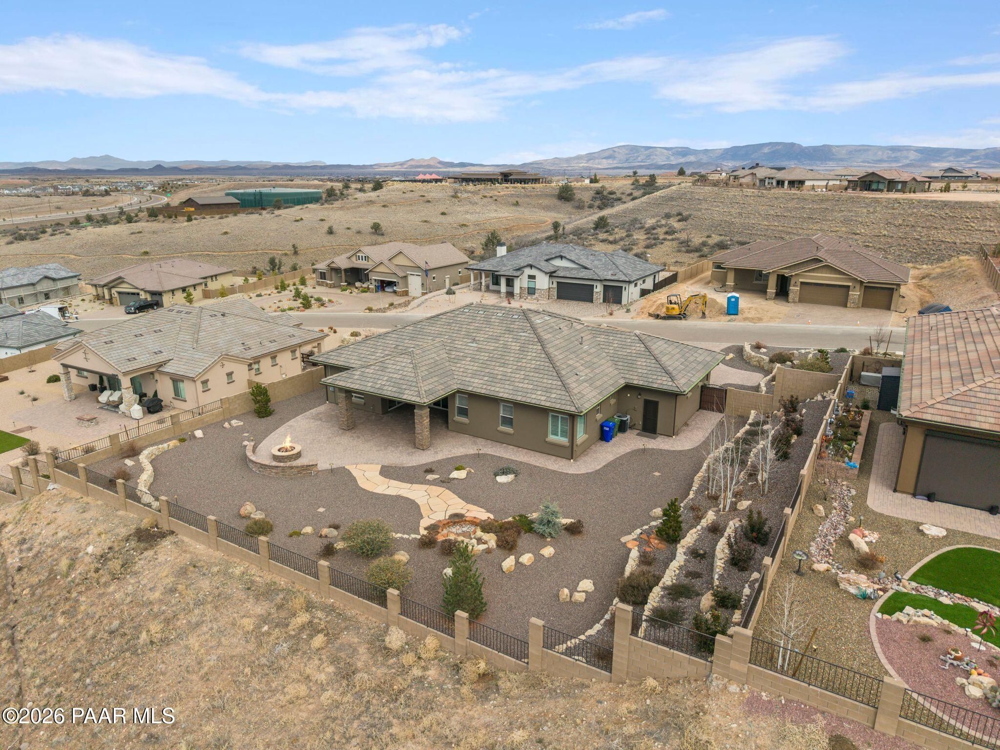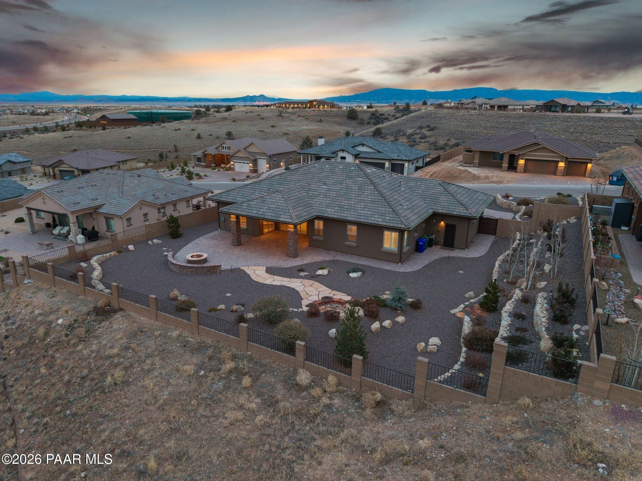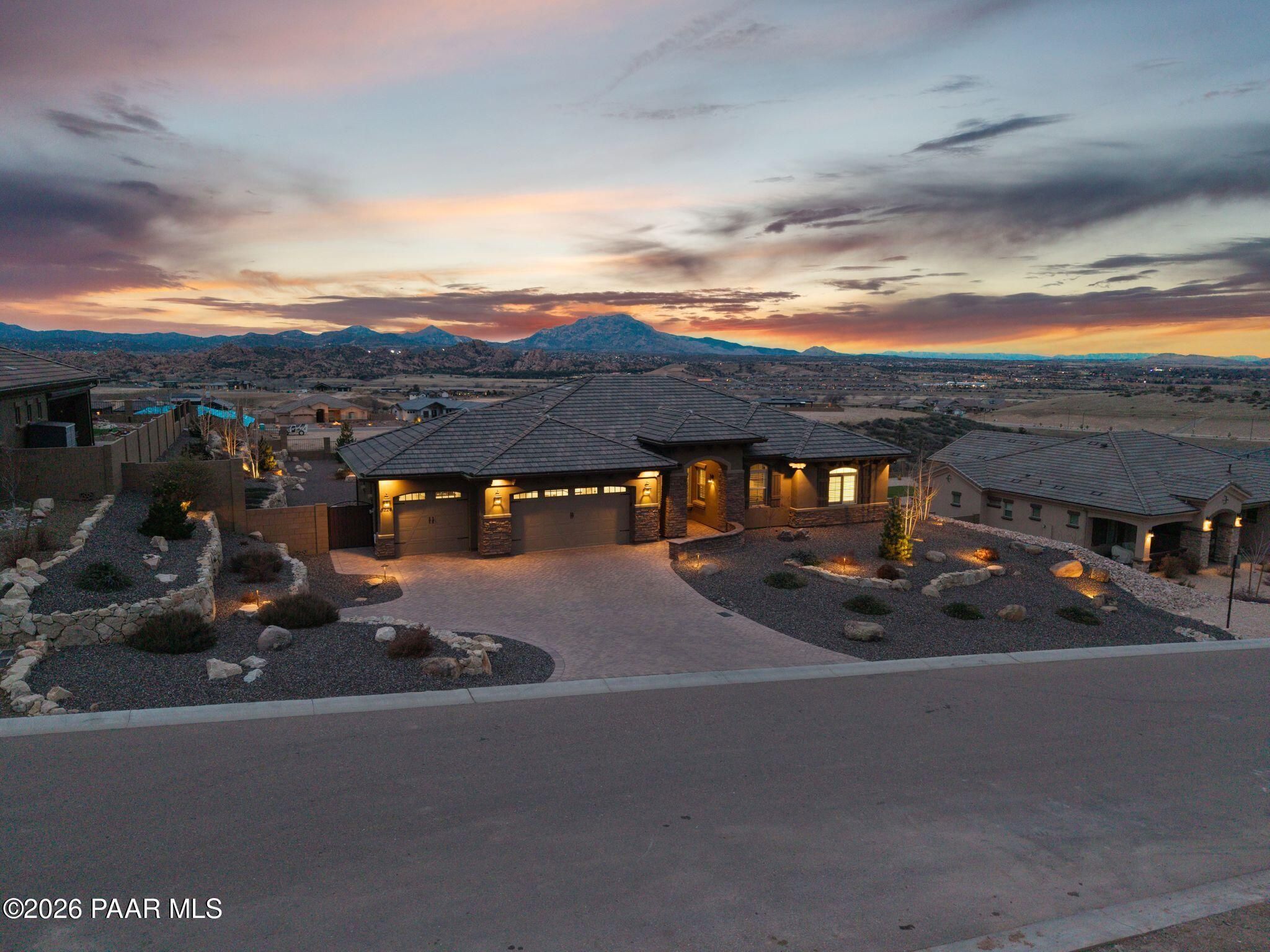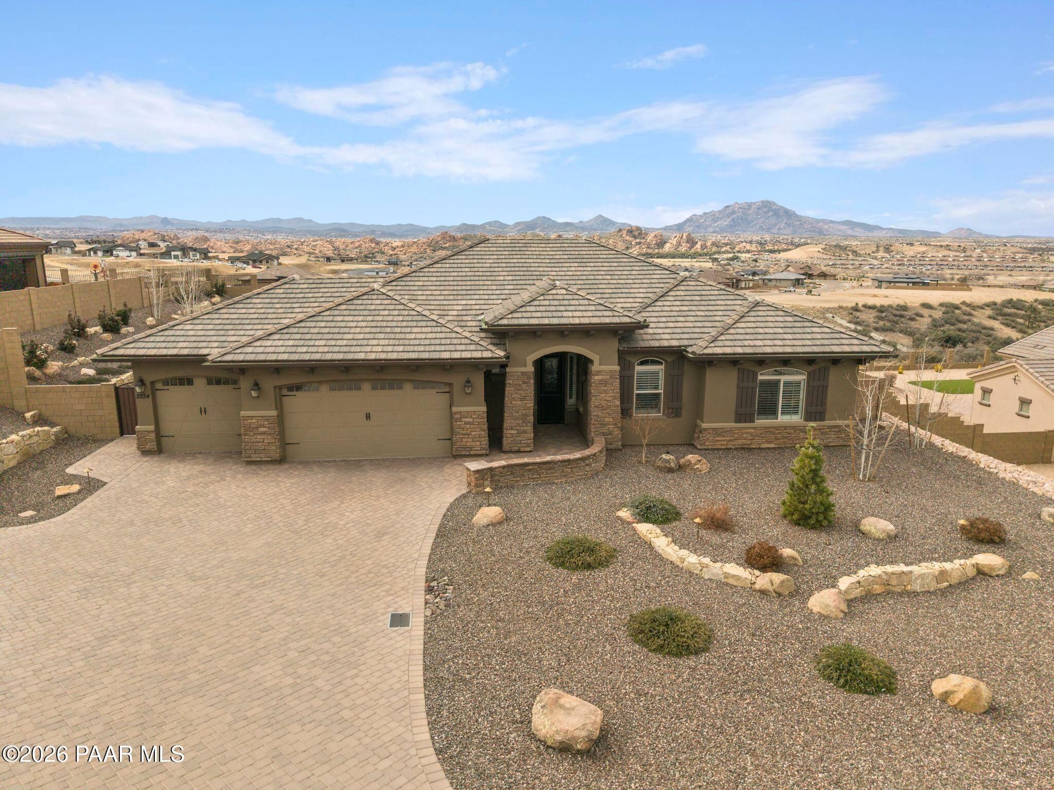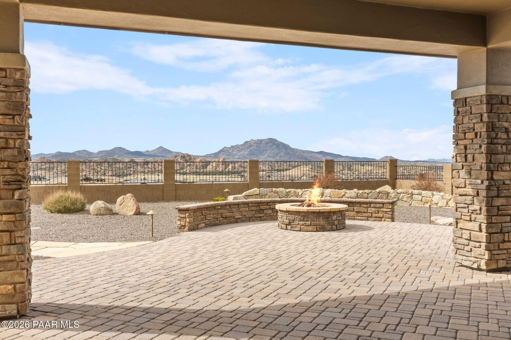 This executive residence at 5224 Dells Point Rd, built by Carrington Homes in the gated community Sunset Rdige in the Granite Dells Estates subdivision, offers a luxurious and custom living experience with breathtaking views of Granite Mountain and The Dells. Key Features Include:Exterior & Location: Superior full-exterior shear construction, premium landscaping with custom rock walls and a water feature, accent and landscape lighting, and an expansive covered outdoor patio with a Big Ass Ceiling Fan, a natural gas fire pit with a seat wall, and a hot tub pre-wire.Interior Luxury: A gourmet kitchen with Wolf, Sub-Zero, and Cove appliances, Quartz countertops, a walk-in pantry, and Kinetico RO drinking water. The flexible floor plan includes 2 bedrooms plus a den/potential third bedroom. High-end finishes include custom wood shutters, Hunter Douglas shades, custom Hubbardton Forge lighting, Monte Carlo Maverick ceiling fans, and a den with built-in cabinetry and a desk.Amenities: Includes all existing televisions, a Speed Queen washer and dryer, and a whole-house Kinetico Water Softener.Oversized Garage: A 3-car extended, fully insulated garage with epoxy flooring, upgraded insulated doors and openers, a central vacuum, utility sink, custom workbench/cabinetry, EV pre-wire, and a built-in sound system.