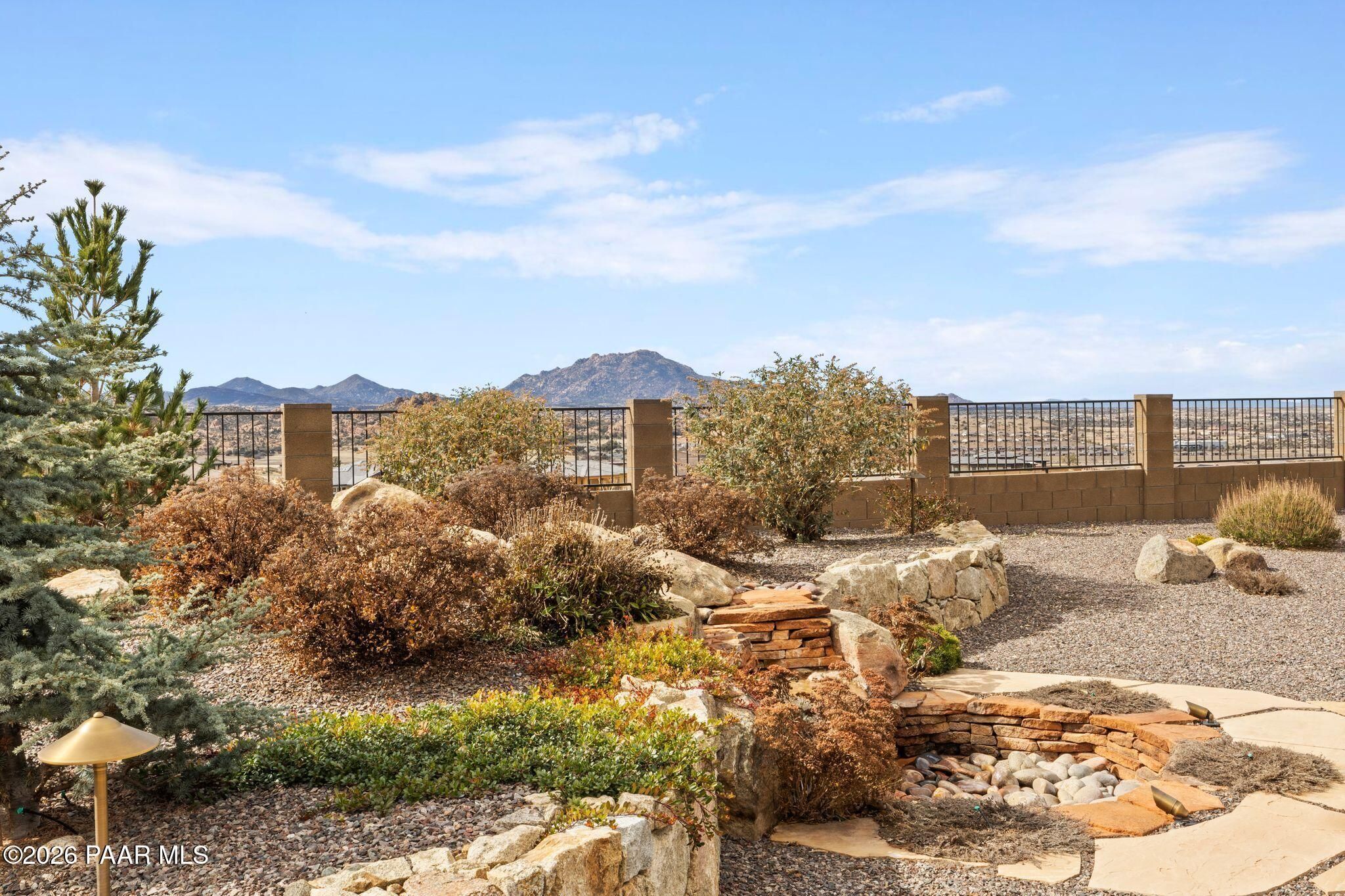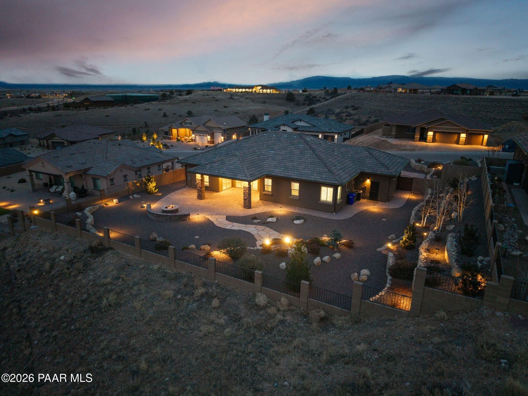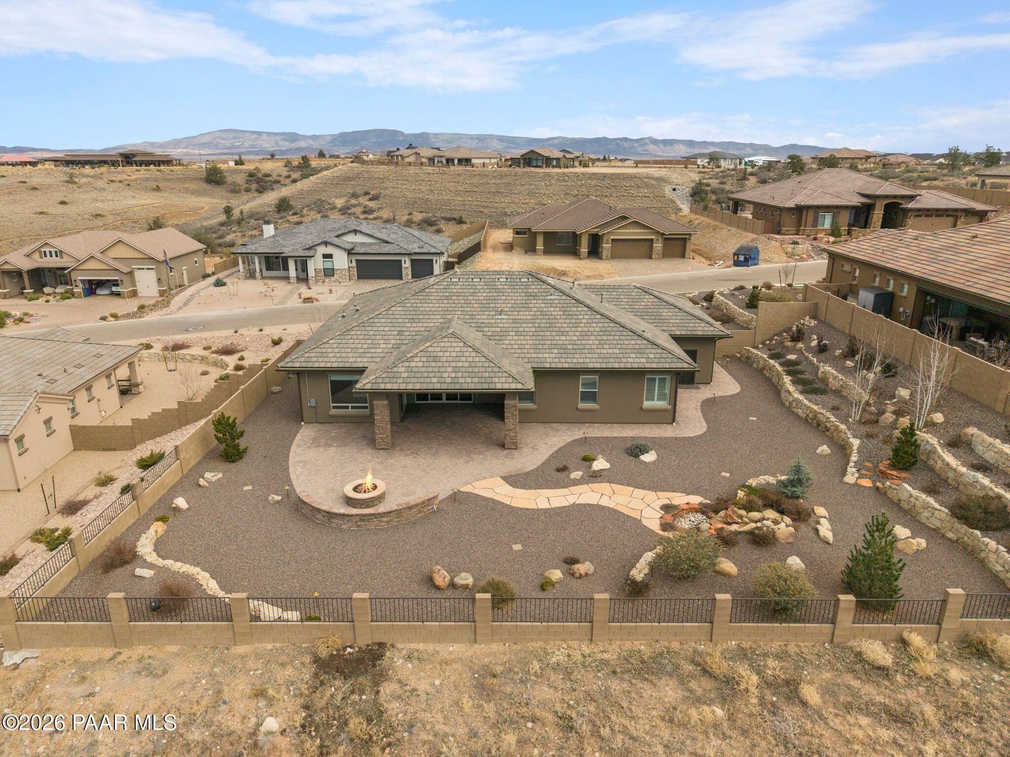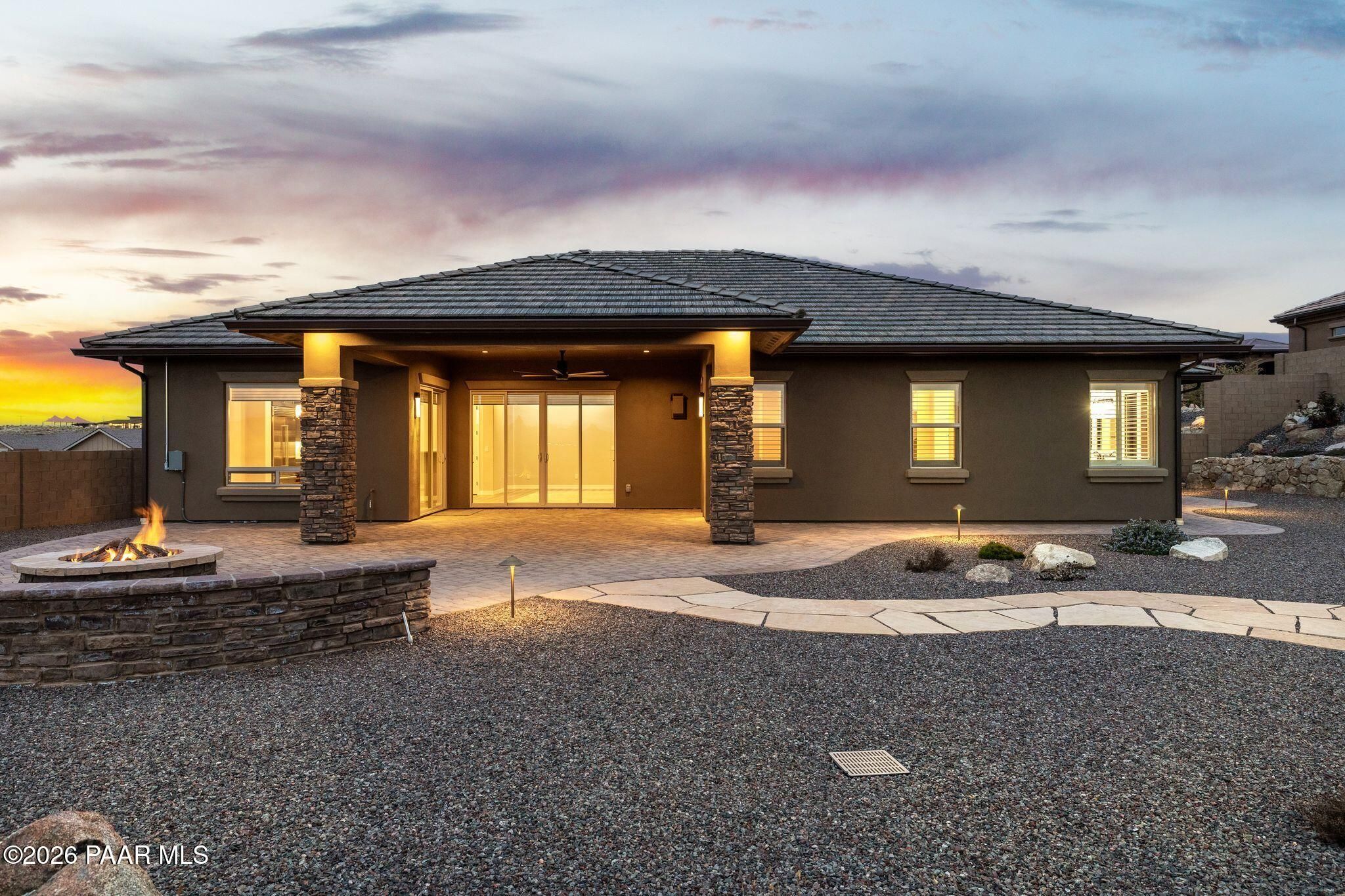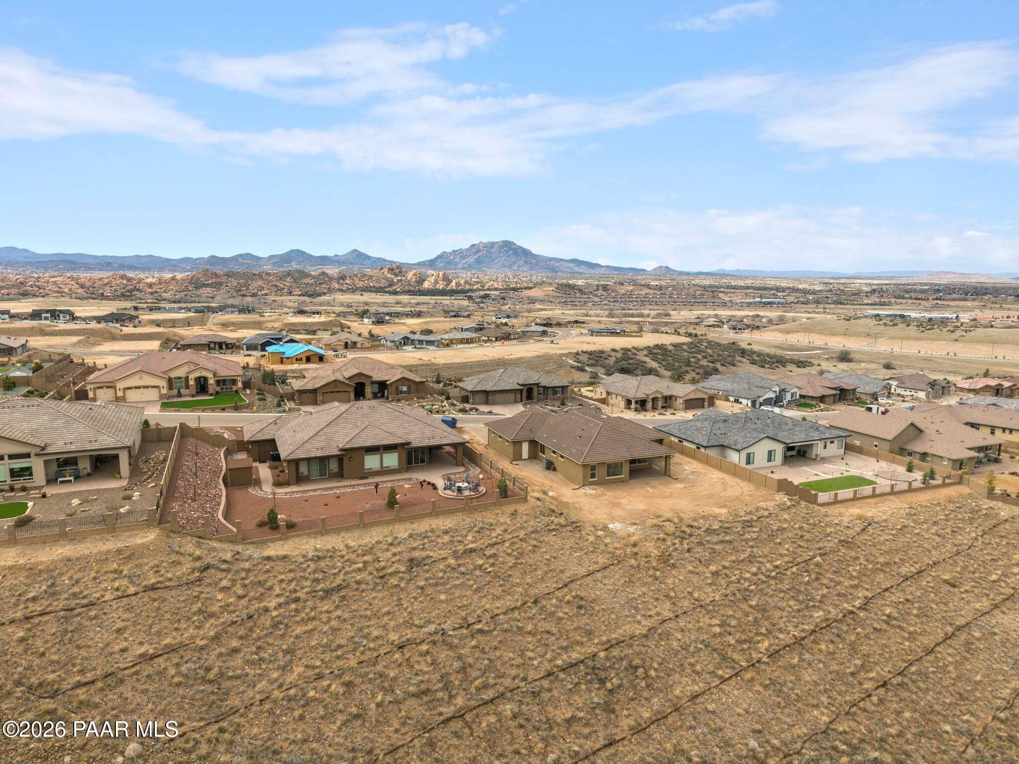 This executive residence at 5224 Dells Point Rd, built by Carrington Homes in the gated community Sunset Rdige in the Granite Dells Estates subdivision, offers a luxurious and custom living experience with breathtaking views of Granite Mountain and The Dells. Key Features Include:Exterior & Location: Superior full-exterior shear construction, premium landscaping with custom rock walls and a water feature, accent and landscape lighting, and an expansive covered outdoor patio with a Big Ass Ceiling Fan, a natural gas fire pit with a seat wall, and a hot tub pre-wire.Interior Luxury: A gourmet kitchen with Wolf, Sub-Zero, and Cove appliances, Quartz countertops, a walk-in pantry, and Kinetico RO drinking water. The flexible floor plan includes 2 bedrooms plus a den/potential third bedroom. High-end finishes include custom wood shutters, Hunter Douglas shades, custom Hubbardton Forge lighting, Monte Carlo Maverick ceiling fans, and a den with built-in cabinetry and a desk.Amenities: Includes all existing televisions, a Speed Queen washer and dryer, and a whole-house Kinetico Water Softener.Oversized Garage: A 3-car extended, fully insulated garage with epoxy flooring, upgraded insulated doors and openers, a central vacuum, utility sink, custom workbench/cabinetry, EV pre-wire, and a built-in sound system.
