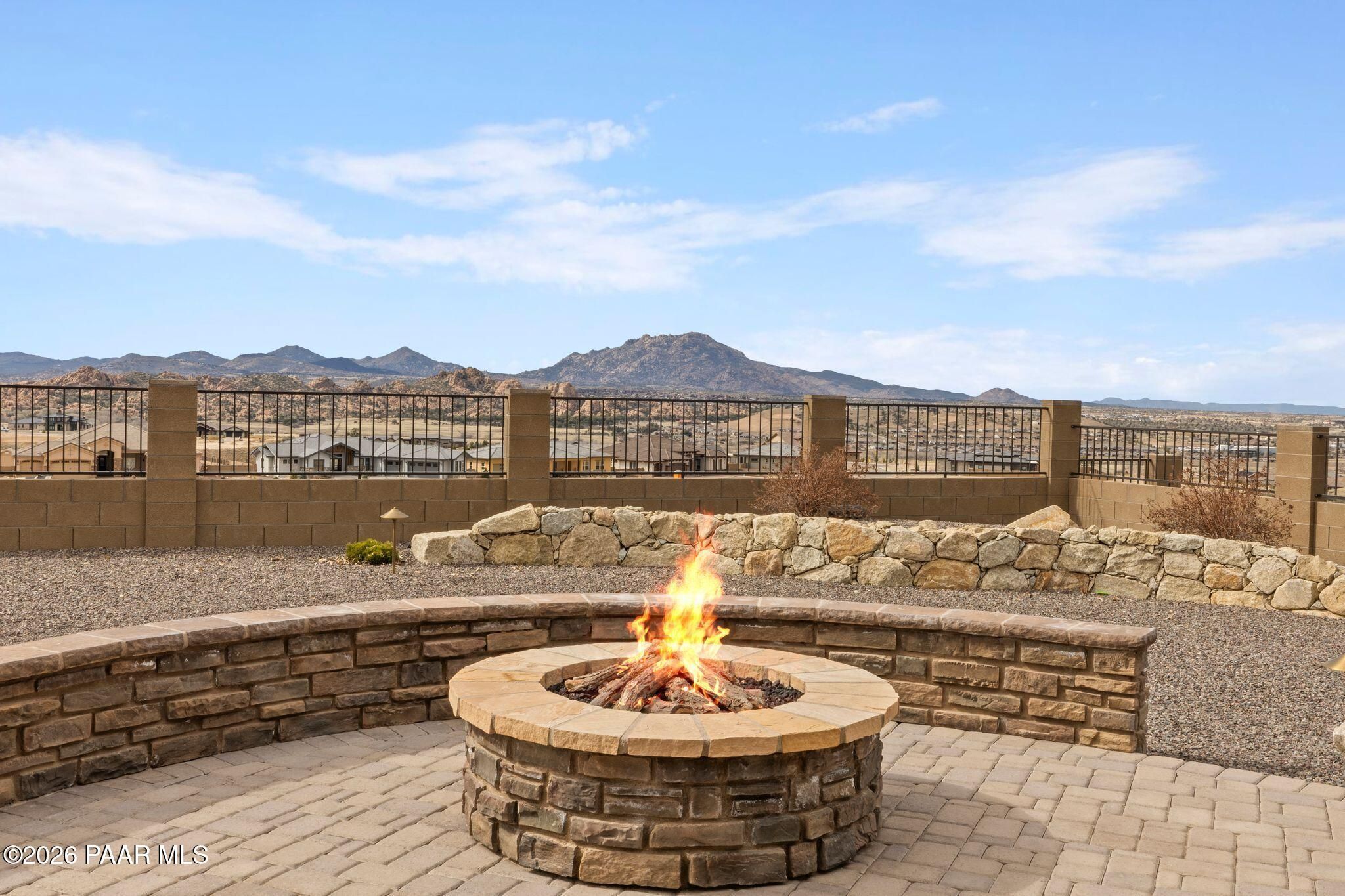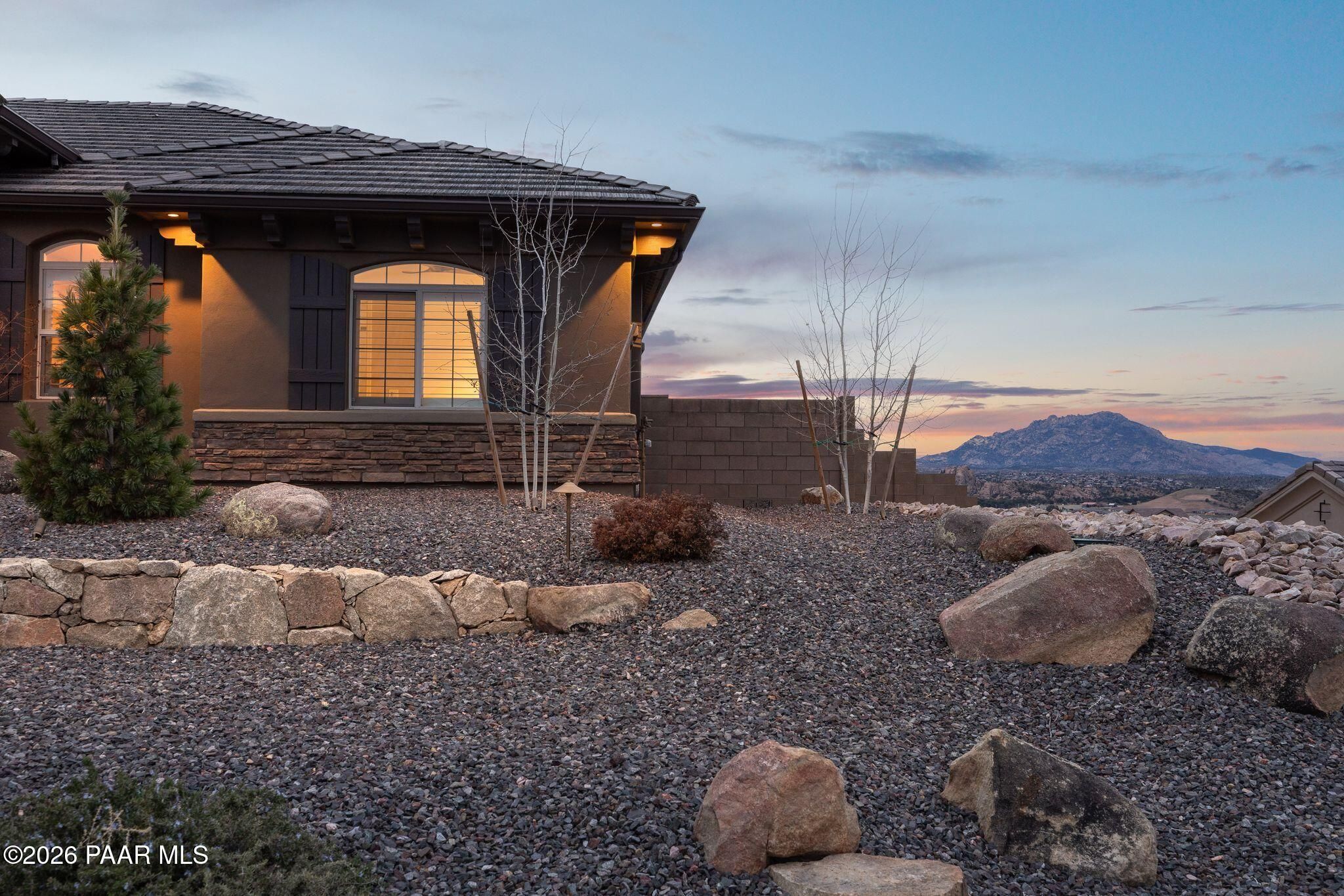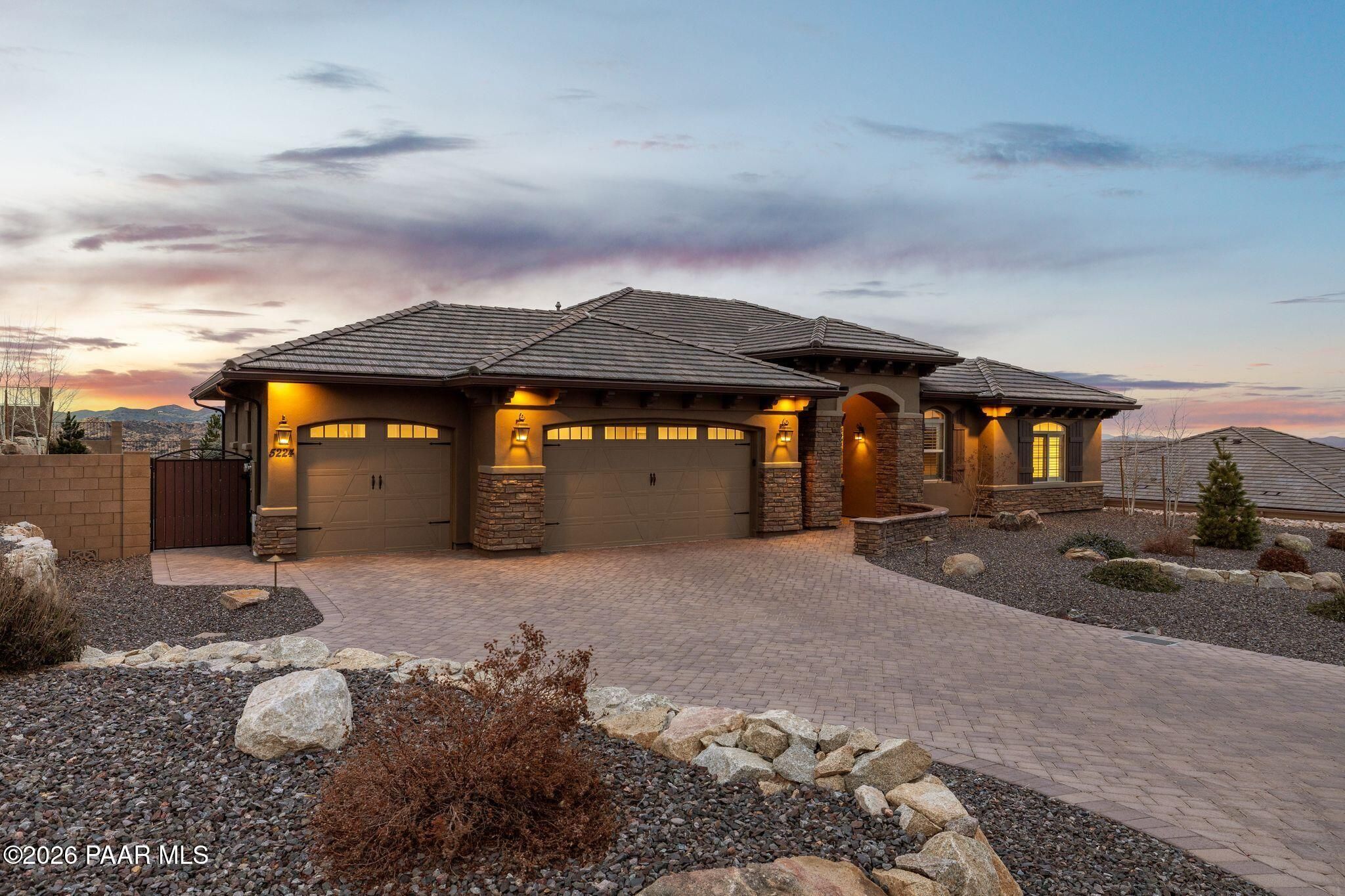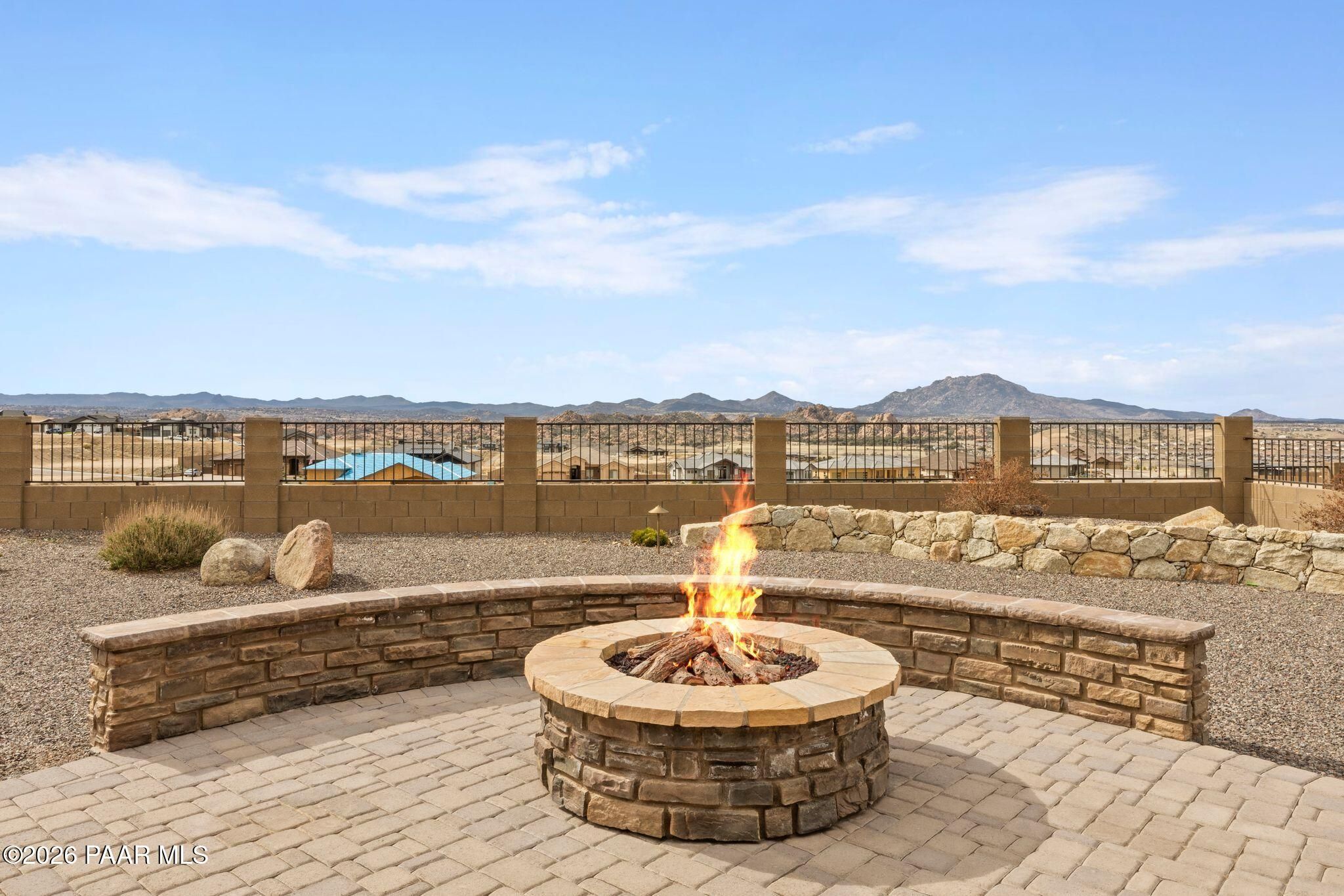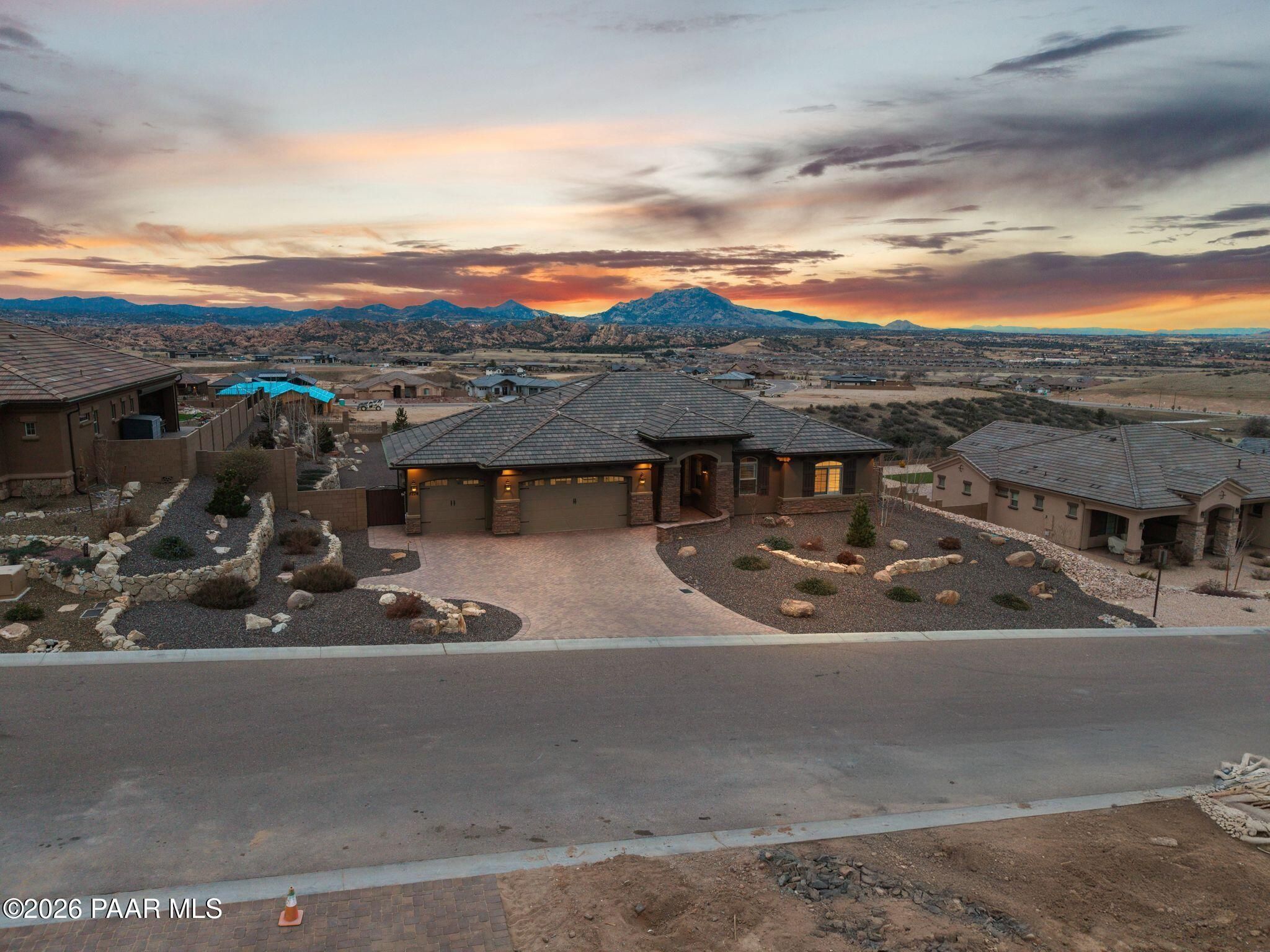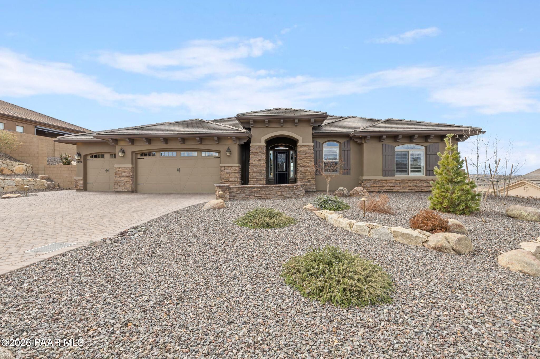 This executive residence at 5224 Dells Point Rd, built by Carrington Homes in the gated community Sunset Rdige in the Granite Dells Estates subdivision, offers a luxurious and custom living experience with breathtaking views of Granite Mountain and The Dells. Key Features Include:Exterior & Location: Superior full-exterior shear construction, premium landscaping with custom rock walls and a water feature, accent and landscape lighting, and an expansive covered outdoor patio with a Big Ass Ceiling Fan, a natural gas fire pit with a seat wall, and a hot tub pre-wire.Interior Luxury: A gourmet kitchen with Wolf, Sub-Zero, and Cove appliances, Quartz countertops, a walk-in pantry, and Kinetico RO drinking water. The flexible floor plan includes 2 bedrooms plus a den/potential third bedroom. High-end finishes include custom wood shutters, Hunter Douglas shades, custom Hubbardton Forge lighting, Monte Carlo Maverick ceiling fans, and a den with built-in cabinetry and a desk.Amenities: Includes all existing televisions, a Speed Queen washer and dryer, and a whole-house Kinetico Water Softener.Oversized Garage: A 3-car extended, fully insulated garage with epoxy flooring, upgraded insulated doors and openers, a central vacuum, utility sink, custom workbench/cabinetry, EV pre-wire, and a built-in sound system.