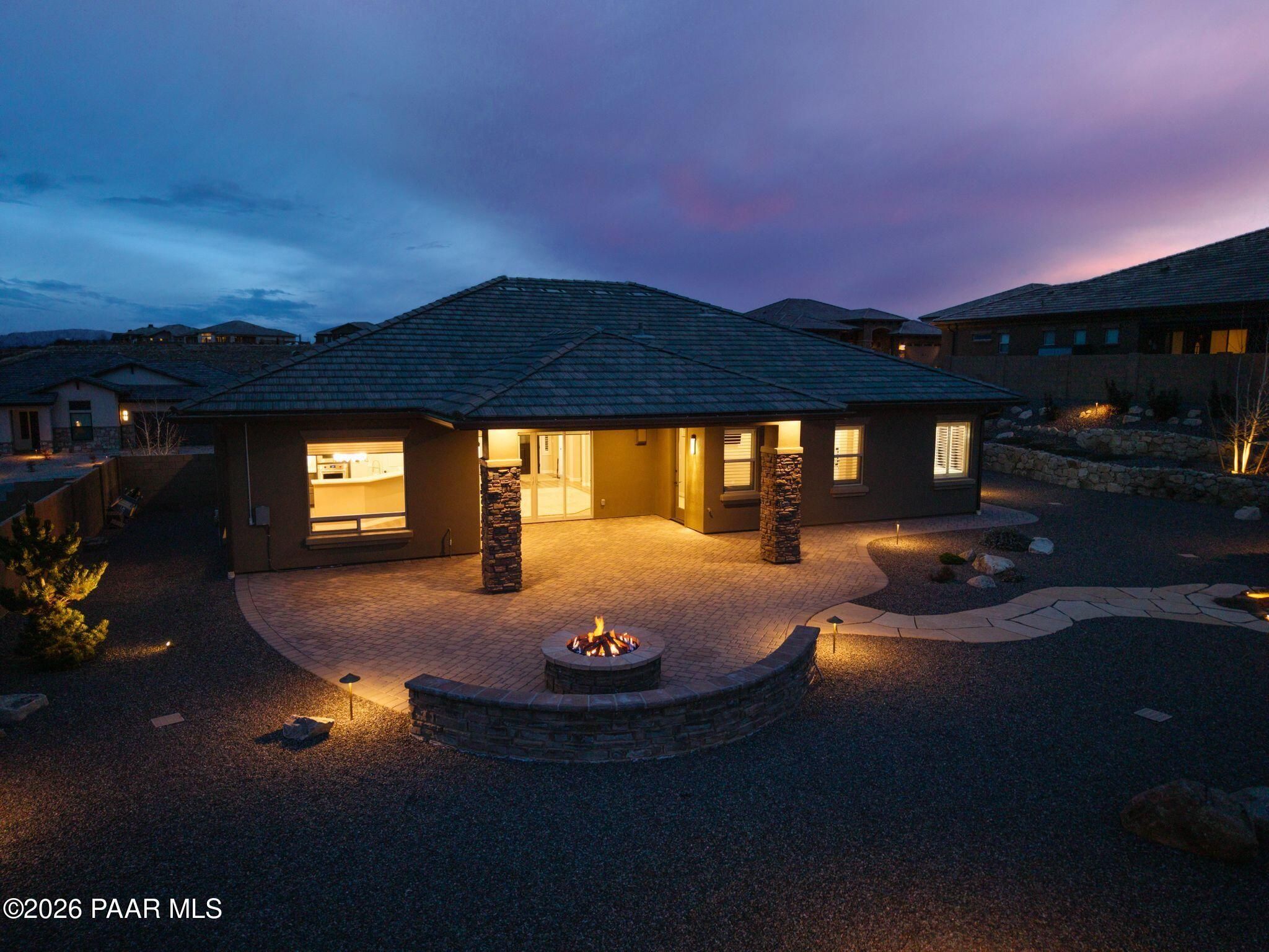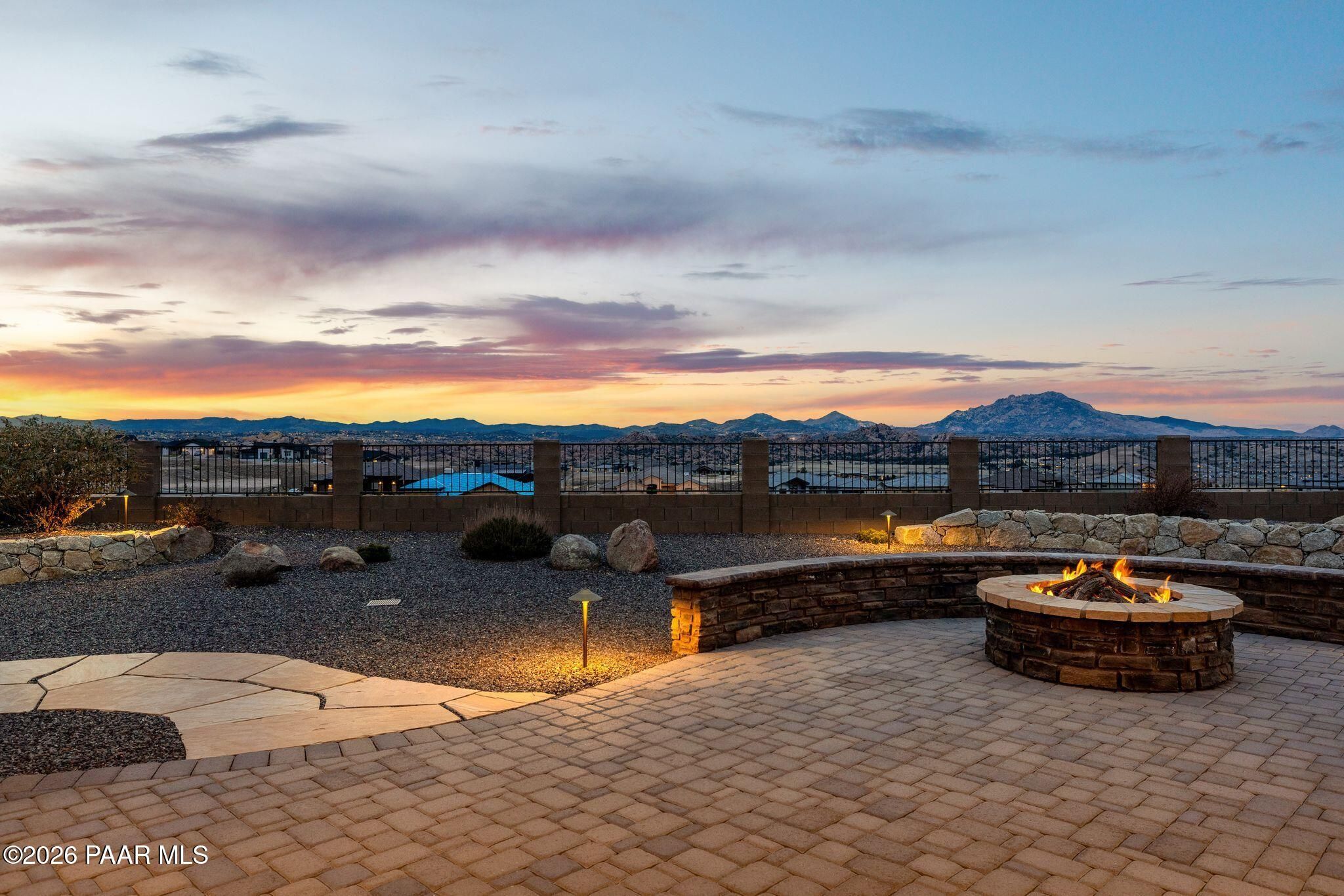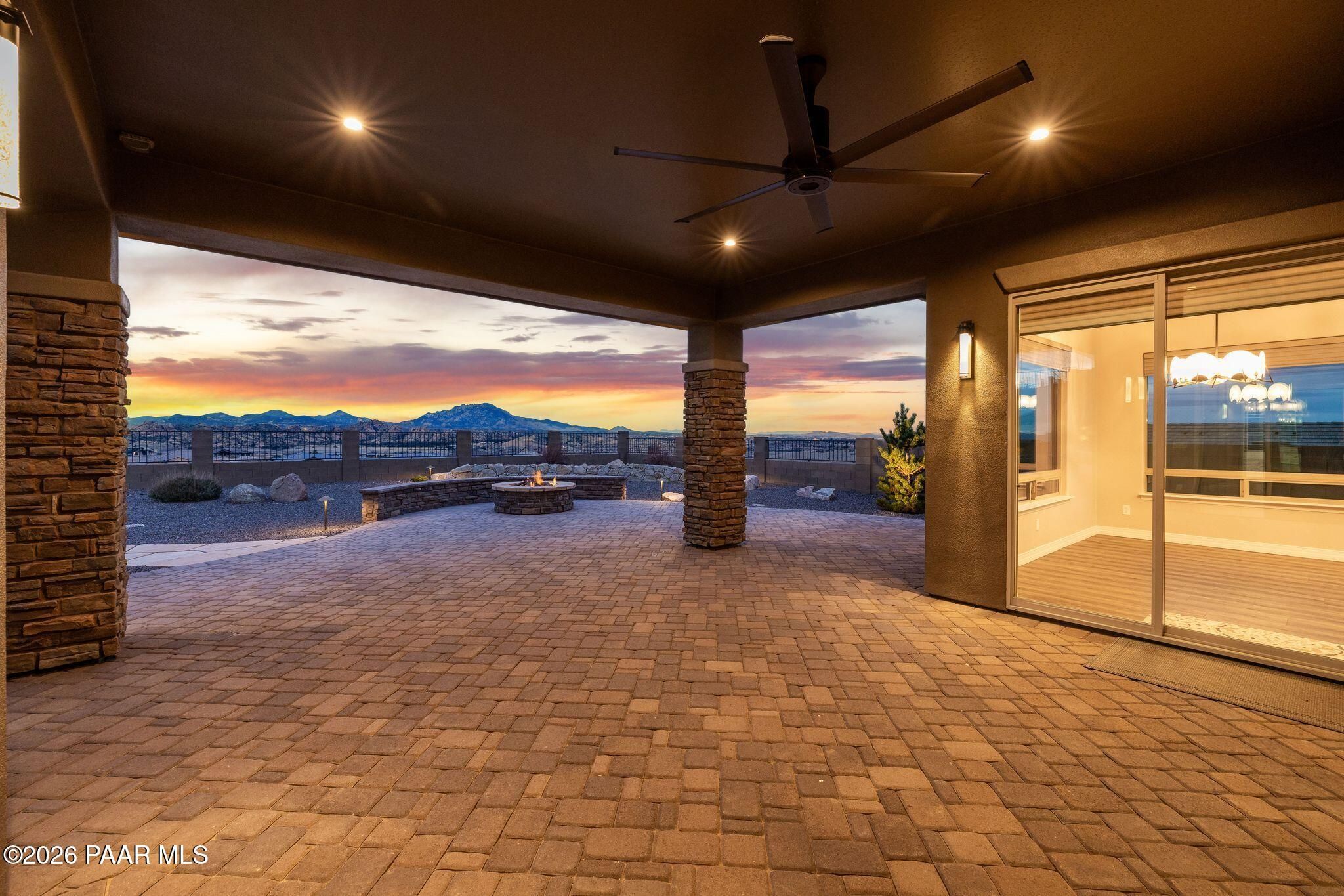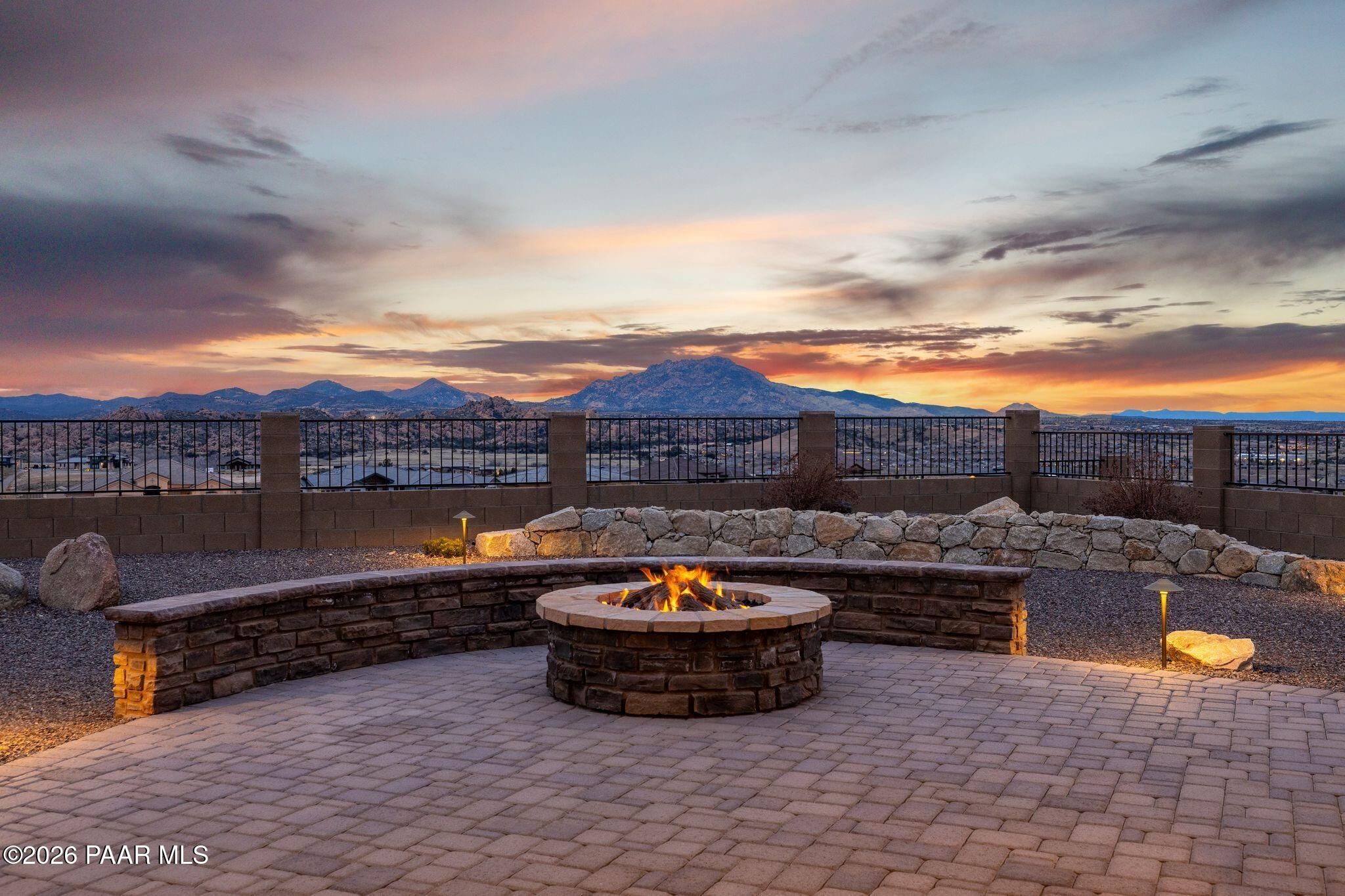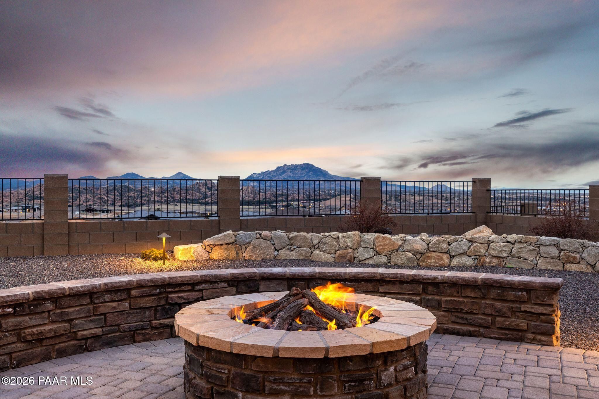 This executive residence at 5224 Dells Point Rd, built by Carrington Homes in the gated community Sunset Rdige in the Granite Dells Estates subdivision, offers a luxurious and custom living experience with breathtaking views of Granite Mountain and The Dells. Key Features Include:Exterior & Location: Superior full-exterior shear construction, premium landscaping with custom rock walls and a water feature, accent and landscape lighting, and an expansive covered outdoor patio with a Big Ass Ceiling Fan, a natural gas fire pit with a seat wall, and a hot tub pre-wire.Interior Luxury: A gourmet kitchen with Wolf, Sub-Zero, and Cove appliances, Quartz countertops, a walk-in pantry, and Kinetico RO drinking water. The flexible floor plan includes 2 bedrooms plus a den/potential third bedroom. High-end finishes include custom wood shutters, Hunter Douglas shades, custom Hubbardton Forge lighting, Monte Carlo Maverick ceiling fans, and a den with built-in cabinetry and a desk.Amenities: Includes all existing televisions, a Speed Queen washer and dryer, and a whole-house Kinetico Water Softener.Oversized Garage: A 3-car extended, fully insulated garage with epoxy flooring, upgraded insulated doors and openers, a central vacuum, utility sink, custom workbench/cabinetry, EV pre-wire, and a built-in sound system.
