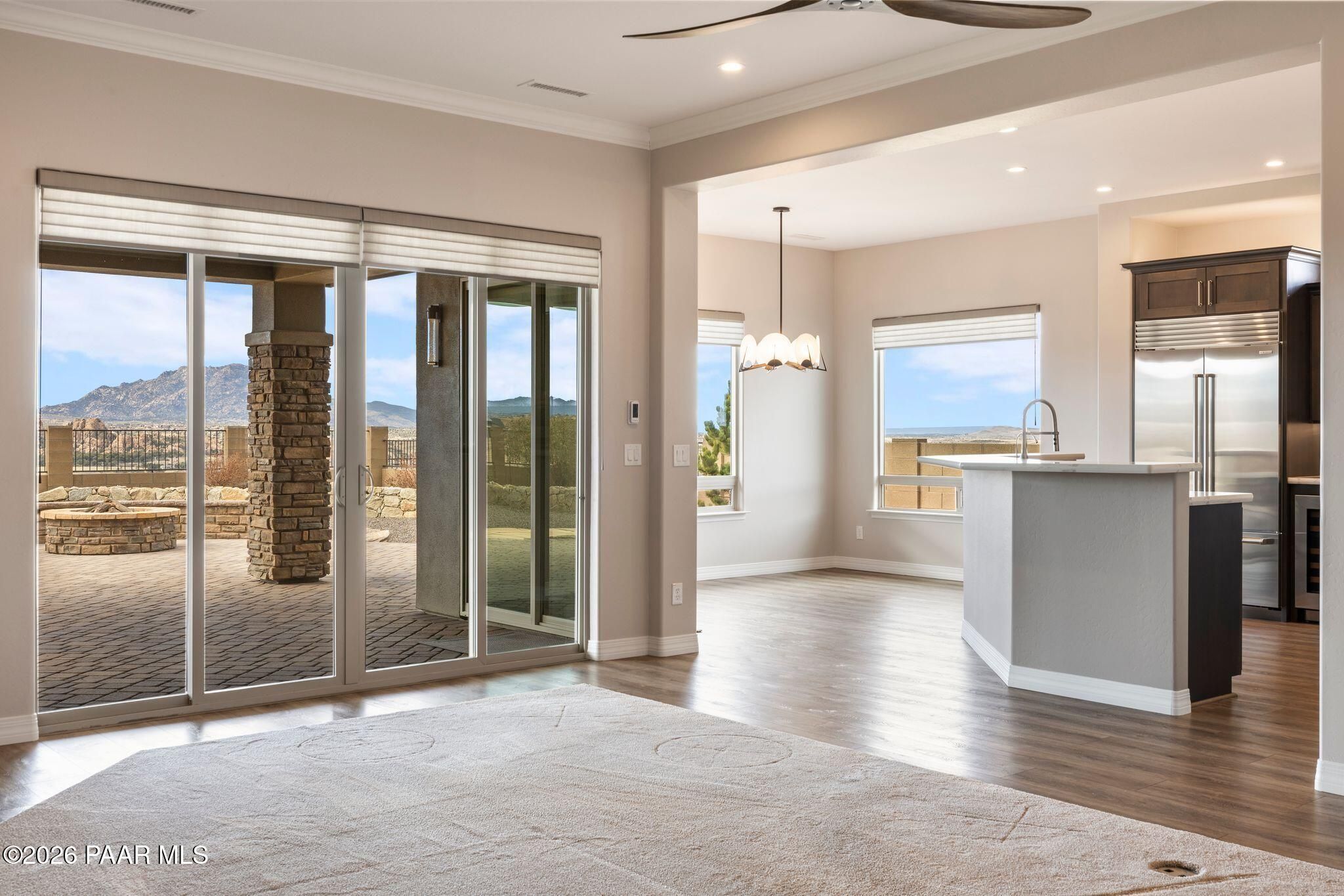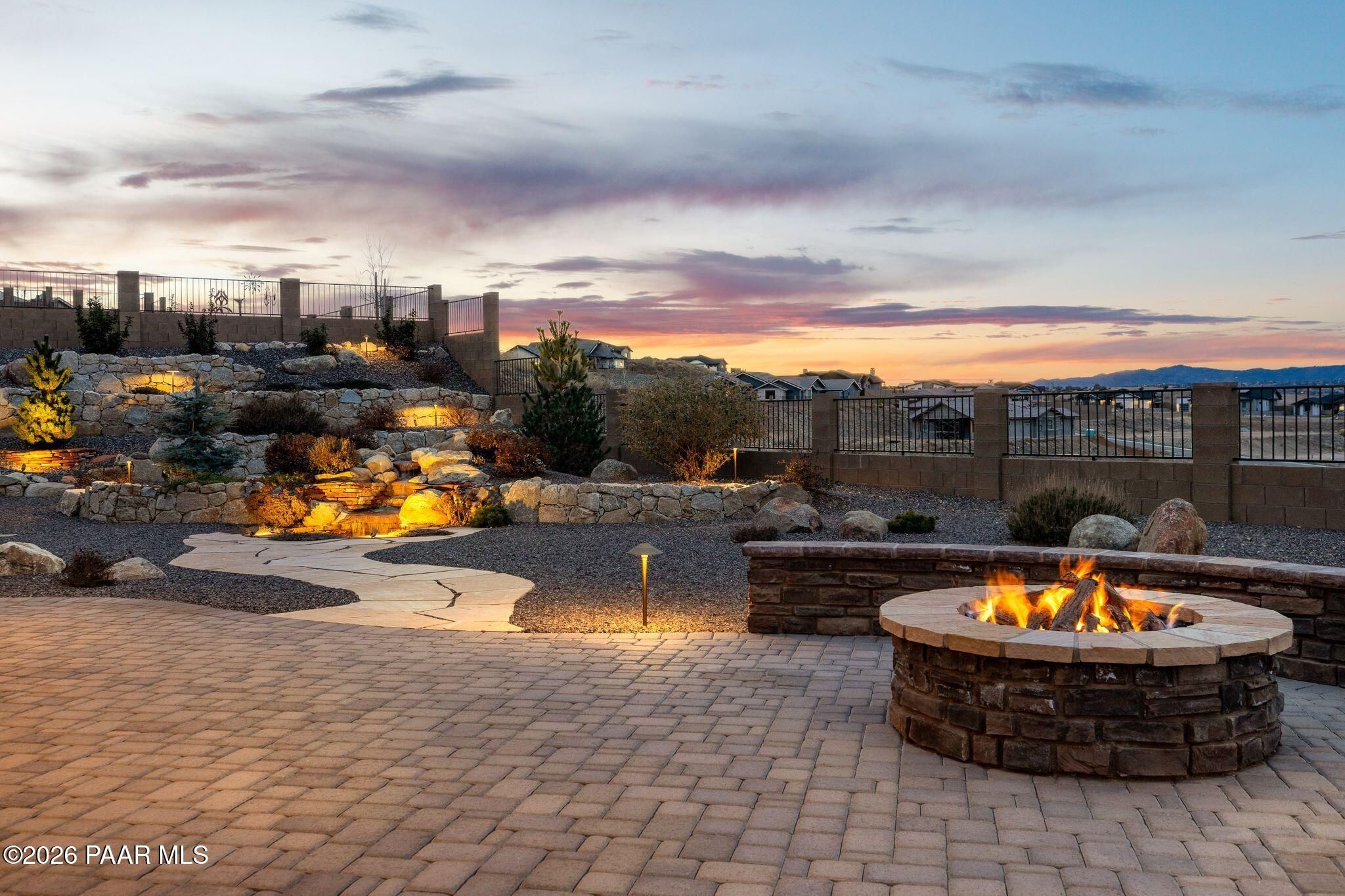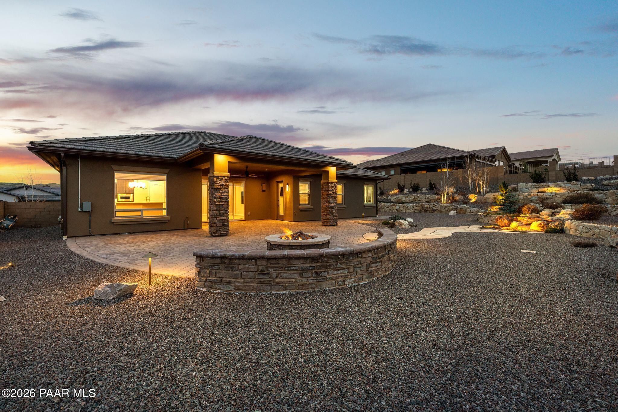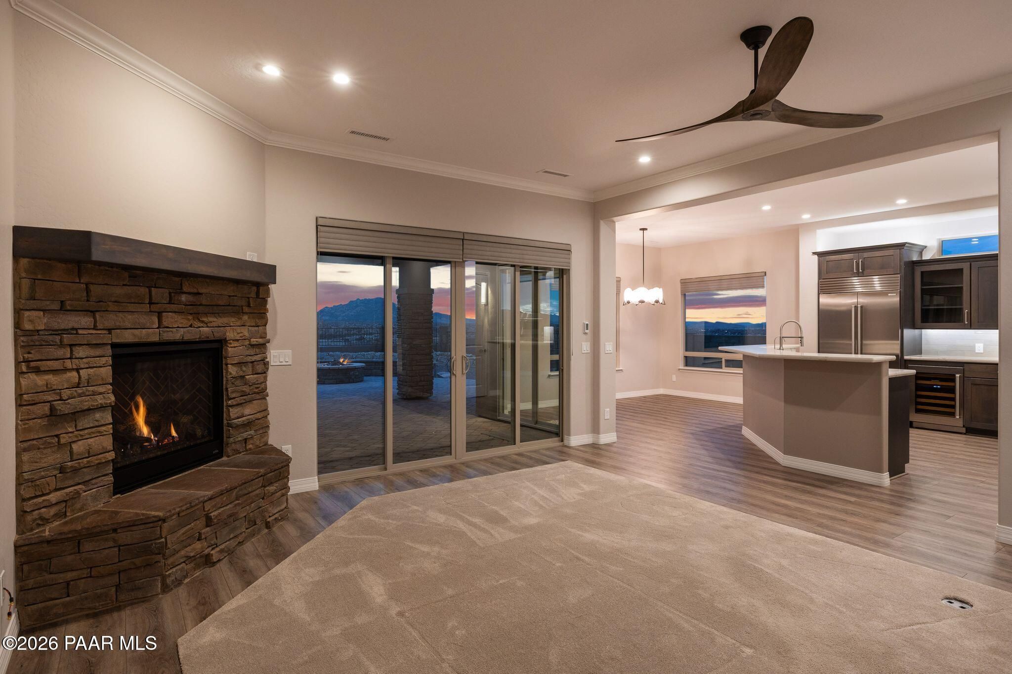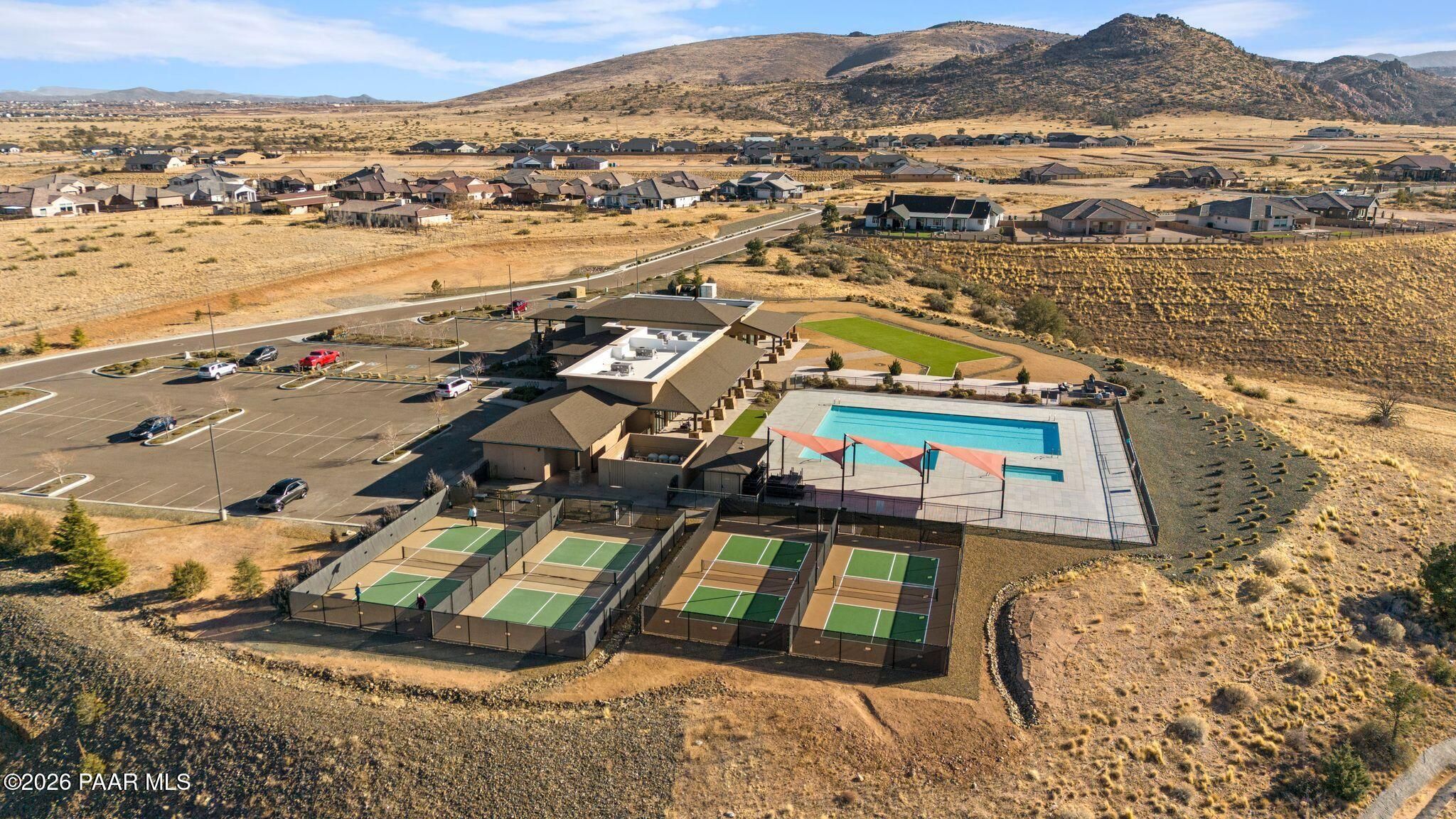 This executive residence at 5224 Dells Point Rd, built by Carrington Homes in the gated community Sunset Rdige in the Granite Dells Estates subdivision, offers a luxurious and custom living experience with breathtaking views of Granite Mountain and The Dells. Key Features Include:Exterior & Location: Superior full-exterior shear construction, premium landscaping with custom rock walls and a water feature, accent and landscape lighting, and an expansive covered outdoor patio with a Big Ass Ceiling Fan, a natural gas fire pit with a seat wall, and a hot tub pre-wire.Interior Luxury: A gourmet kitchen with Wolf, Sub-Zero, and Cove appliances, Quartz countertops, a walk-in pantry, and Kinetico RO drinking water. The flexible floor plan includes 2 bedrooms plus a den/potential third bedroom. High-end finishes include custom wood shutters, Hunter Douglas shades, custom Hubbardton Forge lighting, Monte Carlo Maverick ceiling fans, and a den with built-in cabinetry and a desk.Amenities: Includes all existing televisions, a Speed Queen washer and dryer, and a whole-house Kinetico Water Softener.Oversized Garage: A 3-car extended, fully insulated garage with epoxy flooring, upgraded insulated doors and openers, a central vacuum, utility sink, custom workbench/cabinetry, EV pre-wire, and a built-in sound system.