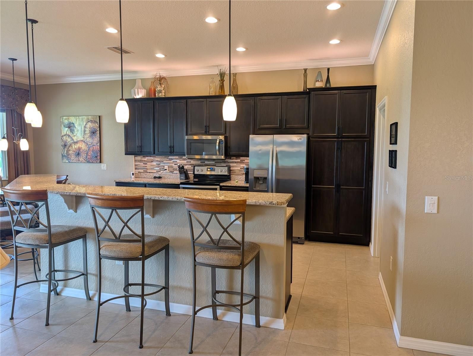 This FULLY FURNISHED, turnkey Lake Ashton retreat offers a seamless blend of comfort, elegance, and resort-style living. From the moment you walk in, the open-concept Sebastian model welcomes you with soaring ceilings, crown molding, and tile flooring that flows effortlessly through the main living areas. The split floorplan ensures privacy and functionality, with each room thoughtfully equipped and beautifully styled. The living room is anchored by a stunning wood entertainment center with glass display. Plush leather recliners invite you to relax in style, while recessed lighting and neutral tones create a warm, inviting ambiance. The gourmet kitchen is a chef’s dream, featuring Whirlpool stainless steel appliances, 42" wood cabinetry with crown molding, granite countertops, a stylish backsplash, under-cabinet lighting, pendant fixtures, and a wraparound breakfast bar perfect for casual dining or entertaining. The primary suite is a luxurious retreat with a walk-in closet, dual granite vanities, and a walk-in shower with a corner seat. Second guest bedroom includes an electric medical bed for added comfort, and a built-in desk provides a dedicated office space ideal for remote work or personal projects. Triple sliders lead to an extended screened veranda overlooking the 17th hole of the West Course and a tranquil pond, offering year-round views and a serene setting for morning coffee or evening gatherings. This home comes complete with a fully equipped kitchen, stylish furnishings, washer and dryer, and even includes a golf cart housed in its own dedicated garage, along with a bike for leisurely rides around the community. The main garage features extra shelving and a motorized screen for added convenience. Every detail has been considered to make your move effortless. Just unpack and begin living the Lake Ashton lifestyle. Two gated entrances with 24/7 guard service and access to two clubhouses. A grand ballroom, movie theater, bowling lanes, and on-site dining at Charm City and Eagle Nest. Stay active with amenities: including indoor and outdoor pools, fitness centers, racquetball, tennis, pickleball, bocce, shuffleboard, and more.