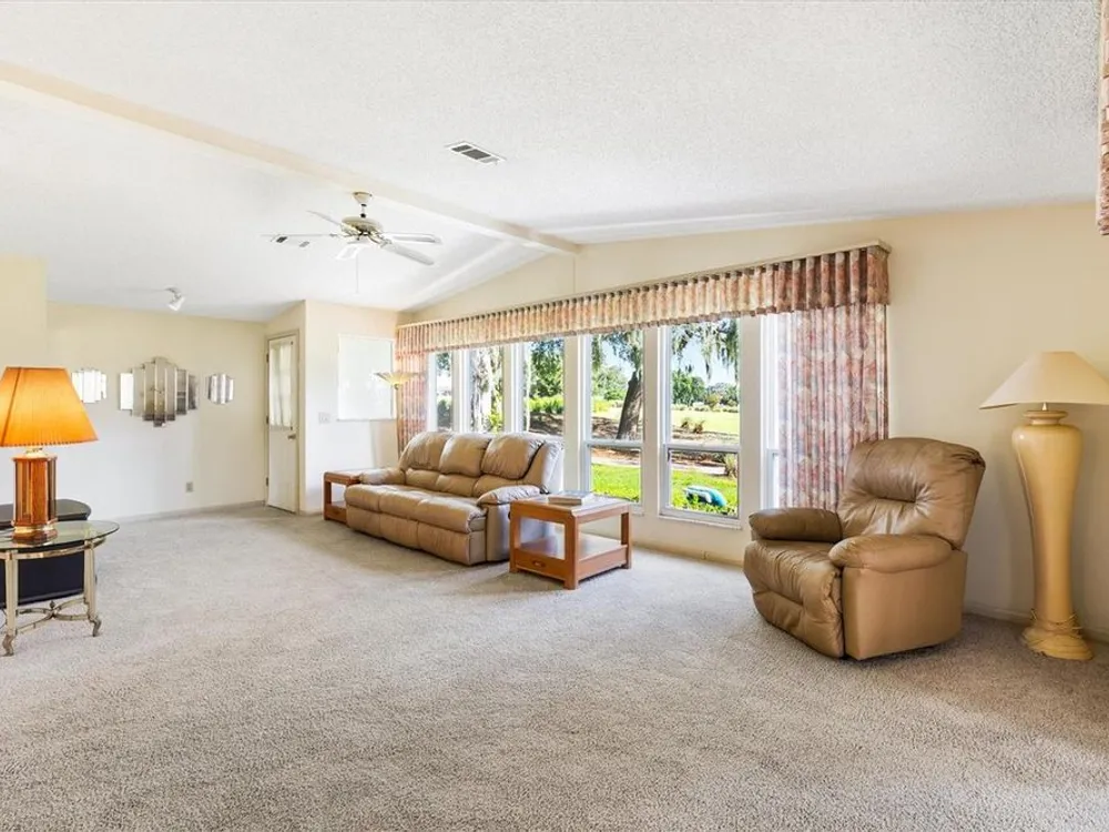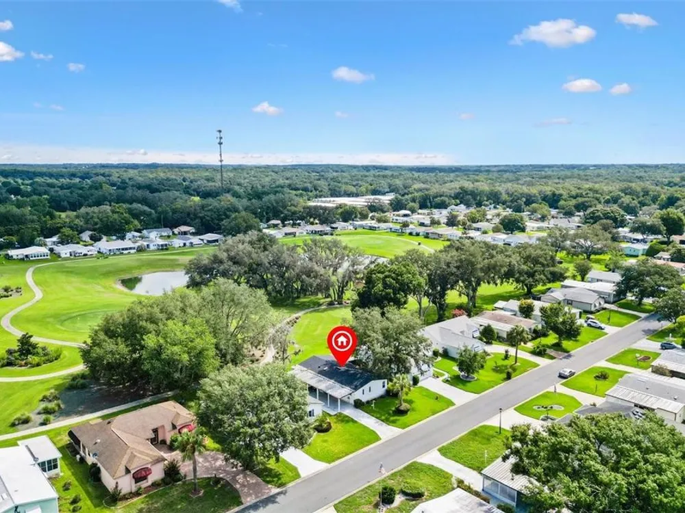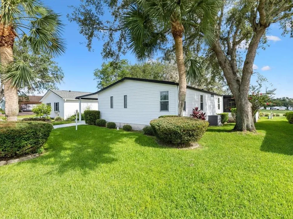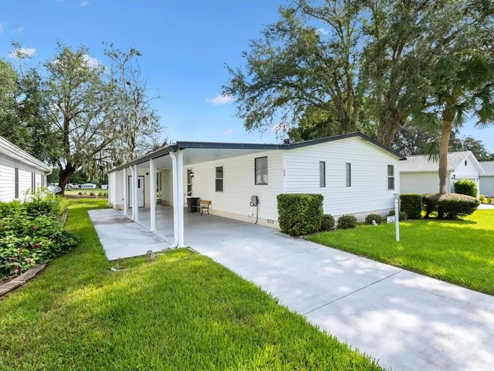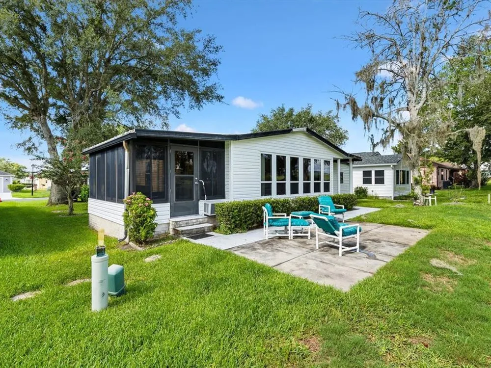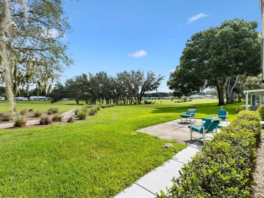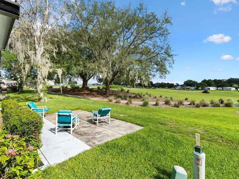 ON GOLF COURSE 2/2 Manufactured Home 4th Hole Silver Springs Golf Course. ROOF 2021 HVAC 2018 NO BOND! Stunning fairway views from the comfort of your living room. Enjoy natural light and picturesque scenery through the large windows or relax in the enclosed lanai accessed by sliding glass doors—perfect for year-round comfort. Step outside to the back outdoor patio, soak in the tranquil setting and watch the golfers. Inside, you'll find a spacious living and dining area featuring a built-in bar and cabinets, as well as an entry coat closet for added convenience. The eat-in kitchen is both functional and charming, with a pantry closet, built-in desk with extra storage, a skylight, and built in seating area. The primary suite features a walk-in closet and an updated ensuite bathroom with a glass-door shower, single vanity (with space to convert to dual), and an additional large closet. The guest bath with has a tub/shower combo with glass doors. Additional highlights include: Ceiling fans and blinds throughout, Partially furnished for easy move-in, Mirrored closets for added brightness. Utility room with washer, dryer, utility sink, and shelving. Whether you're looking for a seasonal escape or full-time residence, this home offers comfort, storage, and unbeatable golf course views. Just a short golf cart ride to the Silver Lake Community Pool and Hot Tub and less than 2 miles to Spanish Springs Town Square for entertainment, dining and shopping. This location can’t be beat. Make this home your own and start living the Villages dream. View our video and make your appointment to see this home today!