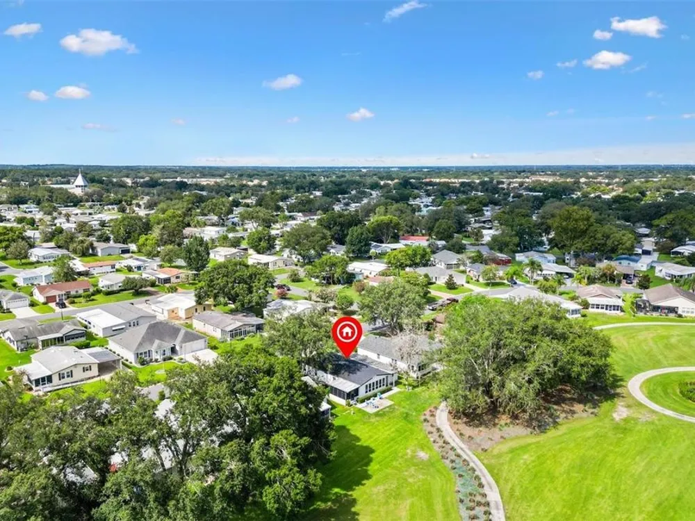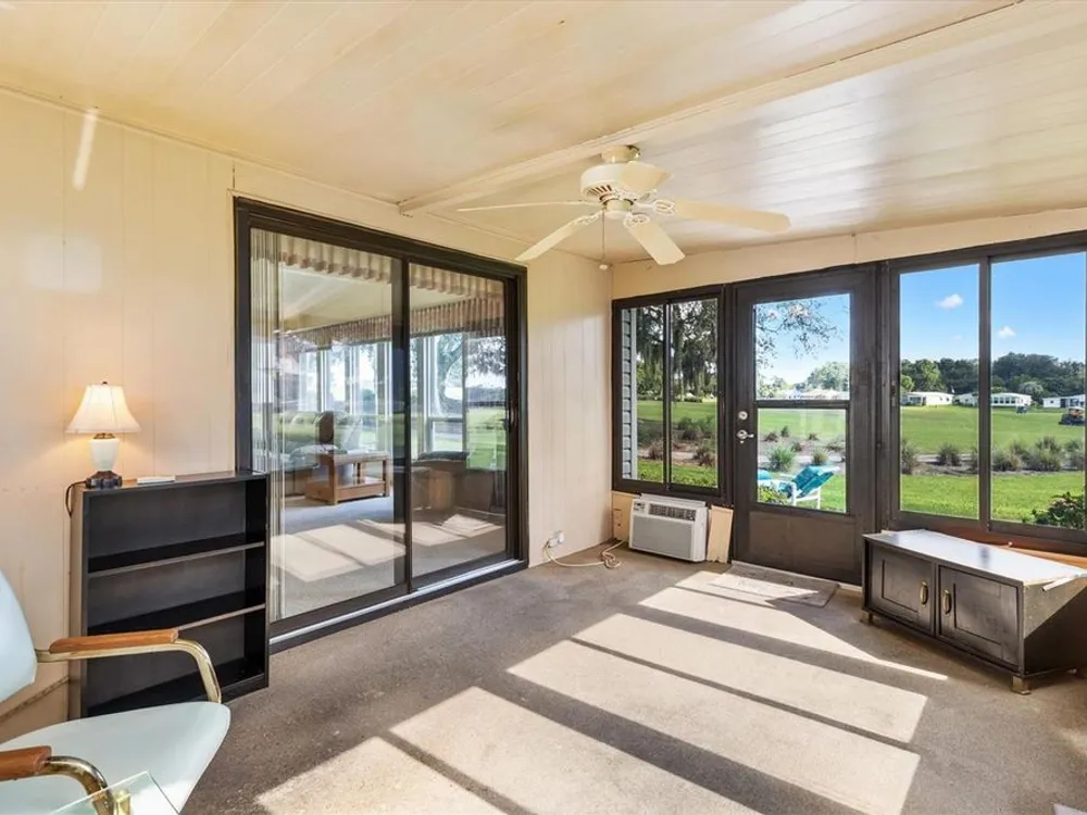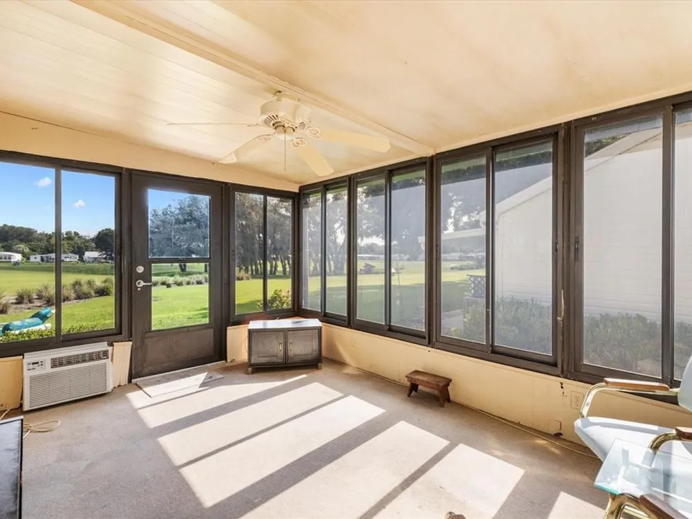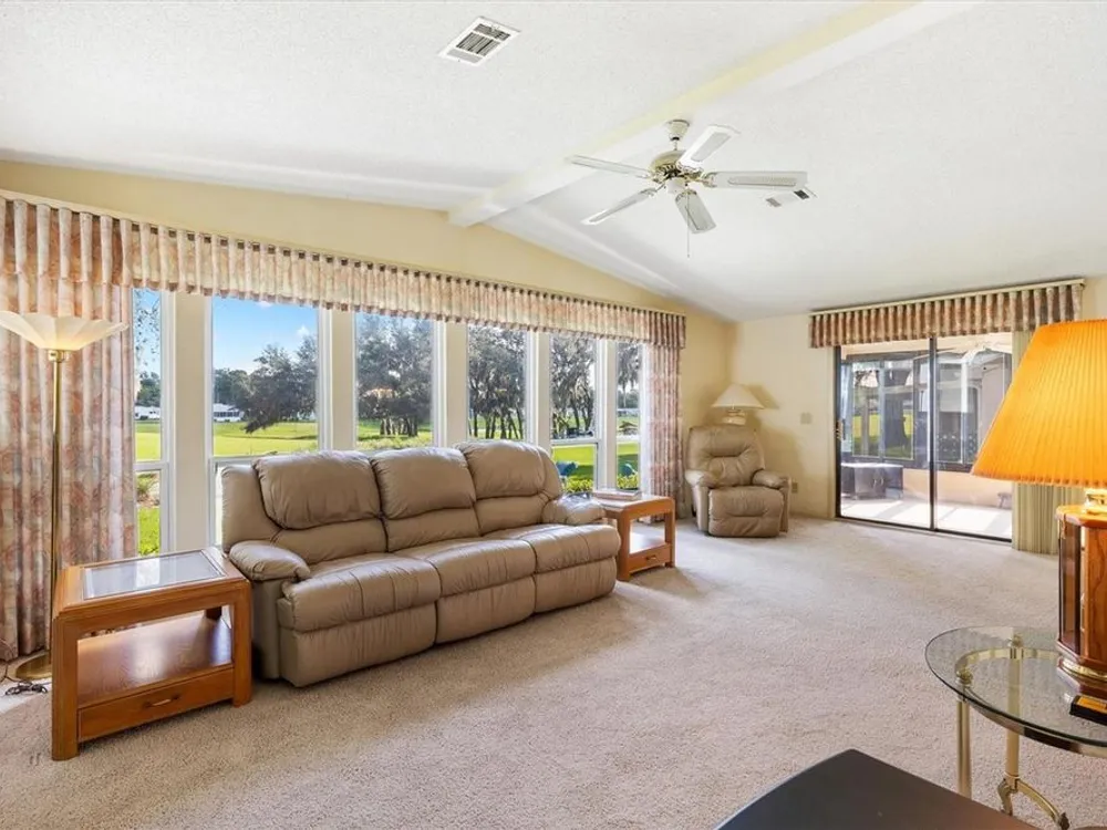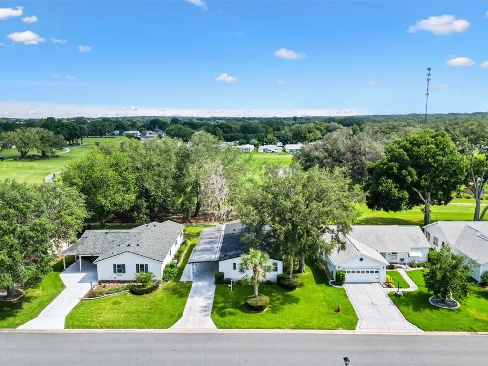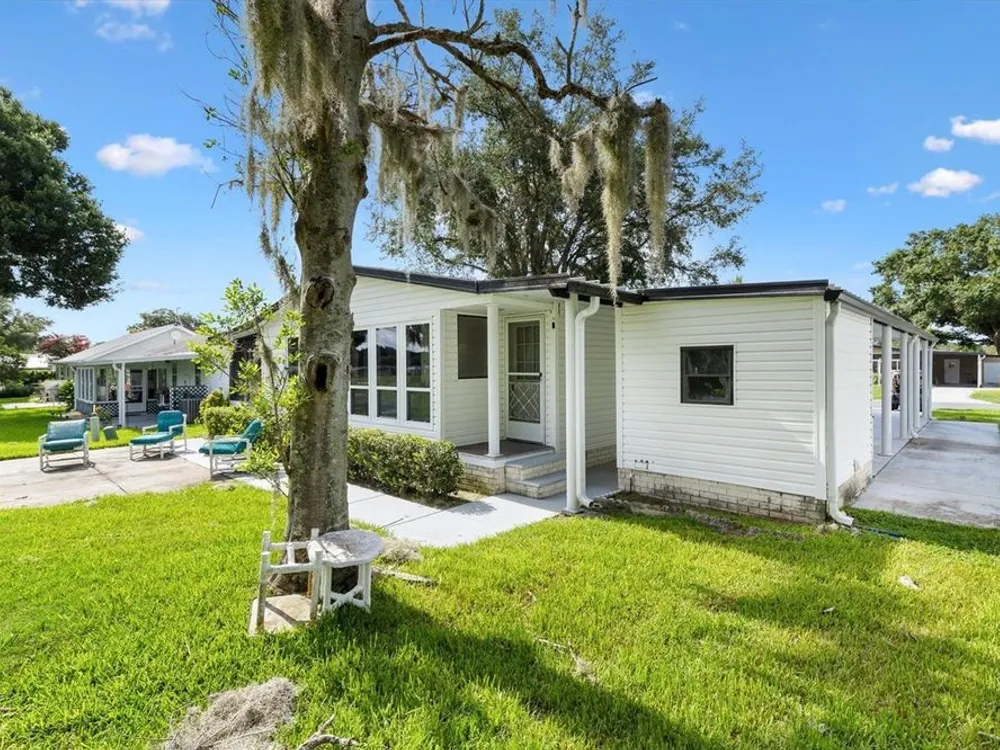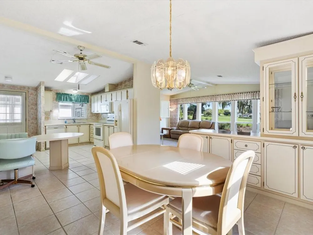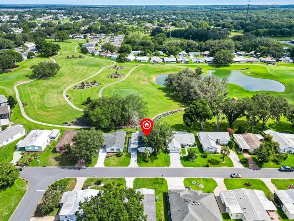 ON GOLF COURSE 2/2 Manufactured Home 4th Hole Silver Springs Golf Course. ROOF 2021 HVAC 2018 NO BOND! Stunning fairway views from the comfort of your living room. Enjoy natural light and picturesque scenery through the large windows or relax in the enclosed lanai accessed by sliding glass doors—perfect for year-round comfort. Step outside to the back outdoor patio, soak in the tranquil setting and watch the golfers. Inside, you'll find a spacious living and dining area featuring a built-in bar and cabinets, as well as an entry coat closet for added convenience. The eat-in kitchen is both functional and charming, with a pantry closet, built-in desk with extra storage, a skylight, and built in seating area. The primary suite features a walk-in closet and an updated ensuite bathroom with a glass-door shower, single vanity (with space to convert to dual), and an additional large closet. The guest bath with has a tub/shower combo with glass doors. Additional highlights include: Ceiling fans and blinds throughout, Partially furnished for easy move-in, Mirrored closets for added brightness. Utility room with washer, dryer, utility sink, and shelving. Whether you're looking for a seasonal escape or full-time residence, this home offers comfort, storage, and unbeatable golf course views. Just a short golf cart ride to the Silver Lake Community Pool and Hot Tub and less than 2 miles to Spanish Springs Town Square for entertainment, dining and shopping. This location can’t be beat. Make this home your own and start living the Villages dream. View our video and make your appointment to see this home today!