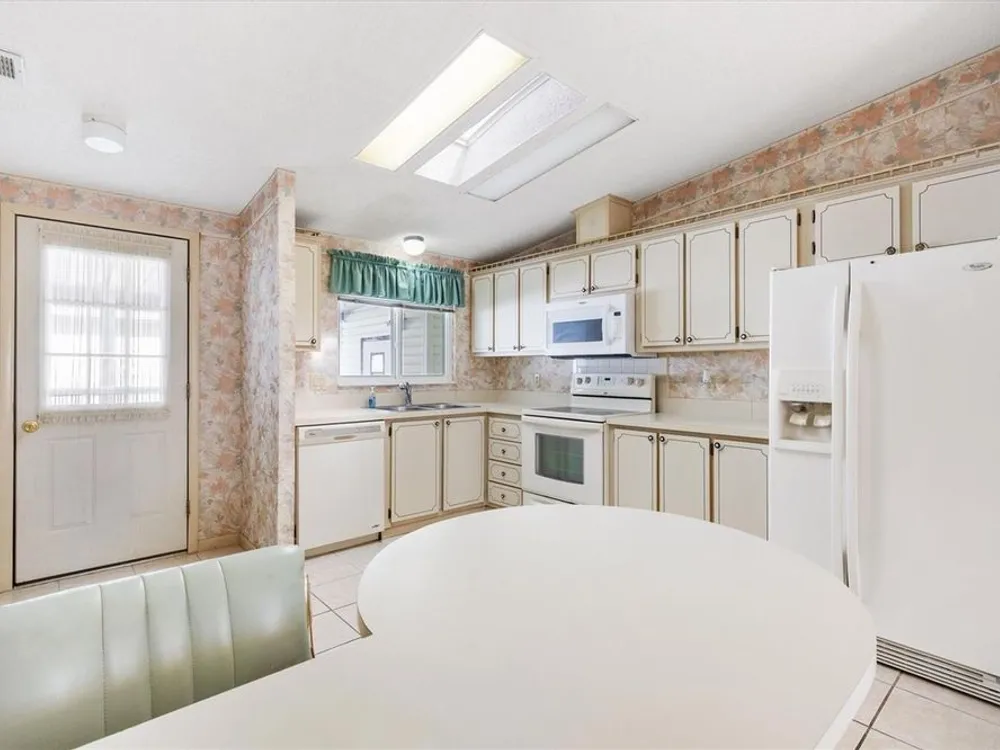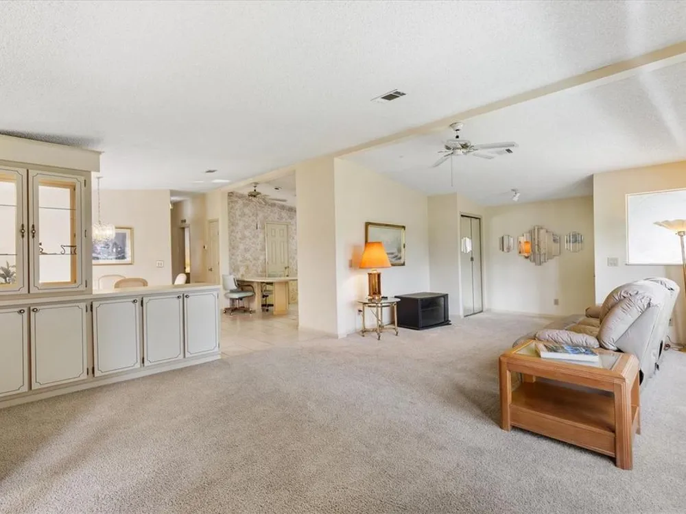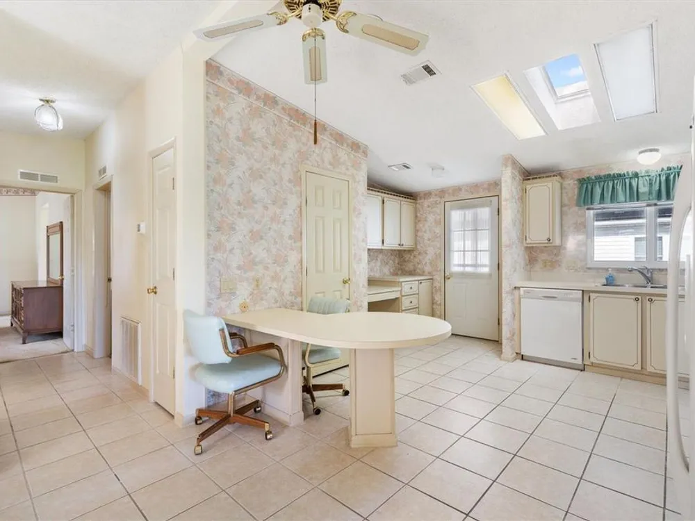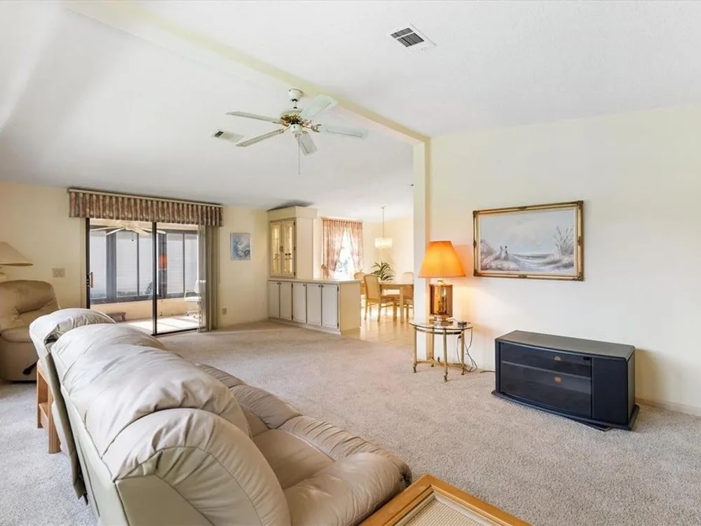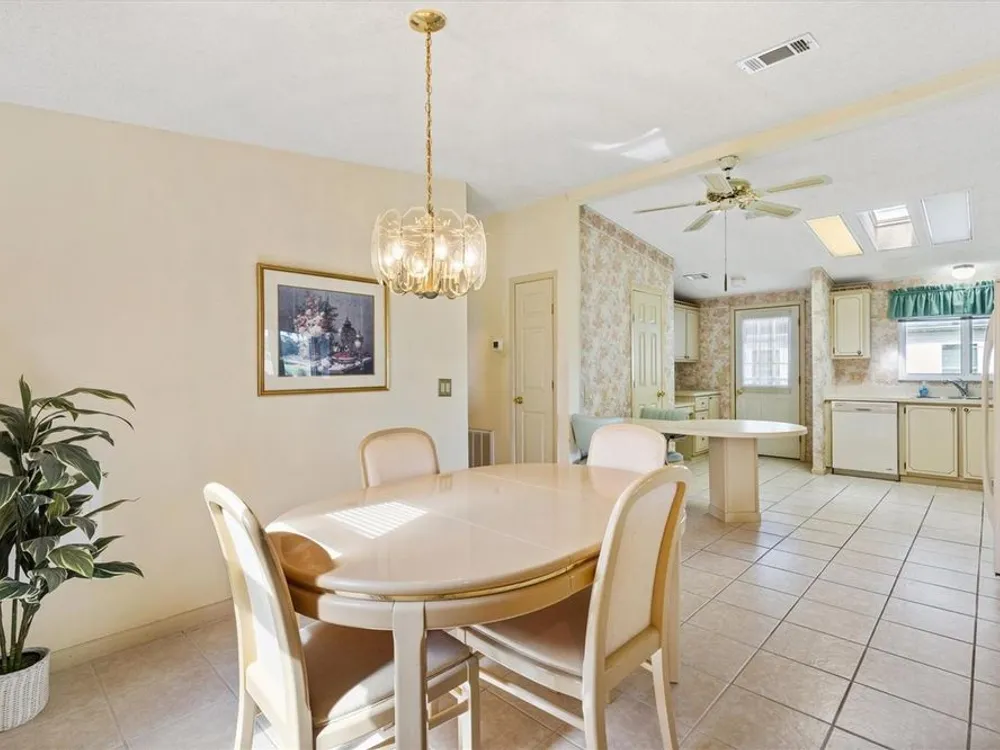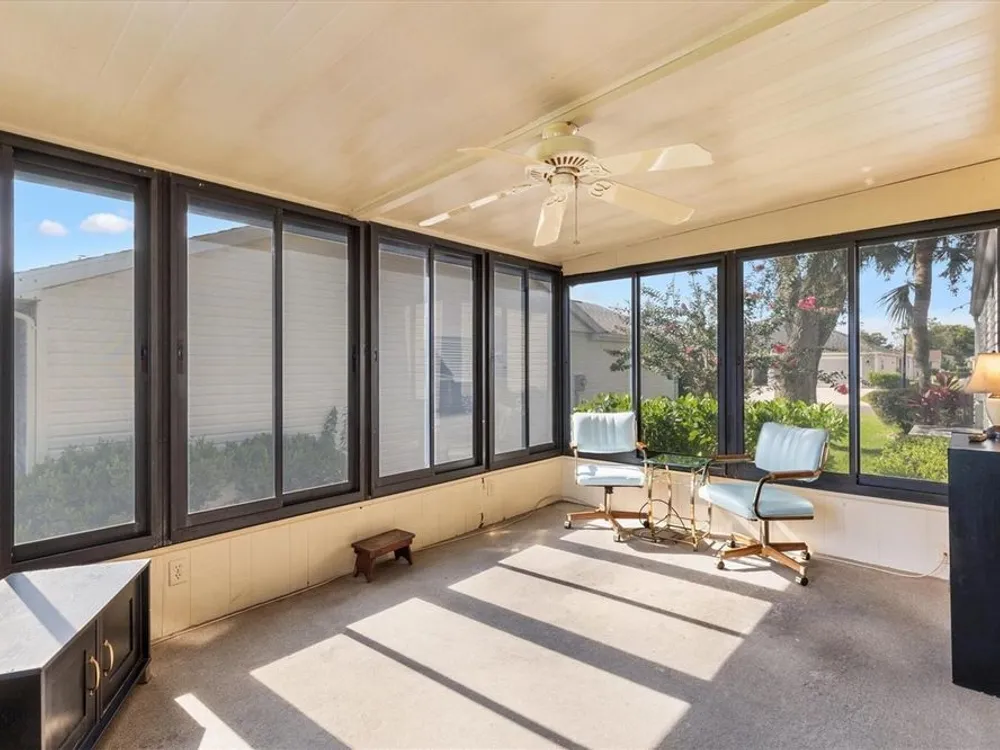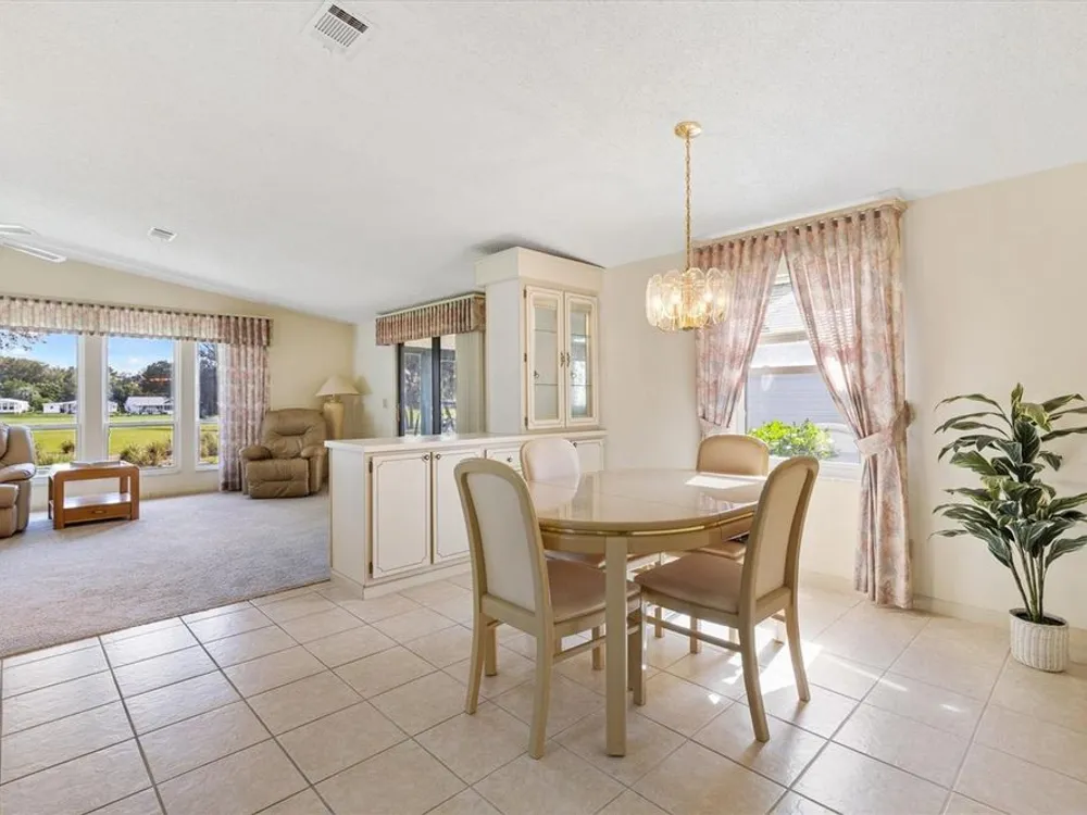 ON GOLF COURSE 2/2 Manufactured Home 4th Hole Silver Springs Golf Course. ROOF 2021 HVAC 2018 NO BOND! Stunning fairway views from the comfort of your living room. Enjoy natural light and picturesque scenery through the large windows or relax in the enclosed lanai accessed by sliding glass doors—perfect for year-round comfort. Step outside to the back outdoor patio, soak in the tranquil setting and watch the golfers. Inside, you'll find a spacious living and dining area featuring a built-in bar and cabinets, as well as an entry coat closet for added convenience. The eat-in kitchen is both functional and charming, with a pantry closet, built-in desk with extra storage, a skylight, and built in seating area. The primary suite features a walk-in closet and an updated ensuite bathroom with a glass-door shower, single vanity (with space to convert to dual), and an additional large closet. The guest bath with has a tub/shower combo with glass doors. Additional highlights include: Ceiling fans and blinds throughout, Partially furnished for easy move-in, Mirrored closets for added brightness. Utility room with washer, dryer, utility sink, and shelving. Whether you're looking for a seasonal escape or full-time residence, this home offers comfort, storage, and unbeatable golf course views. Just a short golf cart ride to the Silver Lake Community Pool and Hot Tub and less than 2 miles to Spanish Springs Town Square for entertainment, dining and shopping. This location can’t be beat. Make this home your own and start living the Villages dream. View our video and make your appointment to see this home today!