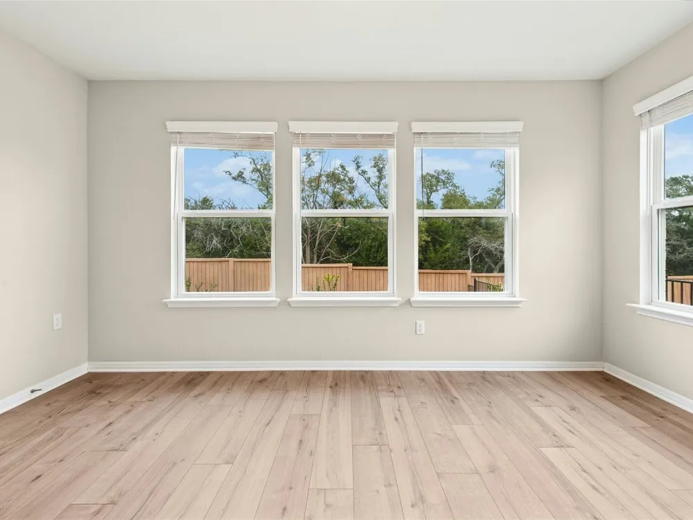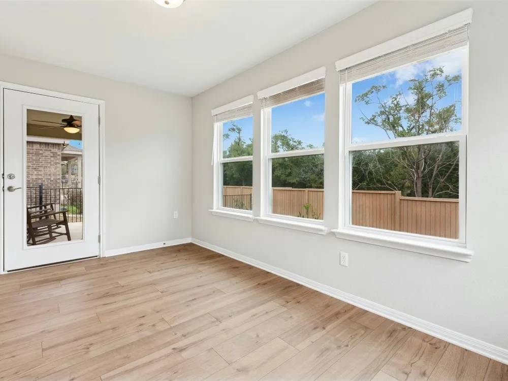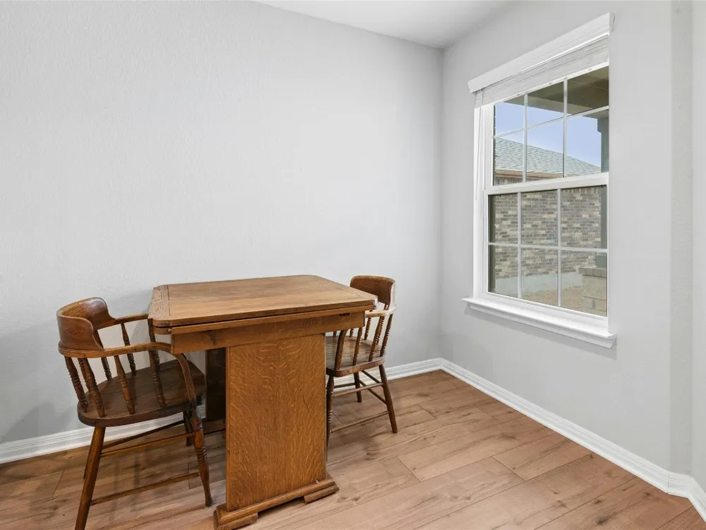 Welcome to this beautiful Steel Creek floor plan! This barely-lived-in home, a second residence for Seller, offers modern elegance and functionality. The kitchen features a spacious quartz island, stainless steel appliances, and crisp white cabinetry. Vinyl plank flooring flows throughout the home, with cozy carpet in the bedrooms. A charming breakfast nook is positioned at one end of the island, with a full dining area on the other side. This home is designed for comfort and versatility, offering 2 bedrooms, 2 baths, and an extended living area with tray ceilings, recessed lighting, and a ceiling fan, creating an inviting 10-foot ceiling height. Secondary bathroom boast vinyl plank flooring and quartz countertops while Primary Bath has wood look tile and quartz along with dual sinks and a generous walk-in closet. Step outside to the patio with a gas grill hookup, overlooking a greenbelt just beyond the fence. Property is fully fenced. The oversized garage is perfect for a large 4-door pickup, even with the tailgate down. Refrigerator, Washer & Dryer convey with home. This home is truly easy to call your own! 55+ Community with 3 golf courses and all the trimmings.