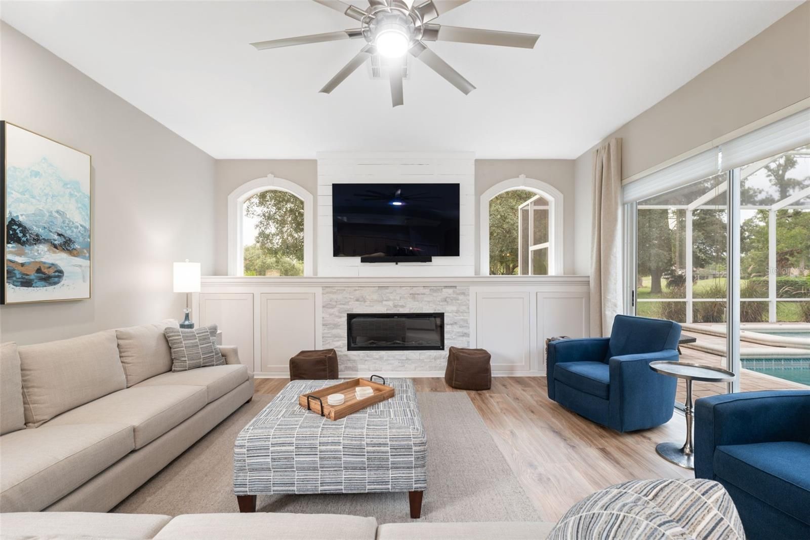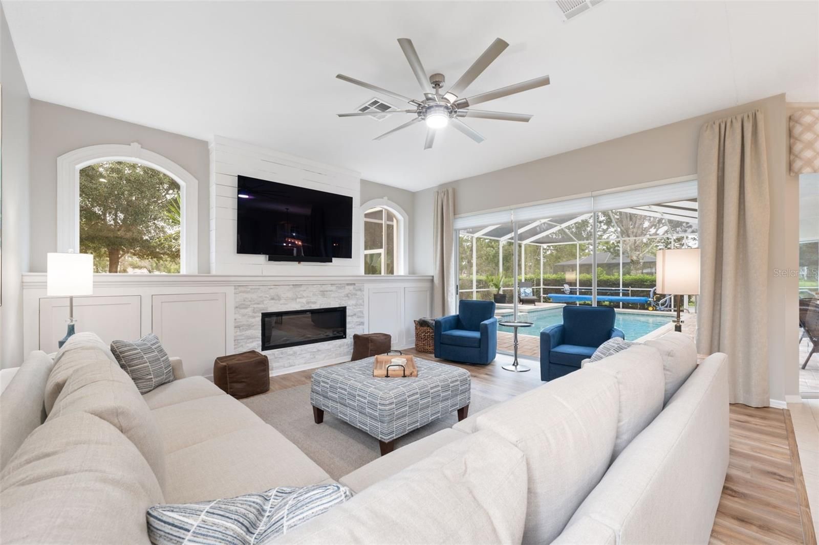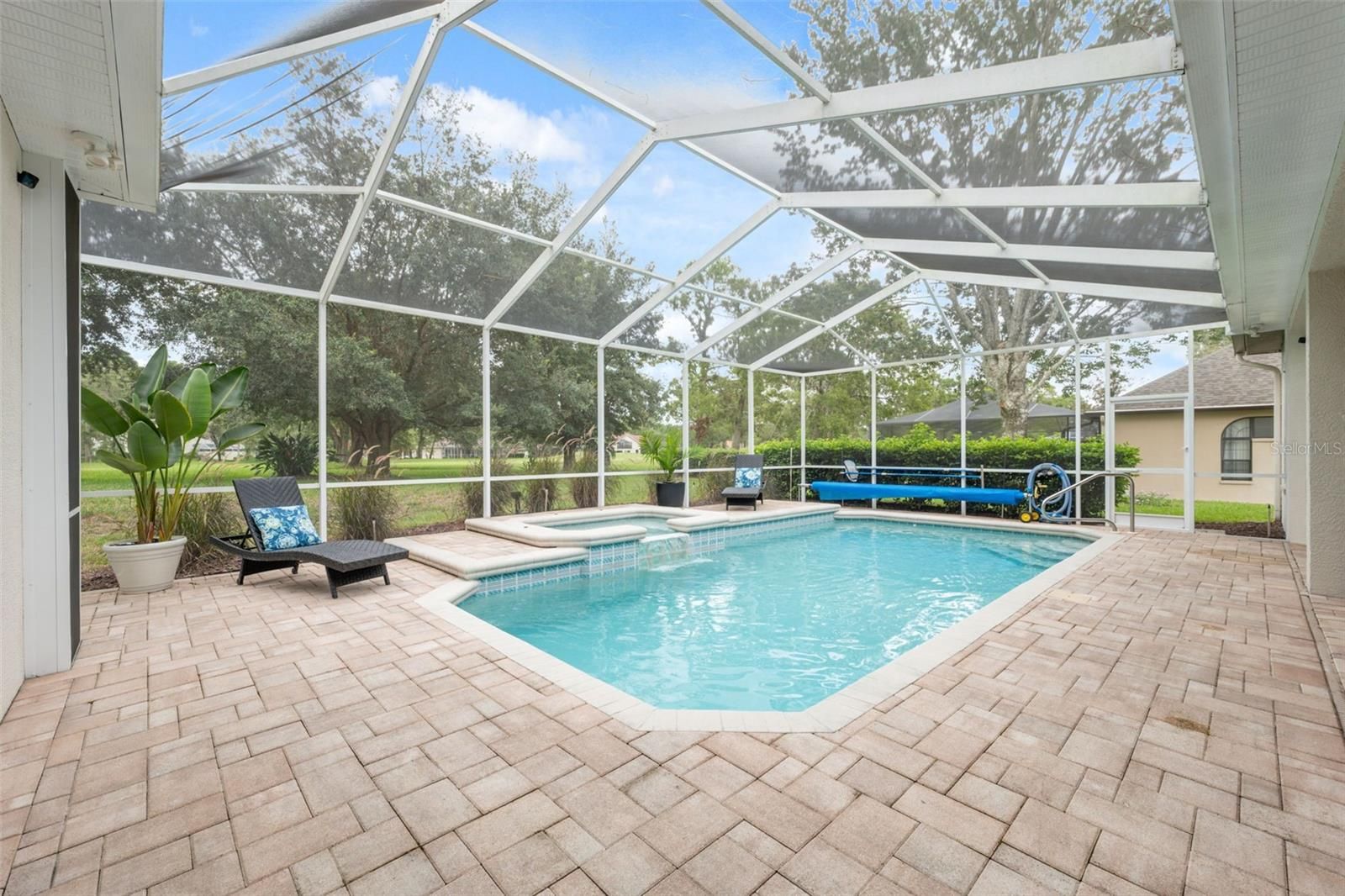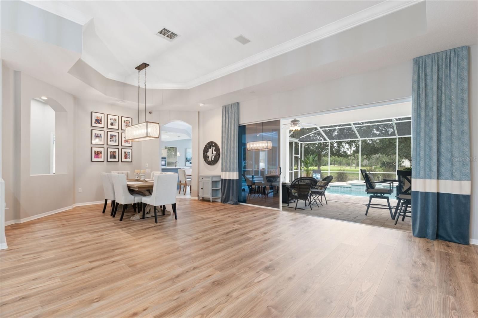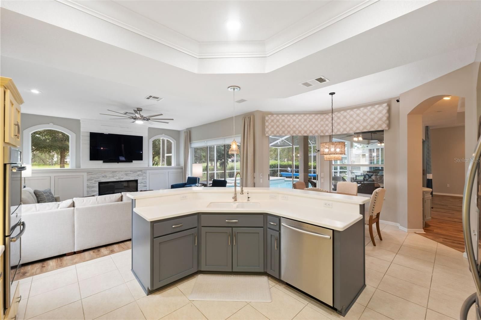 Tucked within the exclusive gated community of Silverthorn, this beautifully appointed 3-bedroom, 3-bath home with a 3-car garage and additional office blends refined comfort with everyday functionality. Set on a prime golf-course lot, the property enjoys tranquil views and an unbeatable location: a manicured front lawn and mature landscaping frame the paver driveway and grand facade, where custom etched-glass double doors open to a light-filled foyer accented by crown molding and a beaded chandelier. Inside, vaulted and tray ceilings soar above an expansive open layout finished in wide-plank, wood-look luxury vinyl flooring. The chef’s kitchen showcases stainless steel appliances, solid surface countertops, two-tone cabinetry, and a walk-in pantry, anchored by a bright breakfast nook that flows to the dining area. The living room centers on a white-washed stone electric fireplace with custom built-ins and floor-to-ceiling sliding glass doors that perfectly frame views of the screened lanai and sparkling pool. Outdoors, a screened lanai with a built-in outdoor kitchen and dining area creates an ideal setting for intimate evenings or lively gatherings. The primary suite is a true retreat with vaulted ceilings, pool views, private lanai access and a newly remodeled spa-style bath with a freestanding soaking tub, dual vanities, and a frameless glass walk-in shower. Two additional bedrooms offer generous space and storage, including one with a walk-in closet and private bath access. Surrounded by lush landscaping and sweeping golf-course vistas, the screened pool area provides privacy and resort-style living. Convenient to local attractions such as Weeki Wachee Springs State Park and Pine Island Beach, and with easy access to the Suncoast Parkway for commuting to Tampa and beyond, this home captures the best of Florida living in a prestigious golf community rich with amenities.
