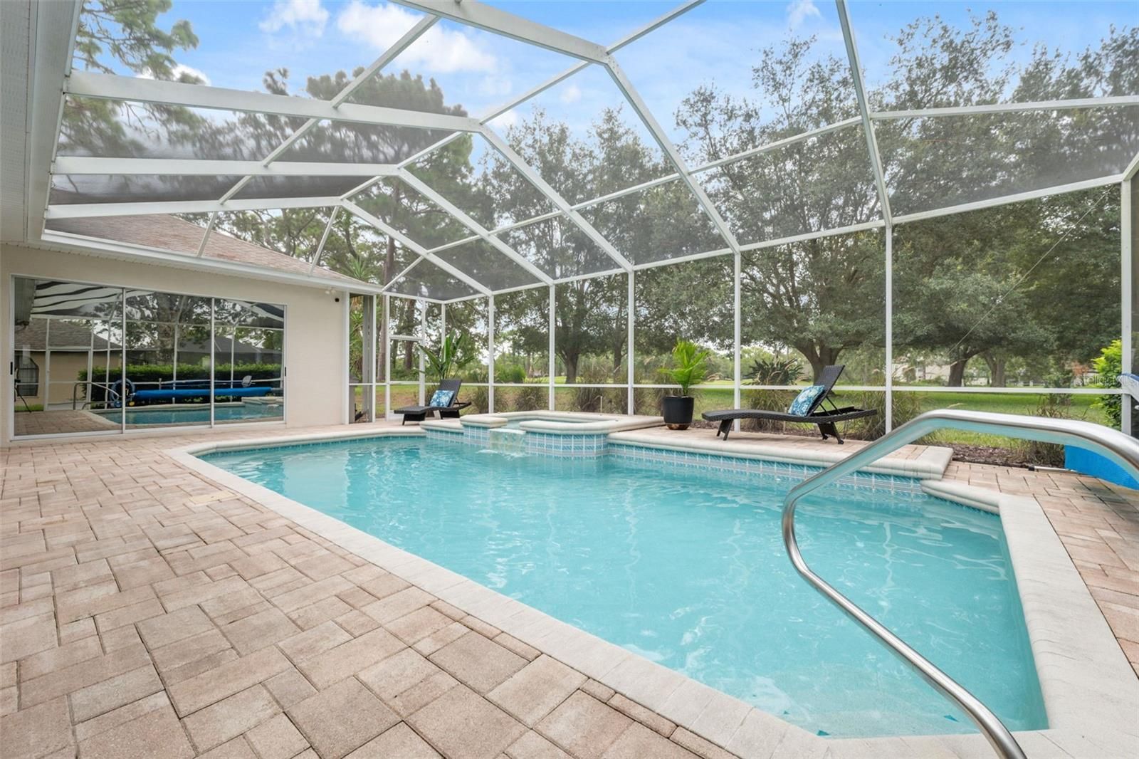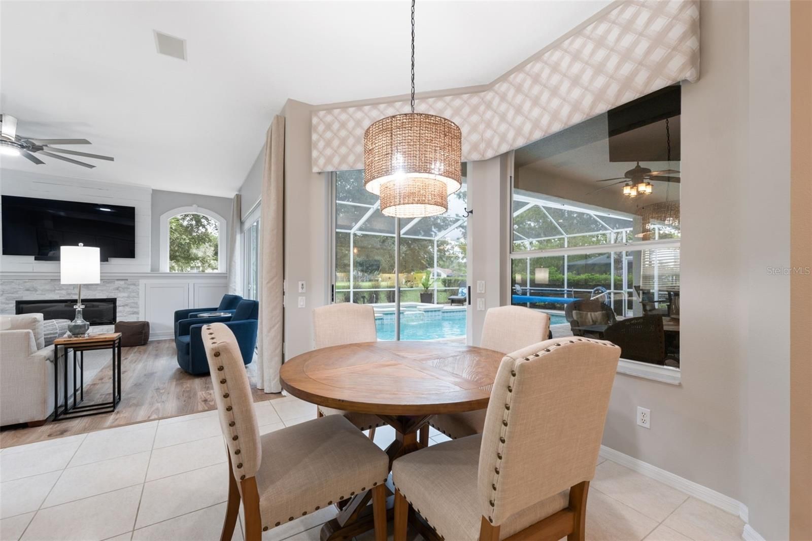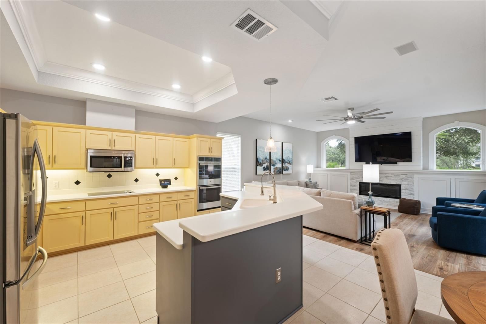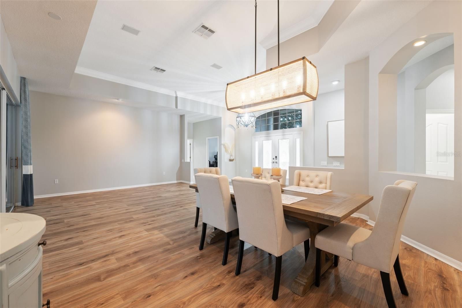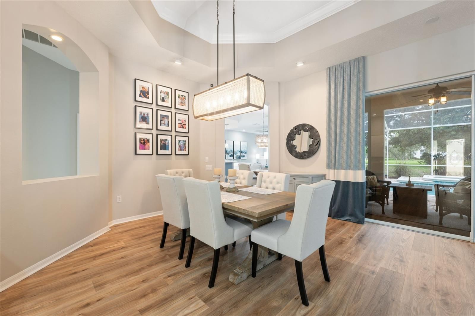 Tucked within the exclusive gated community of Silverthorn, this beautifully appointed 3-bedroom, 3-bath home with a 3-car garage and additional office blends refined comfort with everyday functionality. Set on a prime golf-course lot, the property enjoys tranquil views and an unbeatable location: a manicured front lawn and mature landscaping frame the paver driveway and grand facade, where custom etched-glass double doors open to a light-filled foyer accented by crown molding and a beaded chandelier. Inside, vaulted and tray ceilings soar above an expansive open layout finished in wide-plank, wood-look luxury vinyl flooring. The chef’s kitchen showcases stainless steel appliances, solid surface countertops, two-tone cabinetry, and a walk-in pantry, anchored by a bright breakfast nook that flows to the dining area. The living room centers on a white-washed stone electric fireplace with custom built-ins and floor-to-ceiling sliding glass doors that perfectly frame views of the screened lanai and sparkling pool. Outdoors, a screened lanai with a built-in outdoor kitchen and dining area creates an ideal setting for intimate evenings or lively gatherings. The primary suite is a true retreat with vaulted ceilings, pool views, private lanai access and a newly remodeled spa-style bath with a freestanding soaking tub, dual vanities, and a frameless glass walk-in shower. Two additional bedrooms offer generous space and storage, including one with a walk-in closet and private bath access. Surrounded by lush landscaping and sweeping golf-course vistas, the screened pool area provides privacy and resort-style living. Convenient to local attractions such as Weeki Wachee Springs State Park and Pine Island Beach, and with easy access to the Suncoast Parkway for commuting to Tampa and beyond, this home captures the best of Florida living in a prestigious golf community rich with amenities.