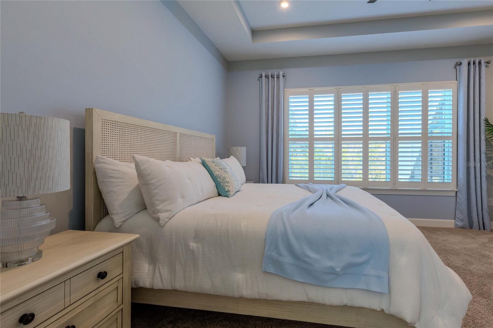 - Ceiling Fan(s), Coffered Ceiling(s), Crown Molding, Eat-in Kitchen, Kitchen/Family Room Combo, Open Floorplan, Main Level Primary, Split Bedrooms, Stone Counters, Thermostat, Tray Ceiling(s), Walk-In Closet(s), Window Treatments