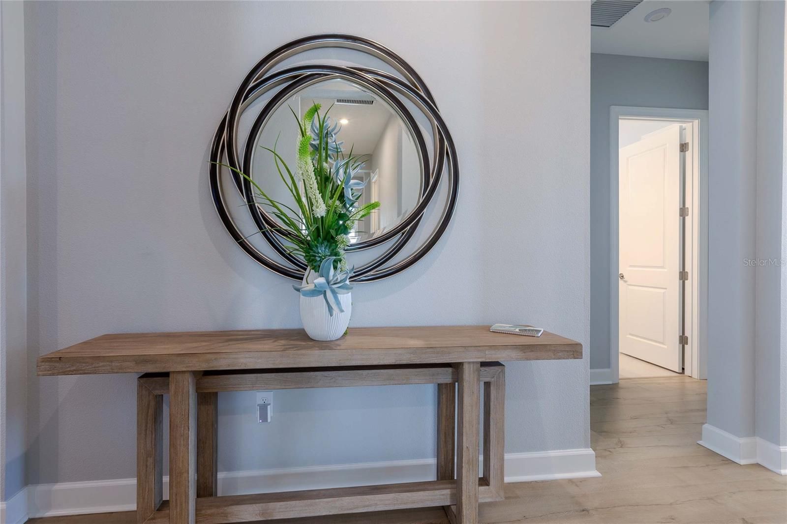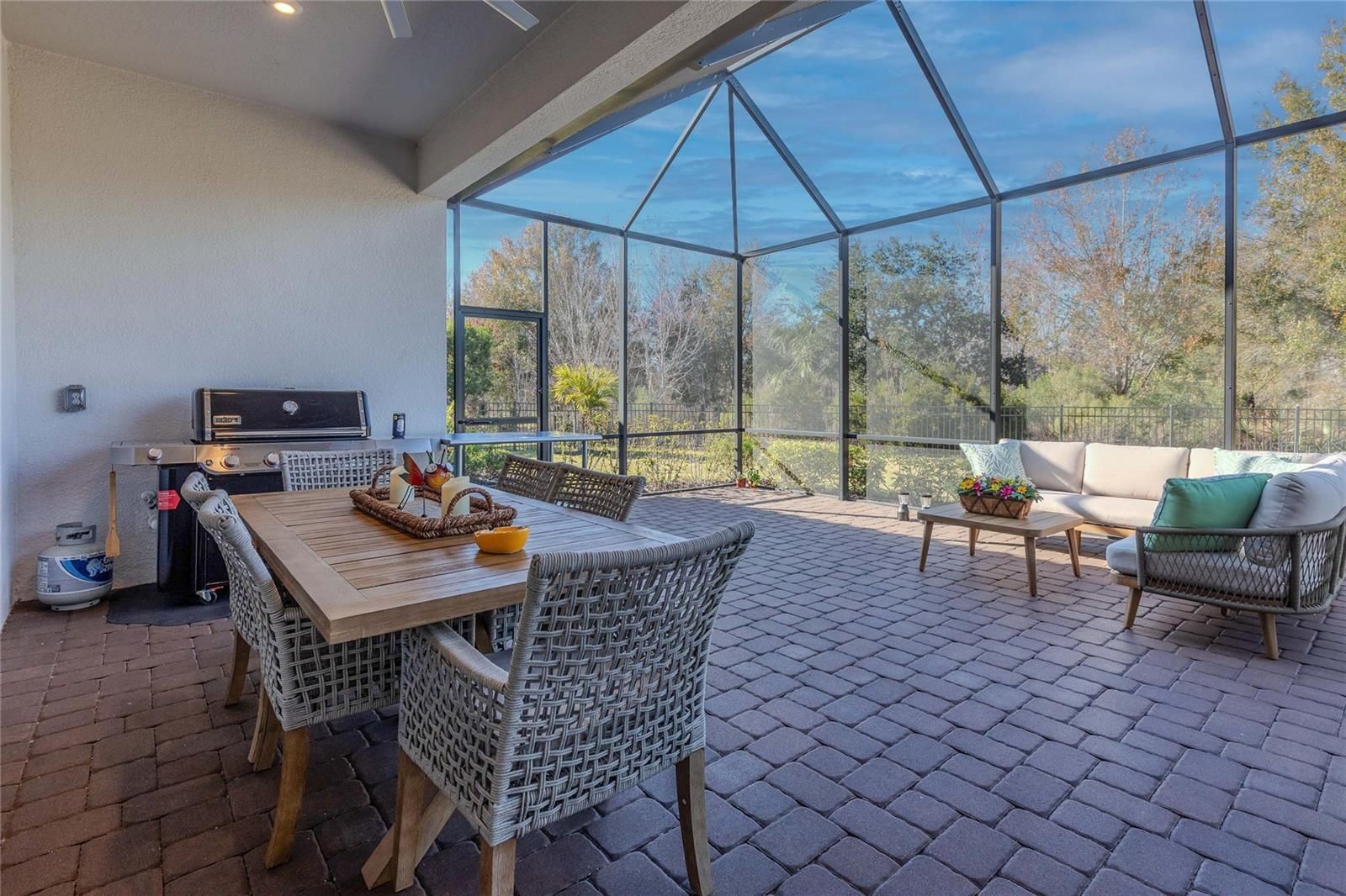 There are homes you see… and then there are homes you feel. From the moment you step inside this beautifully appointed 4-bedroom residence with a flex room/den, the sense of intention and refinement is undeniable. Located within the sought-after Esplanade at Artisan Lakes, this stunning Letizia floor plan offers 2,465 square feet of thoughtfully designed living space and lives like a model—yet feels warm, inviting, and effortlessly elegant. Built in 2021 and meticulously maintained, the home is set on a serene open conservation lot, where light pours in, and views remain unobstructed. Soaring ceilings, refined tray ceilings, and expansive 8-foot doors create an immediate sense of scale, while plantation shutters, designer lighting, and upscale ceiling fans add layers of sophistication throughout. At the center of the home, the kitchen is both striking and functional—anchored by quartz countertops, a designer backsplash, an upgraded range hood, and a premium LG gas range. Thoughtful details extend to a four-door refrigerator with craft ice, bringing a quiet sense of luxury to daily life, while durable, stylish luxury vinyl plank flooring flows seamlessly through the main living areas, setting the stage for both quiet mornings and memorable gatherings. The great room feels expansive yet intimate, complete with an in-floor electric outlet for effortless furniture placement and entertaining flexibility. Each bedroom is thoughtfully positioned, offering privacy and versatility—perfect for guests, a home office, or peaceful personal retreats. Step outside and the home opens gracefully to an extended (15’ x 23’) Phifer-screened lanai, fully fenced and pre-plumbed with water, gas, electric, and drainage for a future outdoor kitchen. With an external ceiling fan already in place, this outdoor space becomes a natural extension of the home—ideal for relaxed afternoons and unhurried evenings. Every detail has been carefully considered: an epoxied garage floor, sealed pavers on the driveway and lanai, a laundry room sink, and finishes that feel cohesive, polished, and enduring. There are no unfinished ideas here. No future projects waiting. This home is fully realized and completely move-in ready. Beyond the residence, Esplanade at Artisan Lakes offers a lifestyle as compelling as the home itself—resort-style amenities, beautifully maintained surroundings, and a community designed for ease, connection, and enjoyment. Days feel intentional. Weekends feel indulgent. This is not simply a place to live. It is a home with presence, purpose, and poise—waiting for its next chapter to begin.