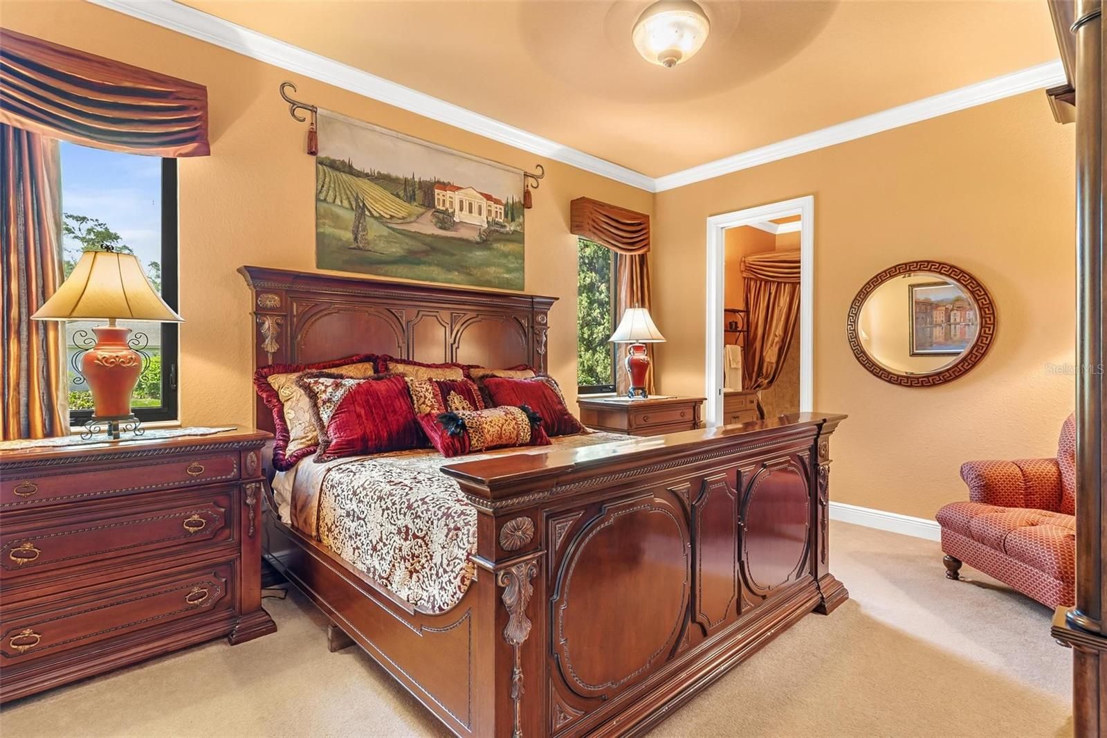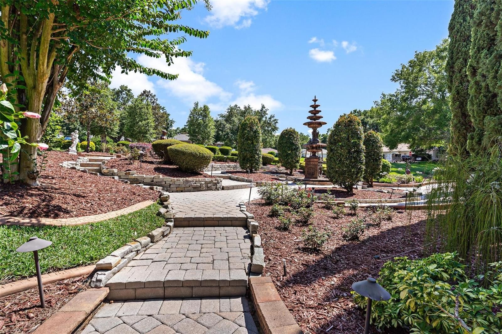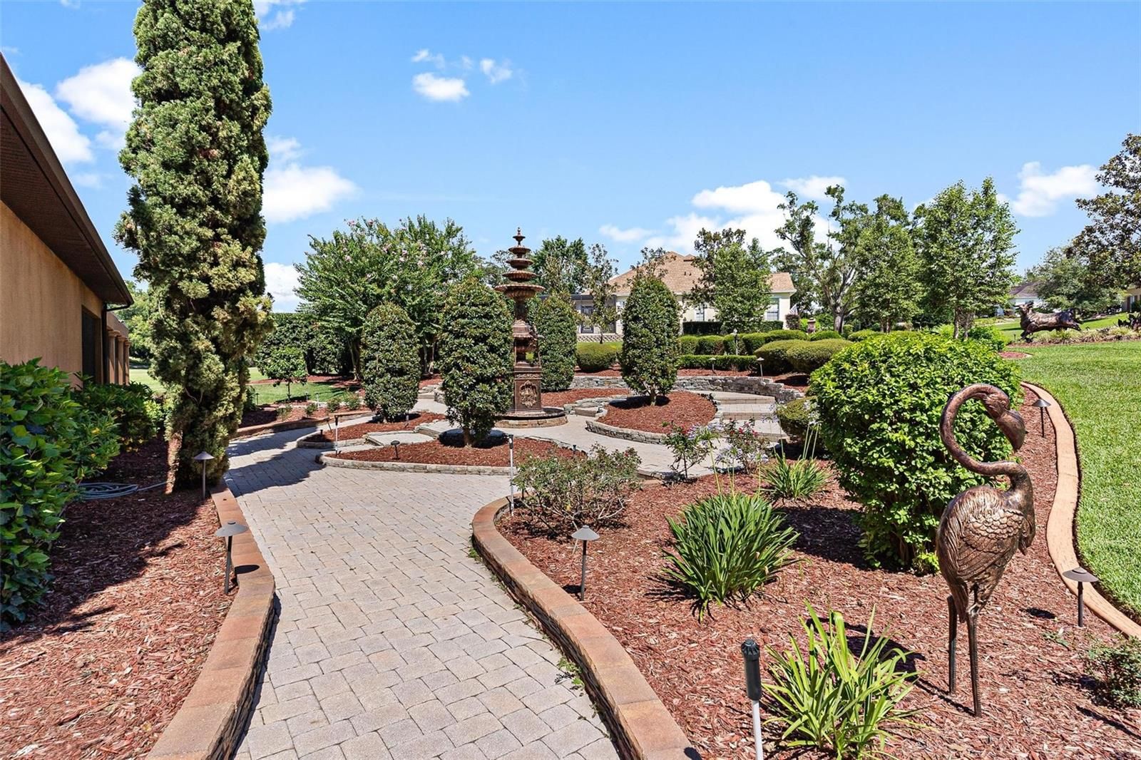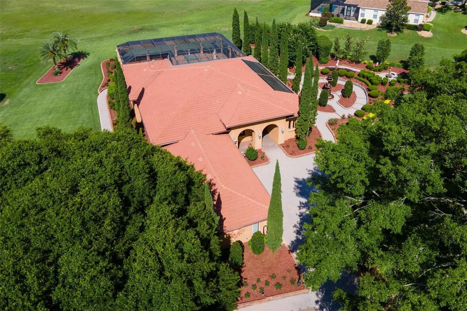 ELEGANT "TUSCANY ESTATE" POOL HOME in a Prestigious Guard Gated Golf Community! Welcome to this exceptional 4-bedroom, 4-bathroom custom residence located on a beautifully manicured 1.4-acre double lot on the golf course! From the moment you arrive, you’ll be captivated by the meticulous attention to detail—as you stroll through the professionally designed landscaping with Vista Pro grass and multi-level gardens to the grand 22-foot fountain, and extensive custom outdoor lighting. Perfect for entertaining, the screened lanai boasts an outdoor fireplace, full summer kitchen with under counter ice maker, surround sound system, custom lights, and a stamped concrete floor. Enjoy year-round luxury in the saltwater heated pool and spa for effortless hosting. Indoors, your private home theatre awaits, featuring tiered seating with 8 leather recliners, an 8x5 projection screen, and high-end audio-visual equipment that conveys with the home. The gourmet kitchen is a chef’s dream, offering granite countertops, center island, double wall ovens, a 6-burner Thermador gas range, trash compactor, dishwasher, and under-sink reverse osmosis system plus a large walk-in pantry! The open-concept great room includes a full bar with ice maker, trey ceilings, and detailed crown molding. You will love having 8-foot doors throughout. Retreat to the expansive primary suite and bath complete with an electric fireplace, jetted tub, oversized walk-in shower, dual custom walk-in closets and vanities. The second private en suite guest room includes its own bath and walk-in closet. Guest bedroom three is oversized share the 3rd guest bath! The dedicated office with custom built-ins can easily serve as a fourth bedroom. No worries if the electric goes out with your own Whole-house generator with a 500-gallon buried propane tank. Endless hot water with the commercial-grade tankless water heater (installed 2024). More upgrades to include the Water softener and whole-house filtration system. Two HVAC units (replaced approx. 7 years ago). Huge 3-car garage with epoxy floors, insulated doors, custom cabinetry, and climate-controlled walk-in storage! Additional parking pad for two vehicles. Every detail of this home reflects exceptional quality and luxurious living. A rare opportunity to own a showpiece in one of the region’s most sought-after communities. Clubhouse membership is optional for additional fees will give you access to the marina, RV storage, community pool, fitness room, tennis, pickleball, activities and more. YOUR RESORT STYLE LIVING AWAITS...CALL TODAY!