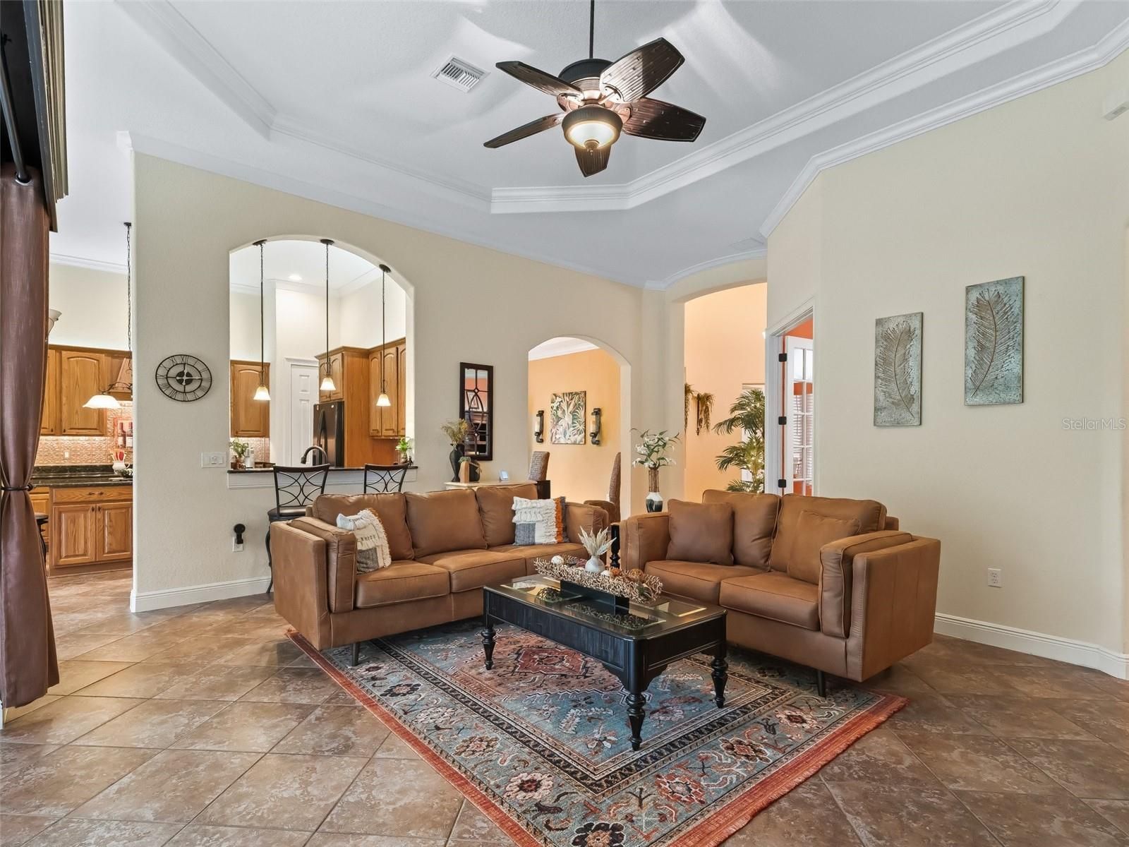 Elegant 3-Bed, 2.5-Bath Pool Home with Office in Harbor Hills Welcome to this beautifully maintained 3-bedroom, 2.5-bath POOL HOME with private office, tucked behind a gated courtyard in the highly desirable, 24-hour guard-gated community of Harbor Hills. Built in 2007, this home exudes timeless elegance with soaring ceilings, crown molding, designer tile, and custom finishes throughout. Enjoy a spacious living room that opens to a screened lanai with saltwater pool, heated spa, and covered patio—your private Florida oasis. The gourmet kitchen features granite counters, wood cabinets, stylish backsplash, island, and breakfast nook with garden and pool views. The primary suite is a true retreat with patio access, dual walk-in closets, and a spa-like bath with soaking tub and walk-in shower. Bedrooms 2 and 3 have ample space and share a full bath with dual sinks and upgraded tile. The home also includes a dedicated office, bonus flex space, 2-car garage + golf cart entrance, and a new HVAC (June 2025). Harbor Hills offers optional club memberships with access to golf, tennis, fitness center, pool, marina, and more. Just minutes from The Villages, shopping, dining, hospitals, and major highways. Lovingly maintained by original owners – this move-in ready home offers luxury, privacy, and an unbeatable location.