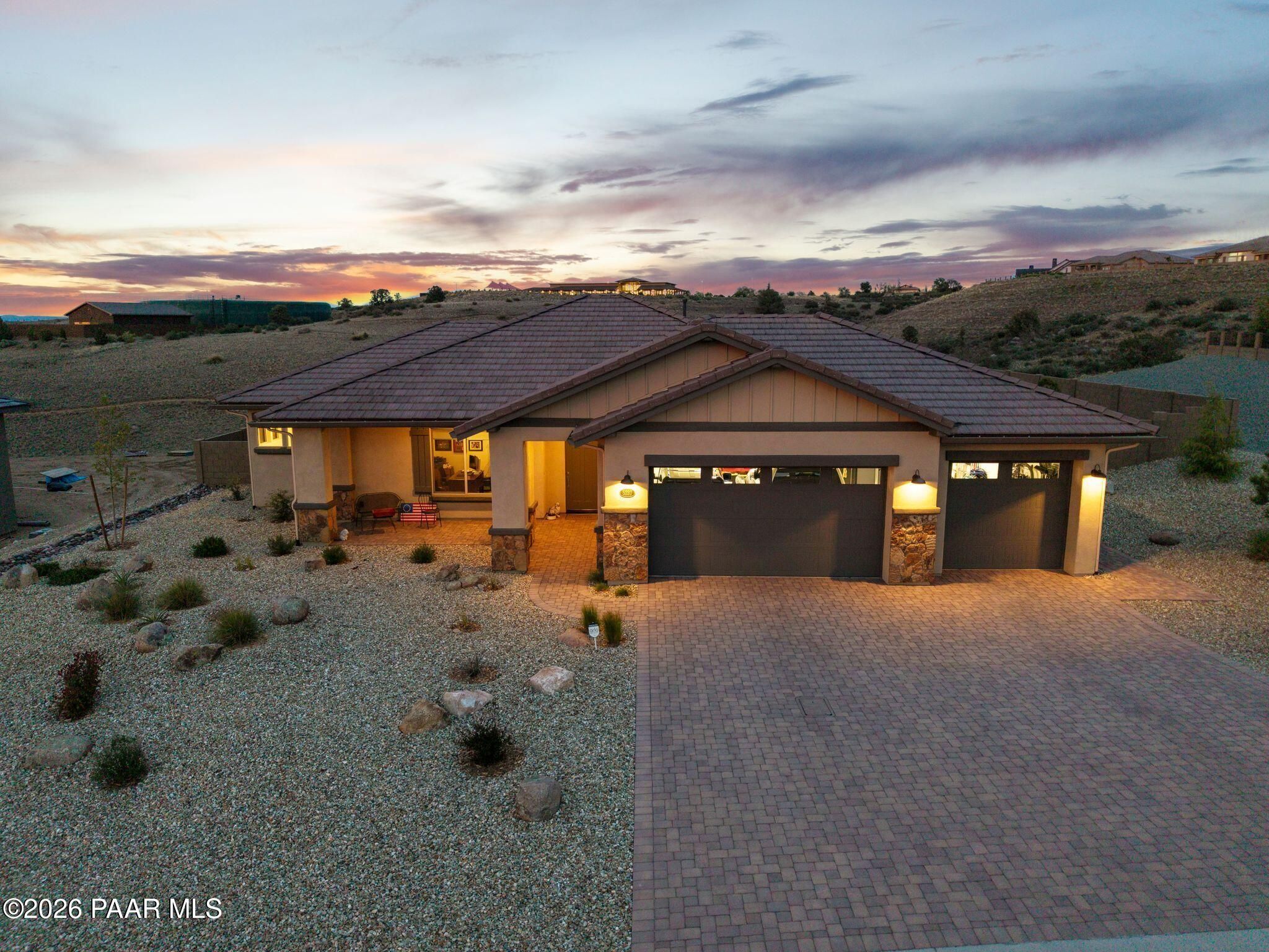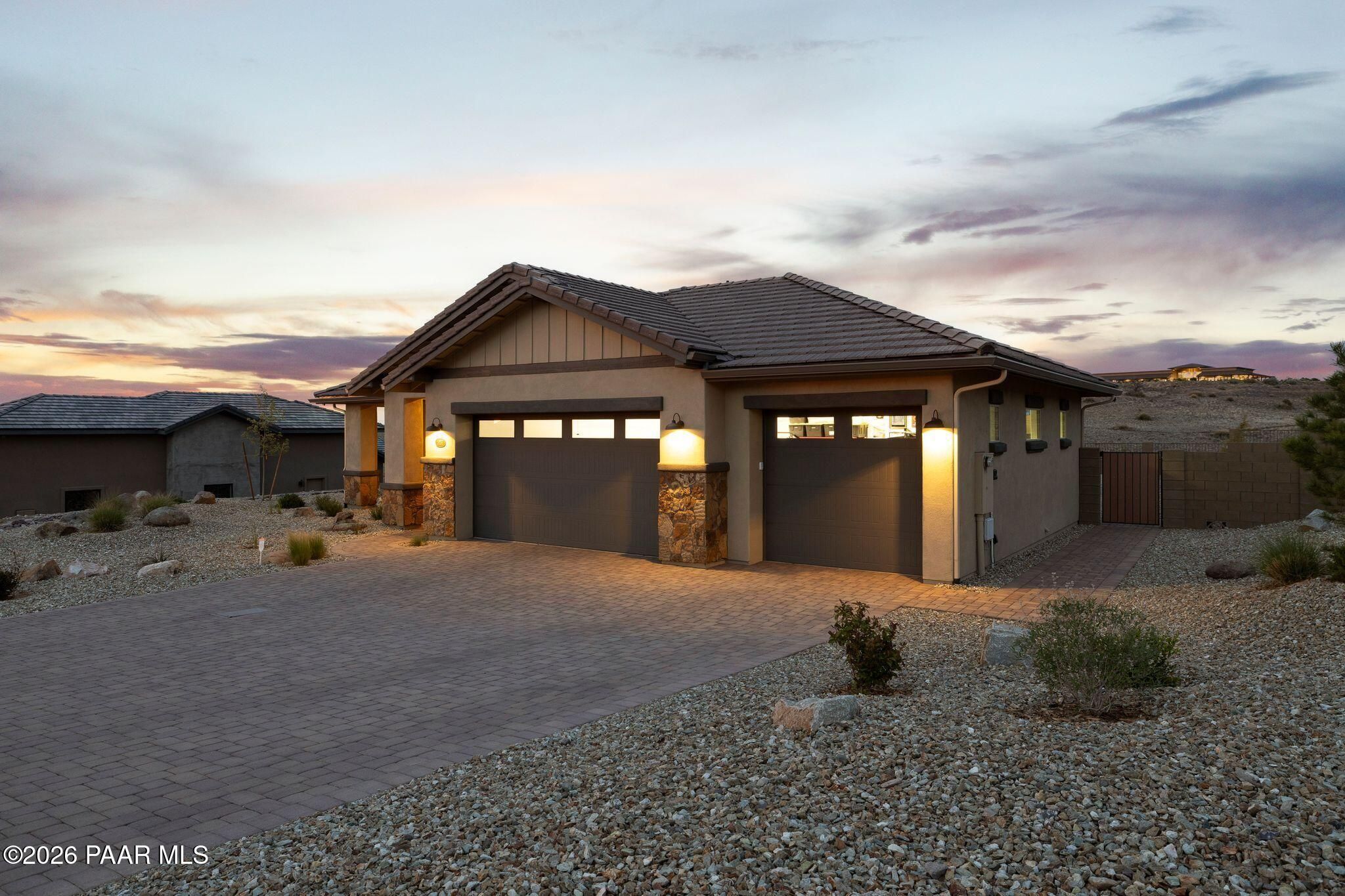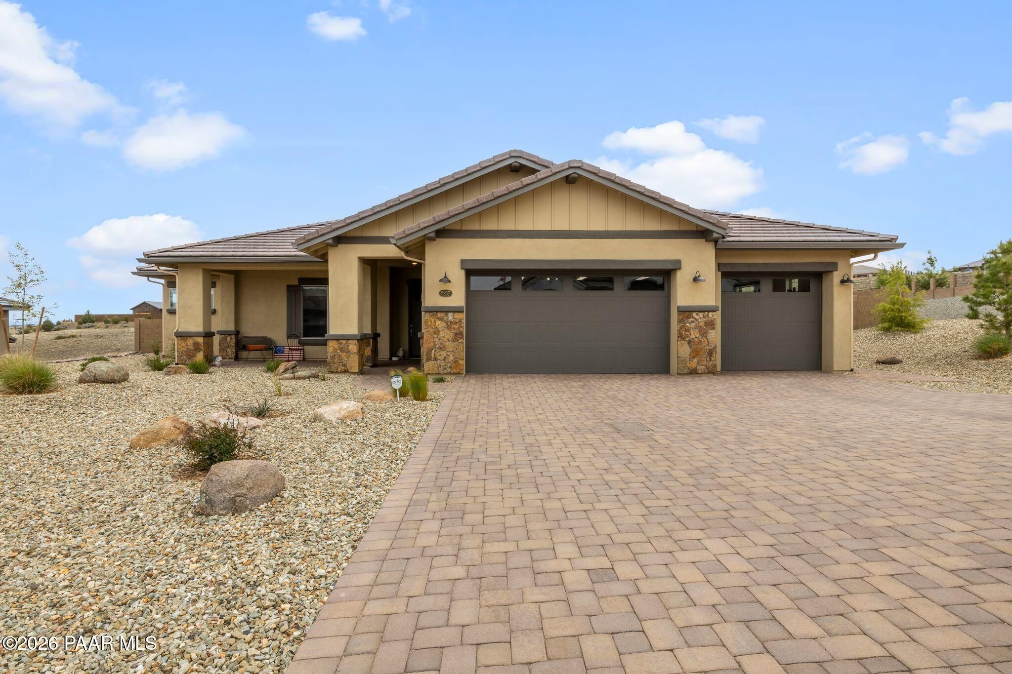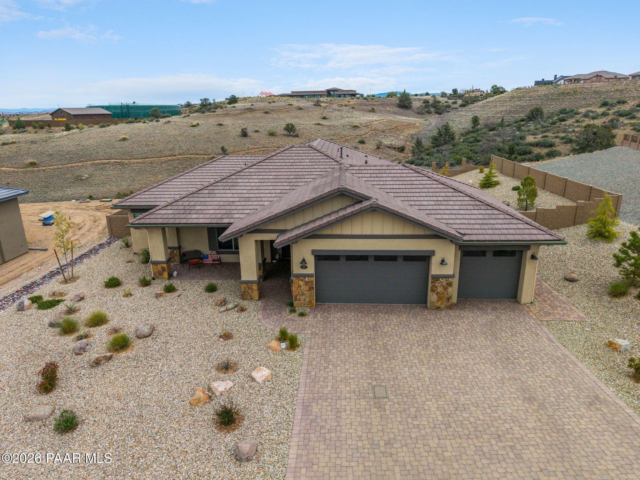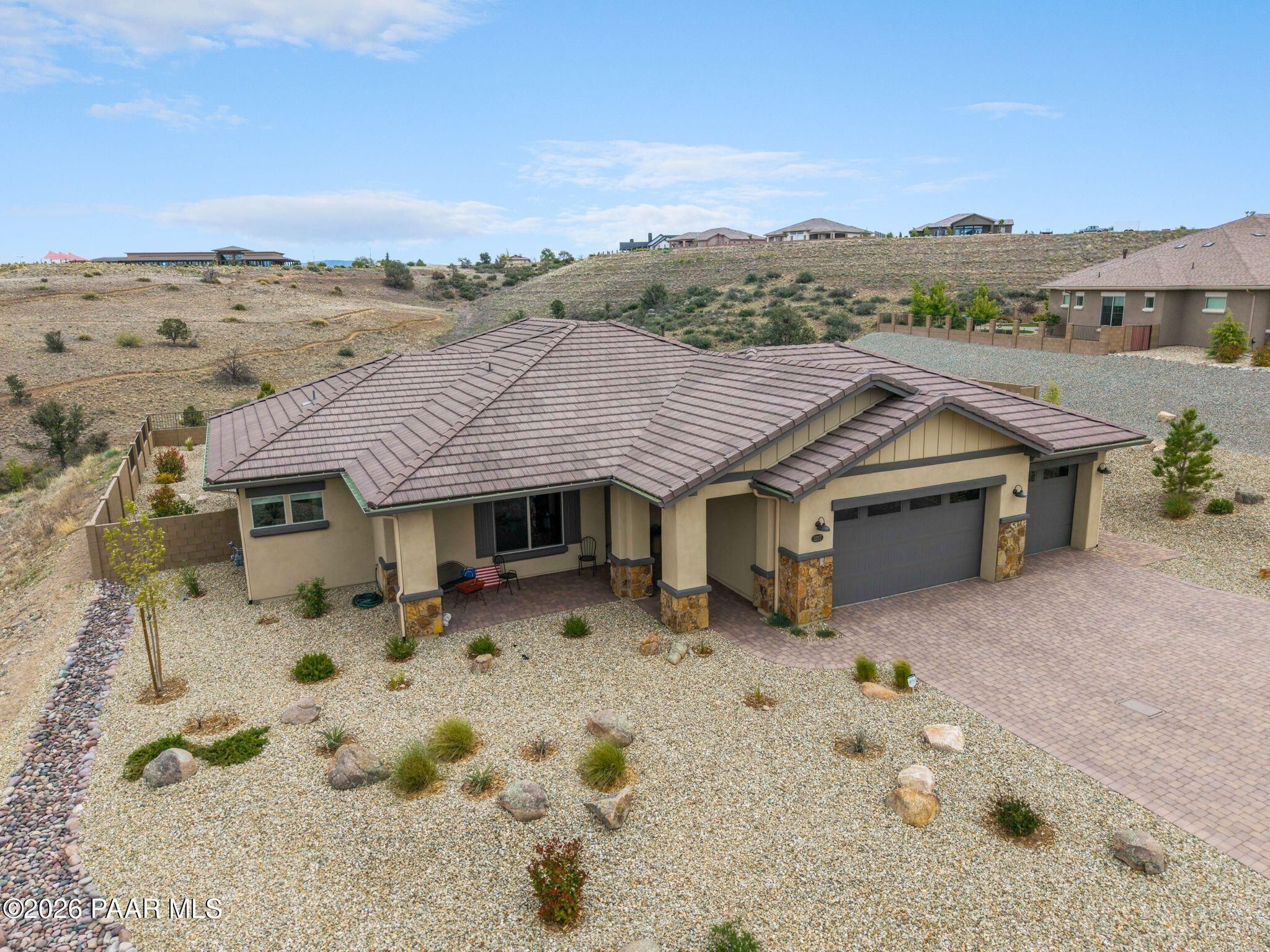 Discover the pinnacle of luxury living in the highly coveted, prestigious, and secure gated community of Granite Dells Estates. This stunning custom-built residence, meticulously crafted by the renowned Stoddard Lifestyle Homes, offers an unparalleled, absolutely turnkey experience, ready for immediate occupancy. Spanning 2,322 square feet of thoughtfully designed interior space, this home exudes pure elegance and functionality. The layout features three spacious bedrooms and three full bathrooms, including two luxurious ensuites, providing comfort and privacy for residents and guests alike. The heart of the home is an expansive, open-concept great room, perfect for entertaining or relaxing. Anchored by a cozy gas fireplace, this grand space flows seamlessly into the gourmet chef's kitchen. The state-of-the-art kitchen is a culinary enthusiast's dream. It boasts a spacious dining area and a massive center island, which is not only a functional workspace but also a stylish focal point, featuring a durable, low-maintenance granite composite sink. Premium features include a convenient wine refrigerator, elegant glass door display cabinets, and top-of-the-line stainless steel appliances. Just off the kitchen, a versatile butler's pantry or dedicated hobby room provides invaluable additional flexible and functional living space, perfect for extra storage, prep work, or pursuing creative projects. No detail has been overlooked in the selection of high-end finishes. The home showcases stunning, smooth quartz countertops, elegant white custom cabinetry complemented by sleek stainless steel hardware, and sophisticated under cabinet lighting to create a warm ambiance. The main living areas feature exquisite, durable planked tile floors that offer both beauty and ease of maintenance. Perhaps the most captivating feature is the home's connection to nature. Massive picture windows span the entire back of the residence, framing and offering breathtaking, unobstructed, and protected open space views that create a serene and private backdrop for everyday living. Capping off this exquisite property is a truly exceptional amenity: an oversized, five-car garage. Spanning over 1,000 square feet, this substantial space provides ample room for multiple vehicles, storage, a workshop, and all your recreational equipment, appealing to collectors and hobbyists alike. This Granite Dells Estates home is a masterpiece of custom construction, blending luxurious finishes, modern functionality, and unparalleled views into a perfect residential retreat.
