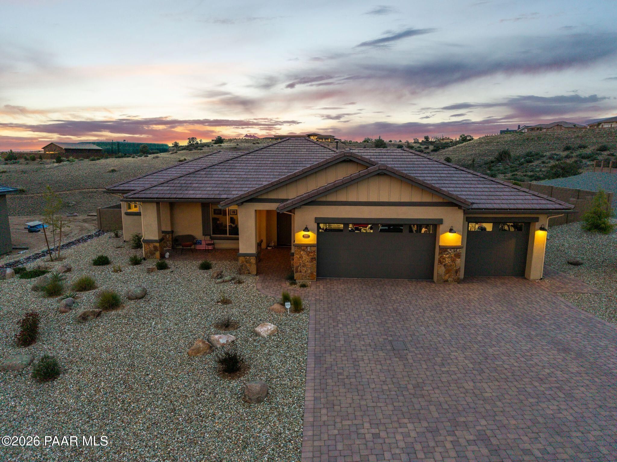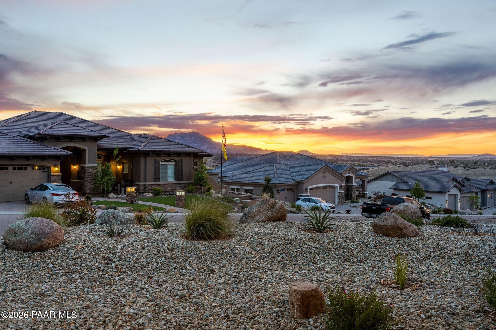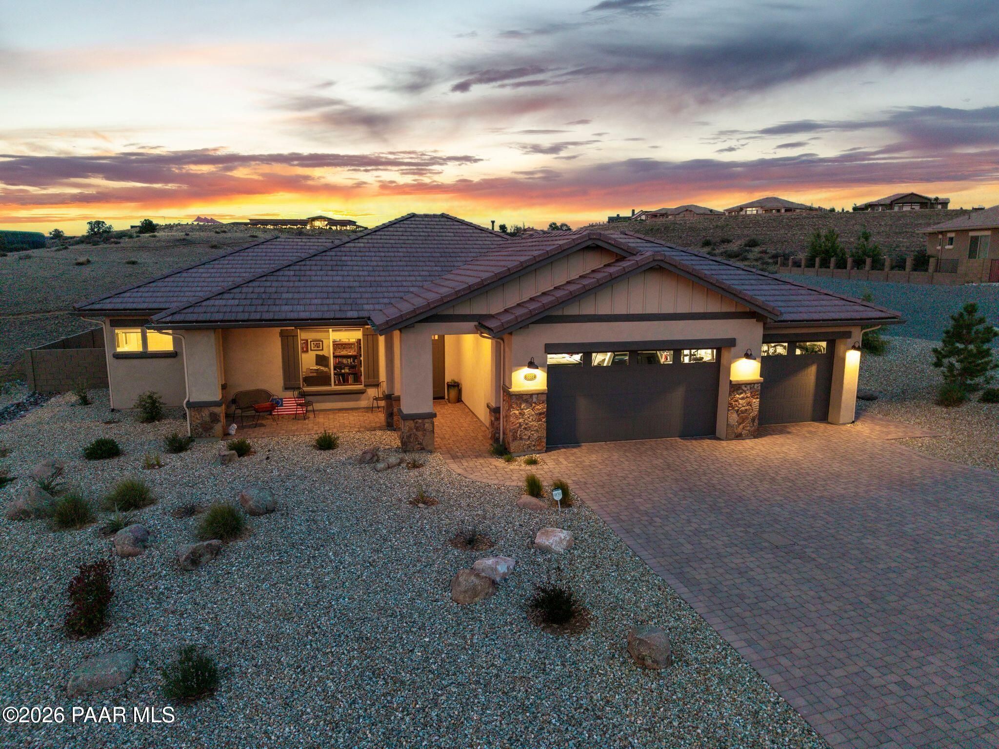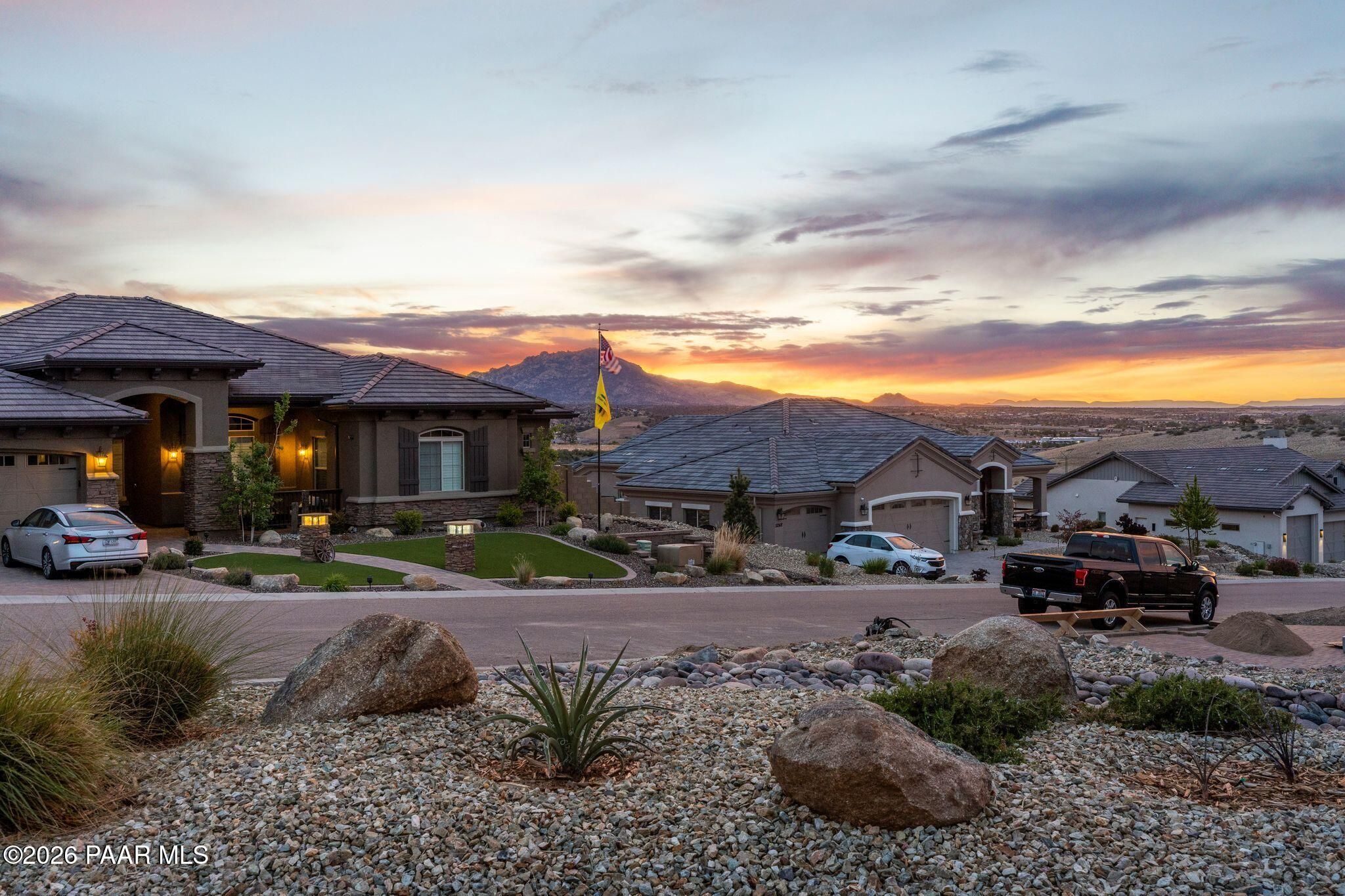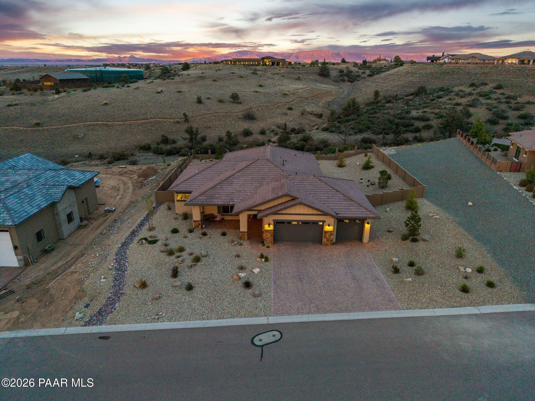 Discover the pinnacle of luxury living in the highly coveted, prestigious, and secure gated community of Granite Dells Estates. This stunning custom-built residence, meticulously crafted by the renowned Stoddard Lifestyle Homes, offers an unparalleled, absolutely turnkey experience, ready for immediate occupancy. Spanning 2,322 square feet of thoughtfully designed interior space, this home exudes pure elegance and functionality. The layout features three spacious bedrooms and three full bathrooms, including two luxurious ensuites, providing comfort and privacy for residents and guests alike. The heart of the home is an expansive, open-concept great room, perfect for entertaining or relaxing. Anchored by a cozy gas fireplace, this grand space flows seamlessly into the gourmet chef's kitchen. The state-of-the-art kitchen is a culinary enthusiast's dream. It boasts a spacious dining area and a massive center island, which is not only a functional workspace but also a stylish focal point, featuring a durable, low-maintenance granite composite sink. Premium features include a convenient wine refrigerator, elegant glass door display cabinets, and top-of-the-line stainless steel appliances. Just off the kitchen, a versatile butler's pantry or dedicated hobby room provides invaluable additional flexible and functional living space, perfect for extra storage, prep work, or pursuing creative projects. No detail has been overlooked in the selection of high-end finishes. The home showcases stunning, smooth quartz countertops, elegant white custom cabinetry complemented by sleek stainless steel hardware, and sophisticated under cabinet lighting to create a warm ambiance. The main living areas feature exquisite, durable planked tile floors that offer both beauty and ease of maintenance. Perhaps the most captivating feature is the home's connection to nature. Massive picture windows span the entire back of the residence, framing and offering breathtaking, unobstructed, and protected open space views that create a serene and private backdrop for everyday living. Capping off this exquisite property is a truly exceptional amenity: an oversized, five-car garage. Spanning over 1,000 square feet, this substantial space provides ample room for multiple vehicles, storage, a workshop, and all your recreational equipment, appealing to collectors and hobbyists alike. This Granite Dells Estates home is a masterpiece of custom construction, blending luxurious finishes, modern functionality, and unparalleled views into a perfect residential retreat.